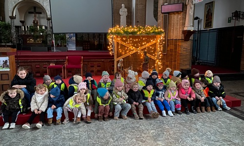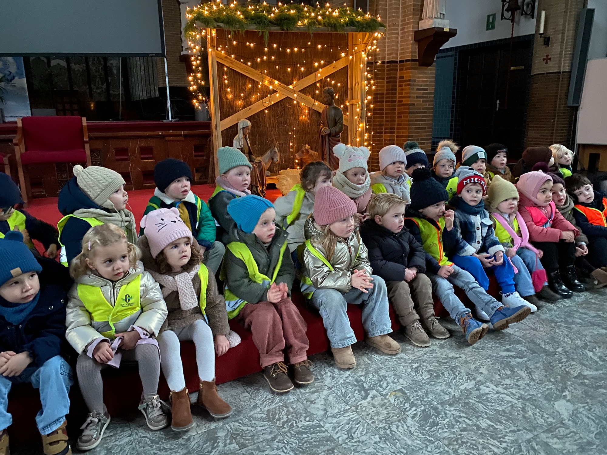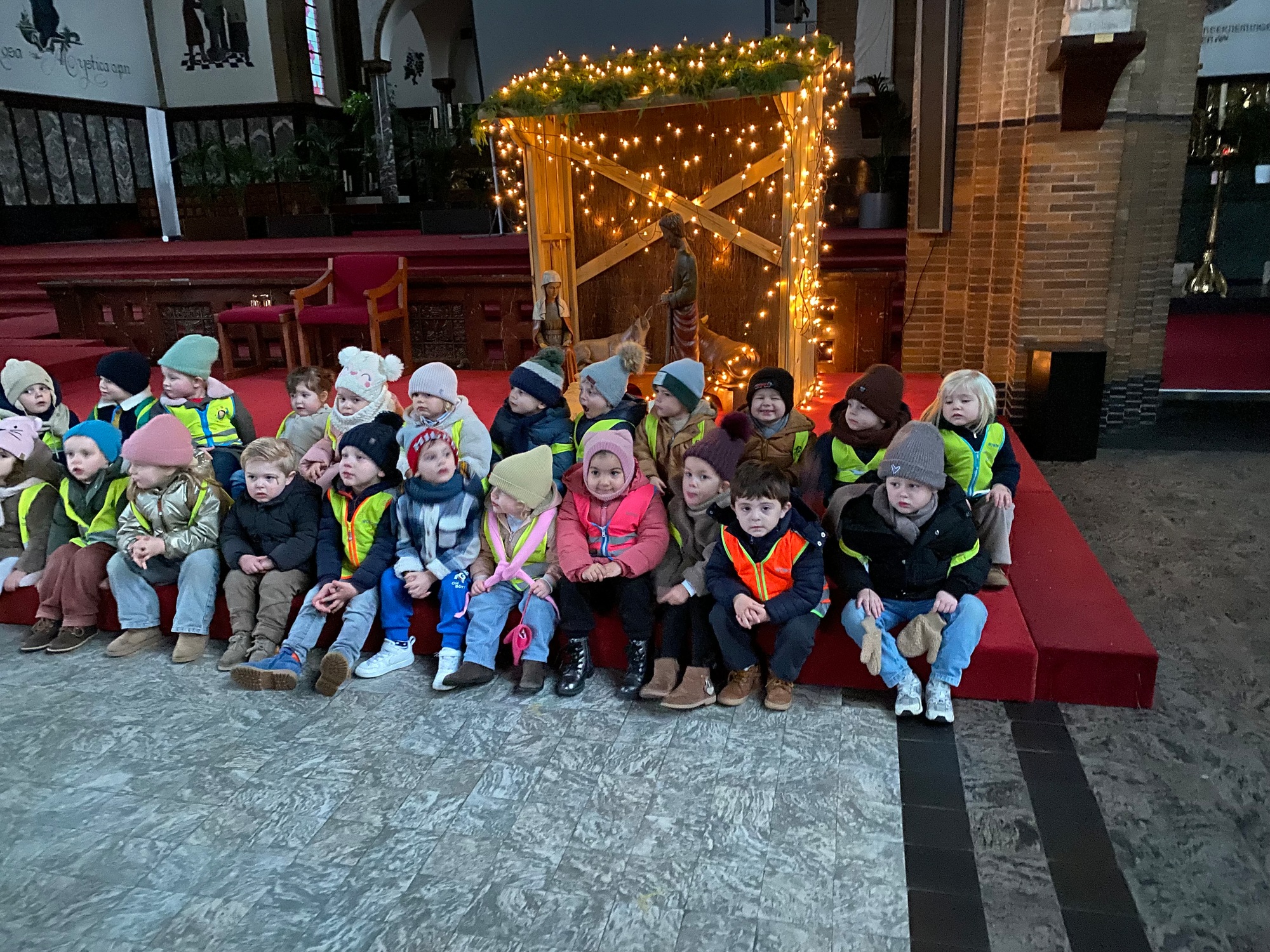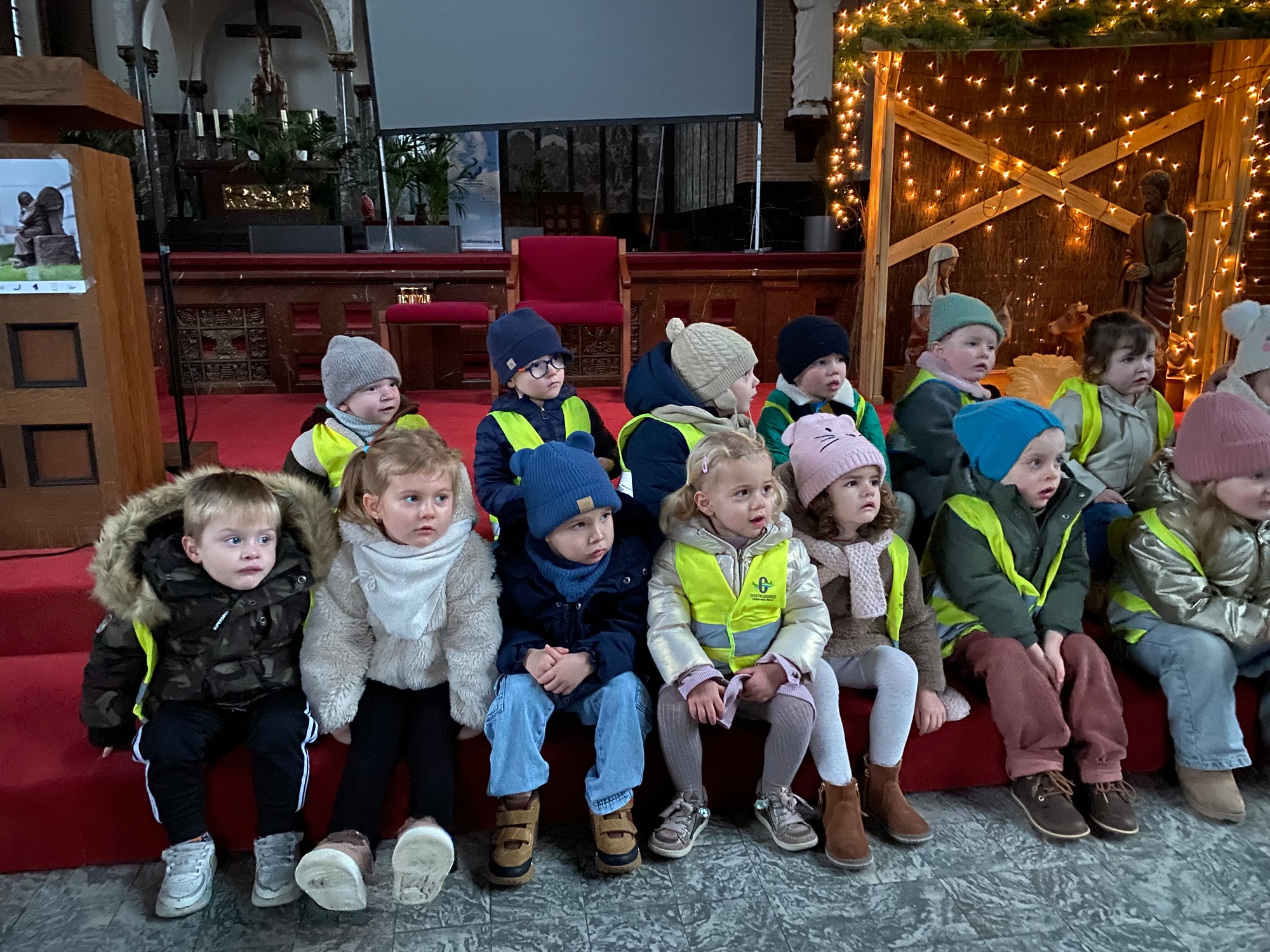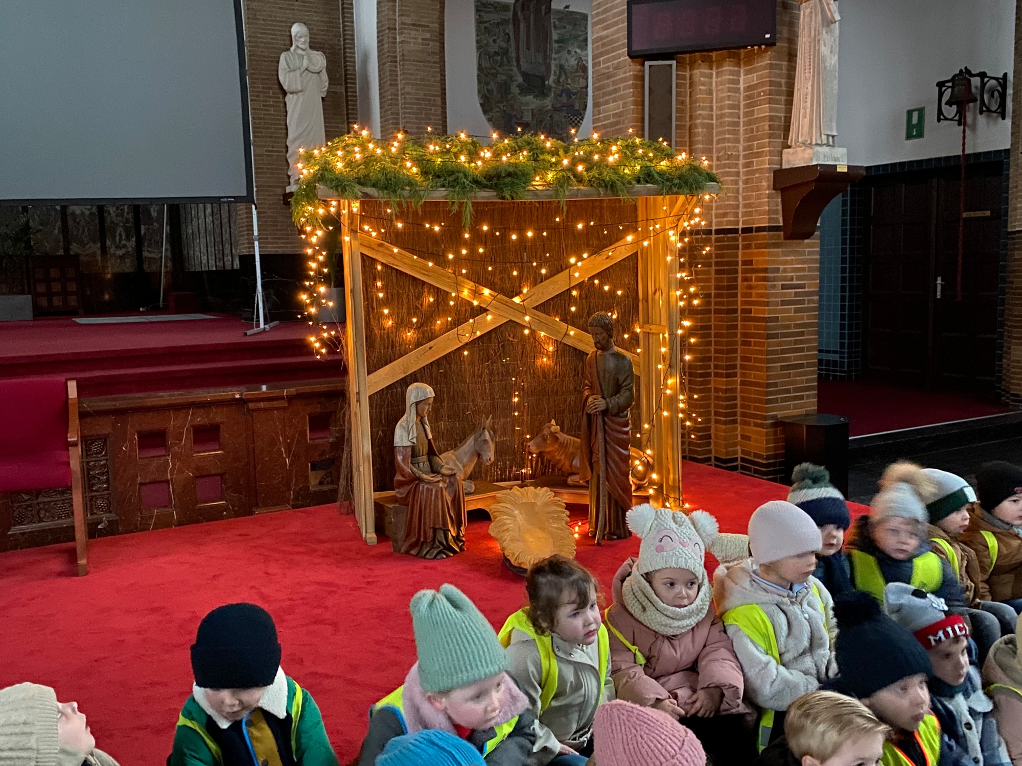 Vandaag gingen we; de kleuters van juf Deborah en juf Els met een pakje naar het sociaal huis. Fien de dochter van juf Deborah was ook mee en hielp ons onderweg. Daarna gingen we naar de kerk om de kerststal te bewonderen. Juf Deborah vertelde het kerstverhaal. We bekeken ook de adventskrans. De kleuters waren vol verwondering.