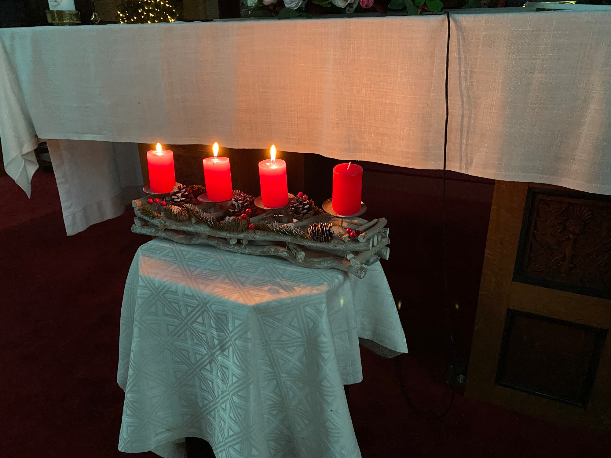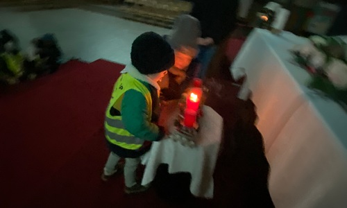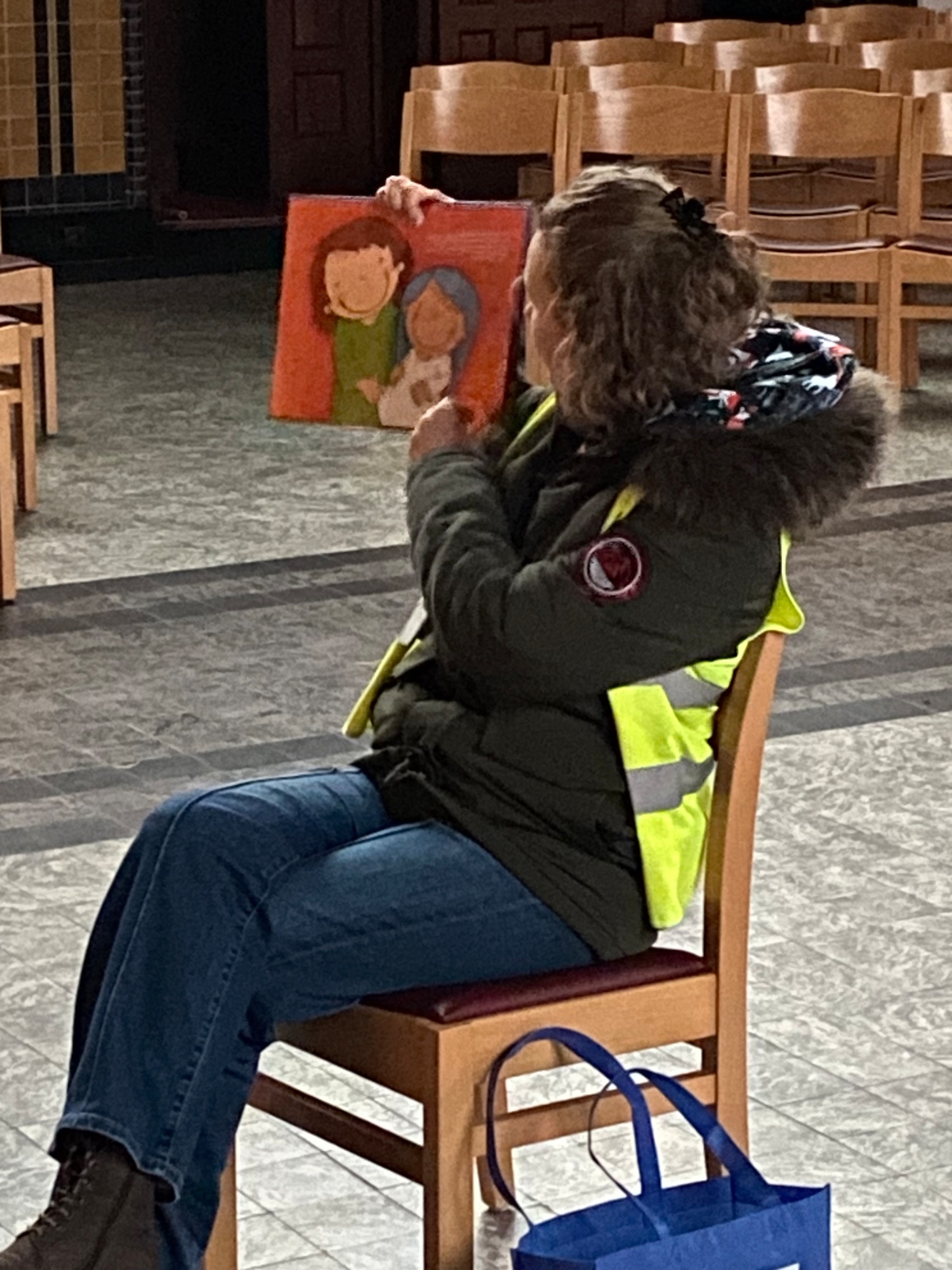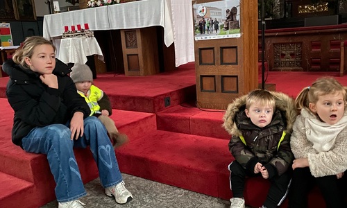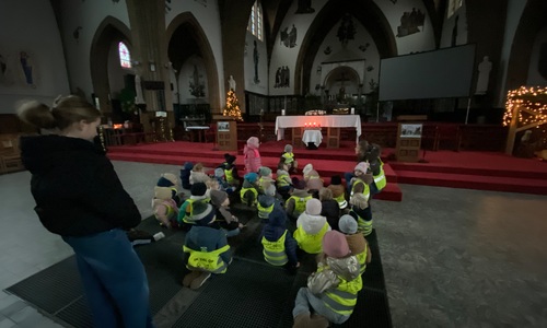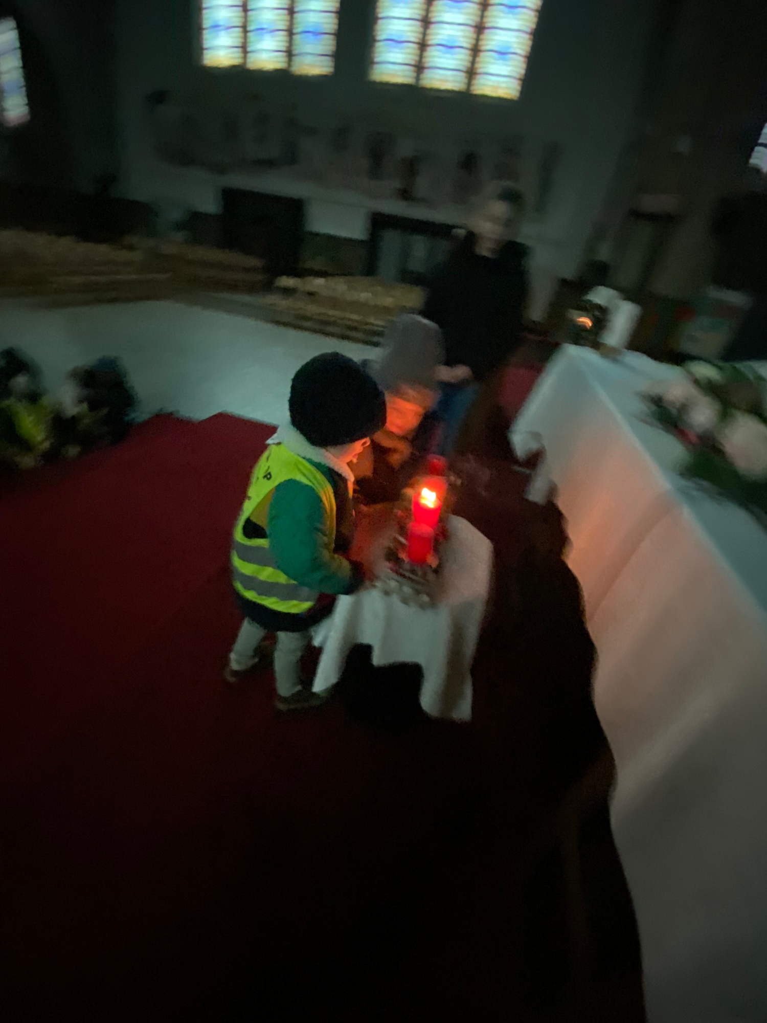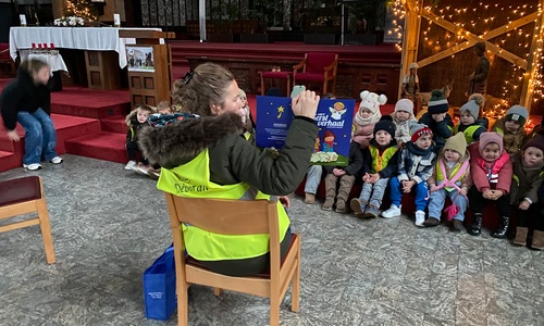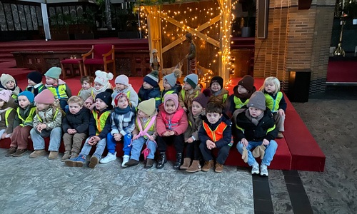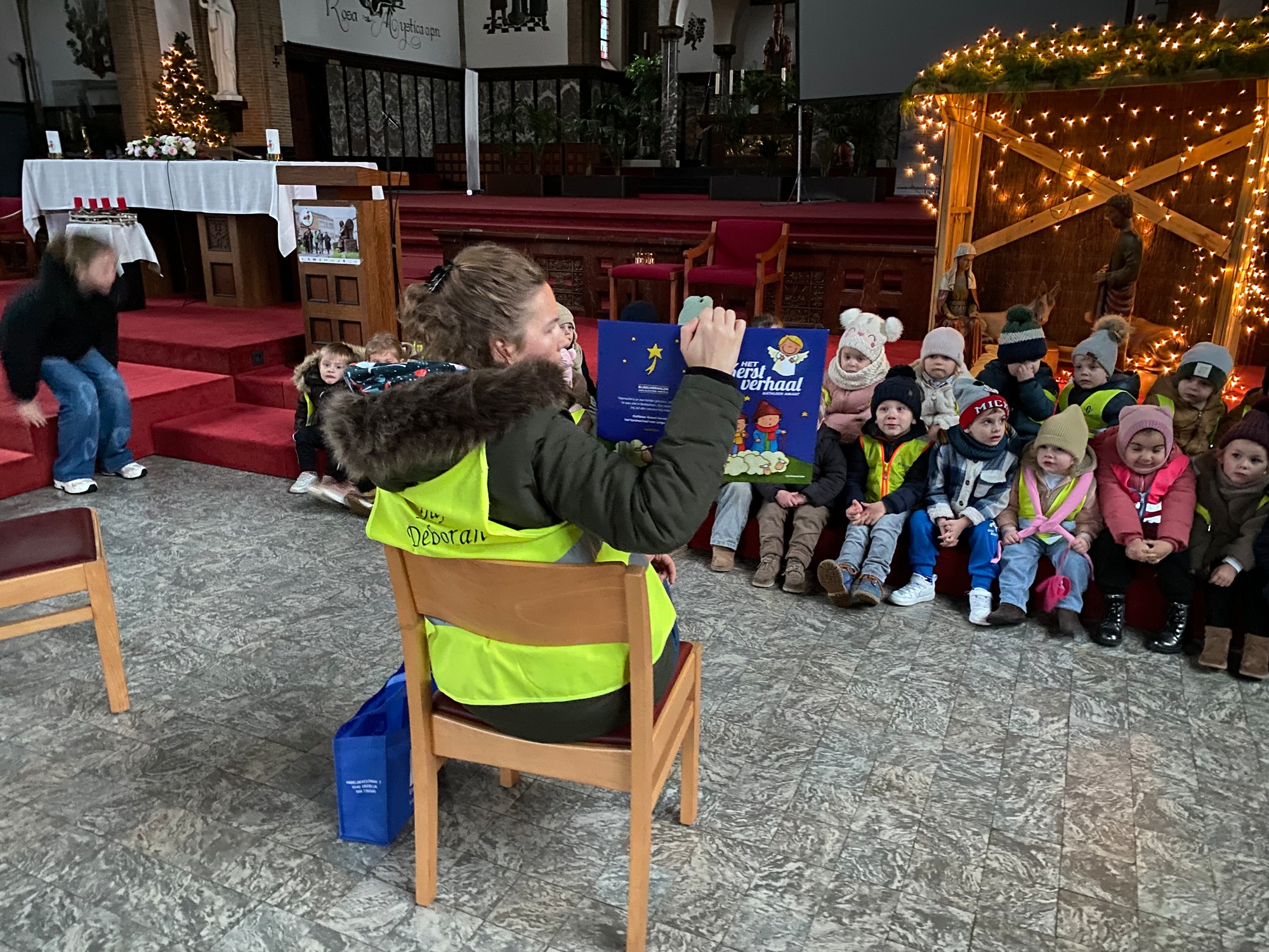 Vandaag gingen we; de kleuters van juf Deborah en juf Els met een pakje naar het sociaal huis. Fien de dochter van juf Deborah was ook mee en hielp ons onderweg. Daarna gingen we naar de kerk om de kerststal te bewonderen. Juf Deborah vertelde het kerstverhaal. We bekeken ook de adventskrans. De kleuters waren vol verwondering.