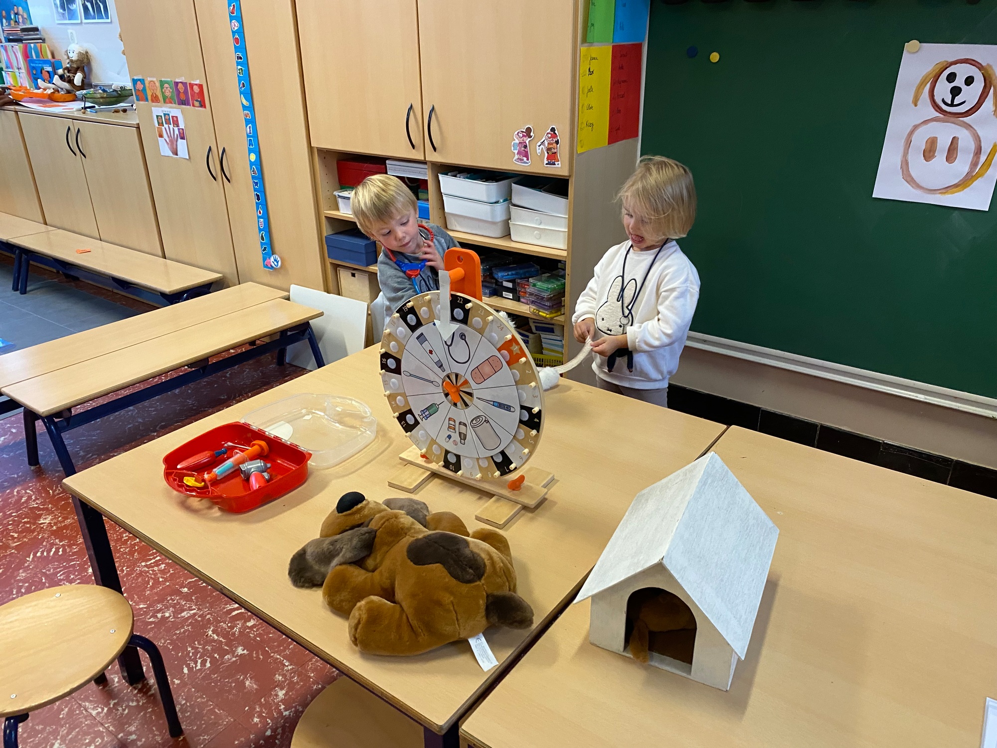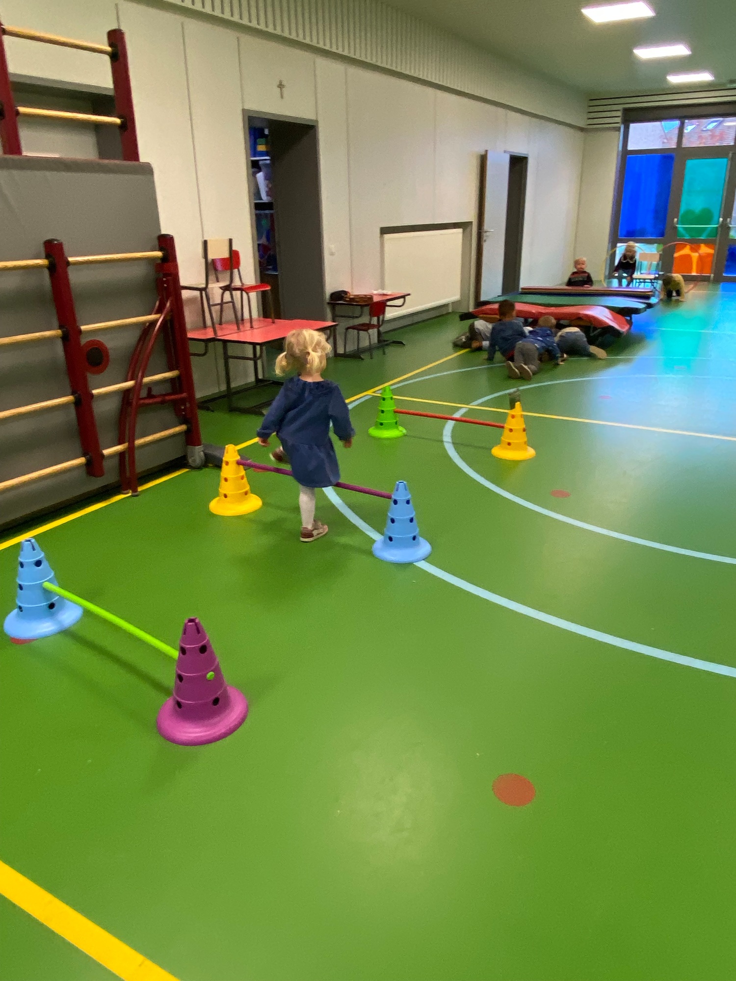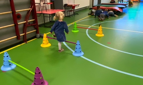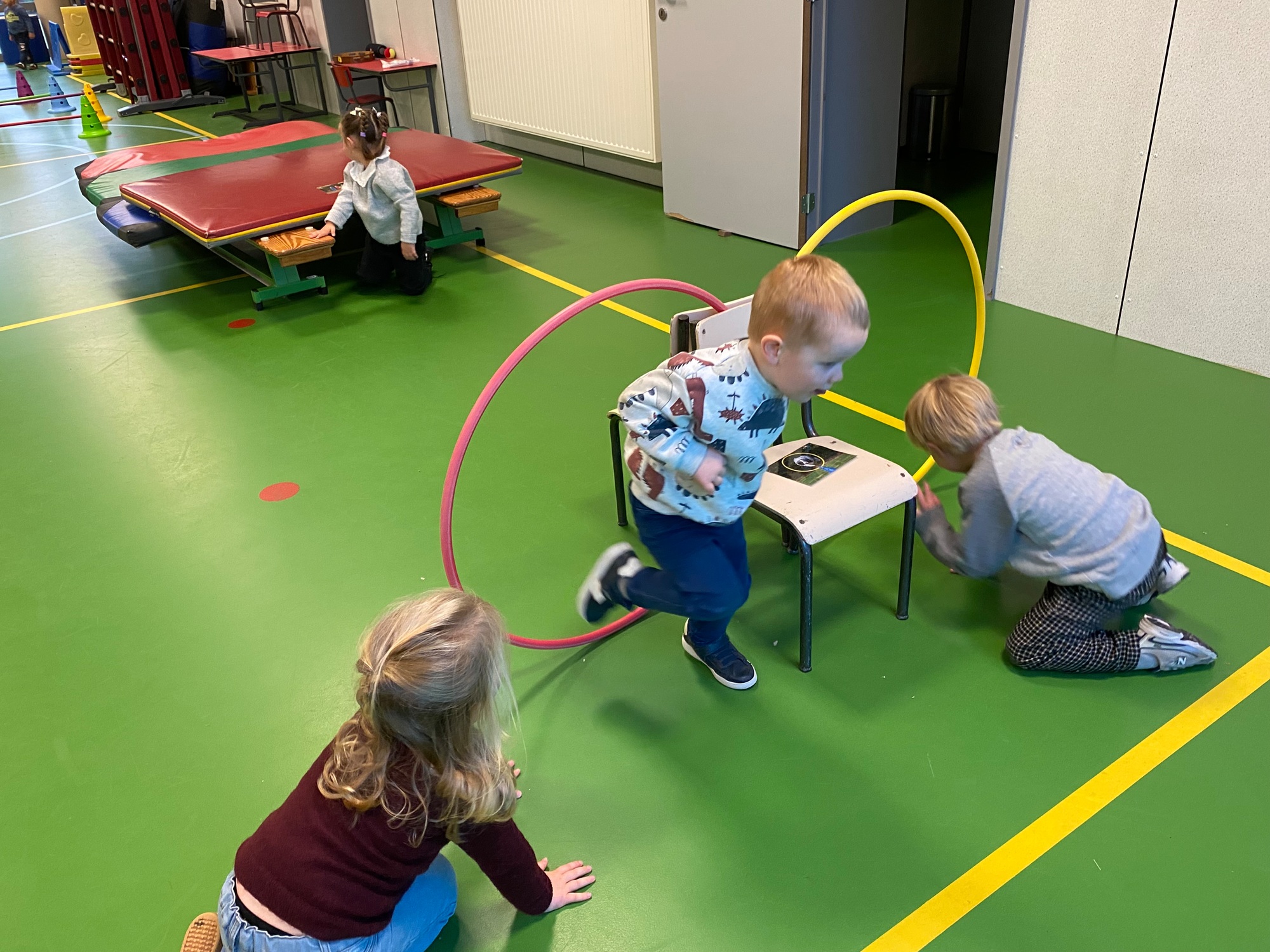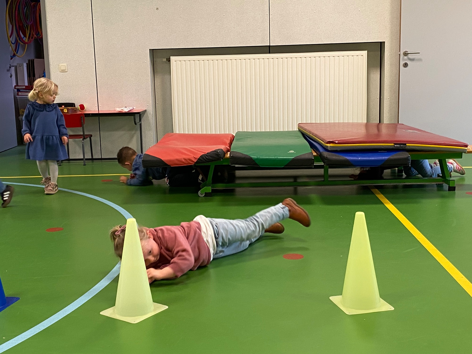 In de gymzaal speelden we de hondenschool waarbij de kleuters allerlei oefeningen moeten uitvoeren.