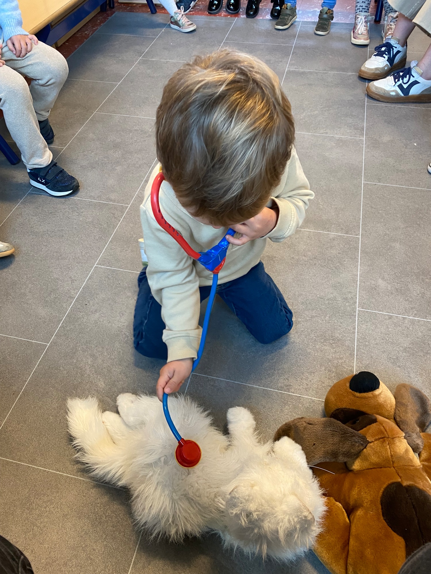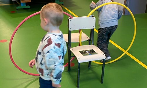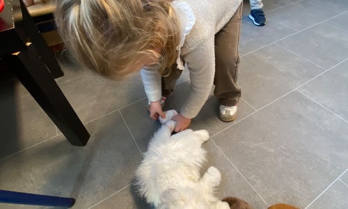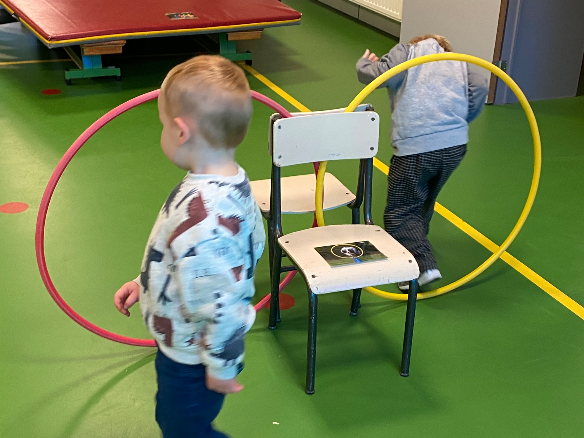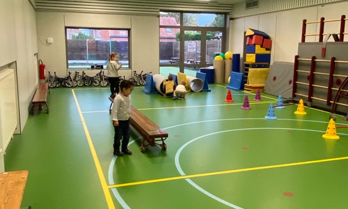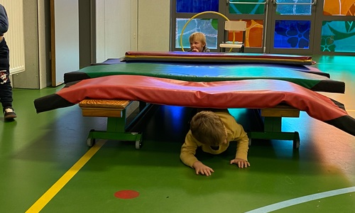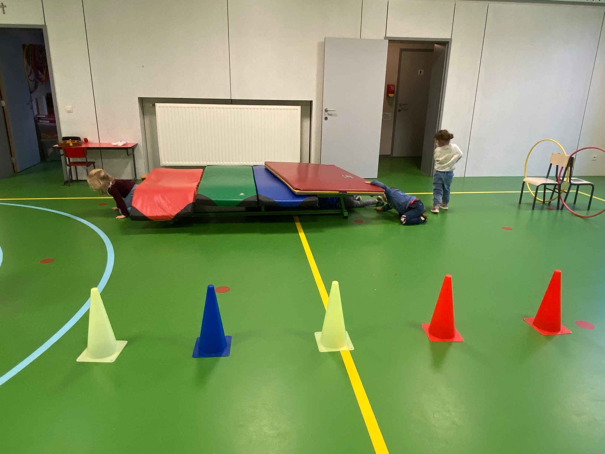 In de gymzaal speelden we de hondenschool waarbij de kleuters allerlei oefeningen moeten uitvoeren.