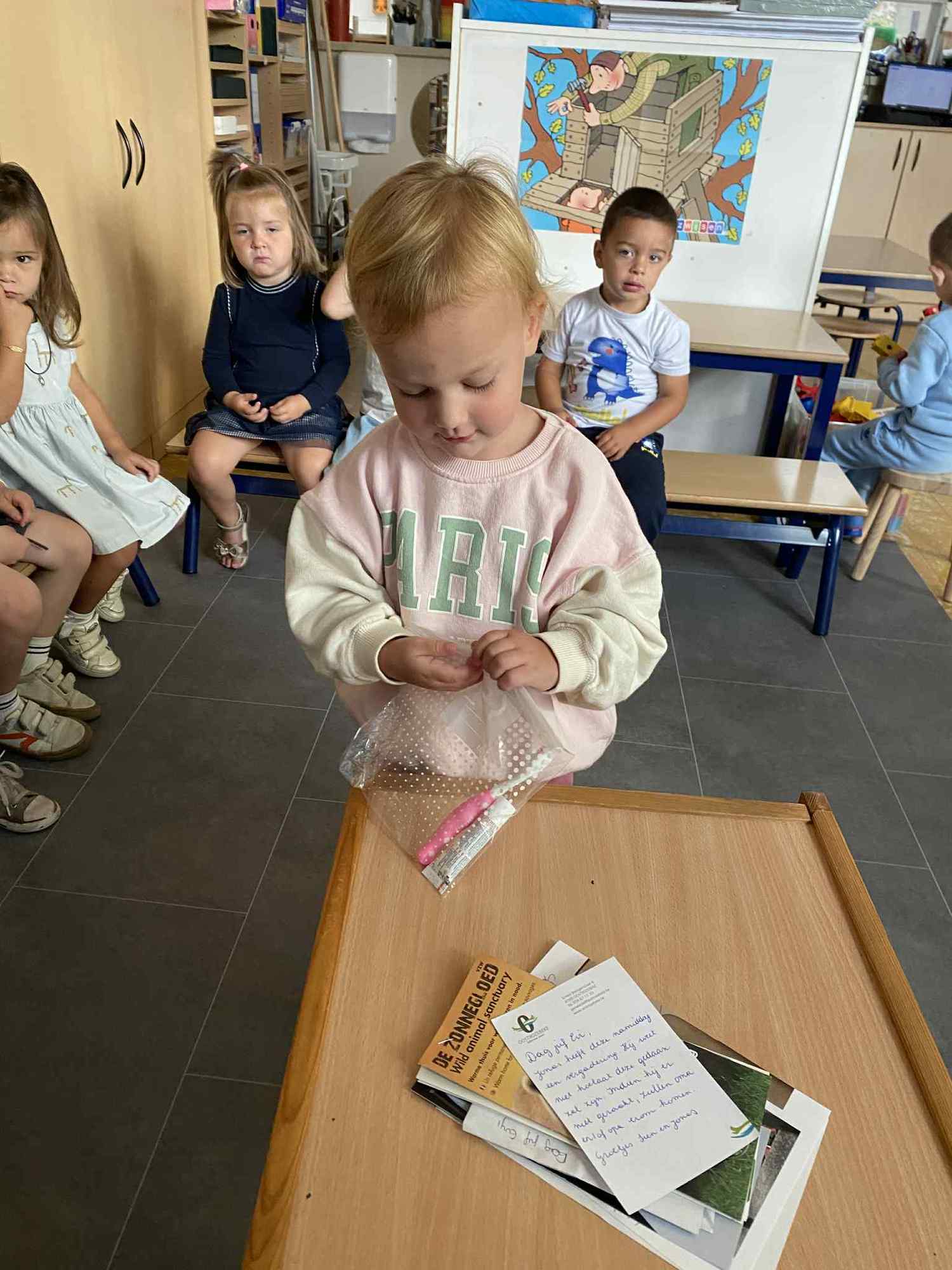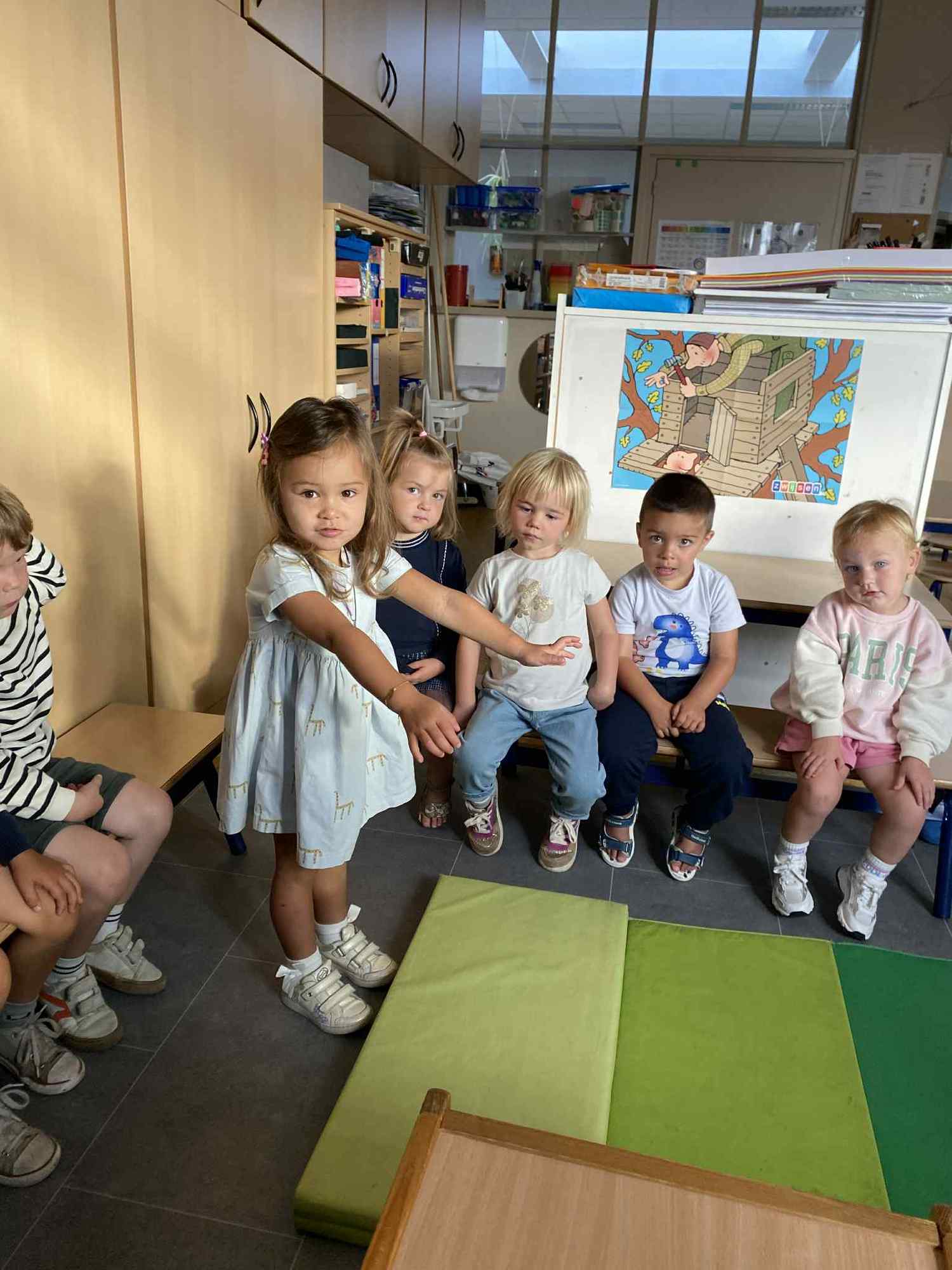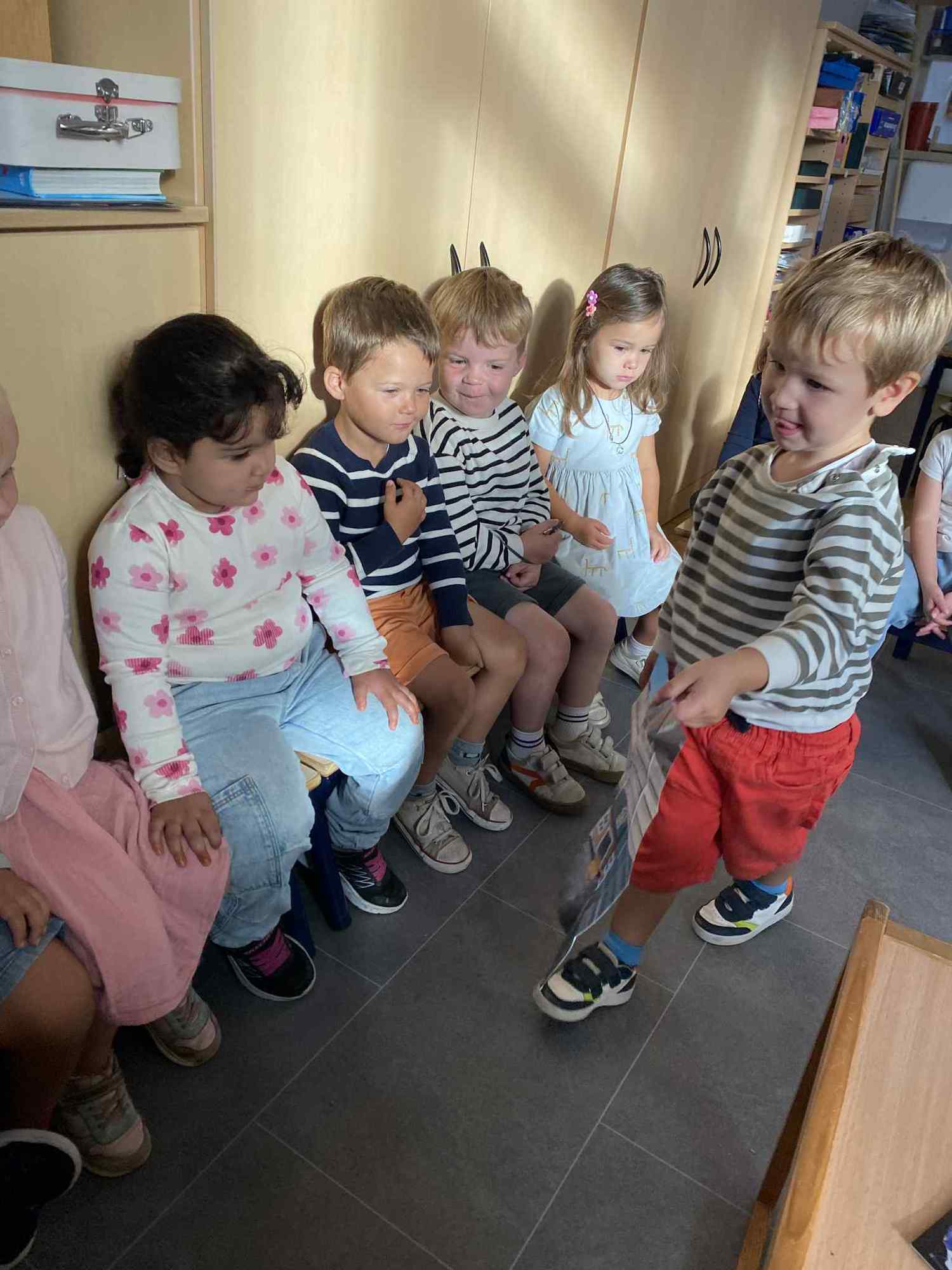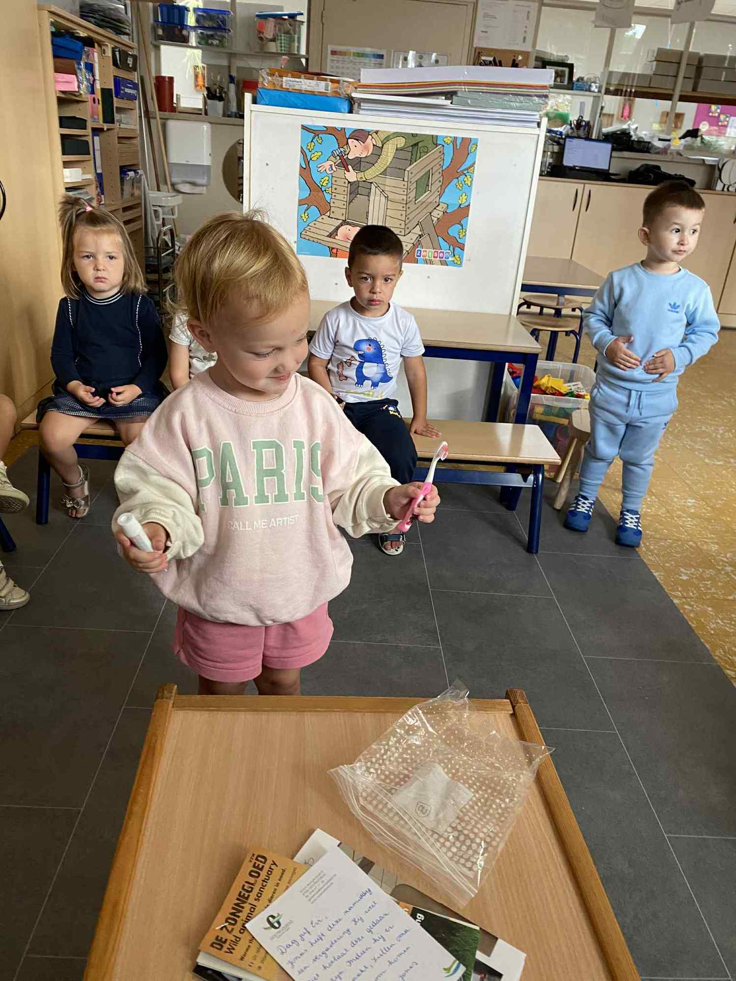 Elke maandag kunnen de kleuters een voorwerp, briefje, foto,.. meebrengen naar de klas van iets wat in het weekend gebeurde. Zo hebben ze een houvast om te vertellen. Maandag leerden we al over de tandarts, de eerste turnlessen, kippen in de tuin, dierentuinbezoekjes en rallywagens!