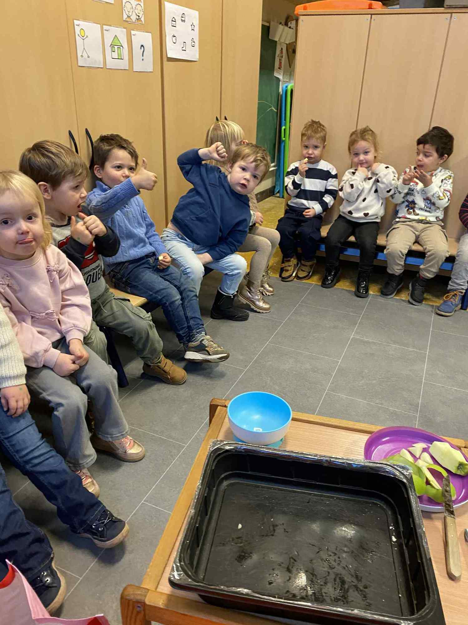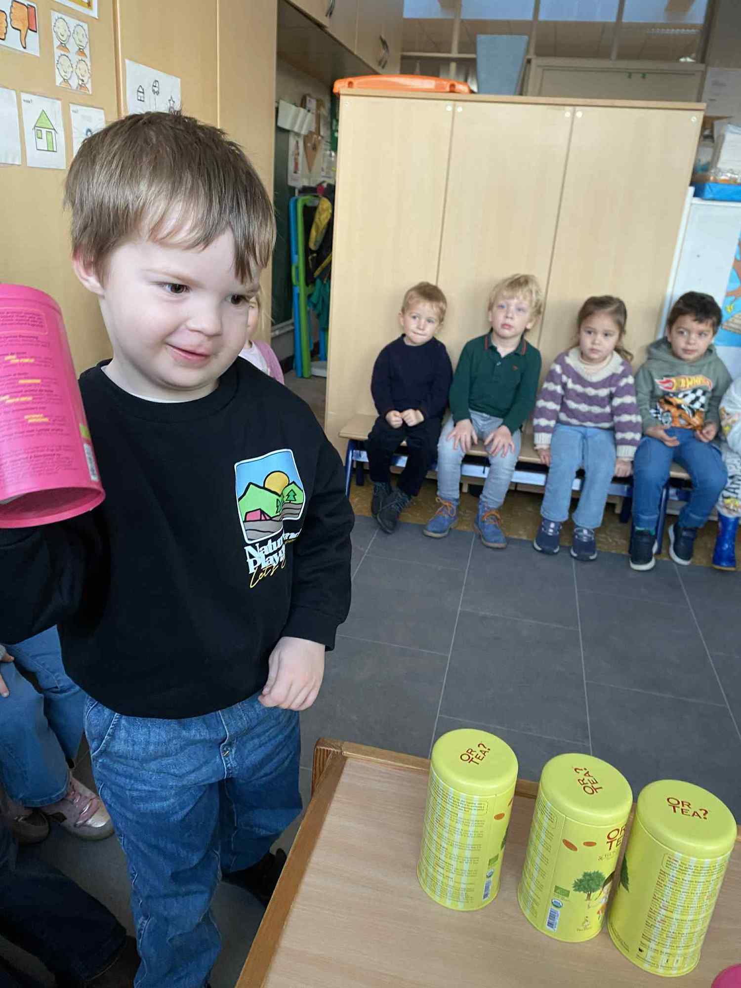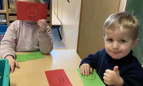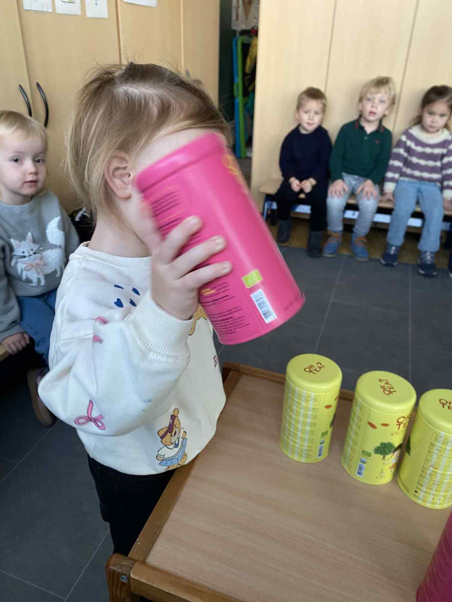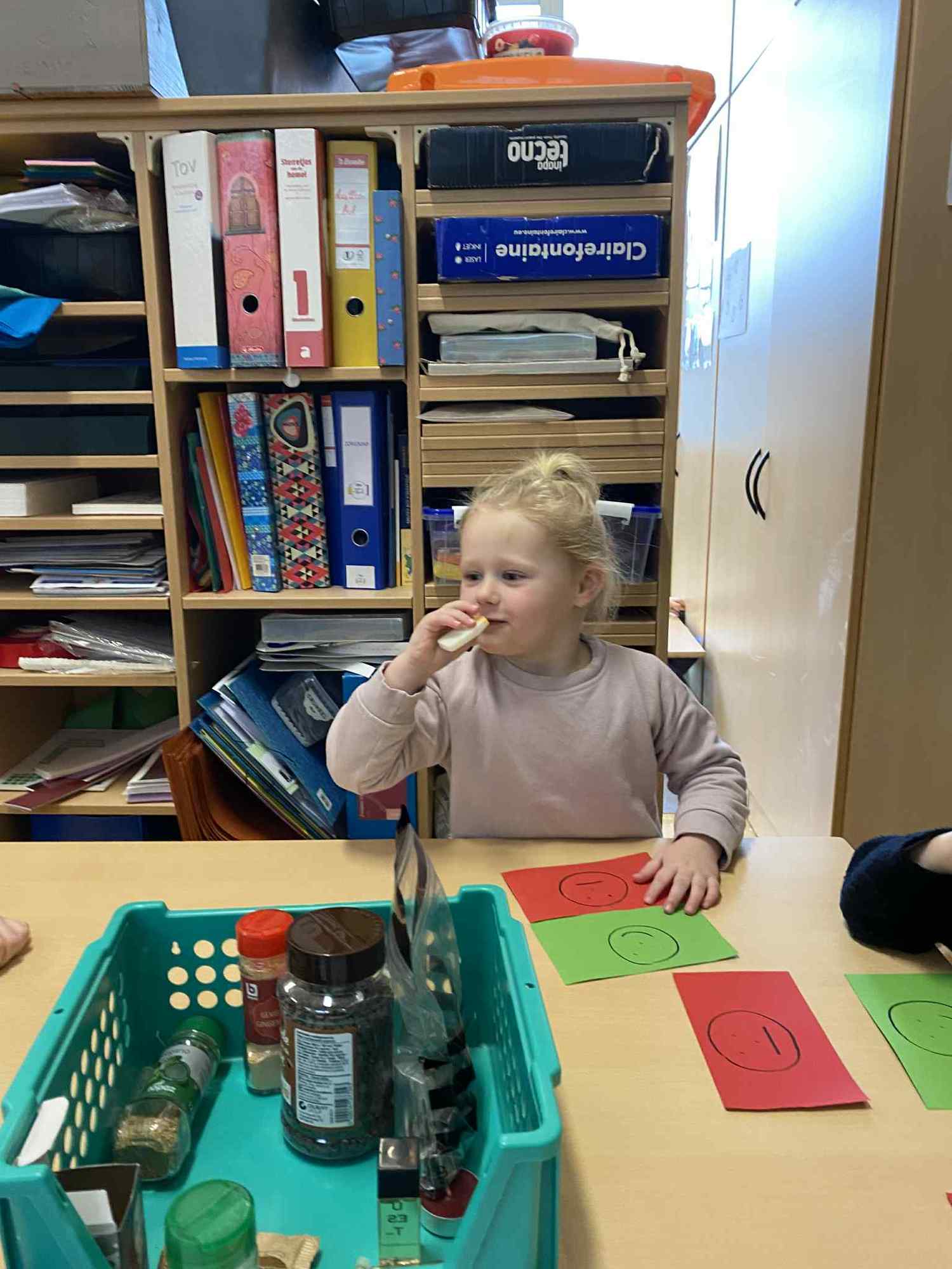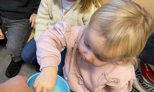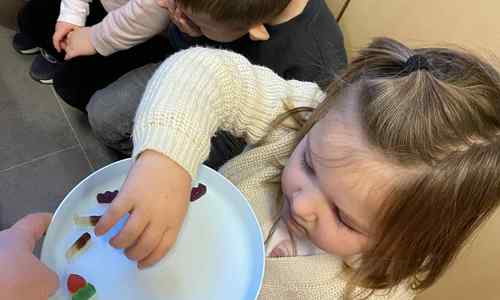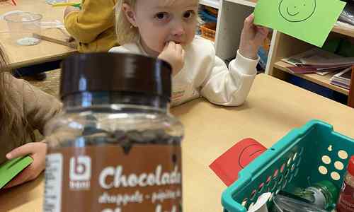 Voelen met handen en voeten, kijken met onze ogen, luisteren met onze oren, ruiken met onze neus en proeven! Wat ruikt lekker? Wat vind ik lekker en wat lust ik niet. We tellen tot aan 3!