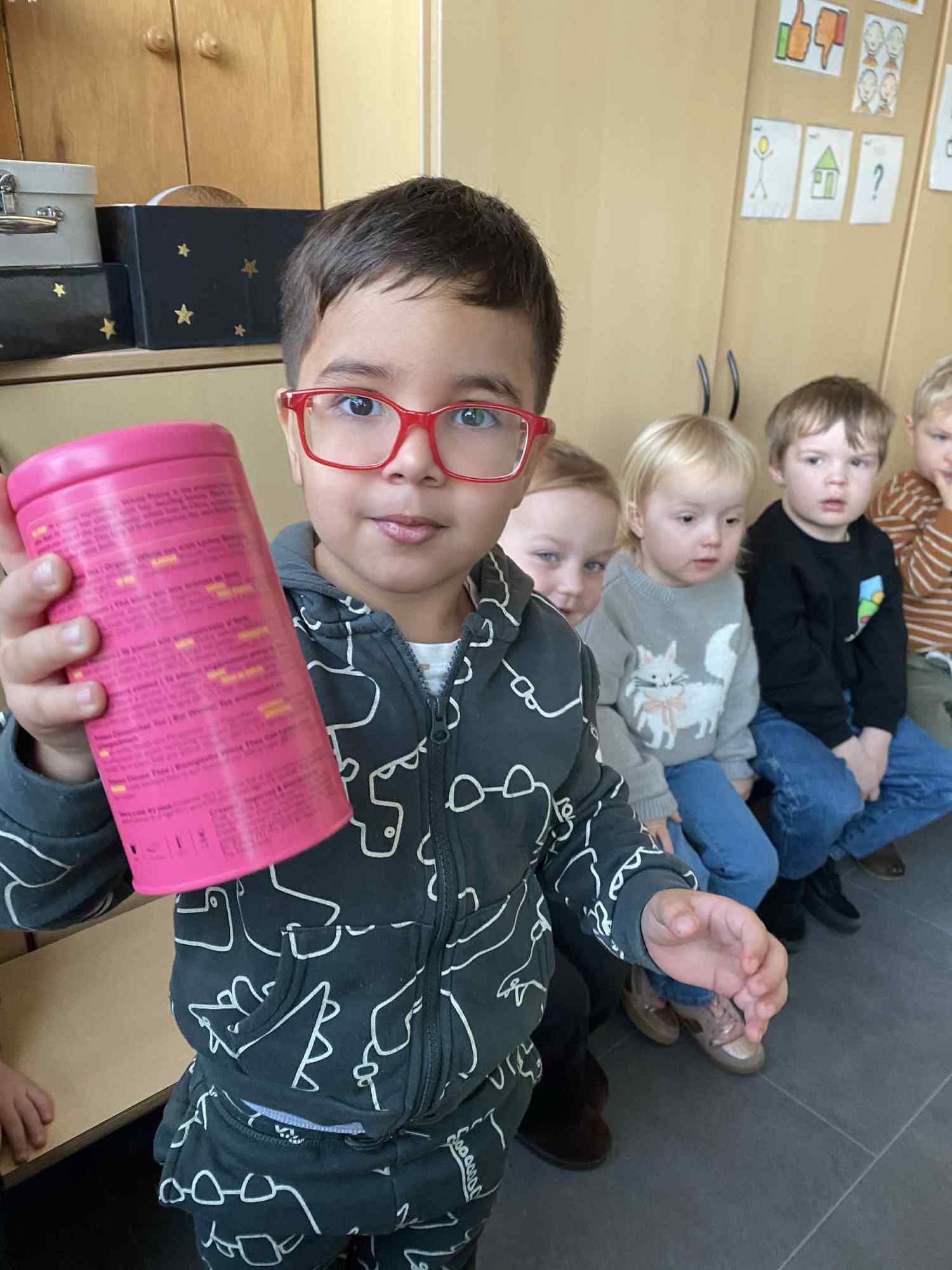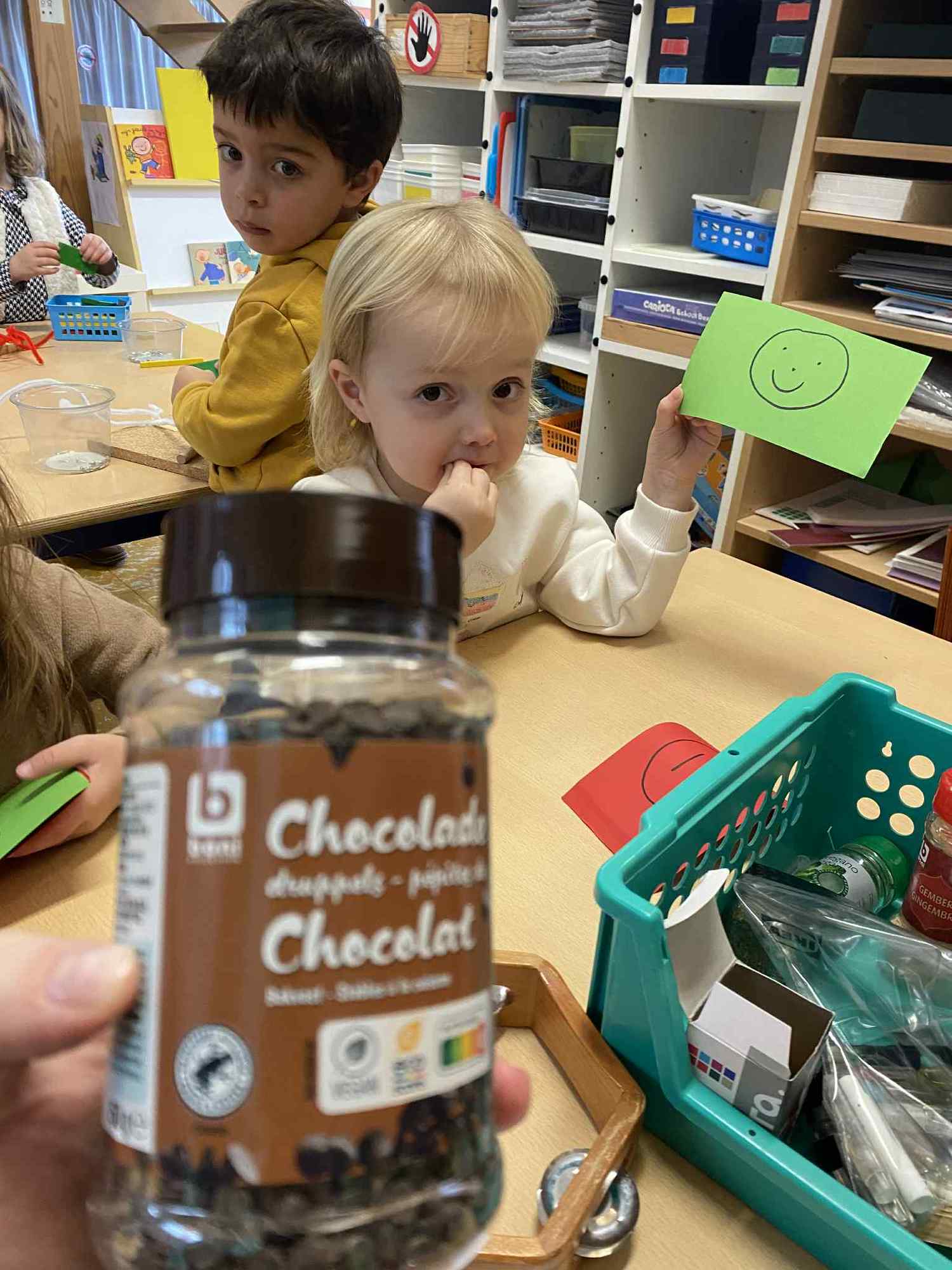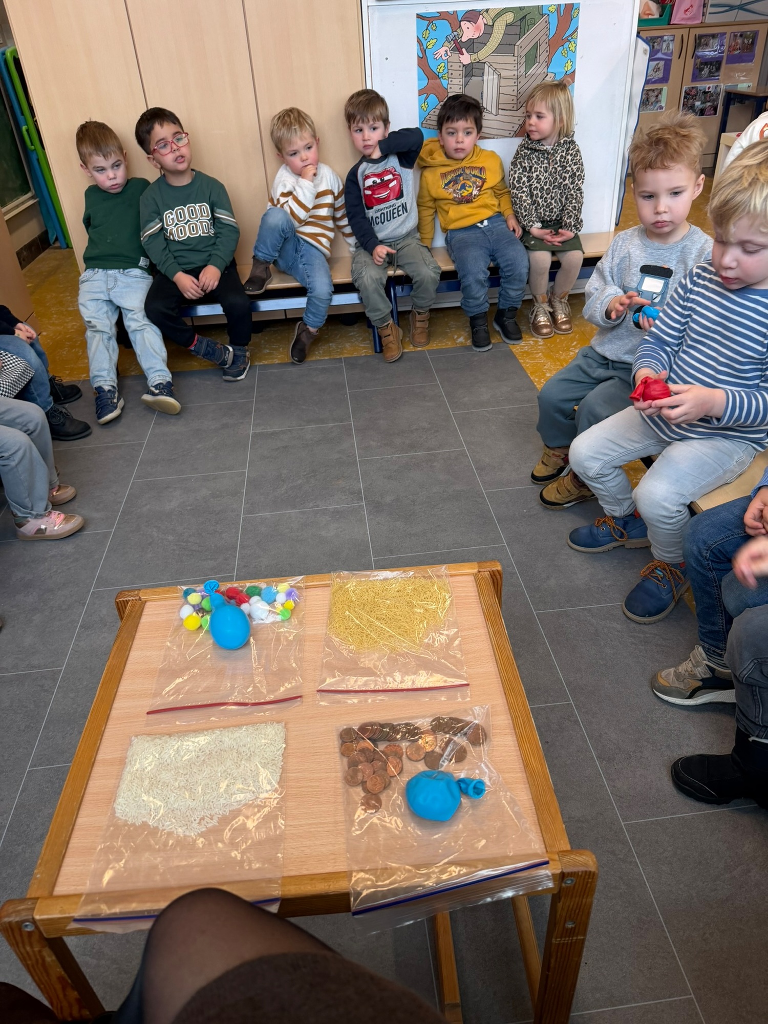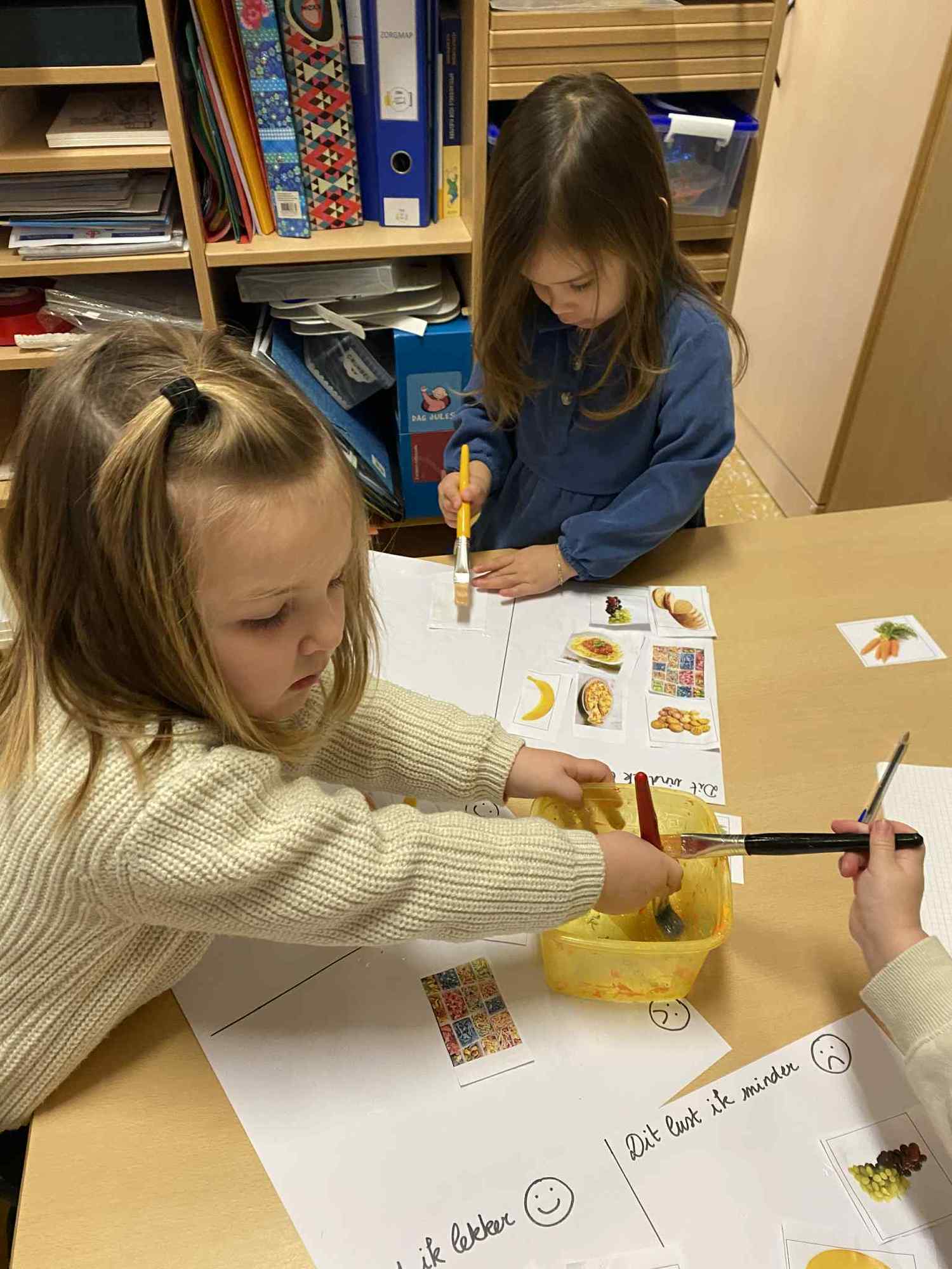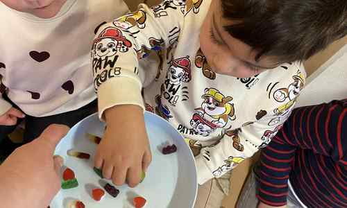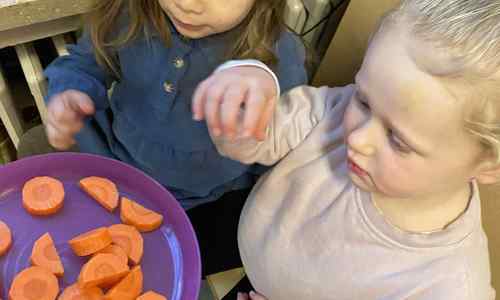 Voelen met handen en voeten, kijken met onze ogen, luisteren met onze oren, ruiken met onze neus en proeven! Wat ruikt lekker? Wat vind ik lekker en wat lust ik niet. We tellen tot aan 3!