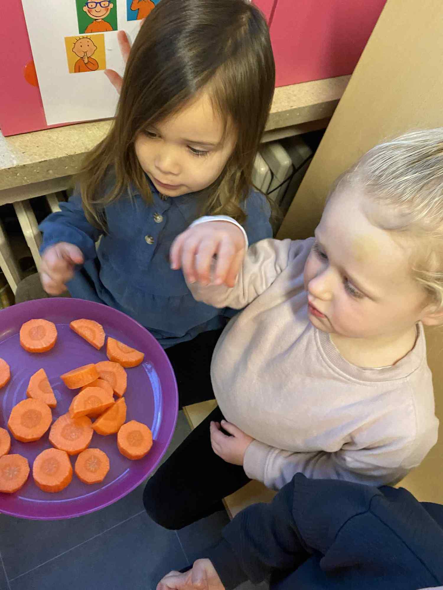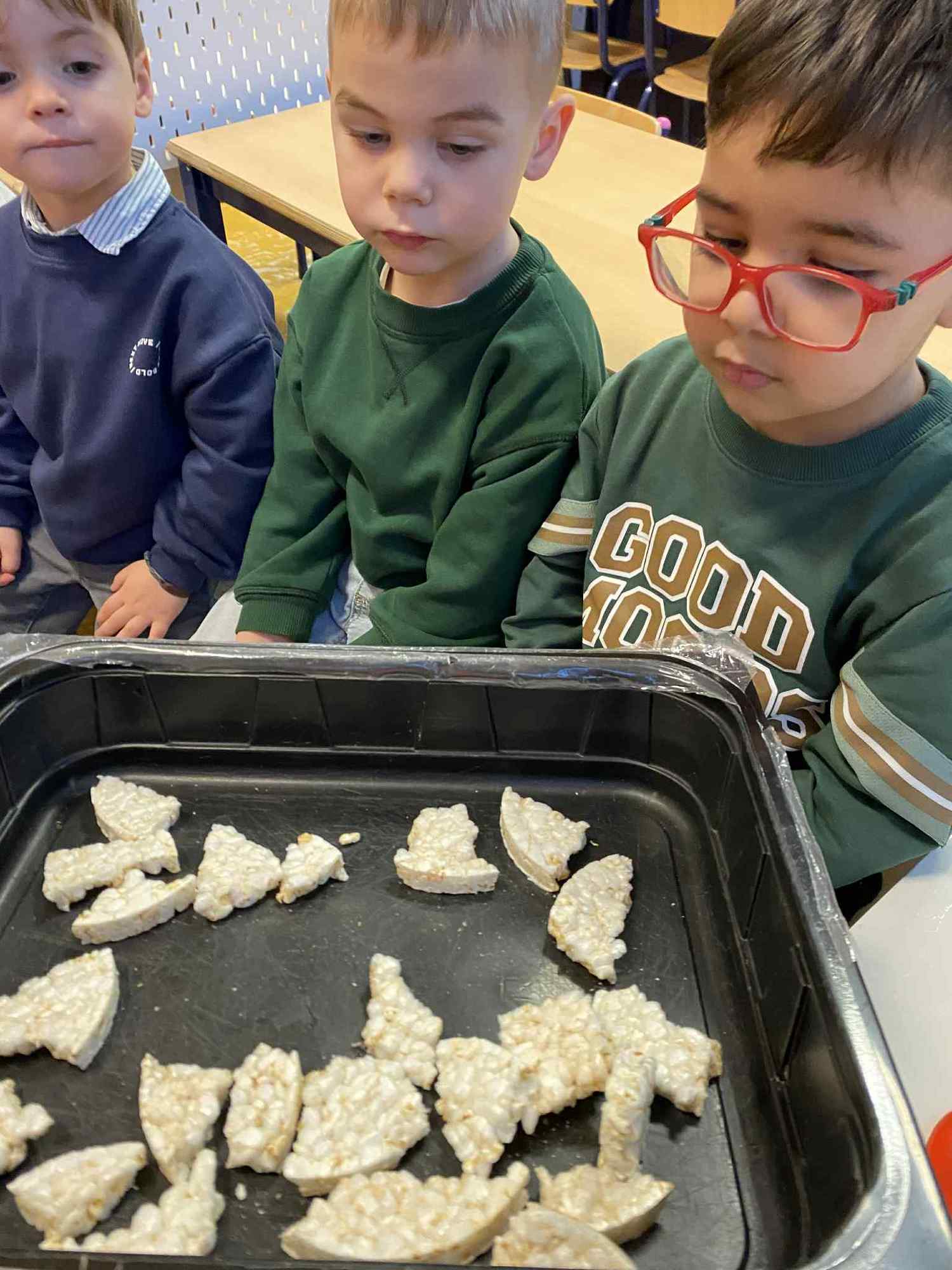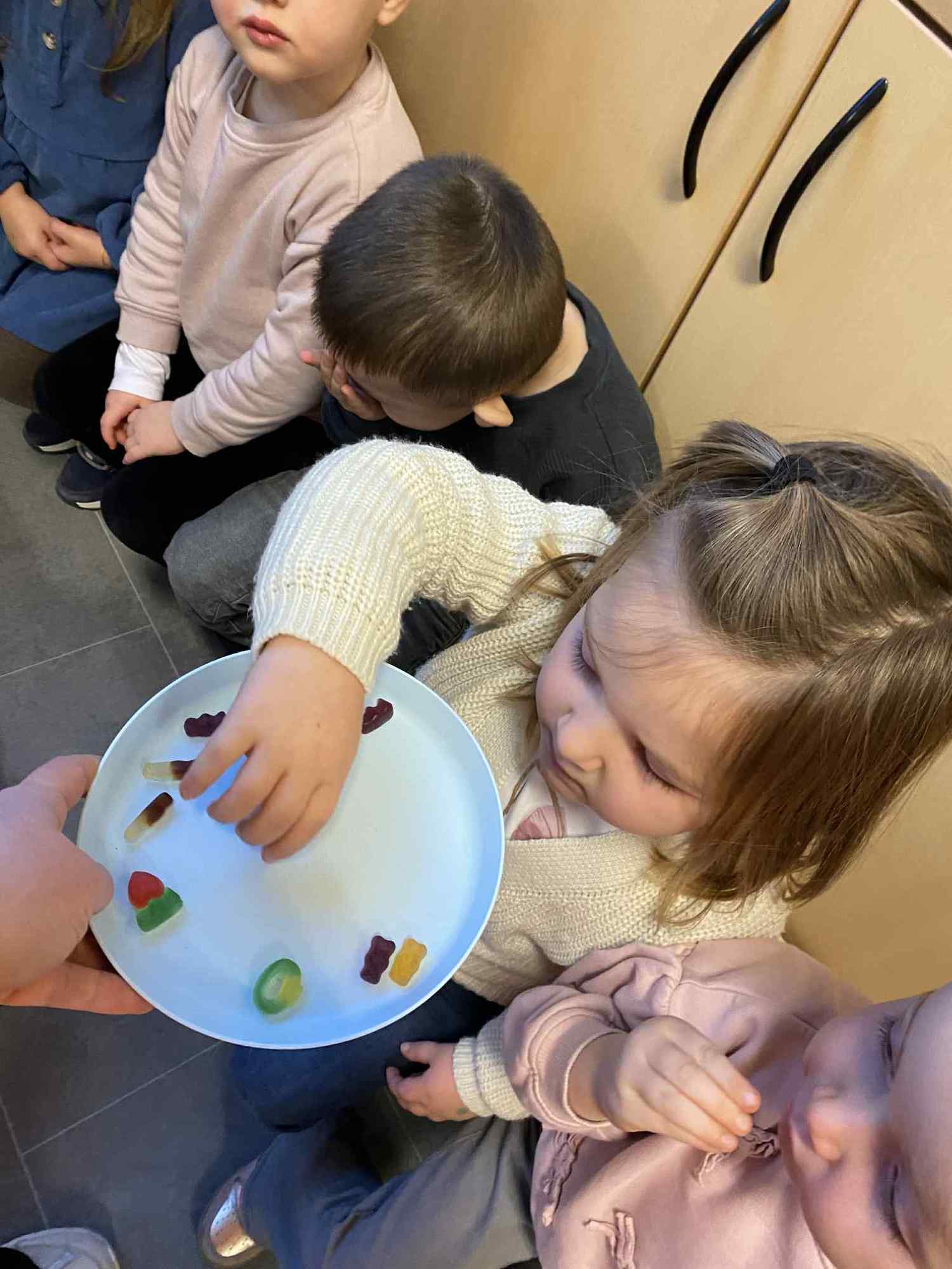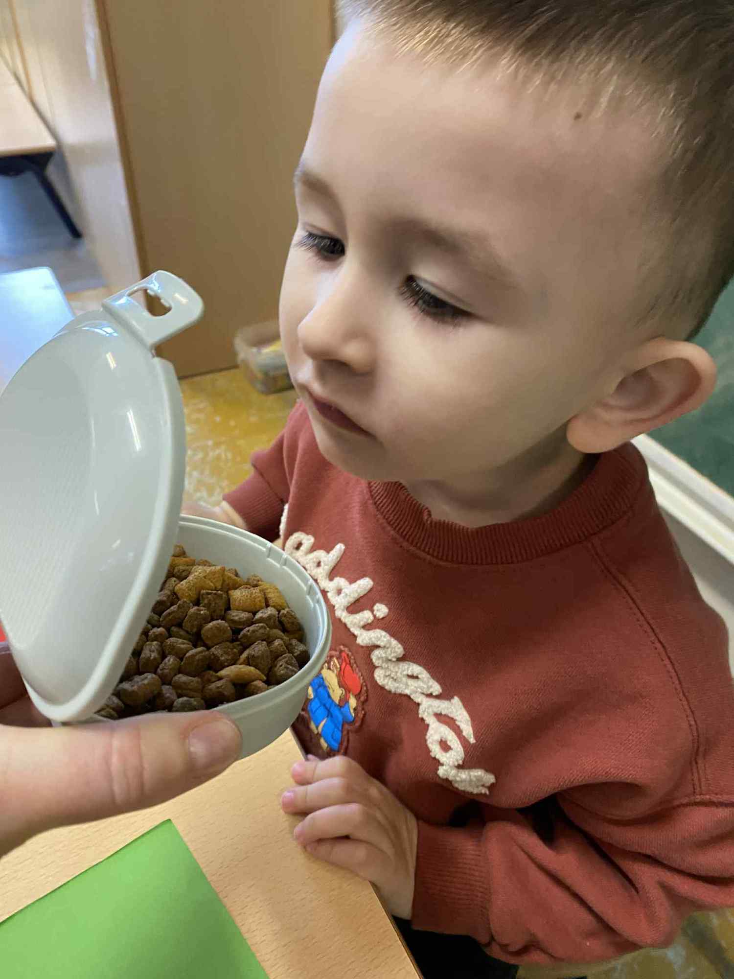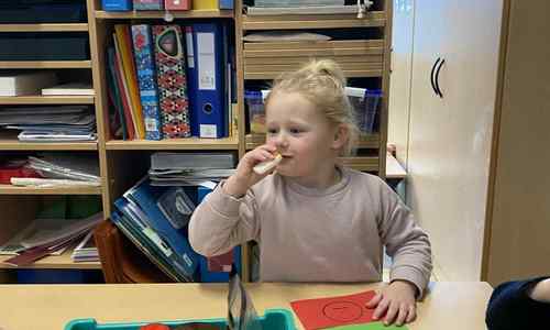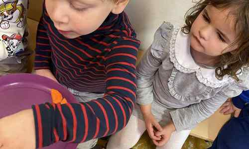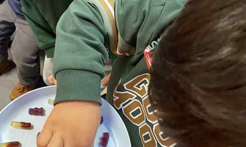 Voelen met handen en voeten, kijken met onze ogen, luisteren met onze oren, ruiken met onze neus en proeven! Wat ruikt lekker? Wat vind ik lekker en wat lust ik niet. We tellen tot aan 3!