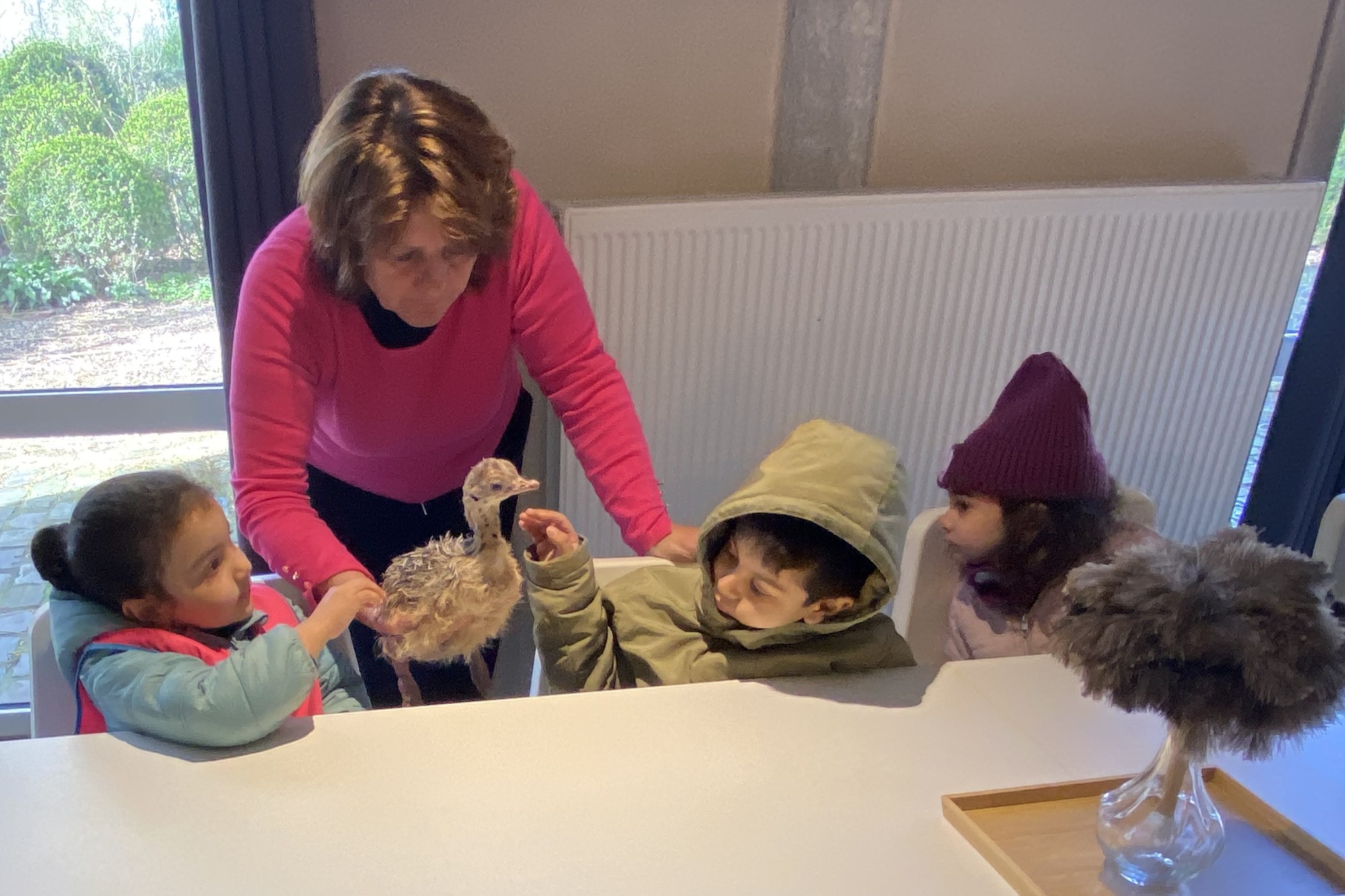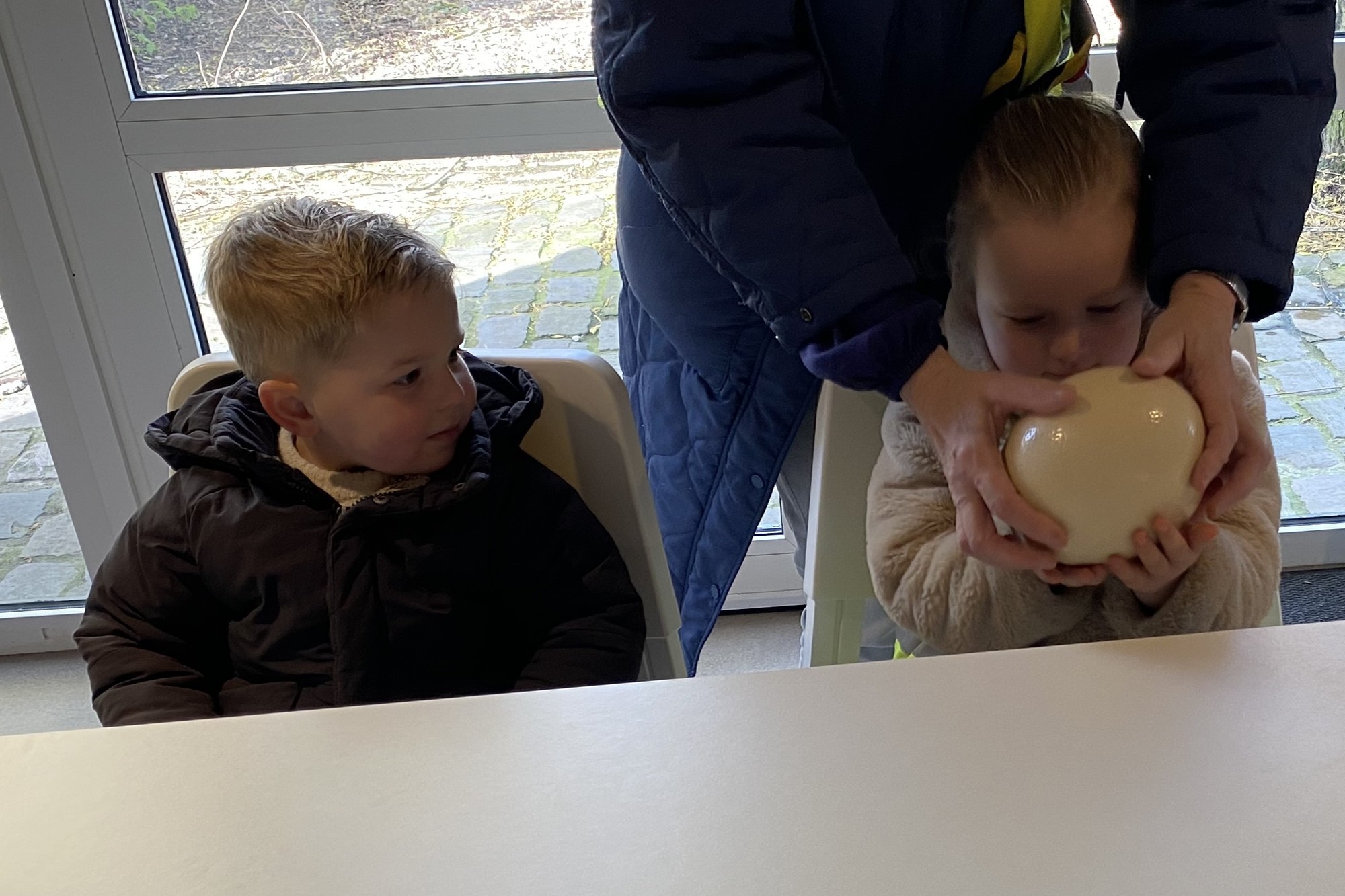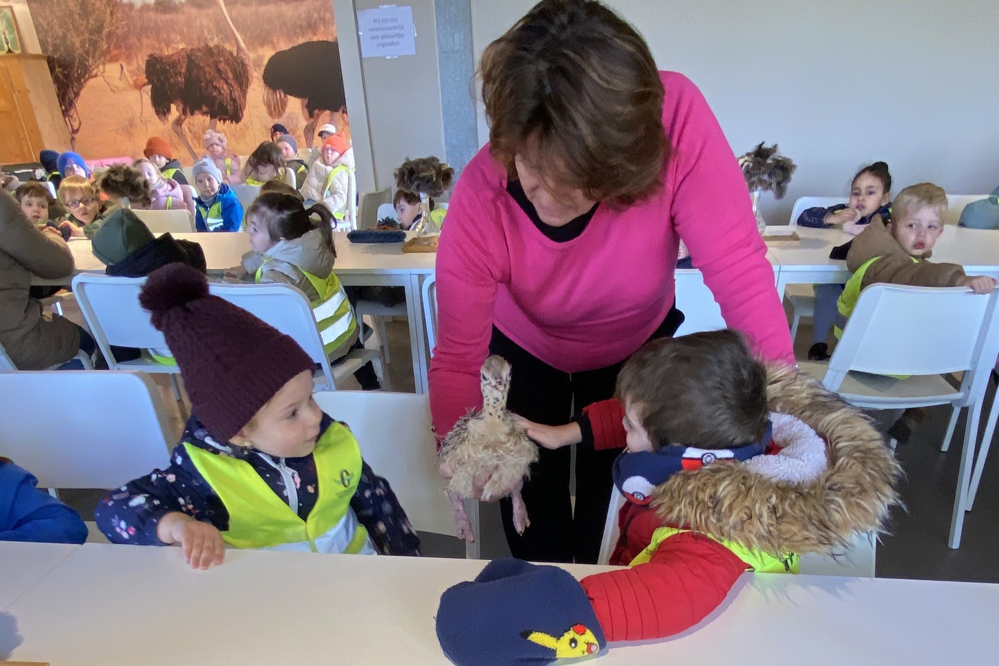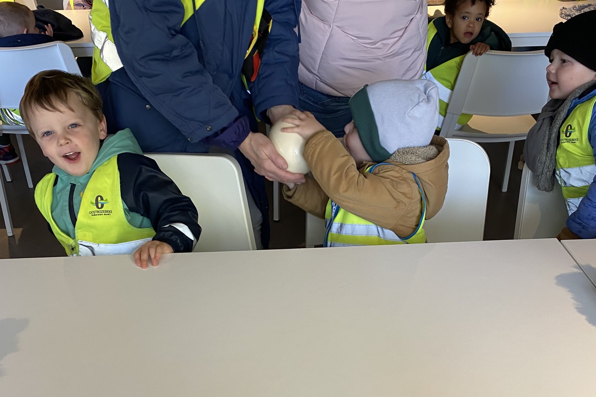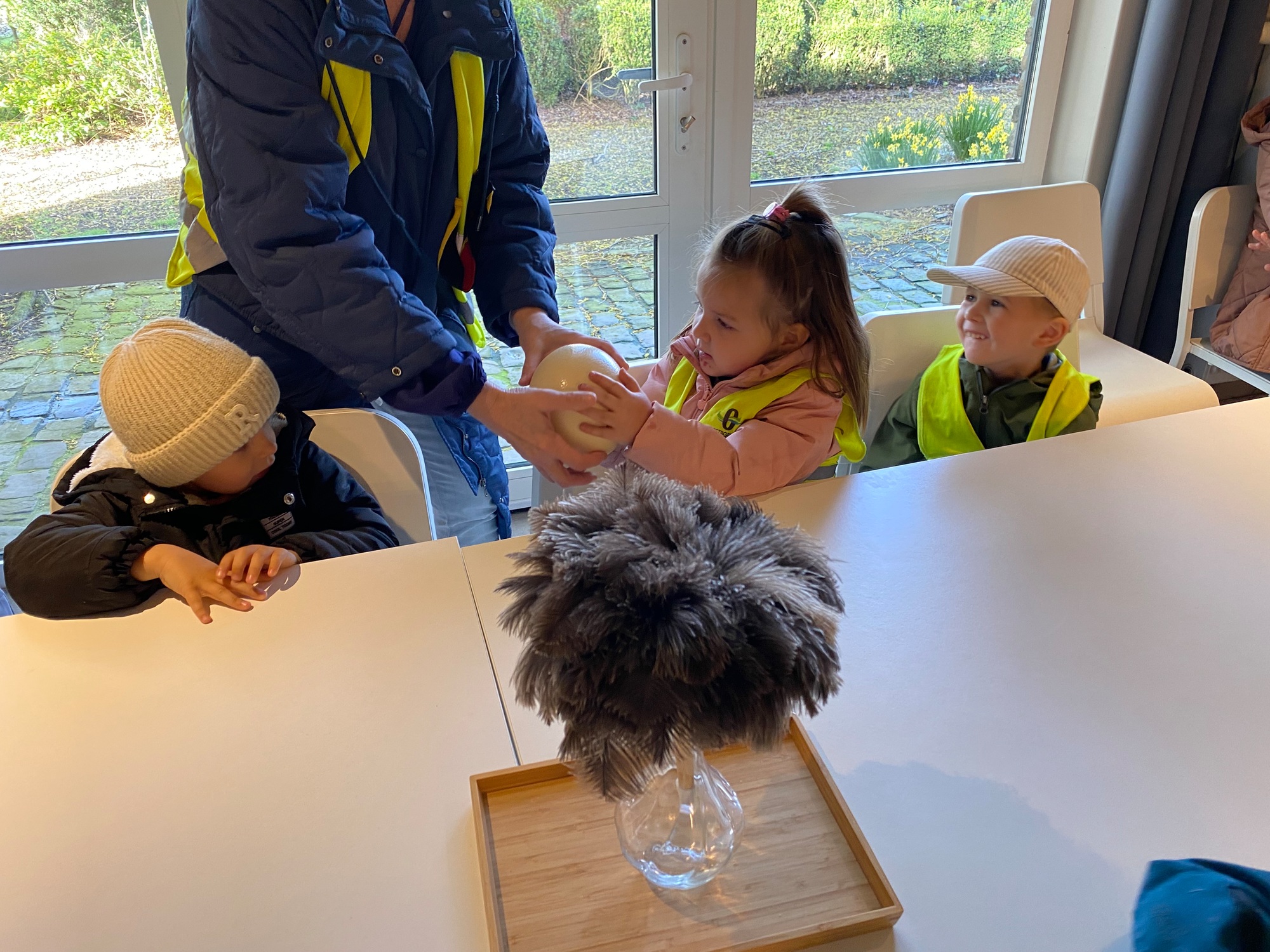 Een ei wegen, een kuikentje strelen, elkaar afstoffen, de grote dieren bekijken en een stukje cake eten...het hoort er allemaal bij