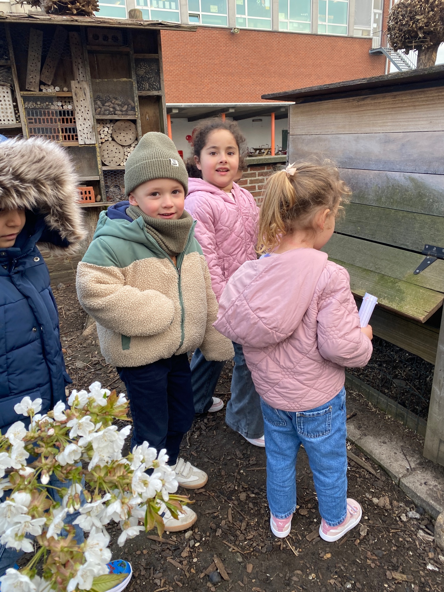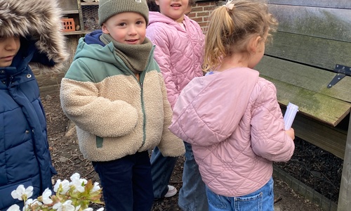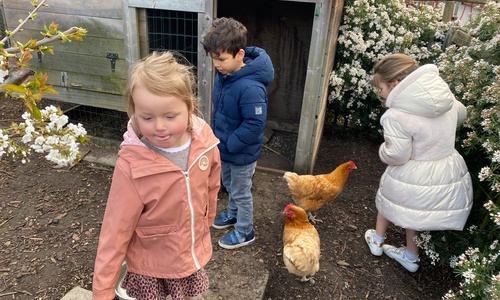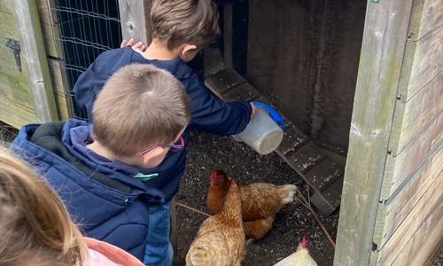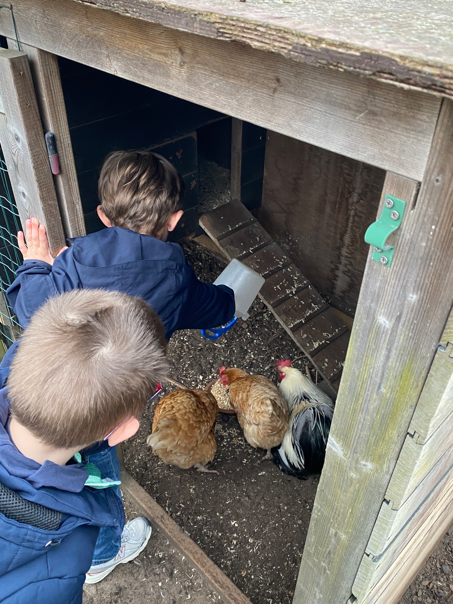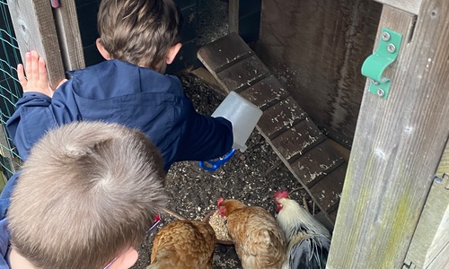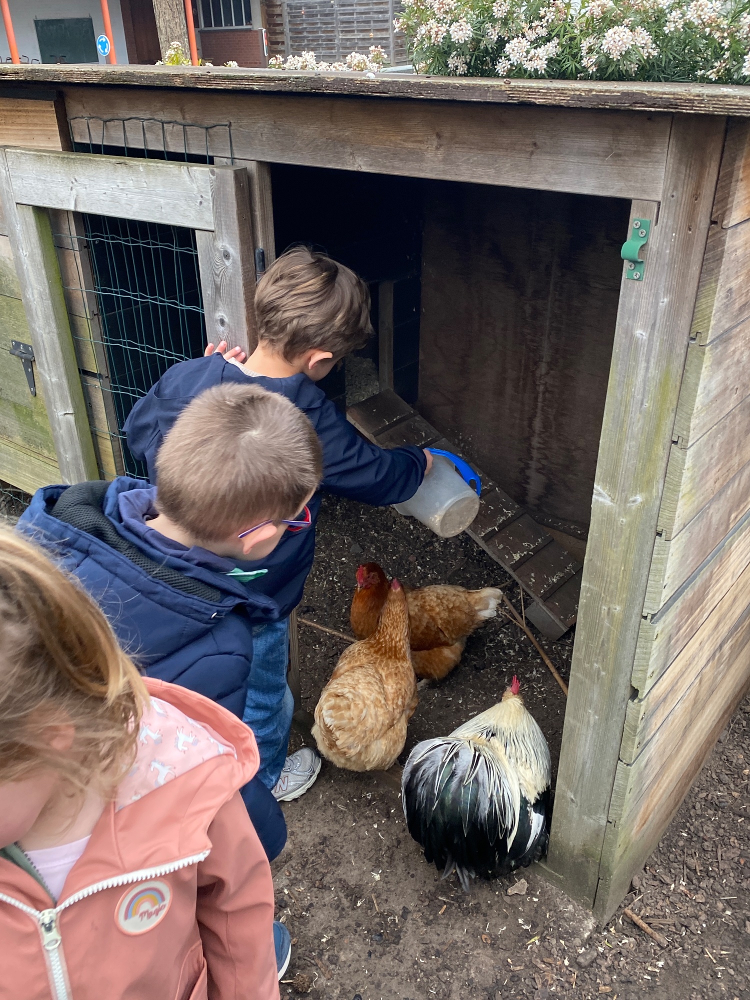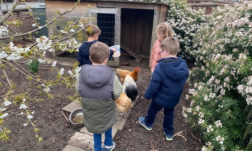 We kregen voor de vakantie de taak om de schoolkippen te verzorgen. Liggen er eitjes in het hok? Eten en drinken voorzien.