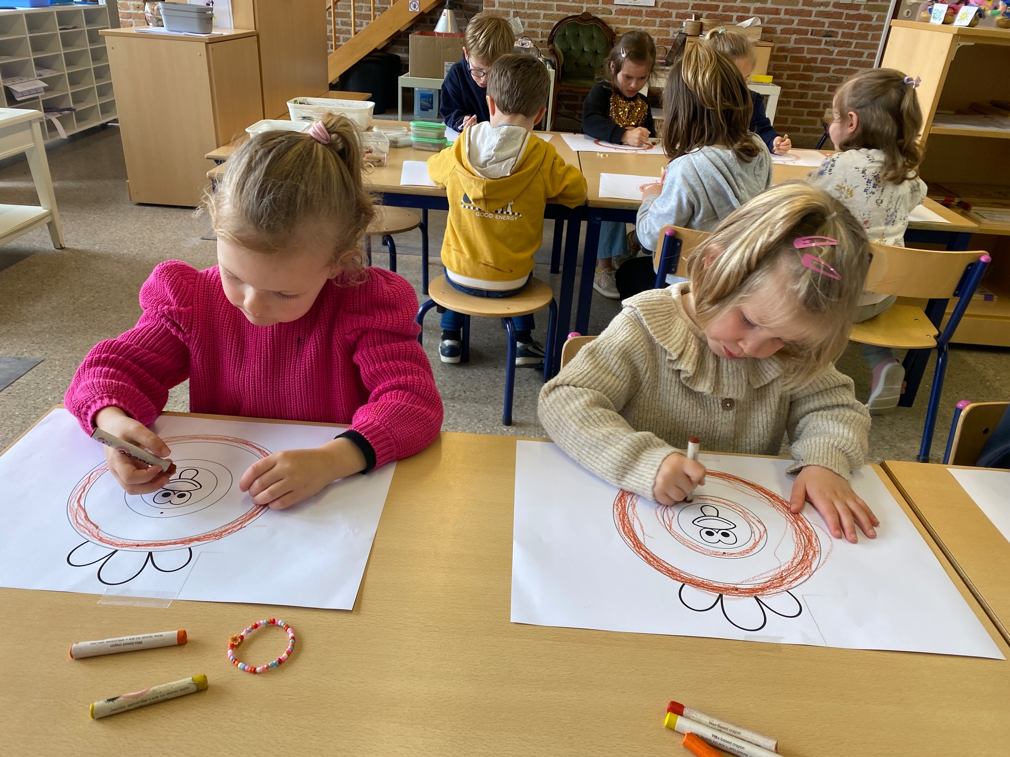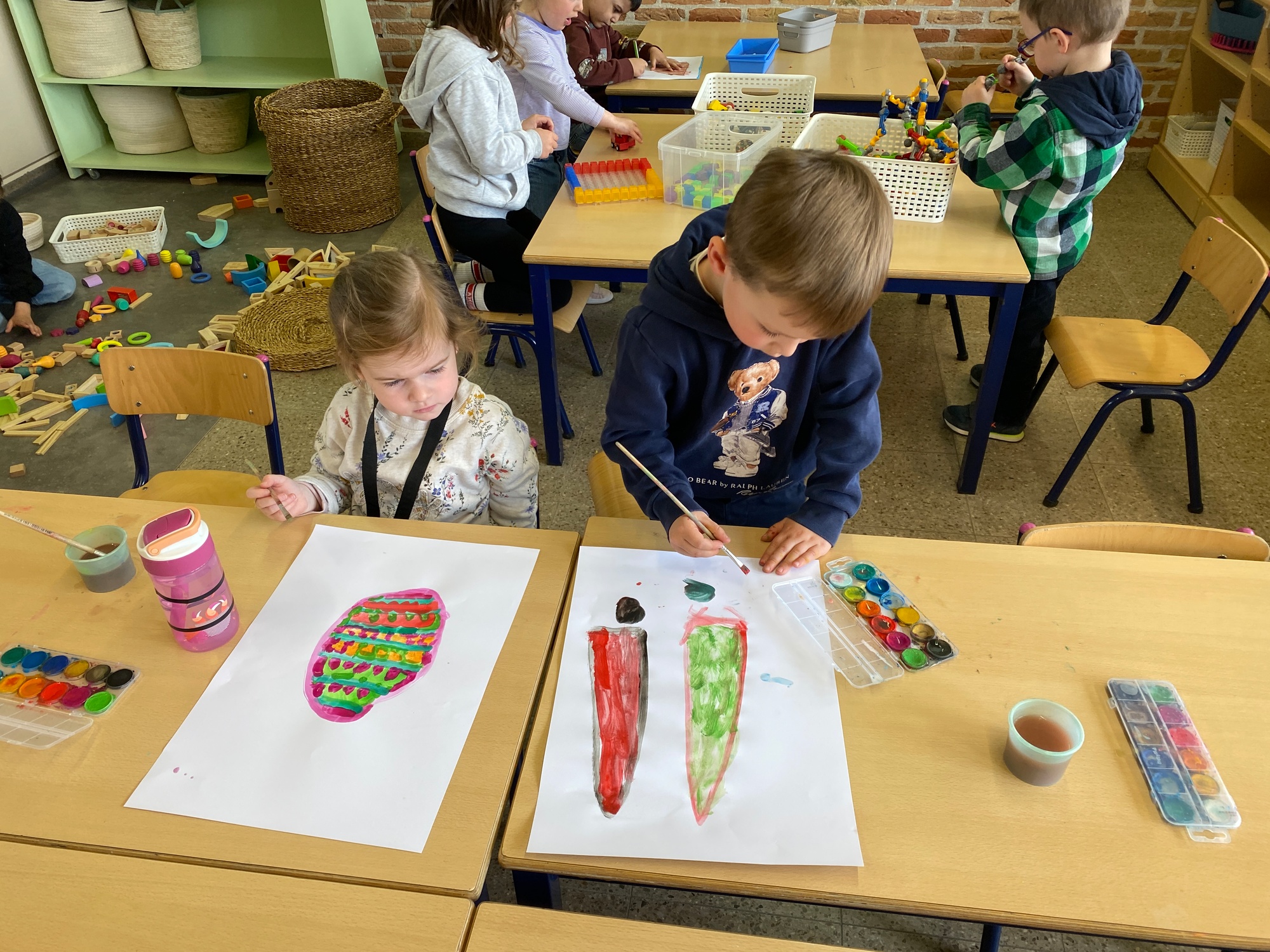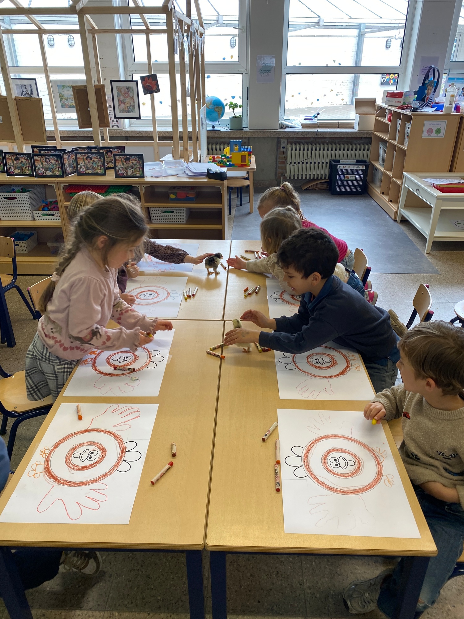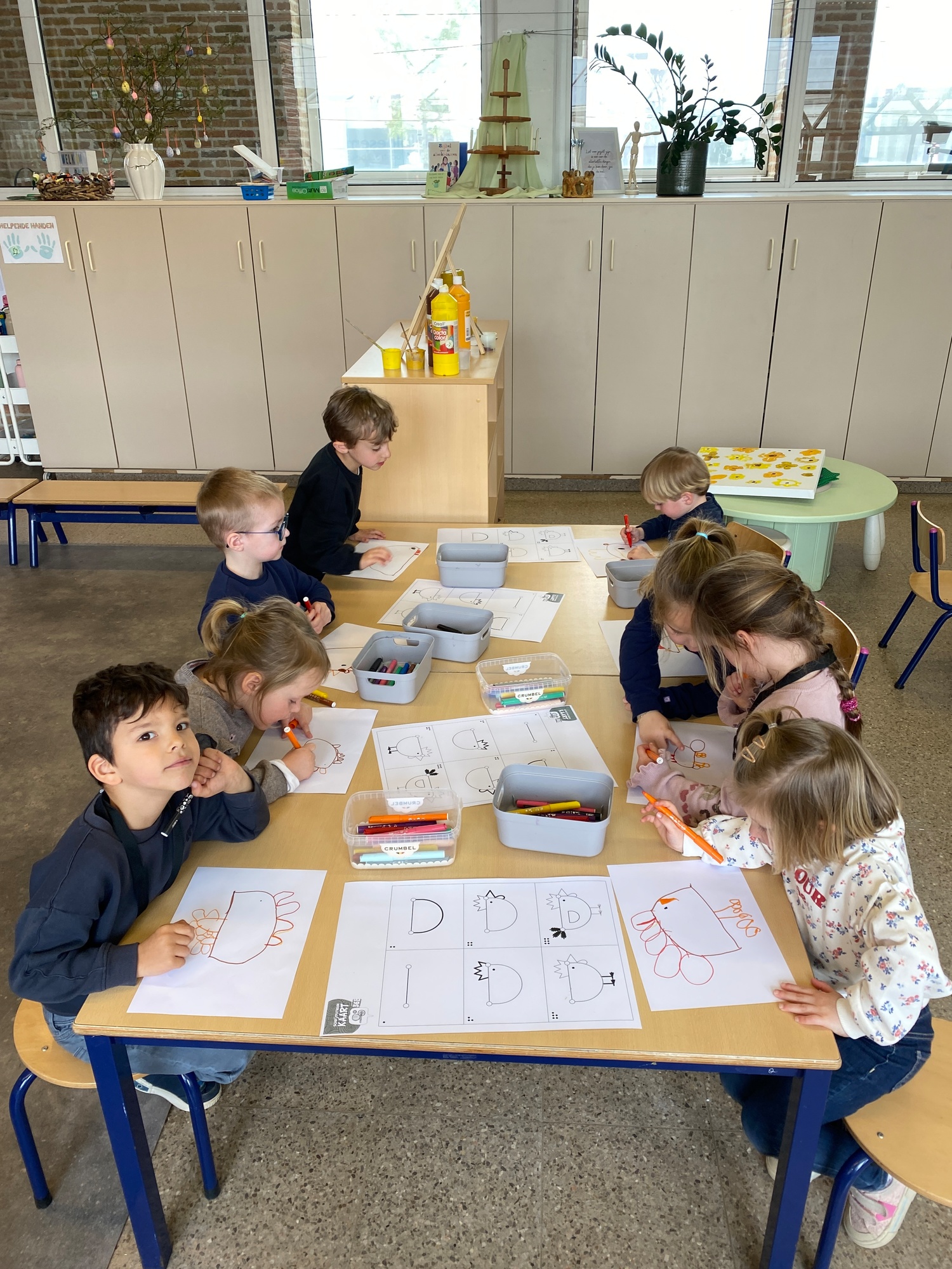 We tekenden een kip. Wat zien jullie bij het kuikentje op tafel? Teken maar na. We schilderden een ei. Net zoals Poelette in het boekje: 'Het allereerste ei.' probeerden we het mooiste ei te versieren. Werden het mooie eitjes?