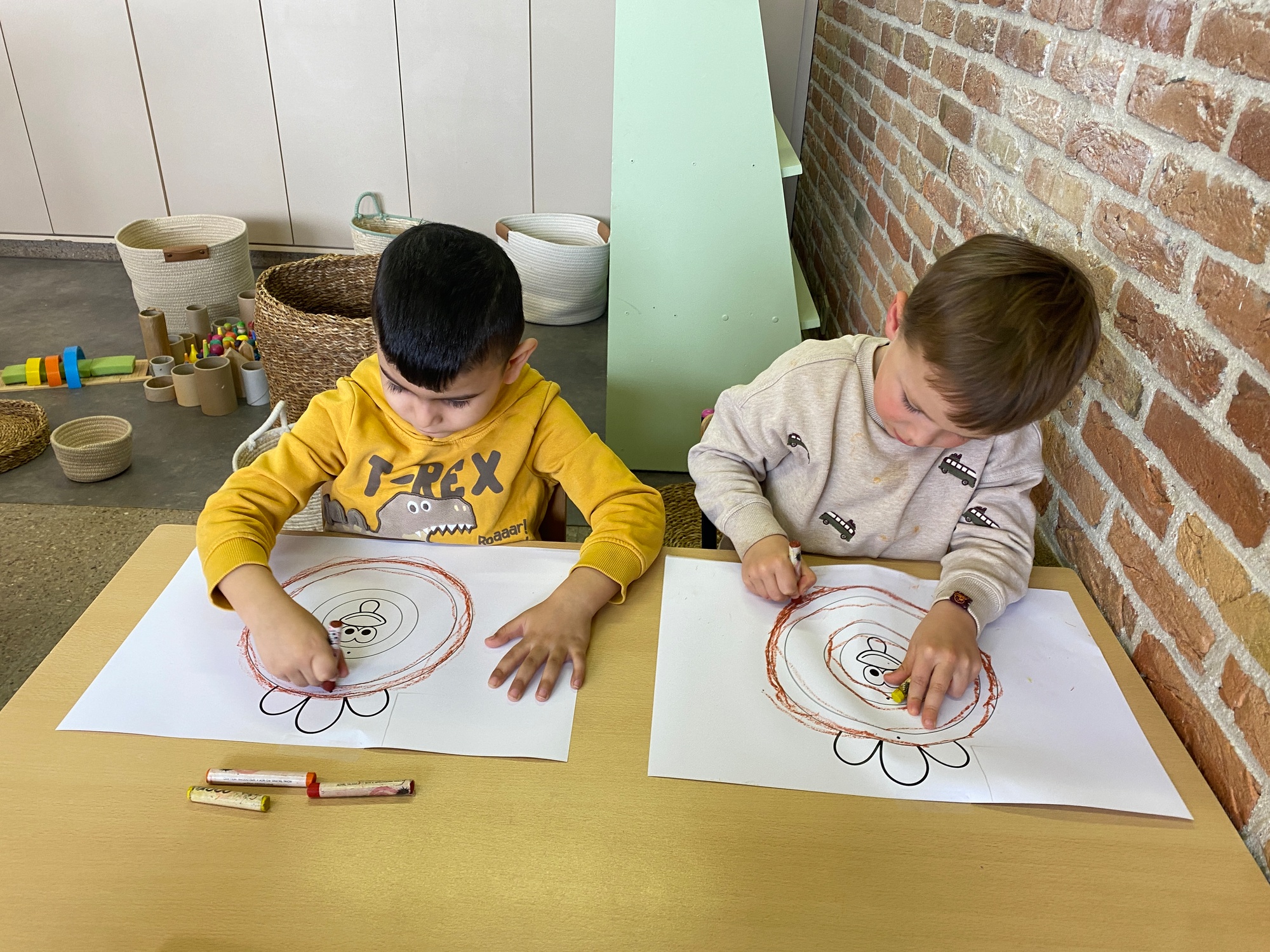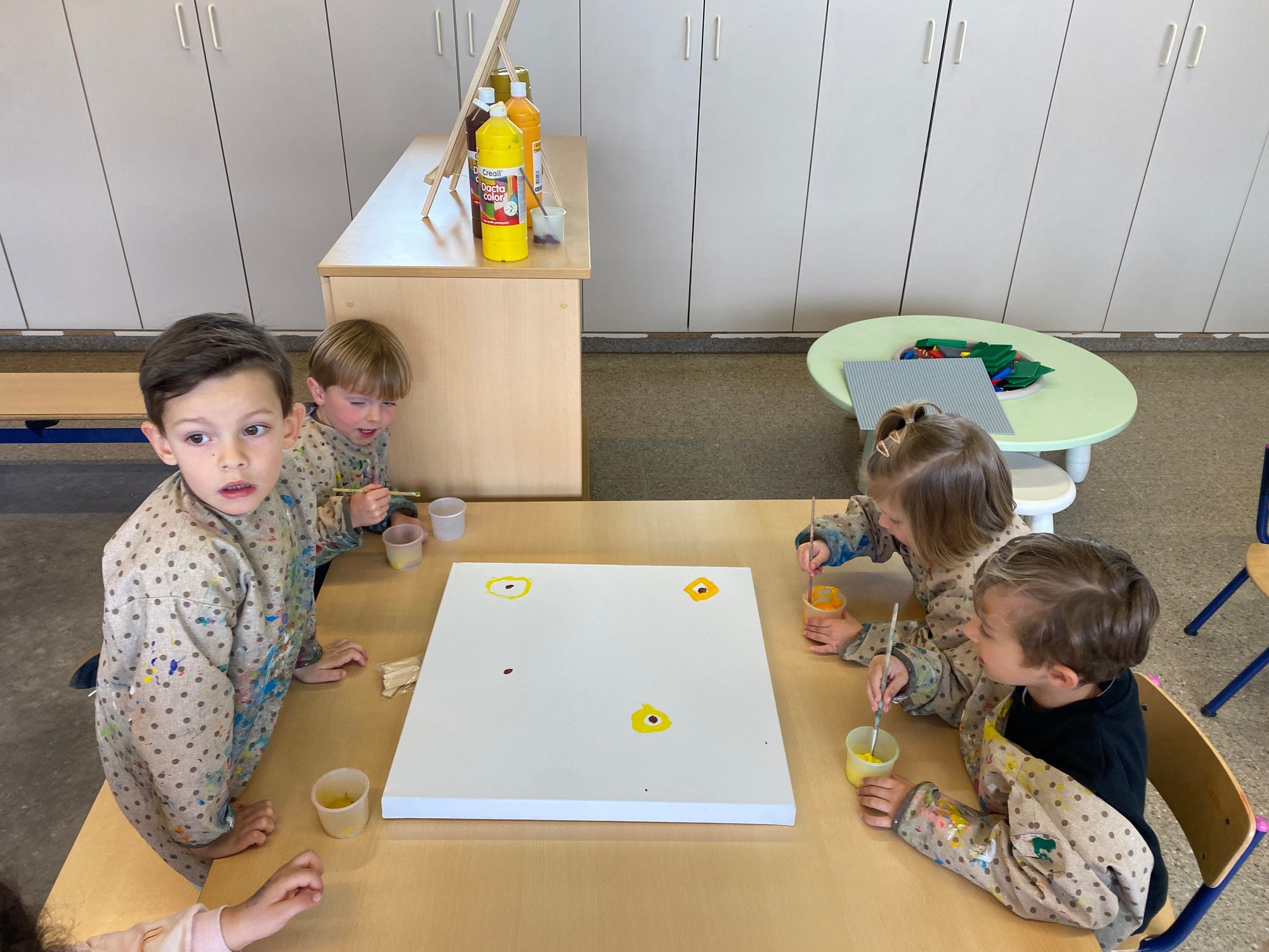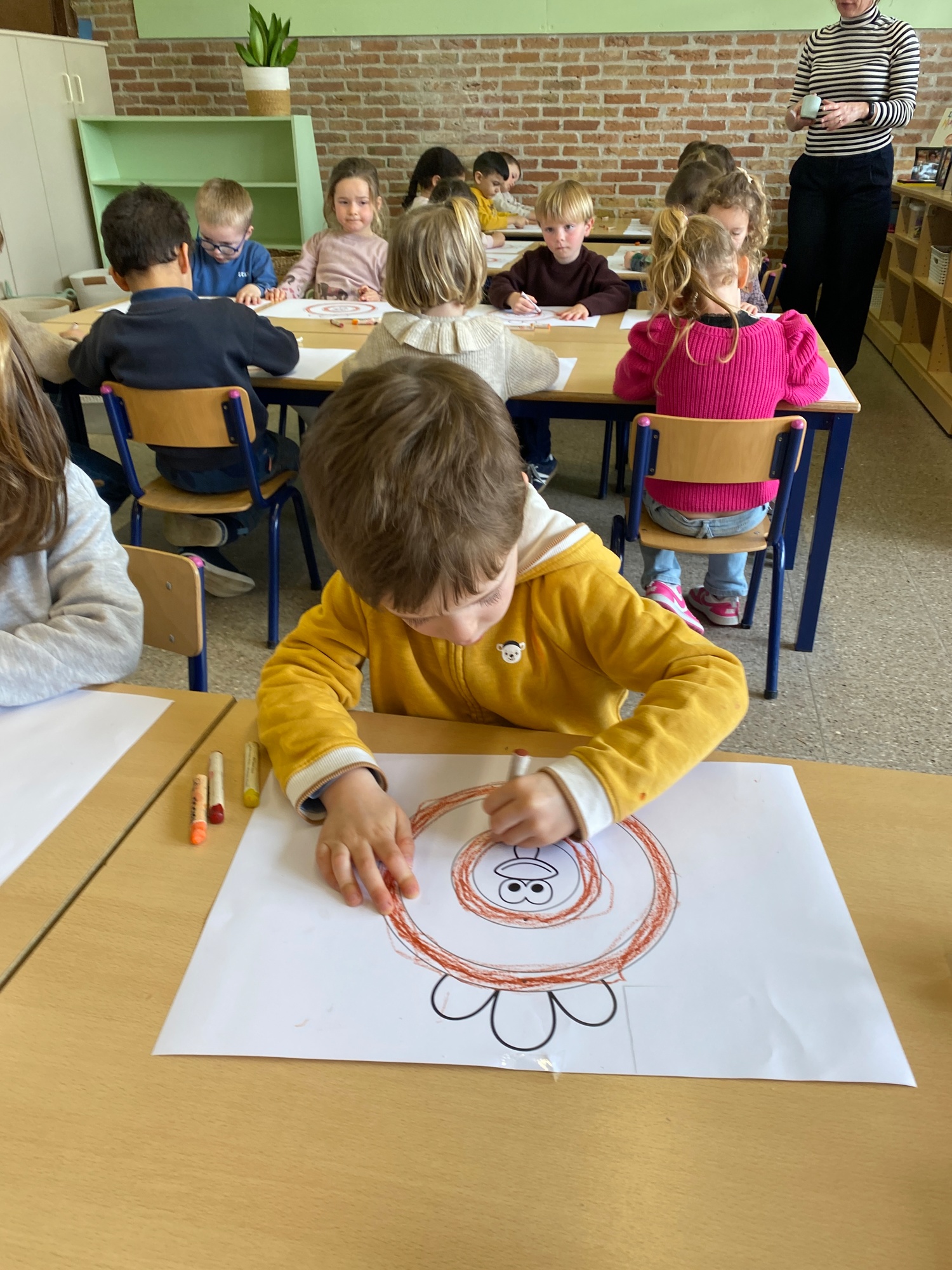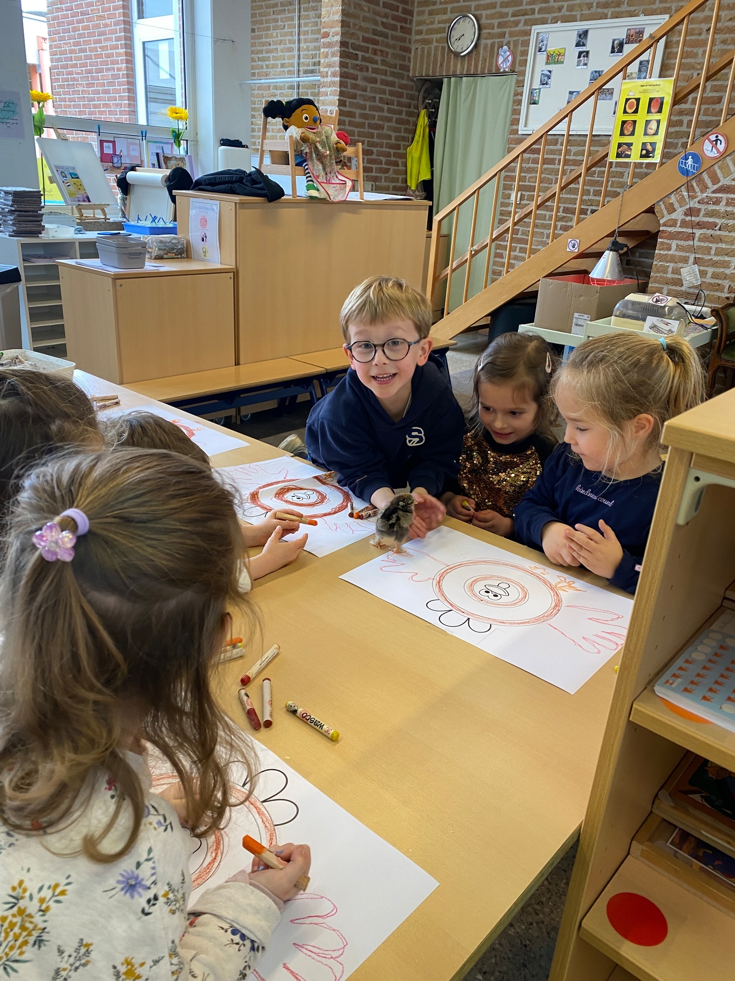 We tekenden een kip. Wat zien jullie bij het kuikentje op tafel? Teken maar na. We schilderden een ei. Net zoals Poelette in het boekje: 'Het allereerste ei.' probeerden we het mooiste ei te versieren. Werden het mooie eitjes?
