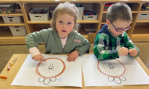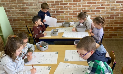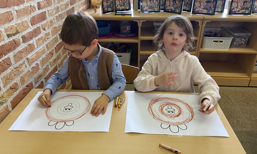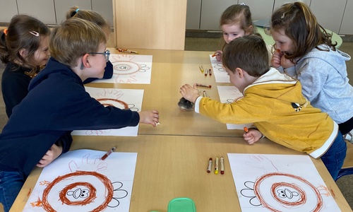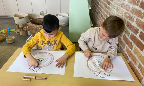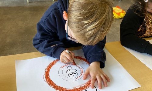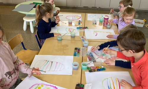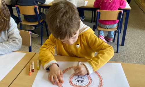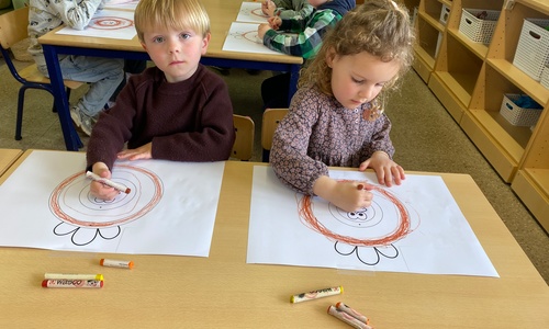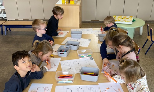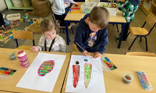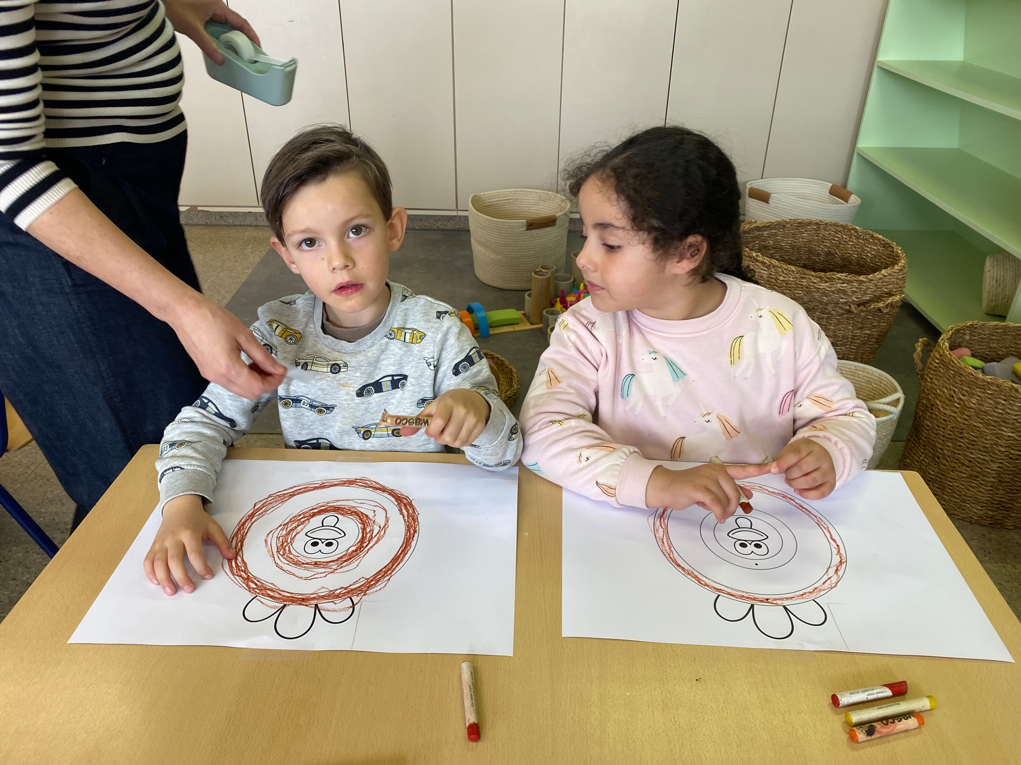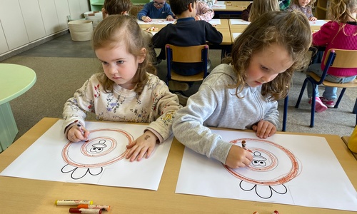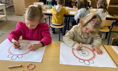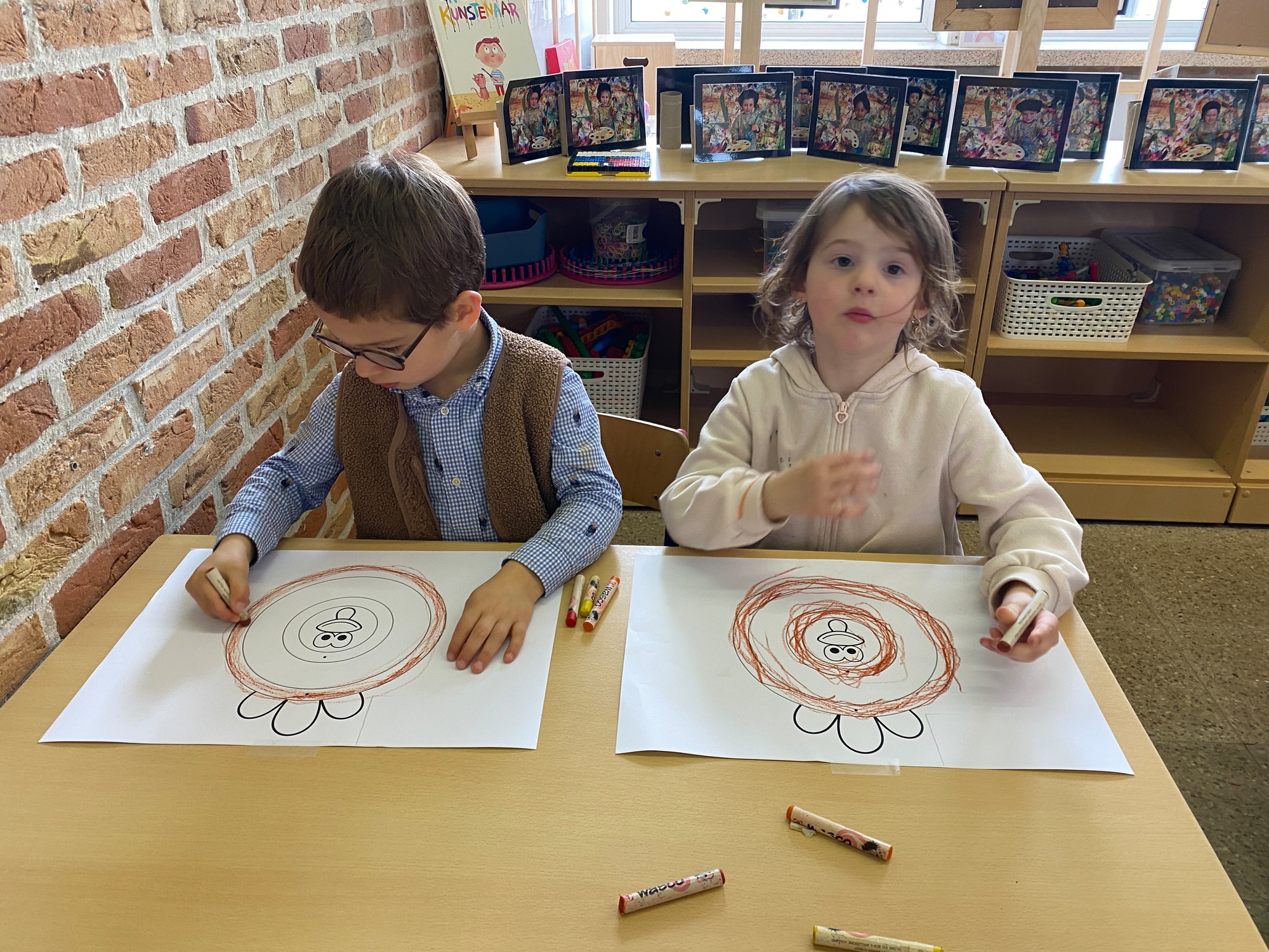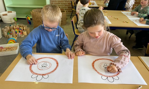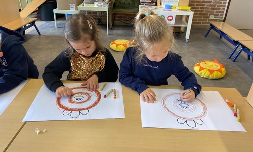 We tekenden een kip. Wat zien jullie bij het kuikentje op tafel? Teken maar na. We schilderden een ei. Net zoals Poelette in het boekje: 'Het allereerste ei.' probeerden we het mooiste ei te versieren. Werden het mooie eitjes?