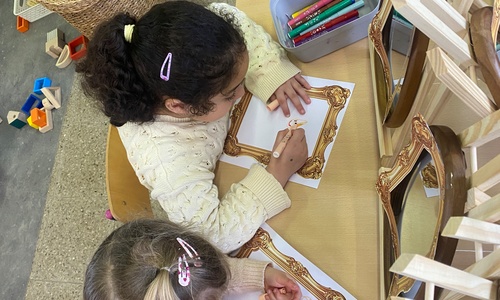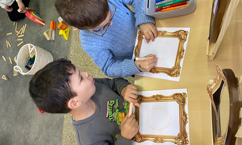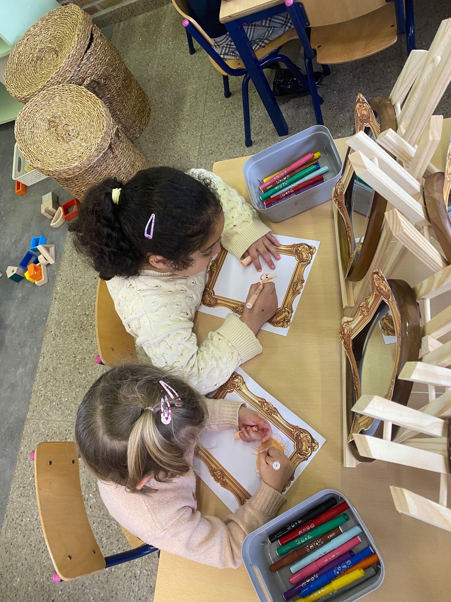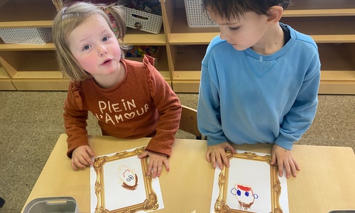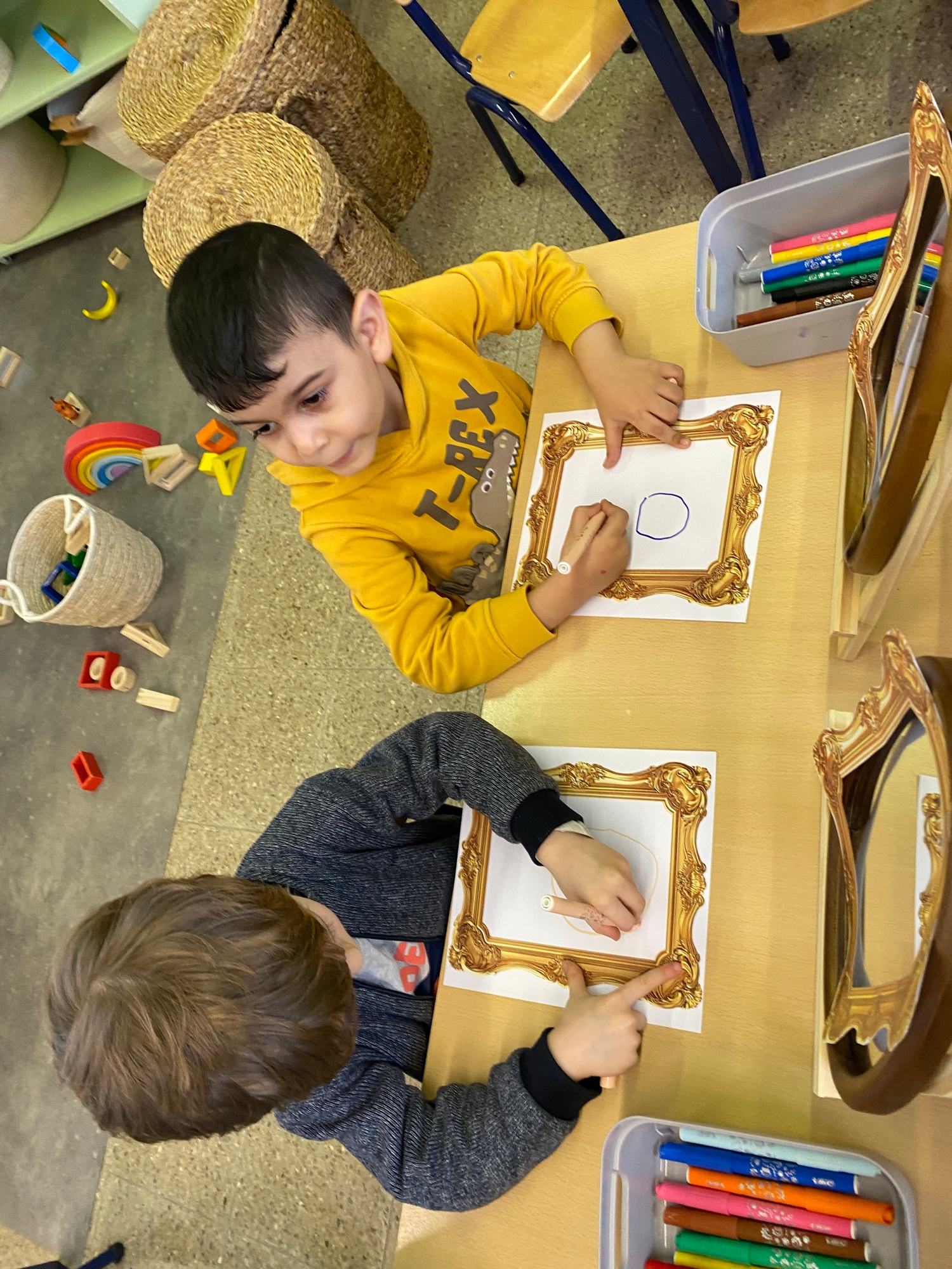 We kijken naar onszelf in de spiegel en tekenen na. Enkel ons gezicht. Ik zie 2 ogen, een neus, een mond, oren, mijn haar... Welke kleur hebben die? We tekenen alles zo goed mogelijk na. Lijk ik op mijn zelfportret?