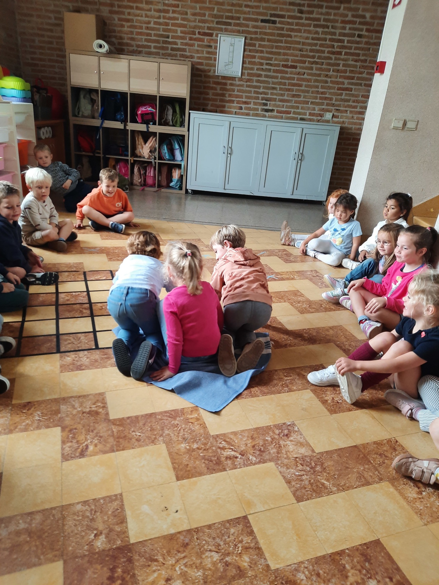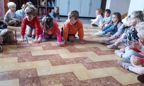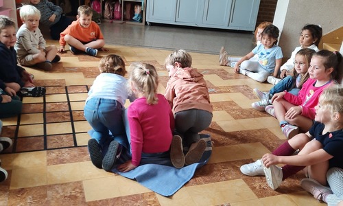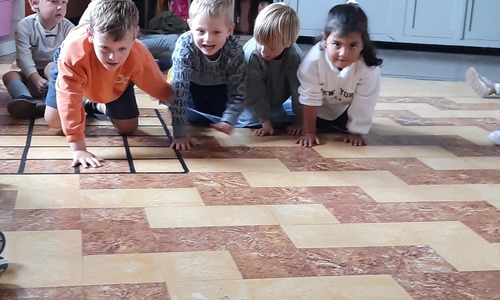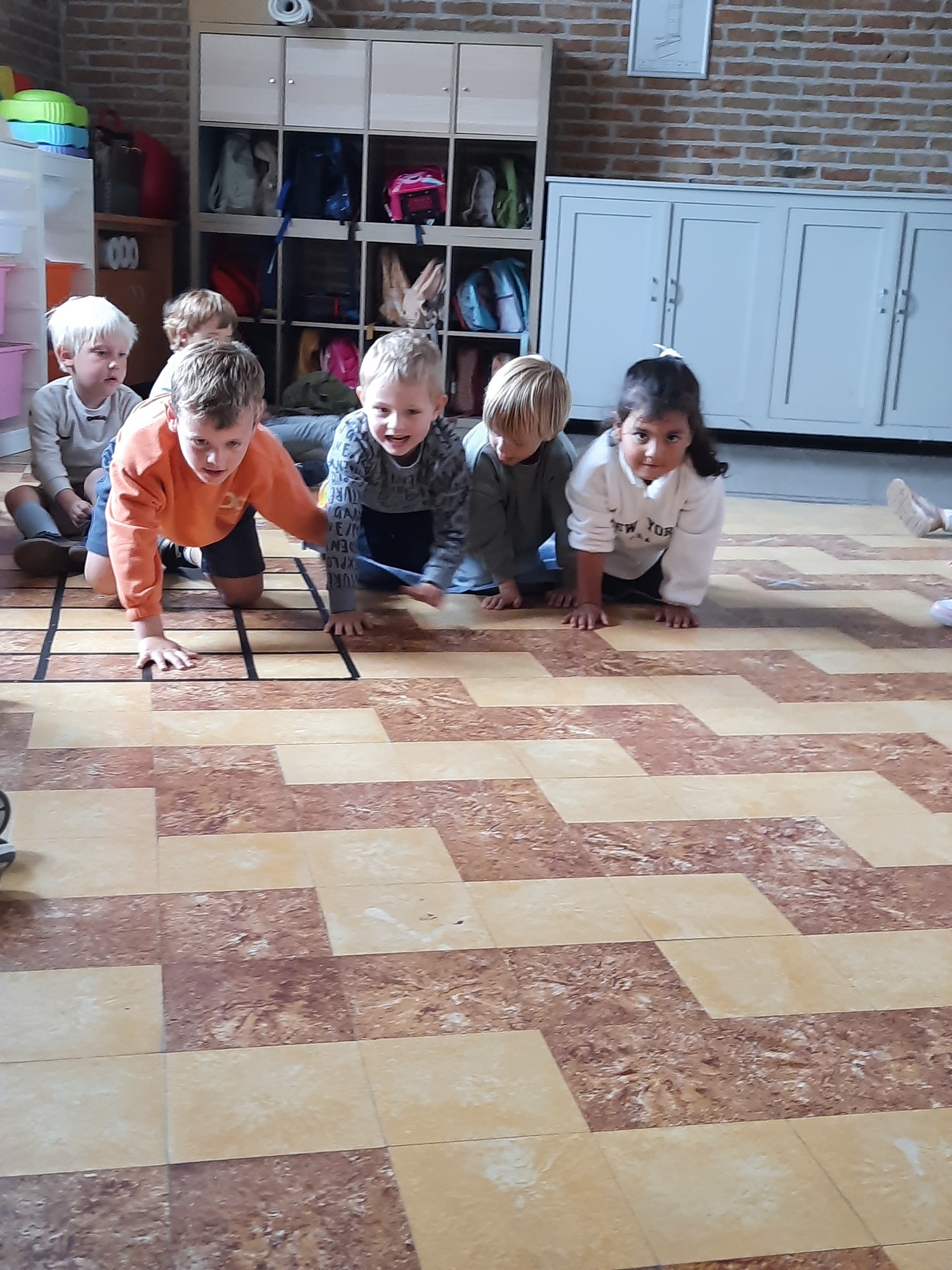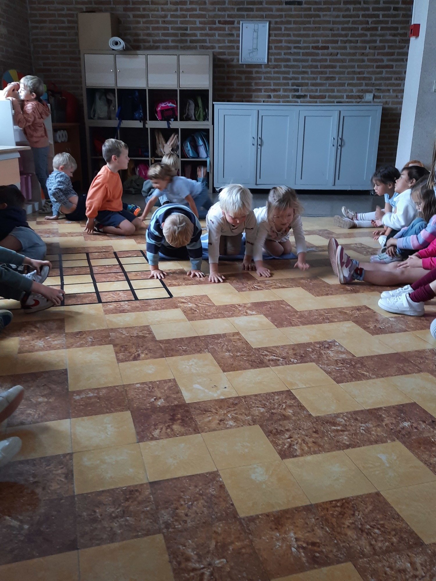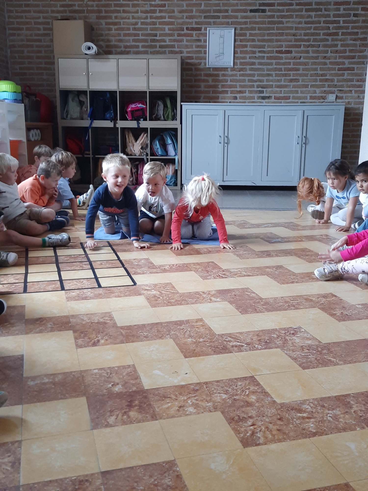 Ons junglemaatje Aap heeft een opdracht voor ons. De kleuters moeten naar de overkant, maar mogen niet 'in het water'. Ze zitten op hun 'boot' en moeten zo naar de andere kant. Alleen hun handen mogen in 'het water'. Samenwerken is hierbij heel belangrijk.