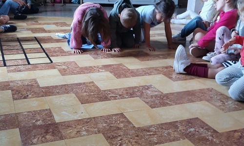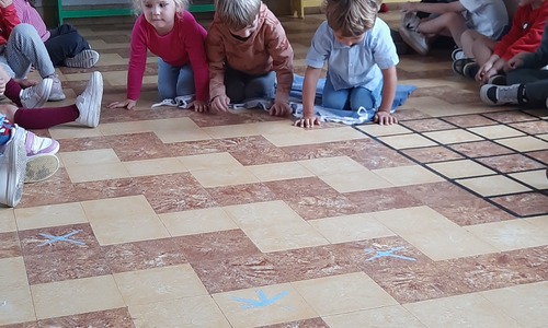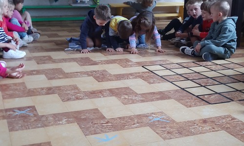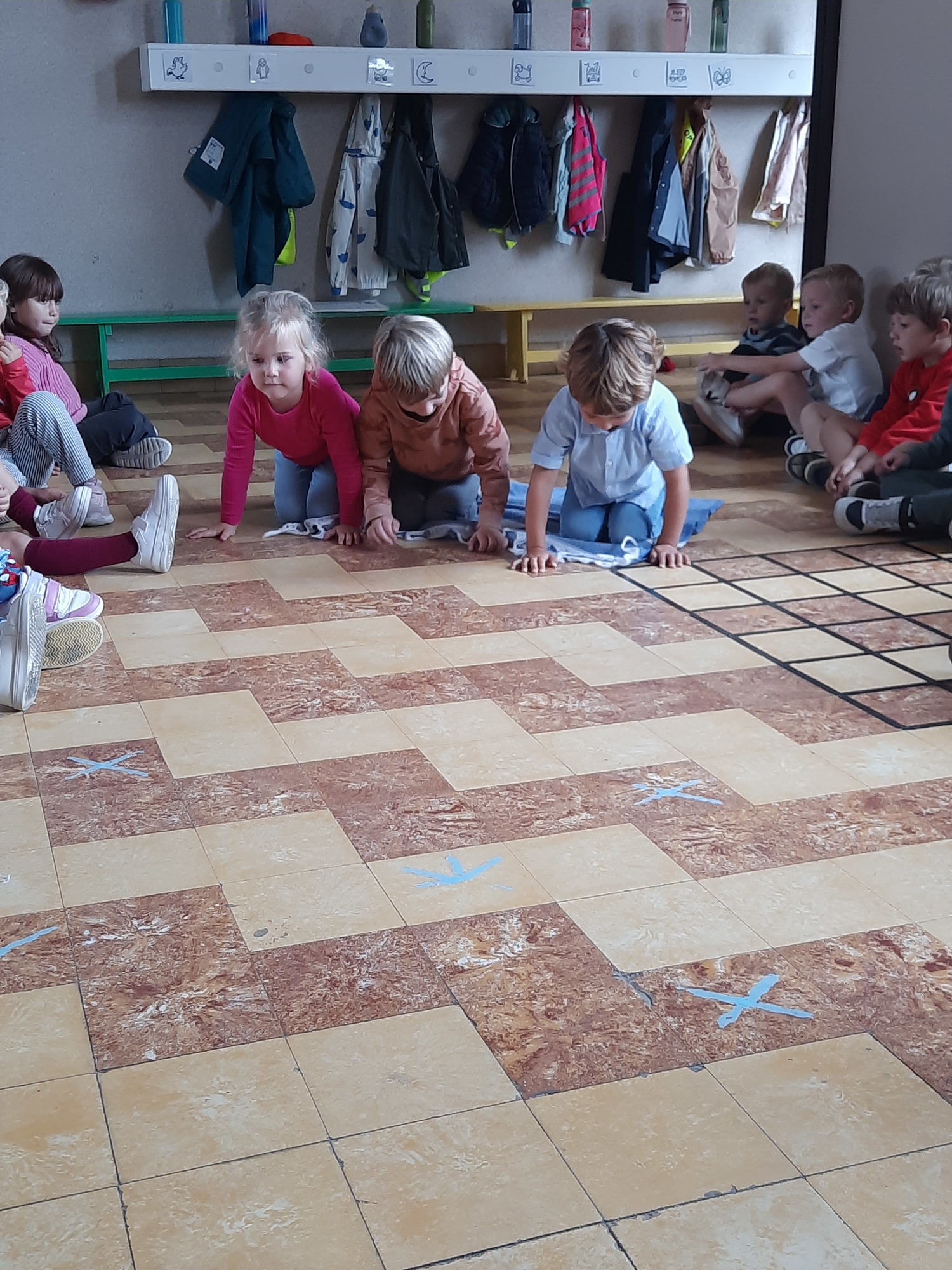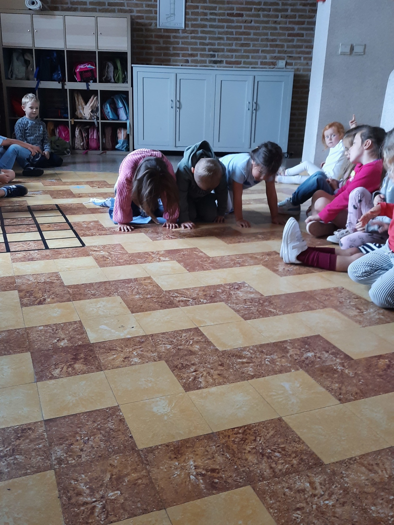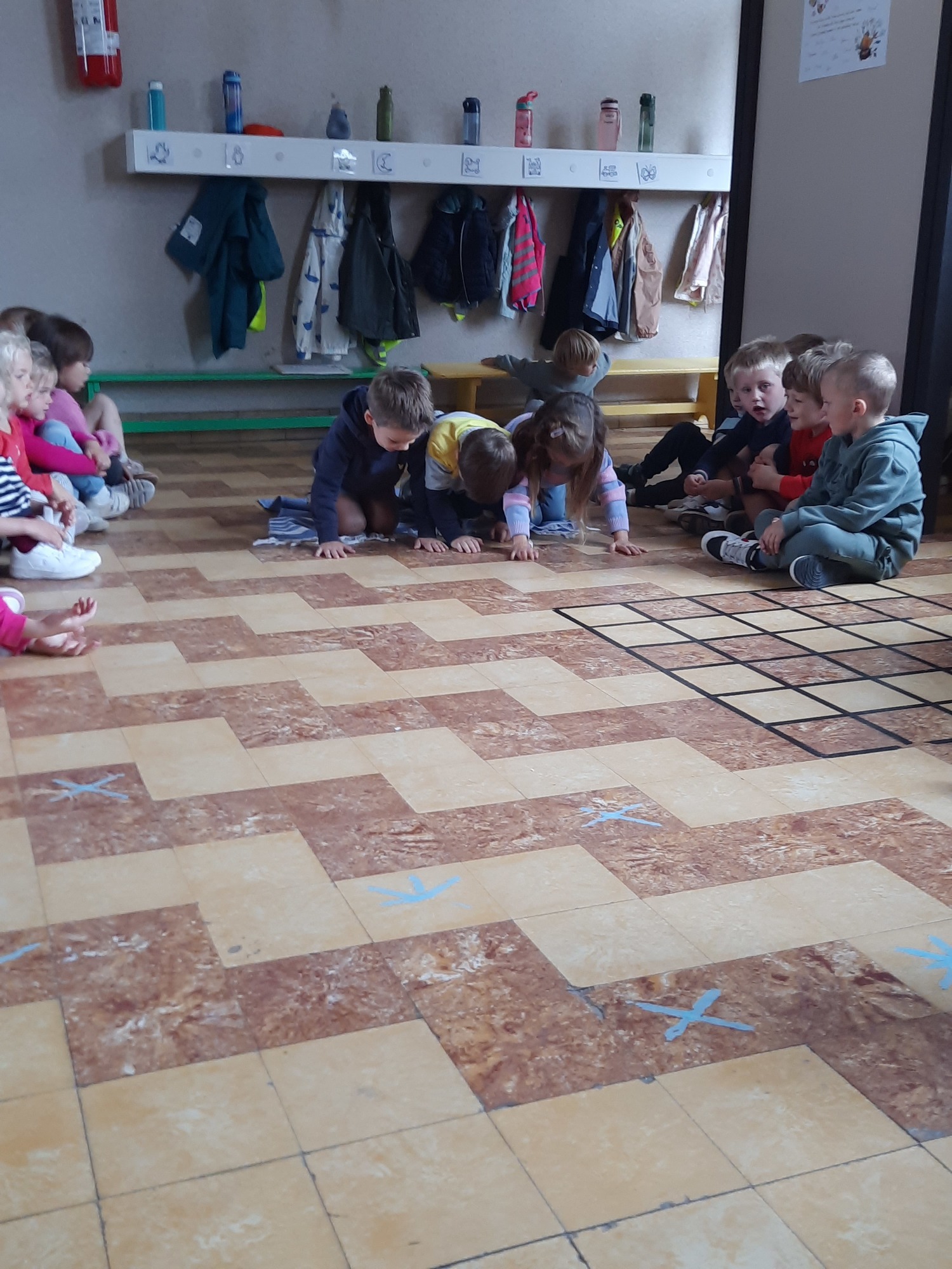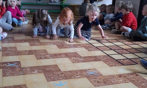 Ons junglemaatje Aap heeft een opdracht voor ons. De kleuters moeten naar de overkant, maar mogen niet 'in het water'. Ze zitten op hun 'boot' en moeten zo naar de andere kant. Alleen hun handen mogen in 'het water'. Samenwerken is hierbij heel belangrijk.