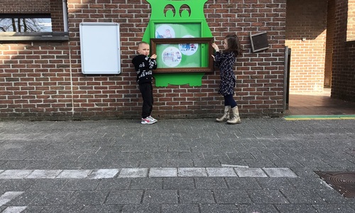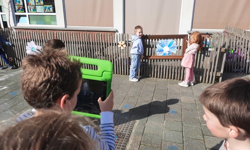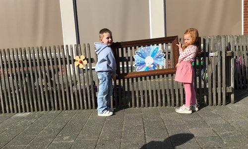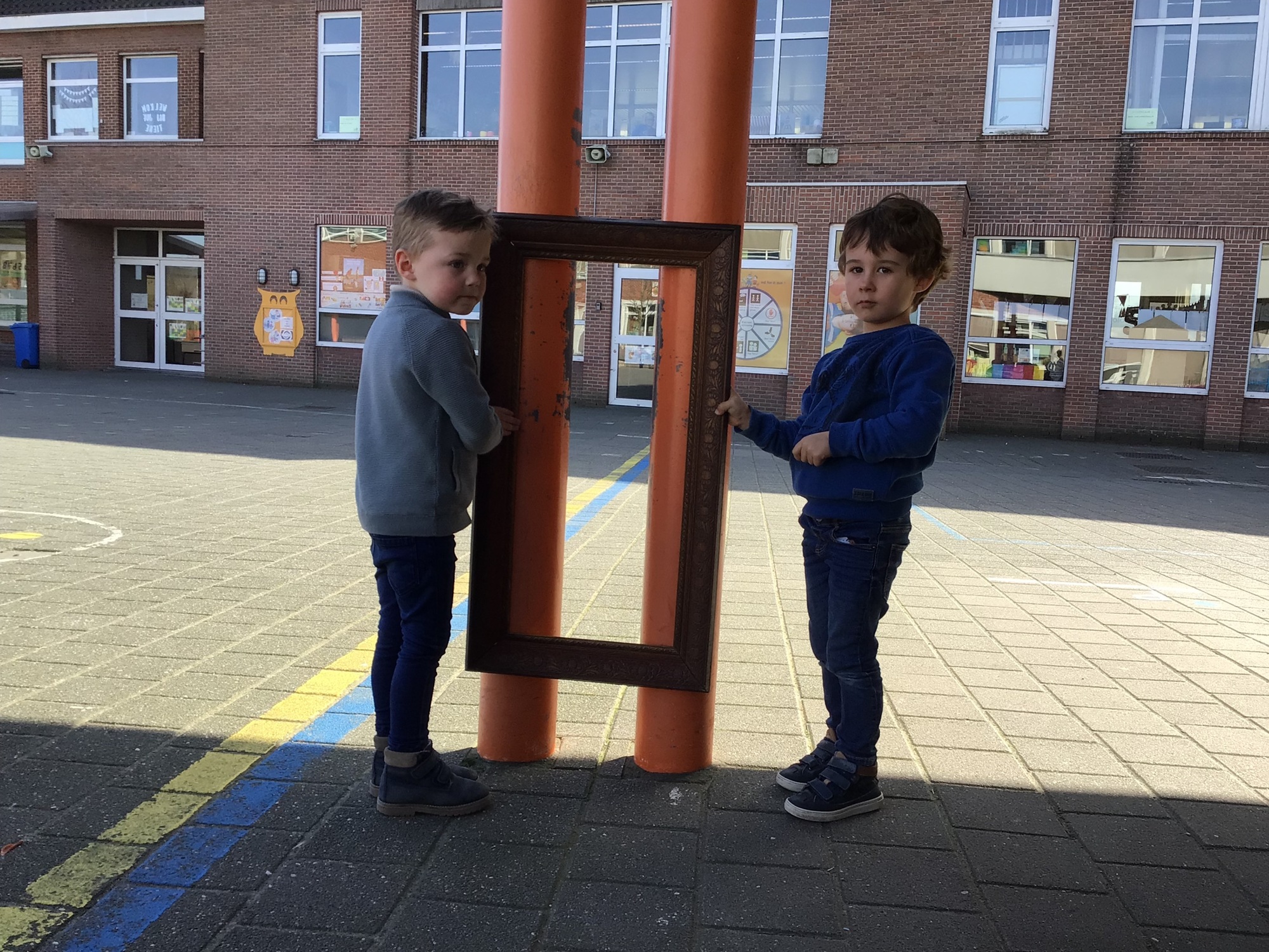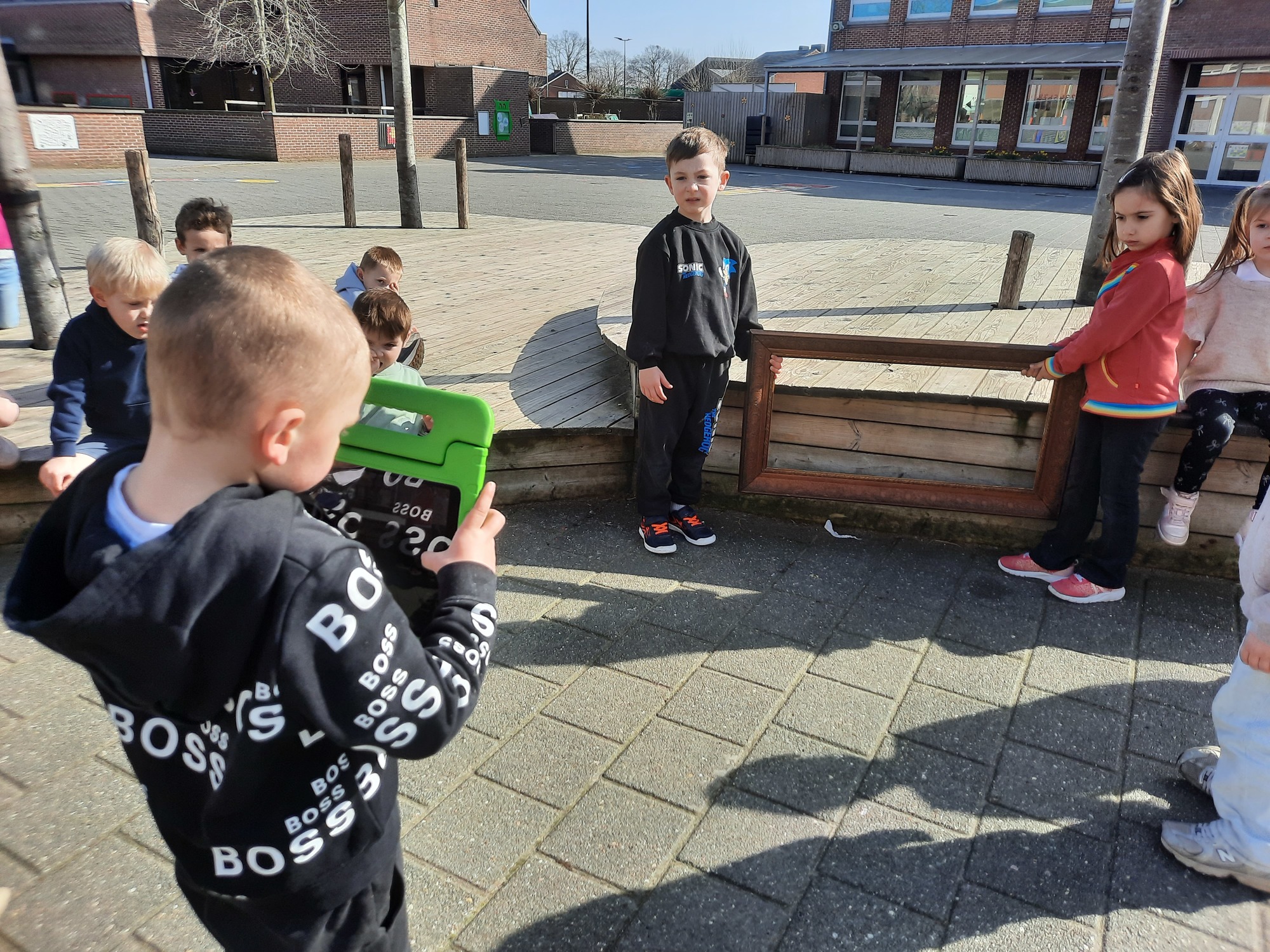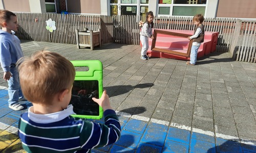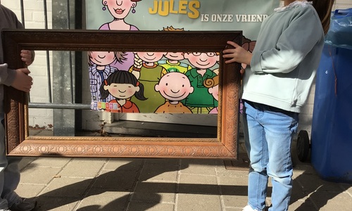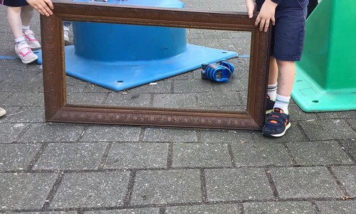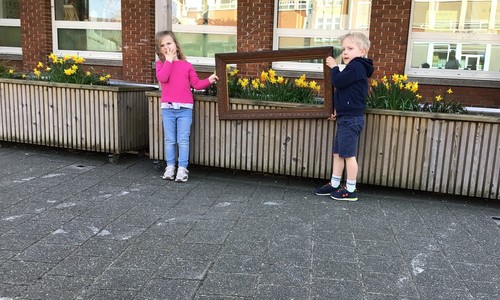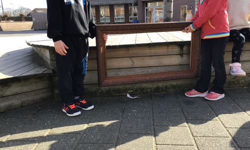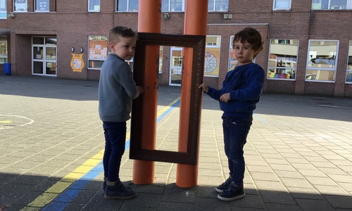 We luisterden naar het verhaal 'kijk eens hoe mooi'. Wanneer Duif een nieuwe lijst gemaakt heeft en ermee op stap gaat naar Prinses Plakband, ziet hij onderweg dat je van 'kleine dingen' 'grote kunst' kan maken. Wij zochten zelf dingen die mooi worden als je ze in een kadertje zet. Echte kunst :). De kleuters namen zelf een foto van het 'kunstwerk'.