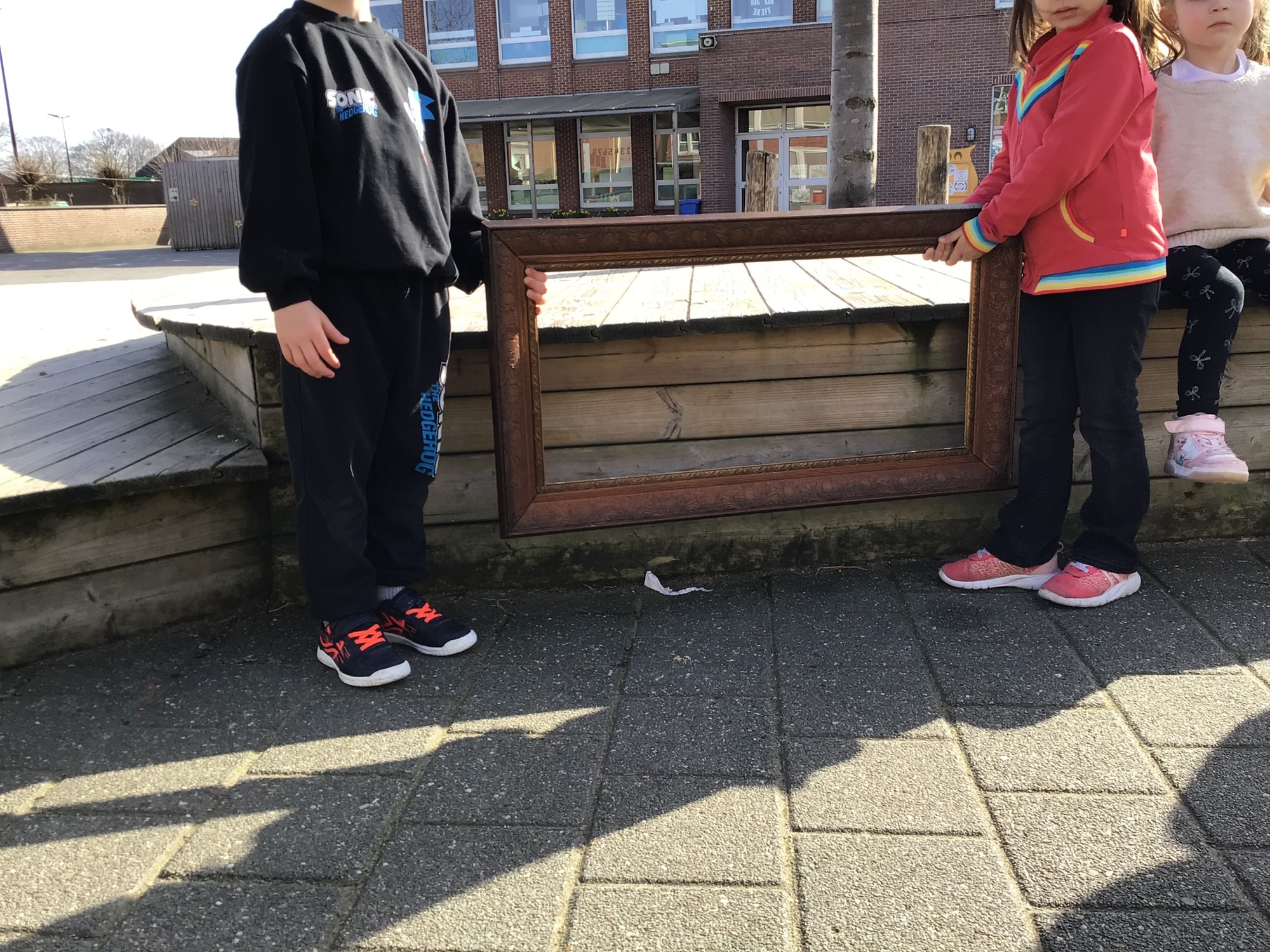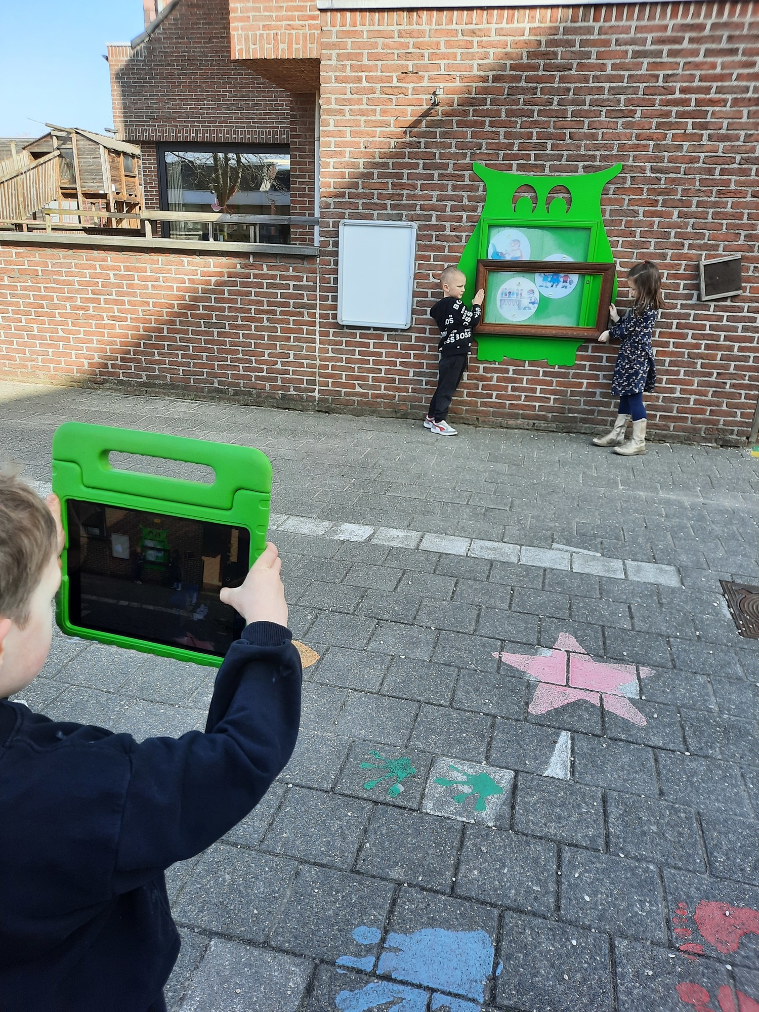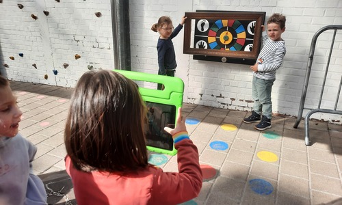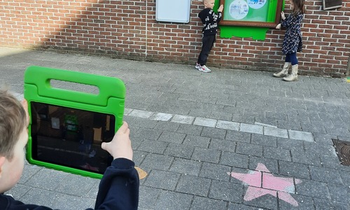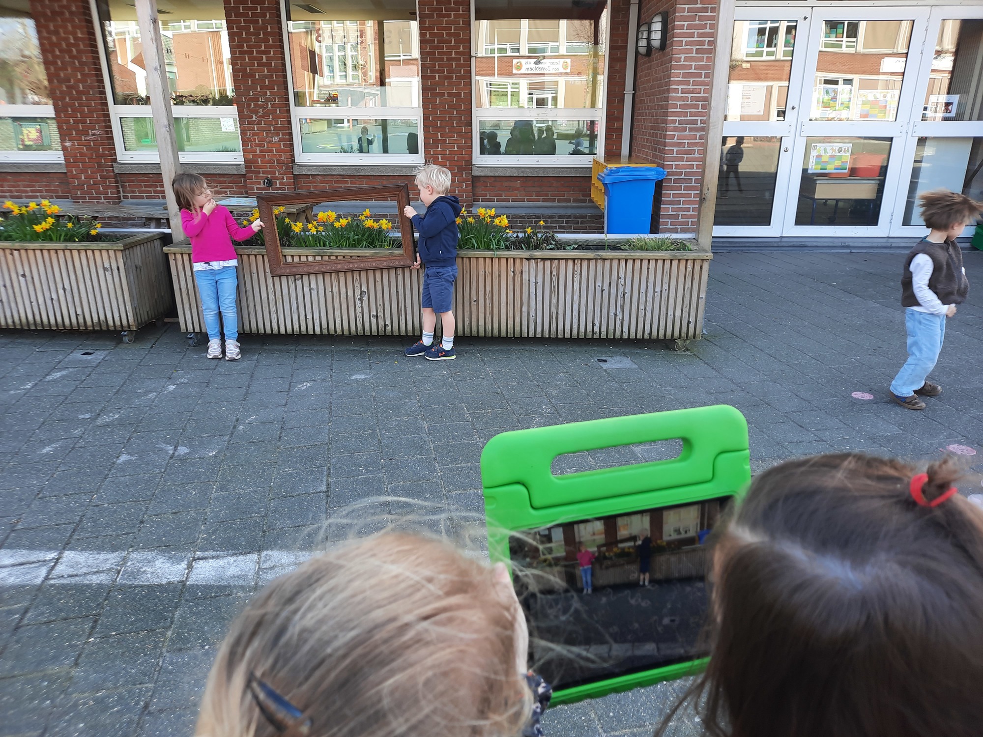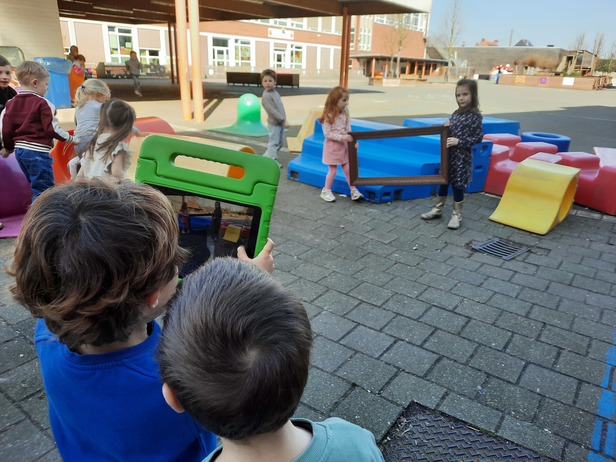 We luisterden naar het verhaal 'kijk eens hoe mooi'. Wanneer Duif een nieuwe lijst gemaakt heeft en ermee op stap gaat naar Prinses Plakband, ziet hij onderweg dat je van 'kleine dingen' 'grote kunst' kan maken. Wij zochten zelf dingen die mooi worden als je ze in een kadertje zet. Echte kunst :). De kleuters namen zelf een foto van het 'kunstwerk'.