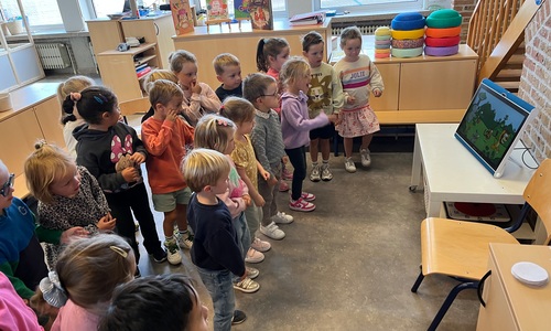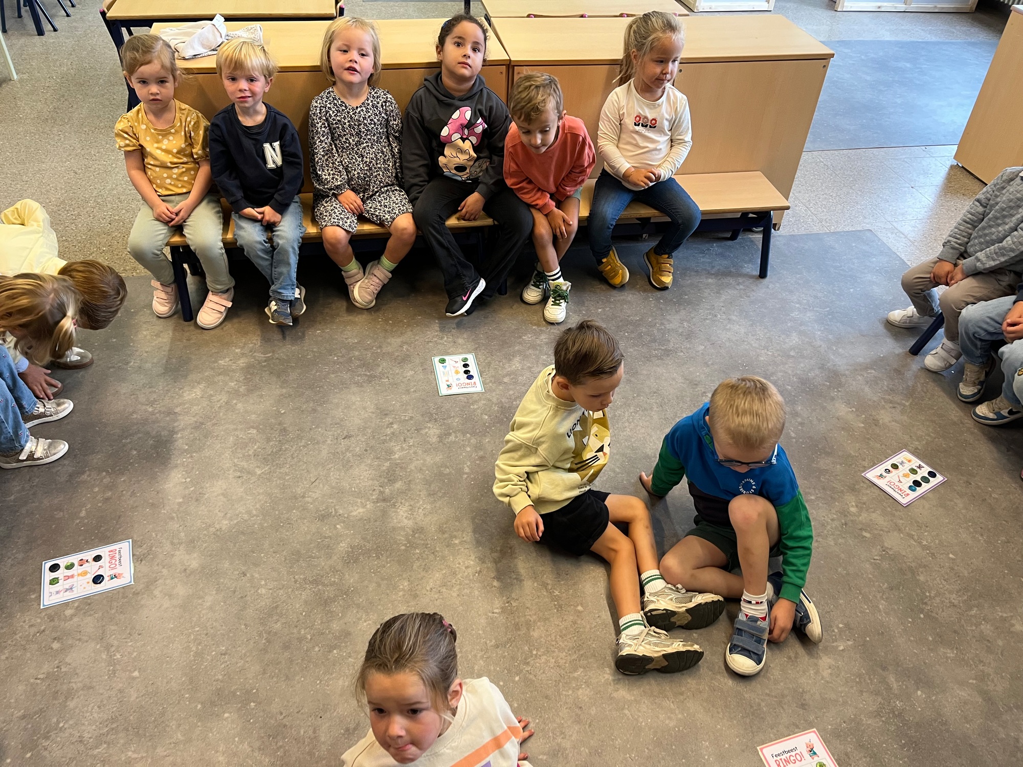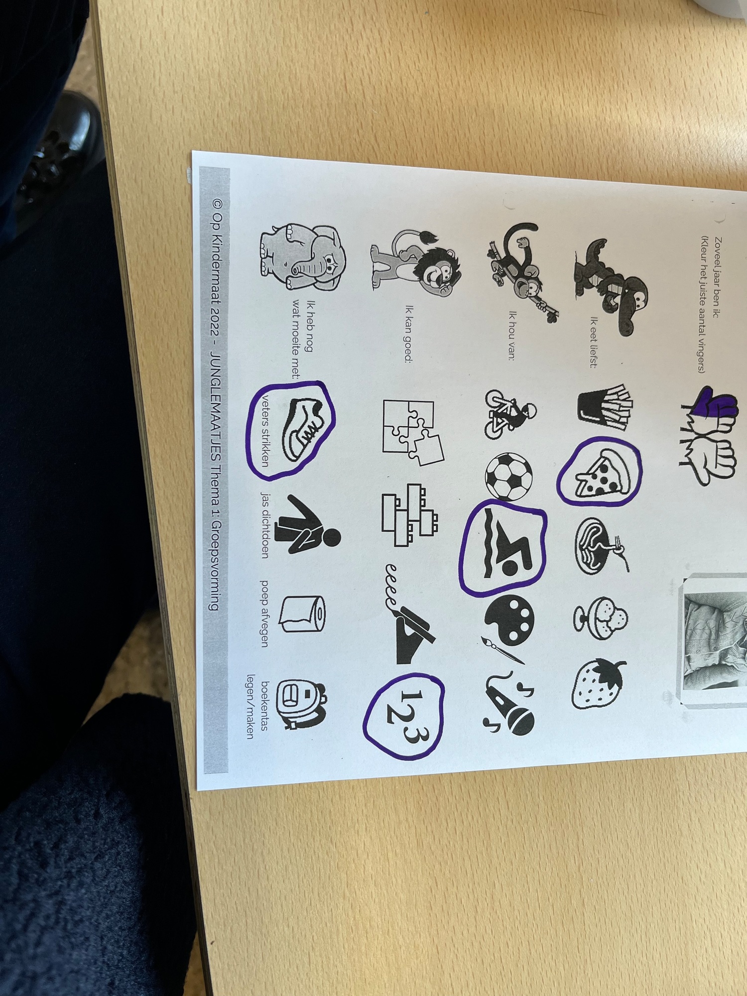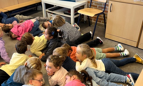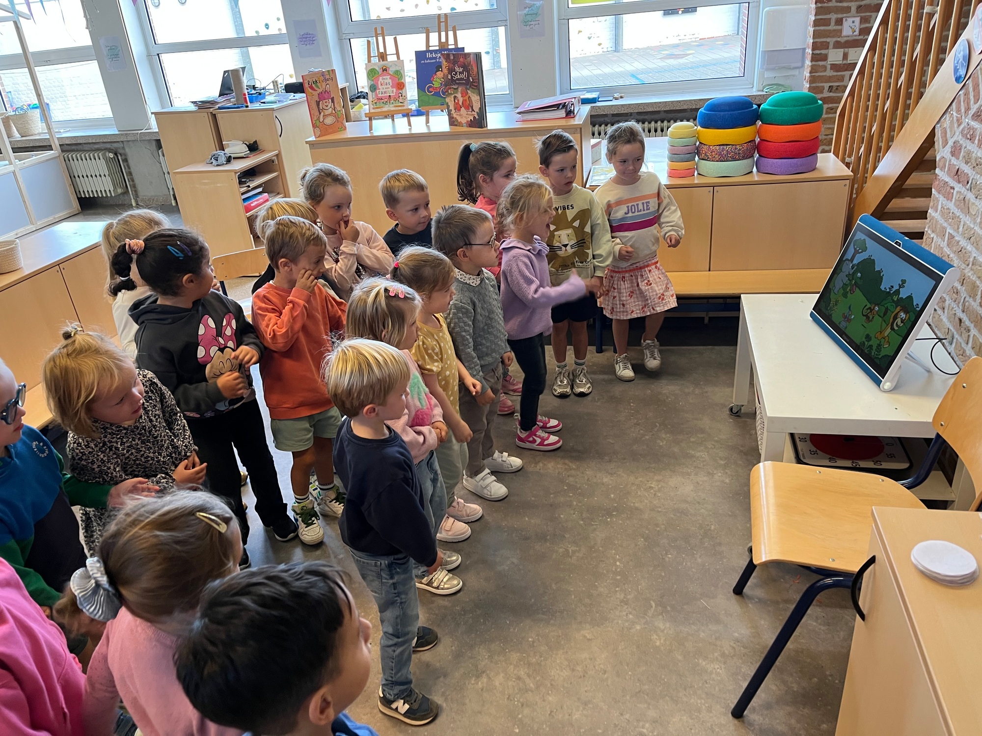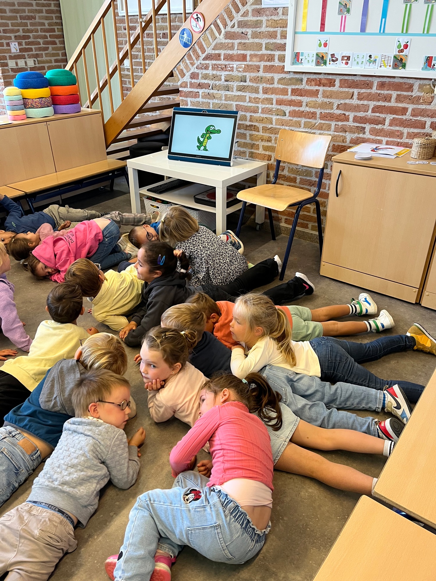 De kinderen maakten kennis met de ‘Junglemaatjes’ (leeuw, olifant, krokodil, papegaai en olifant). We dansten, maakten bellen kapot, luisterden naar een verhaal om rustig te worden, maakten samen klasafspraken die voor elk van ons haalbaar en duidelijk zijn, kwamen elk om de beurt vertellen wat we graag eten / graag doen / nog moeilijk vinden…