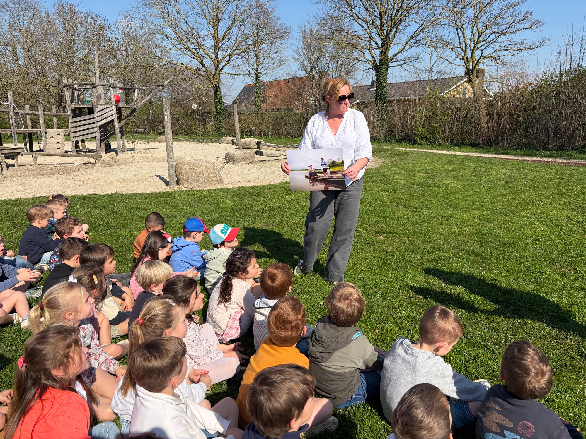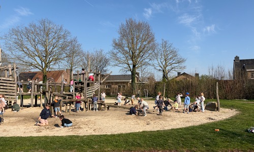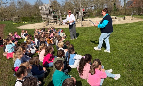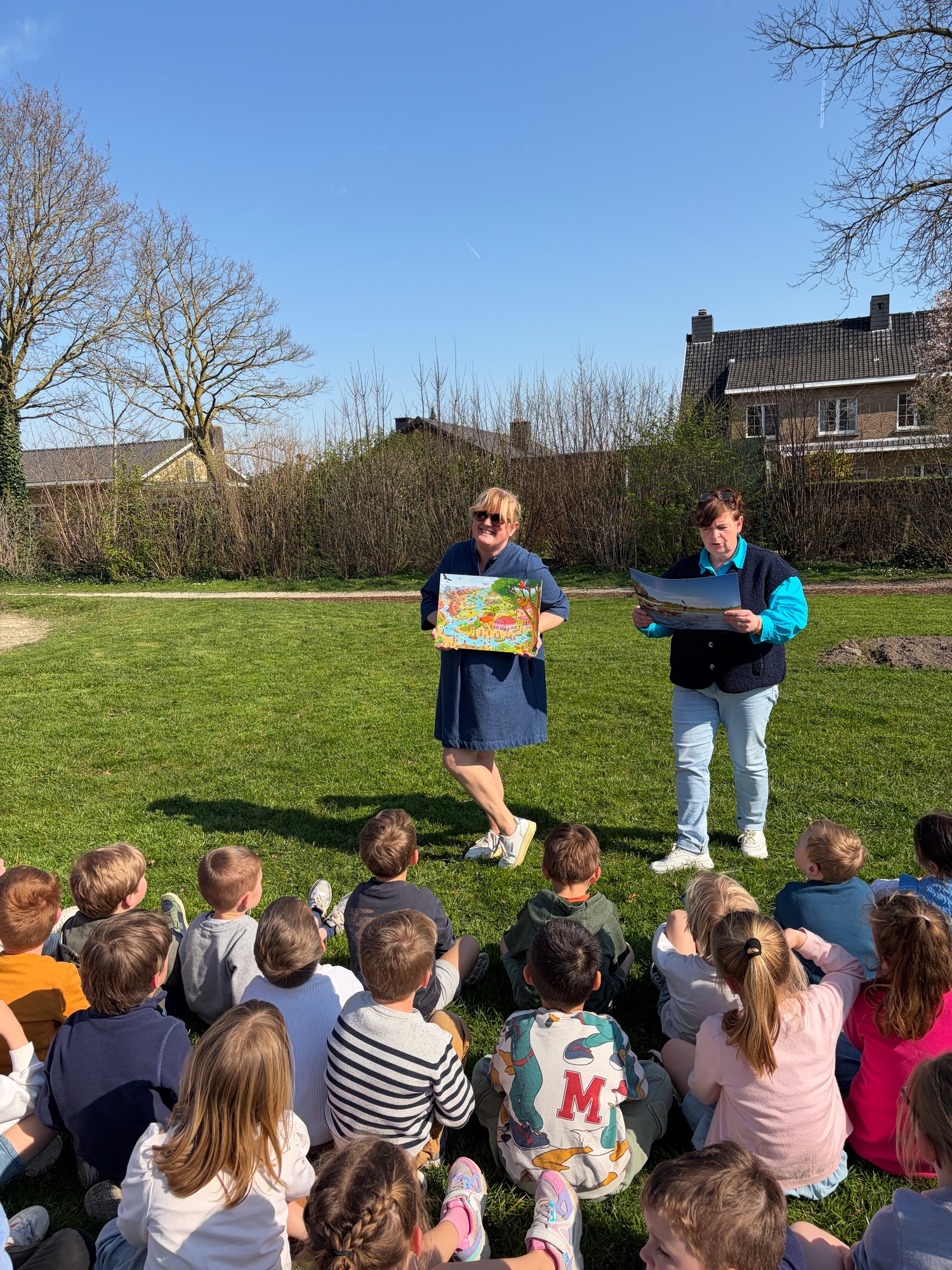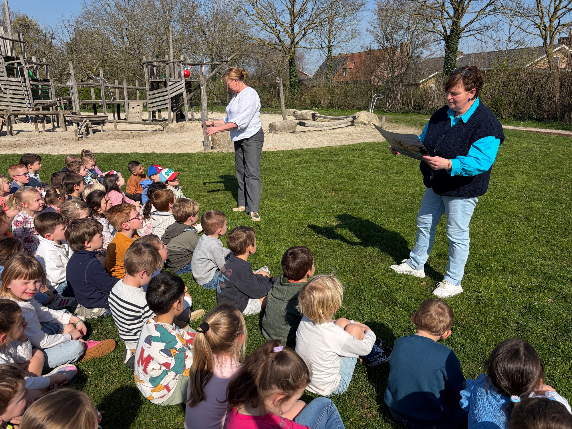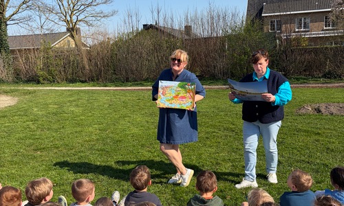 Samen met de derde kleuterklassen gingen we naar de Groene Long en vertelden we het verhaal over de rivier Maranon in San Jorge (Peru).