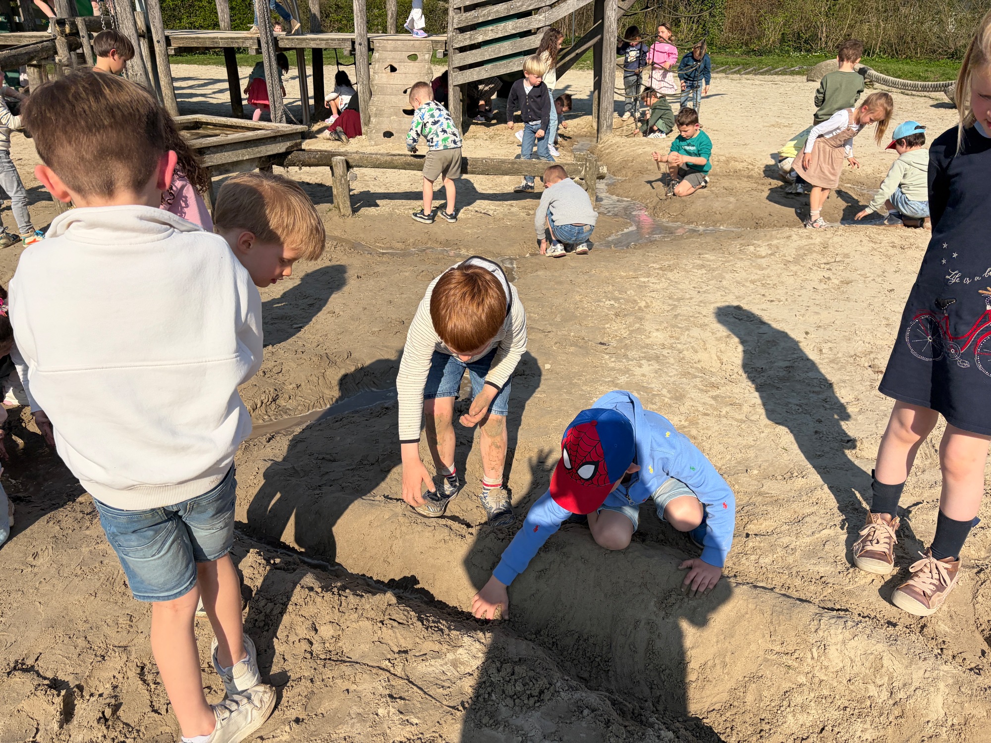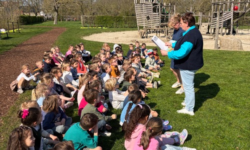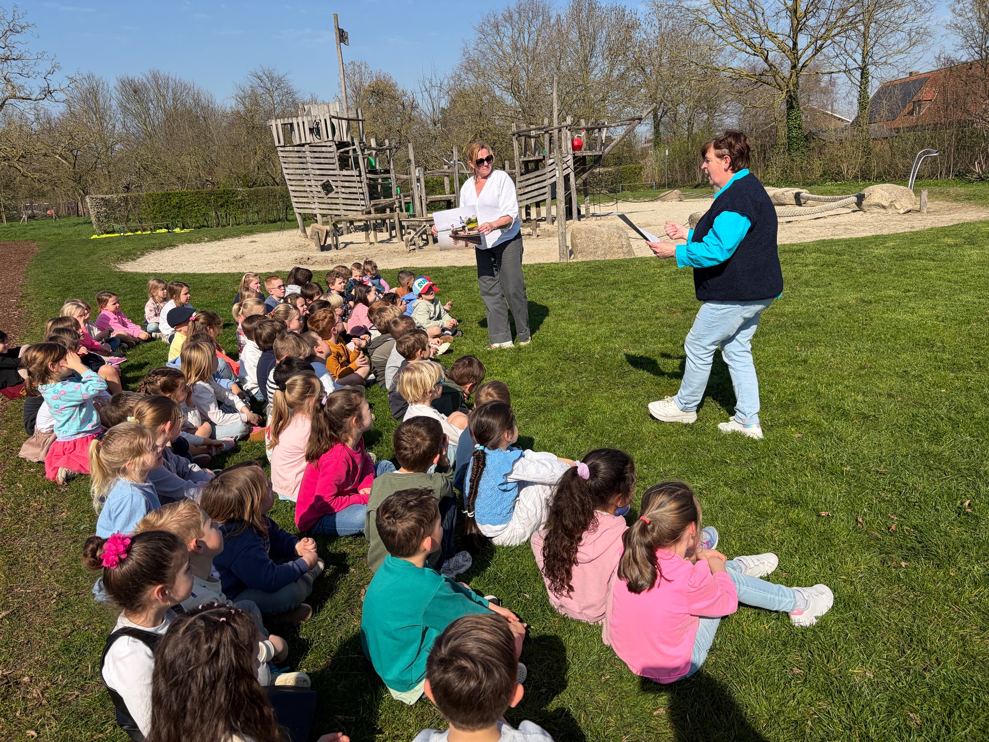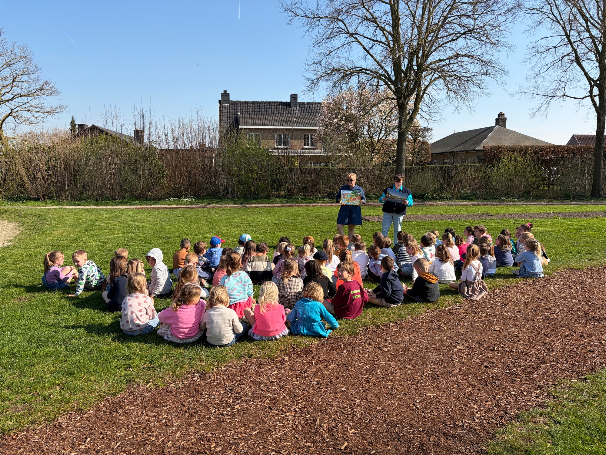 Samen met de derde kleuterklassen gingen we naar de Groene Long en vertelden we het verhaal over de rivier Maranon in San Jorge (Peru).
