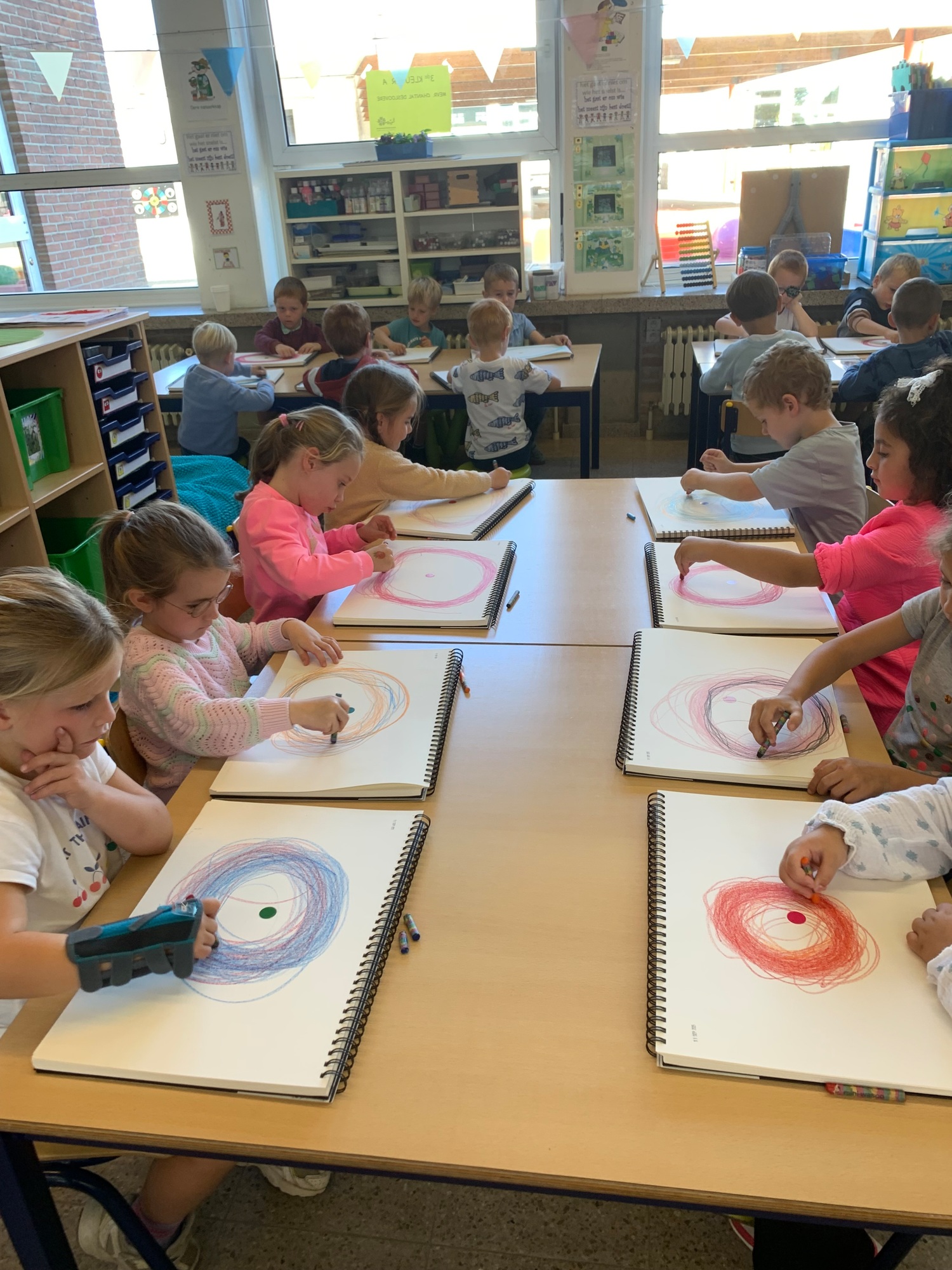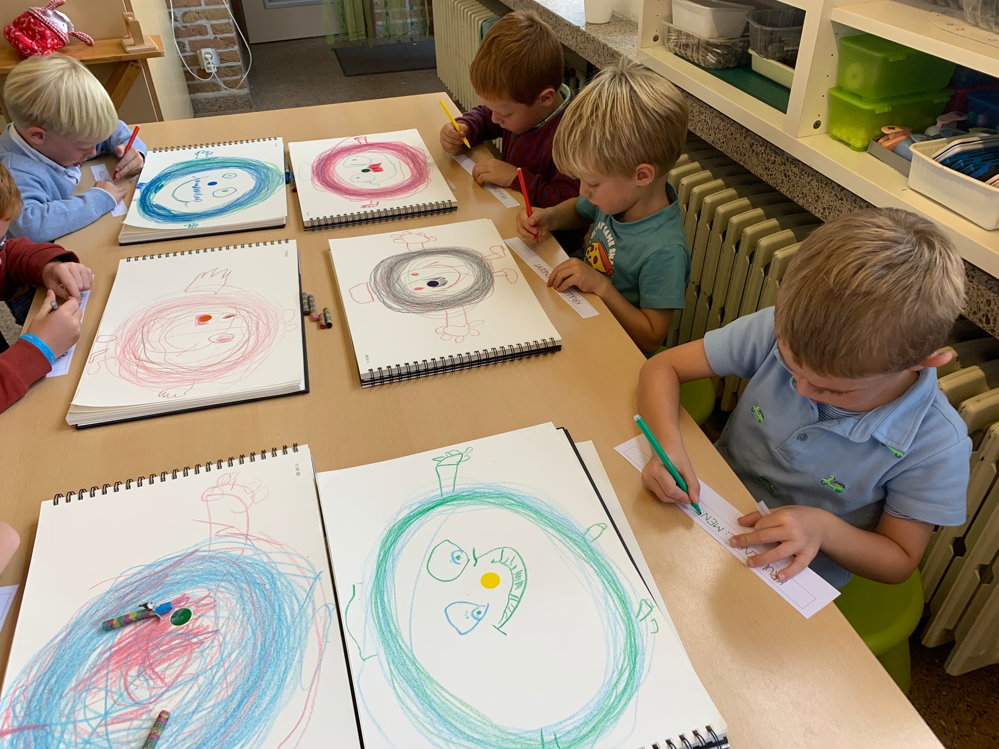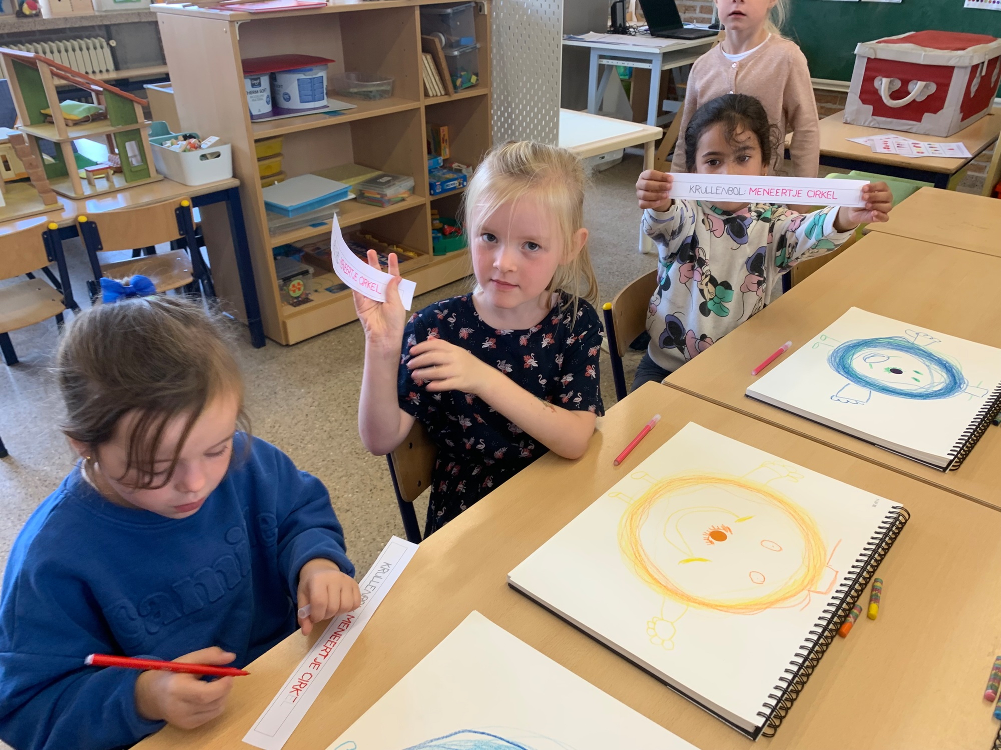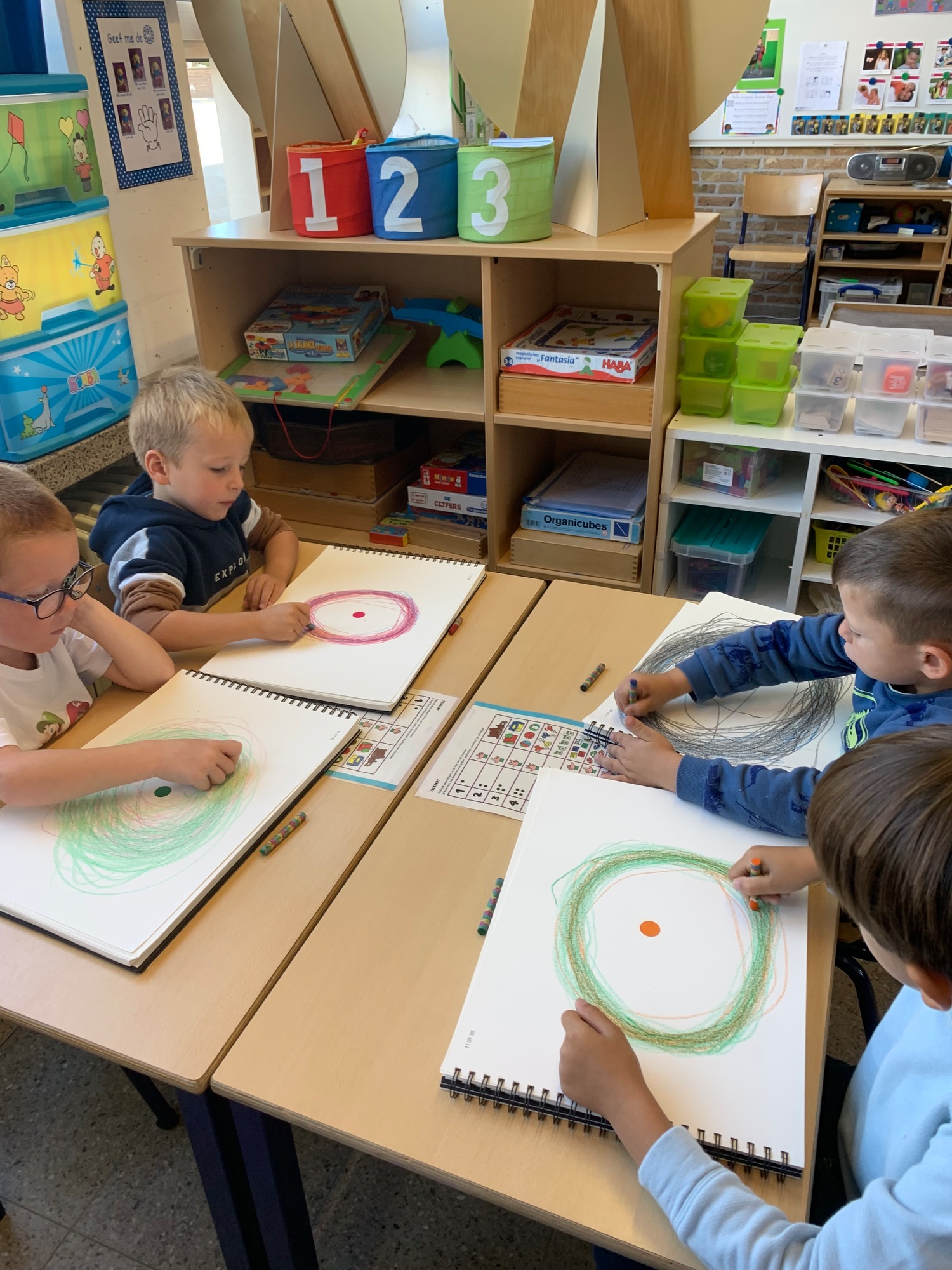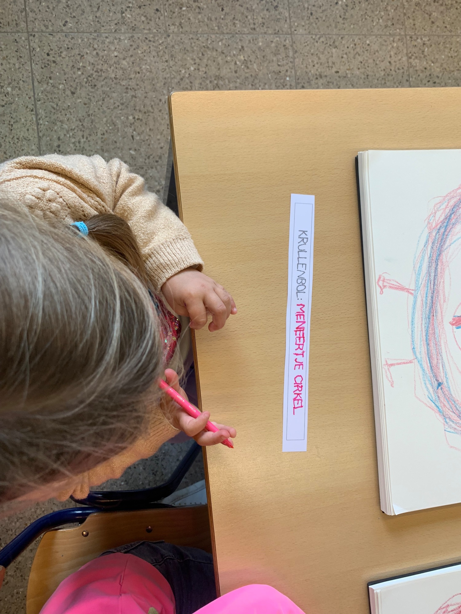 Via een filmpje maken we kennis hoe we een cirkel het best schrijven. We oefenden in de lucht, op papier, in onze krullenbollenschrijfboek...