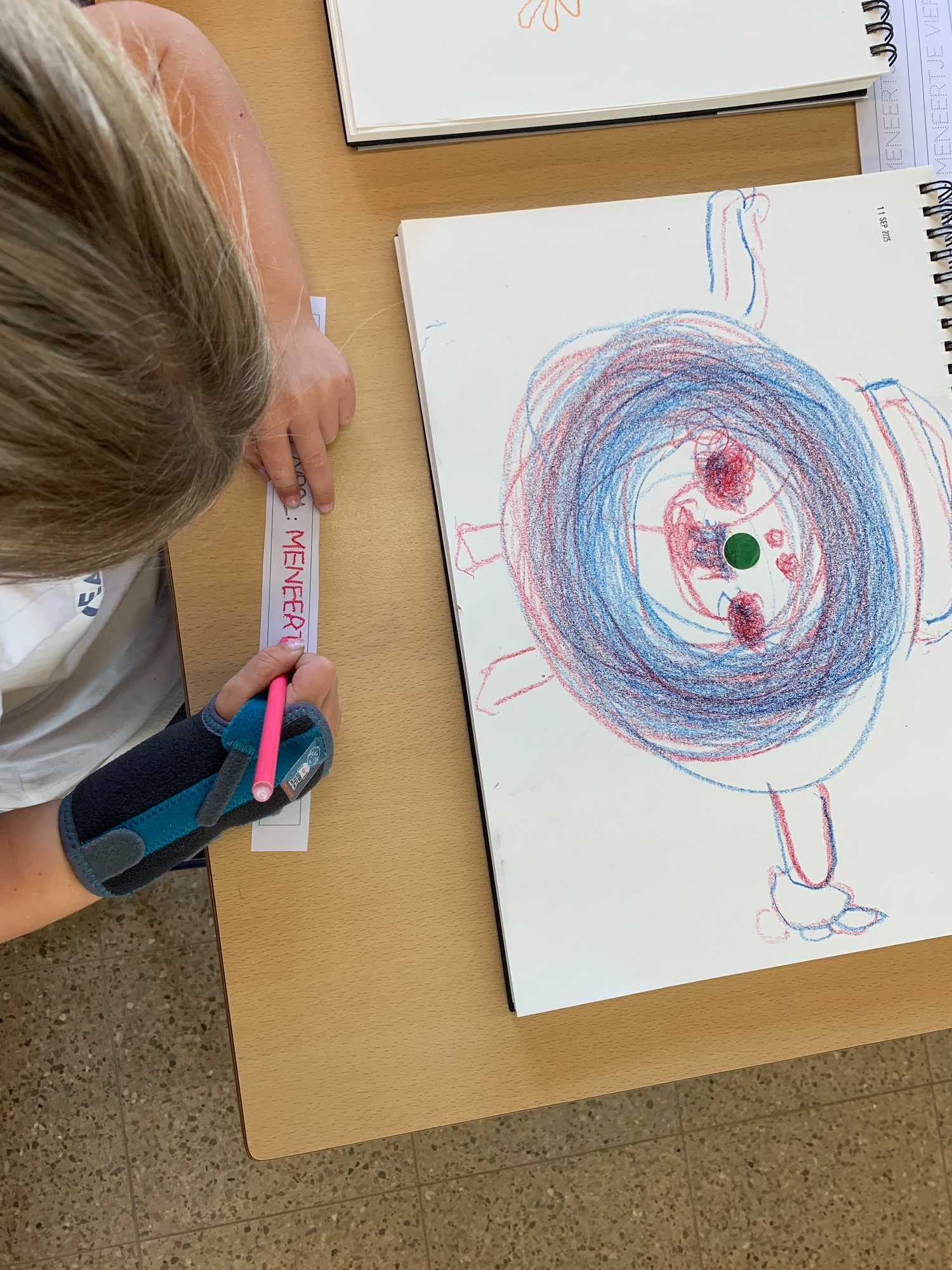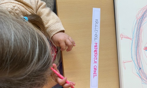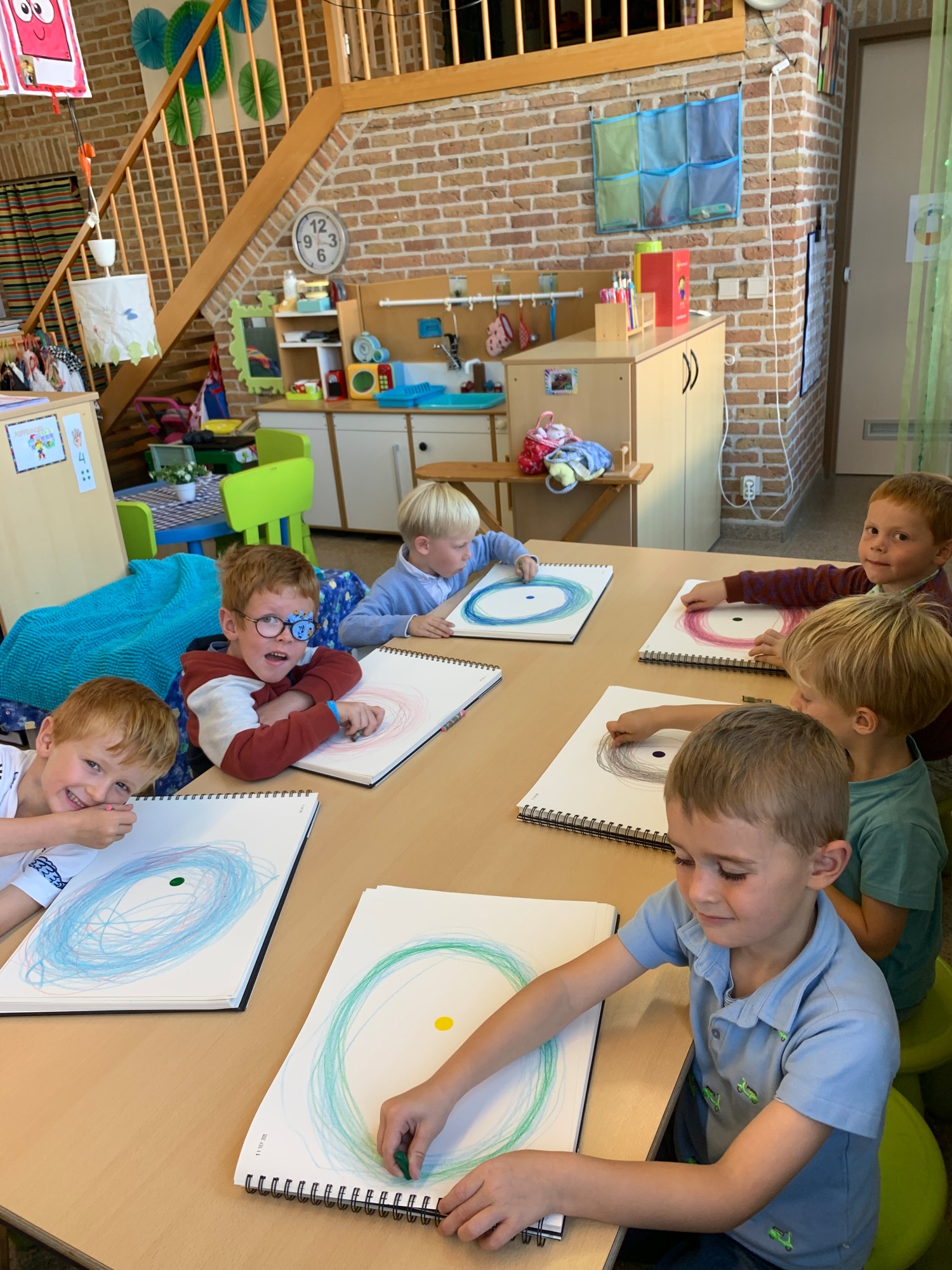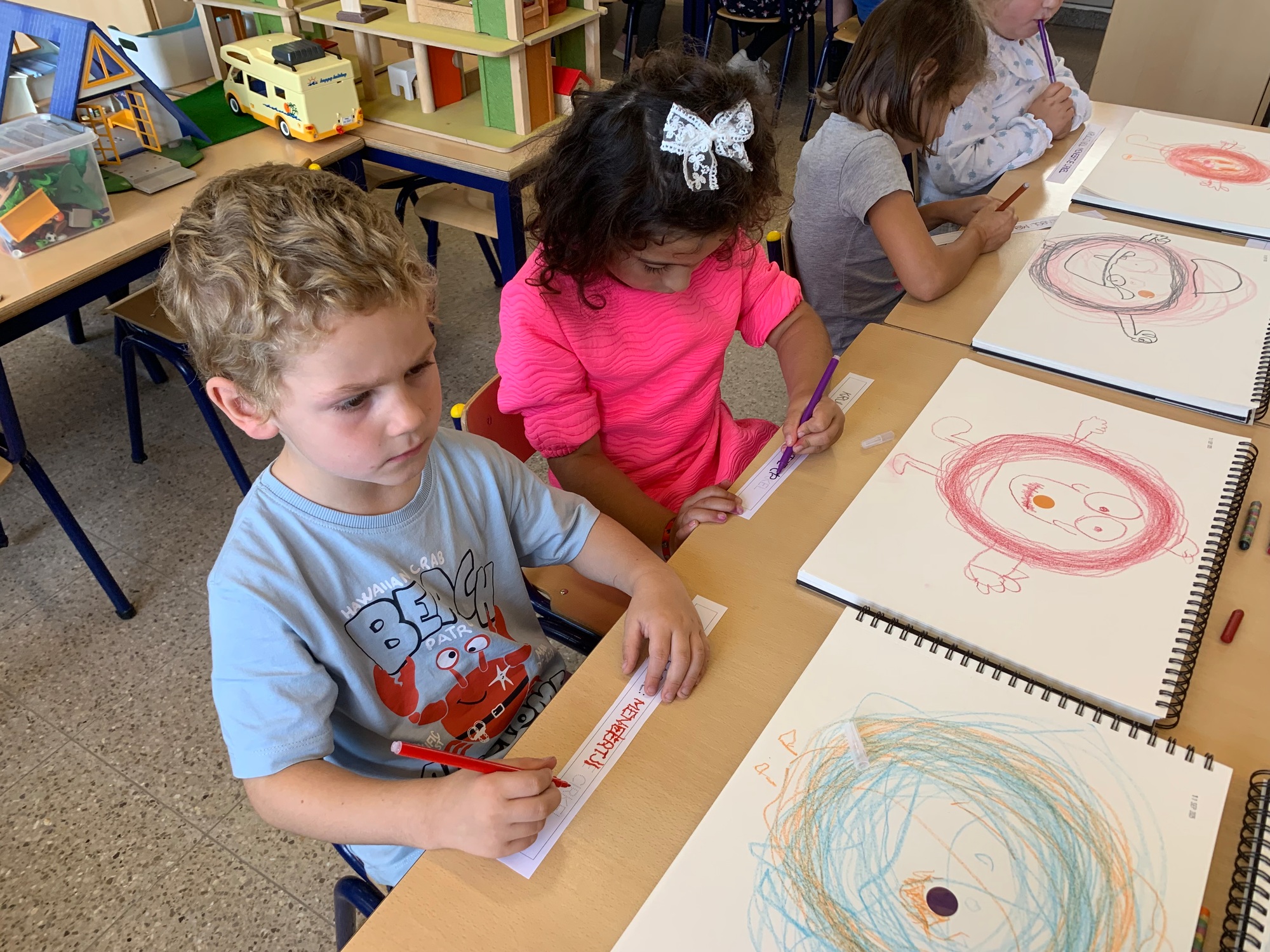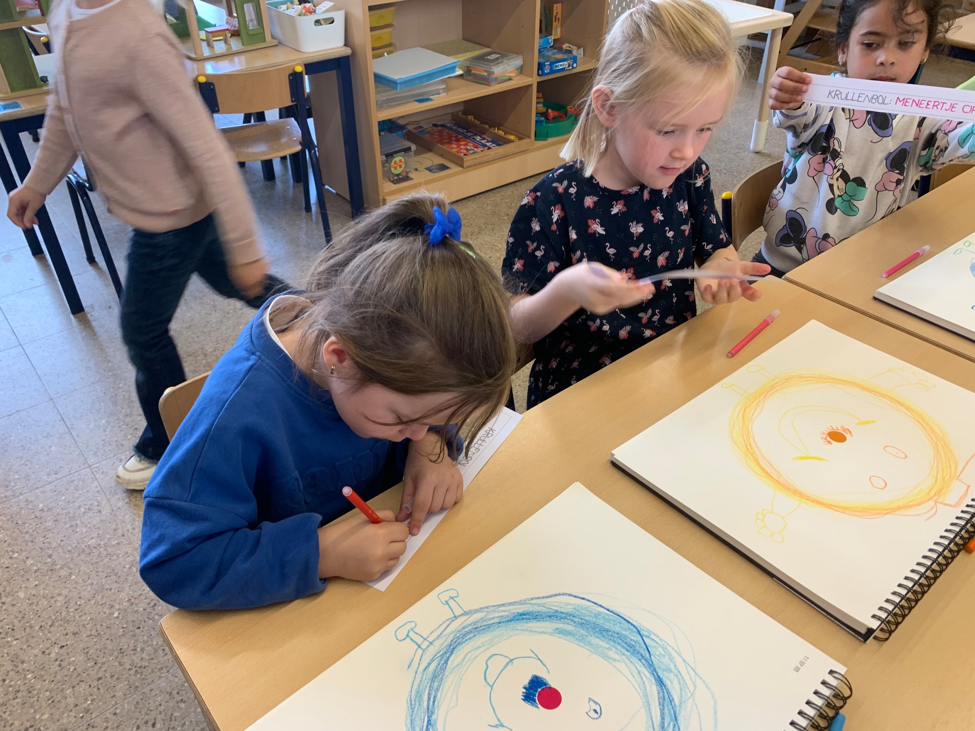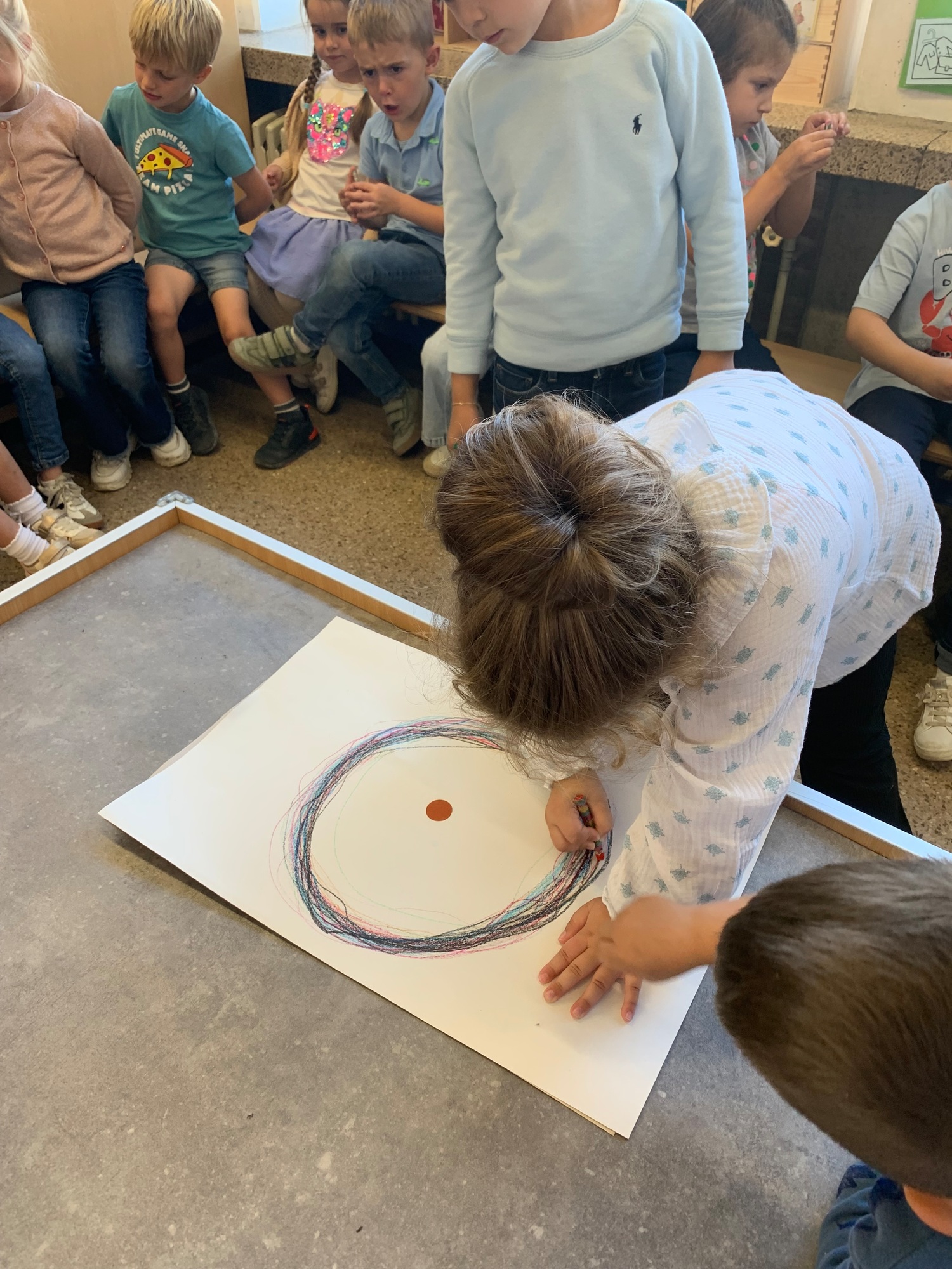 Via een filmpje maken we kennis hoe we een cirkel het best schrijven. We oefenden in de lucht, op papier, in onze krullenbollenschrijfboek...