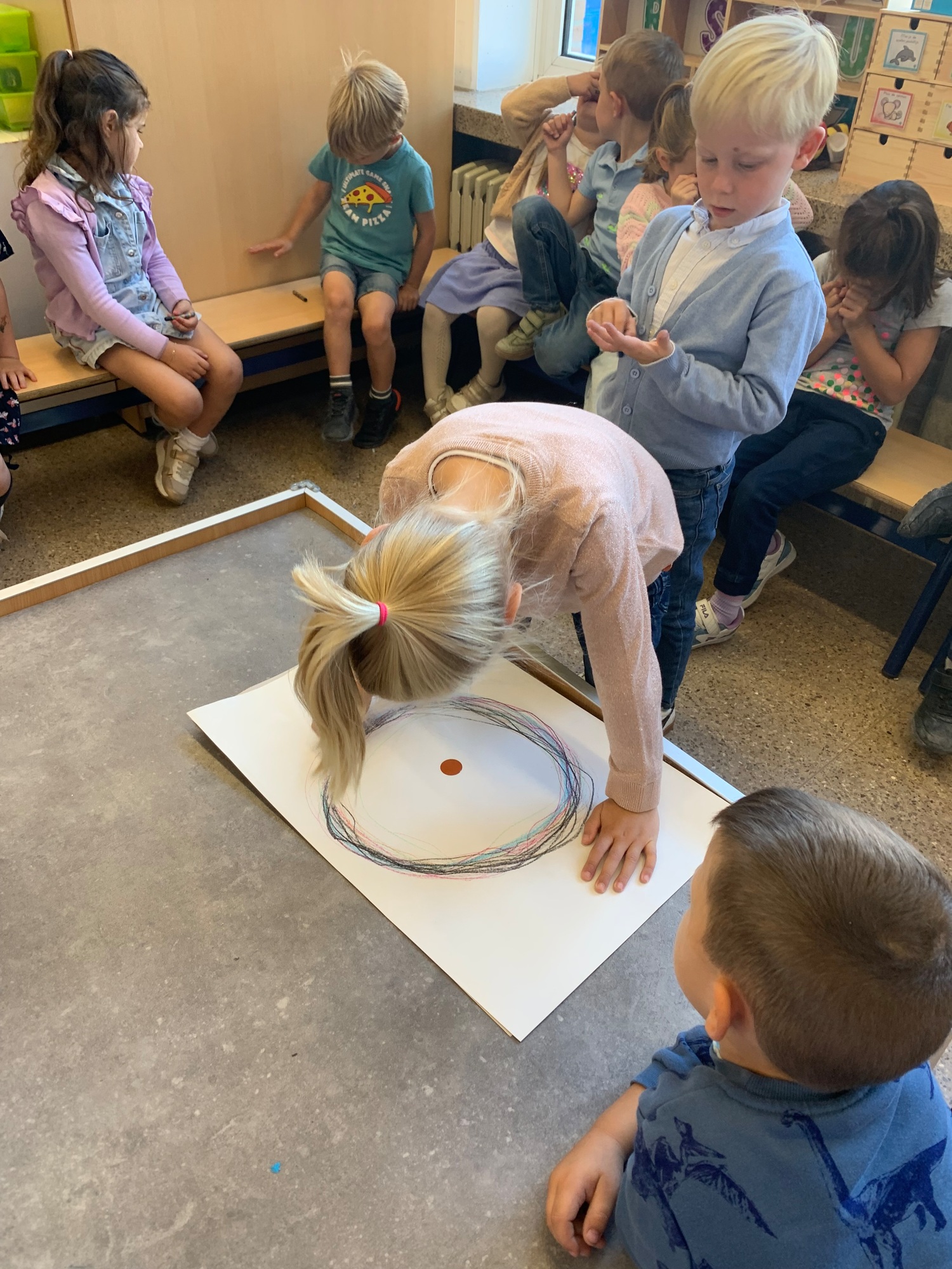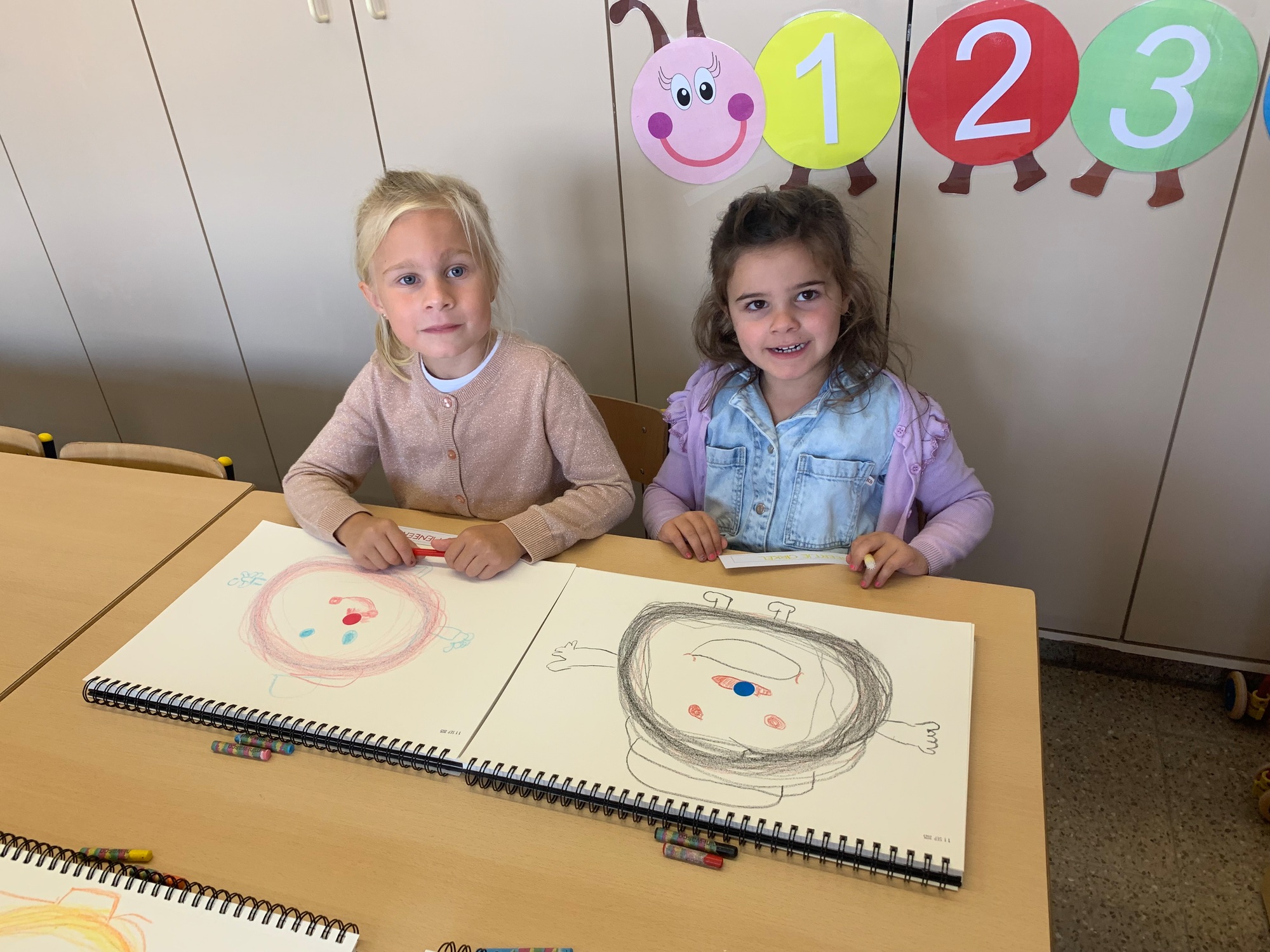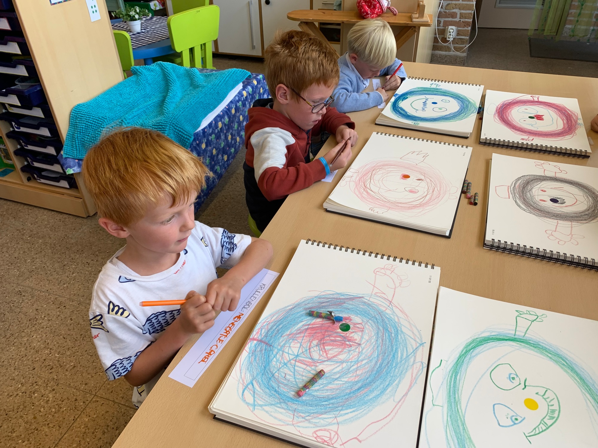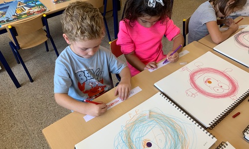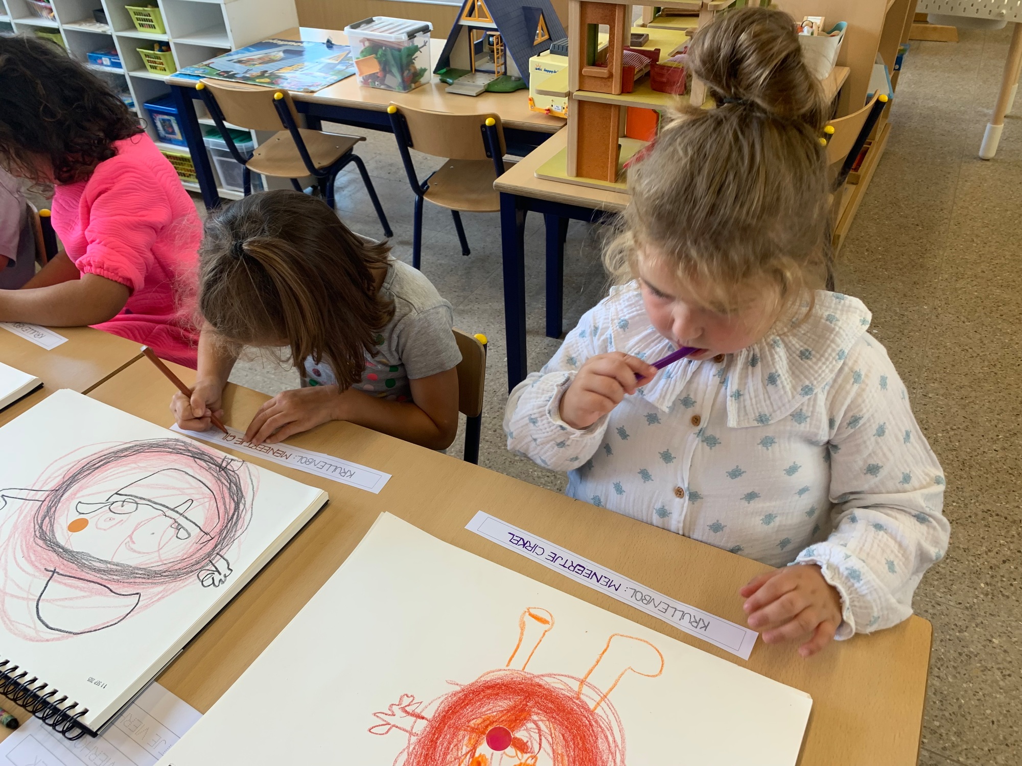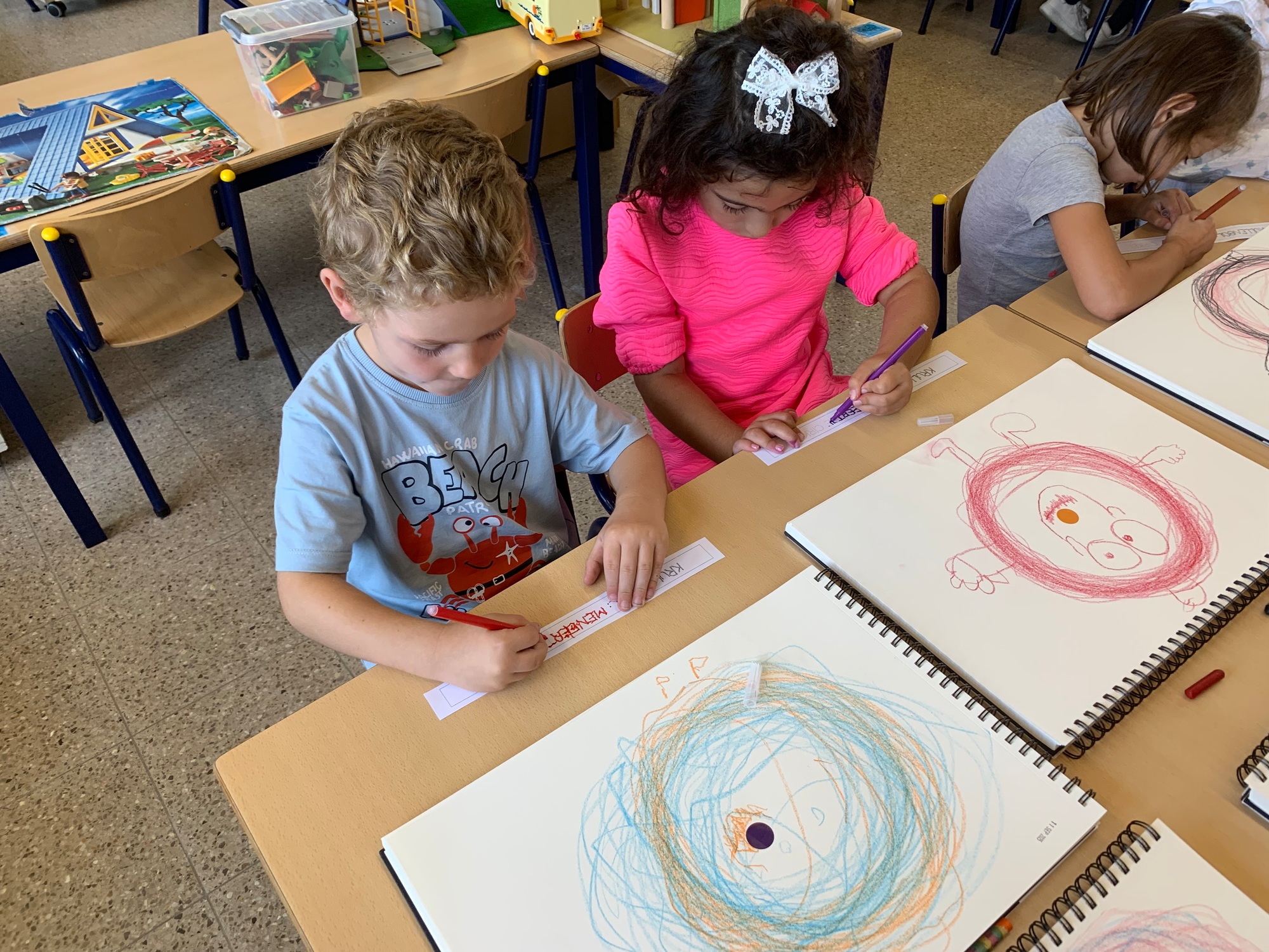 Via een filmpje maken we kennis hoe we een cirkel het best schrijven. We oefenden in de lucht, op papier, in onze krullenbollenschrijfboek...