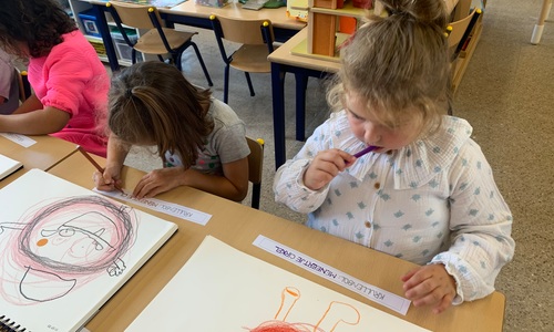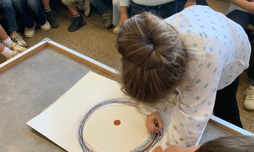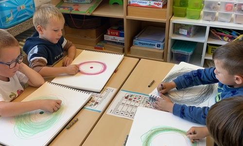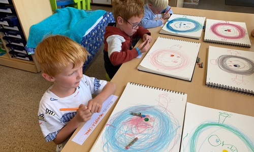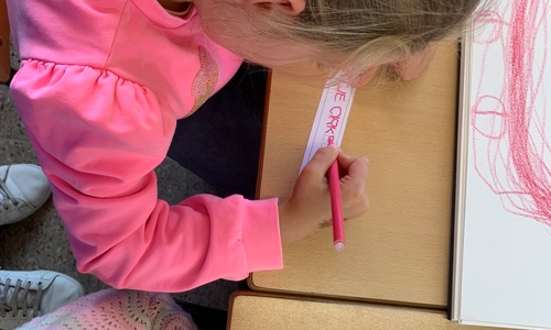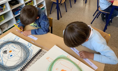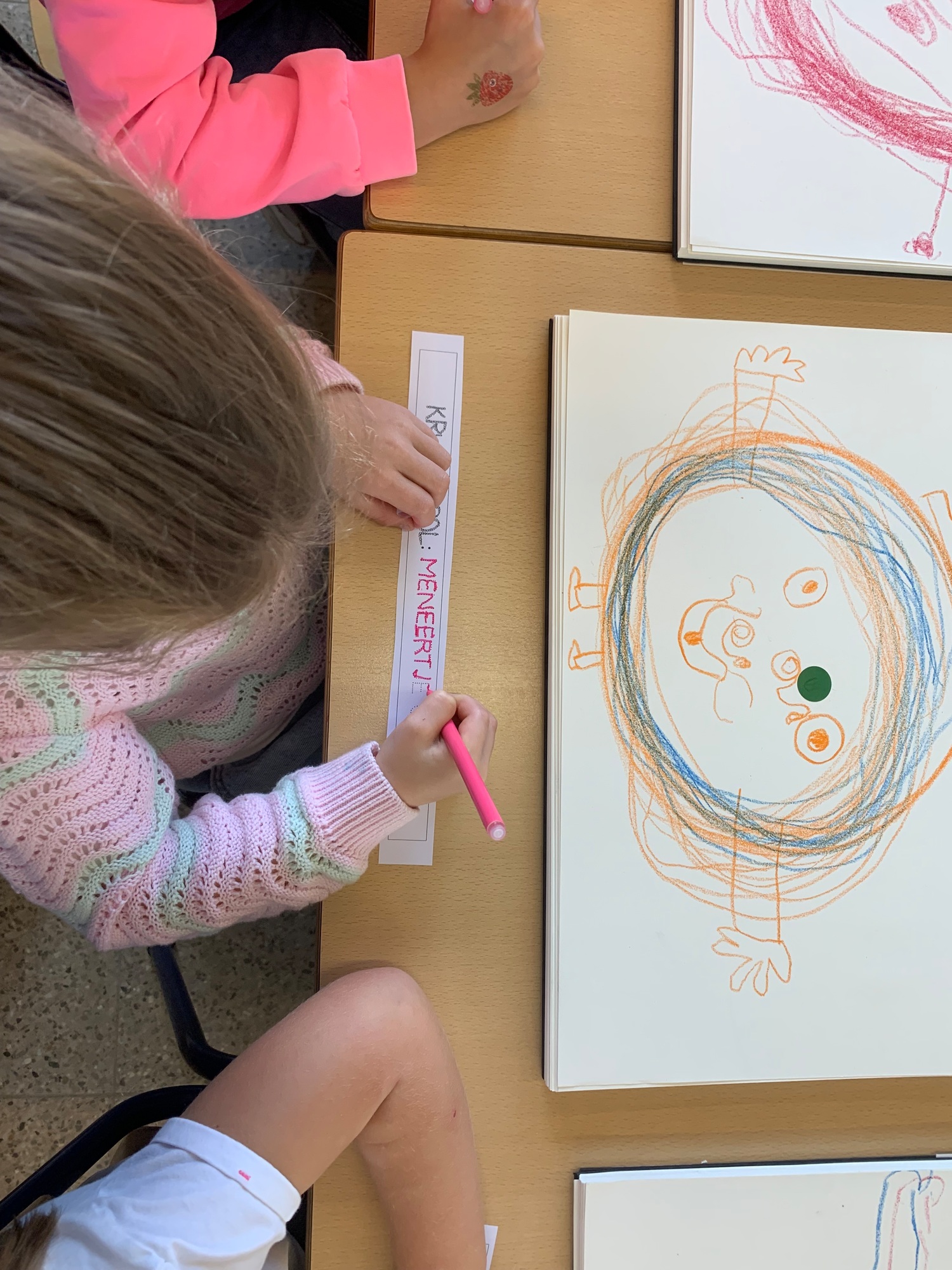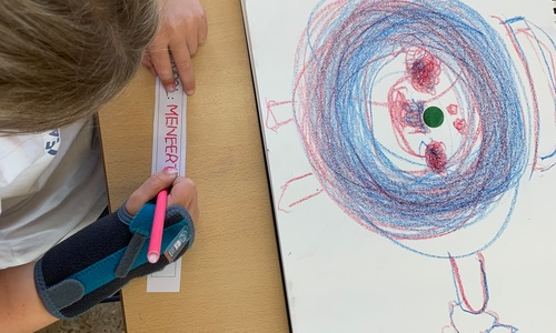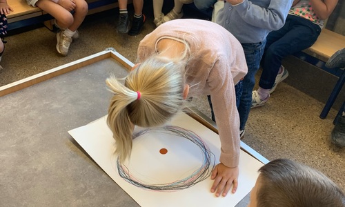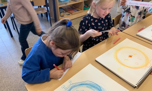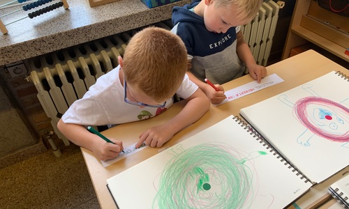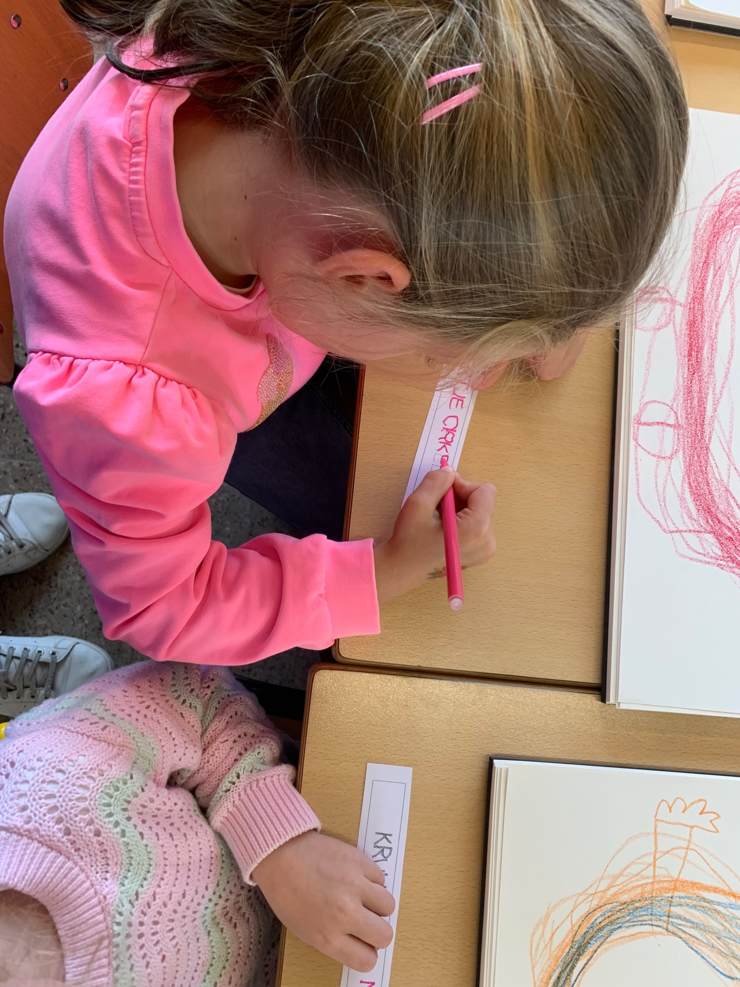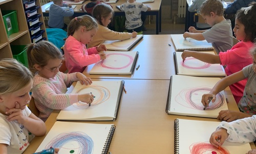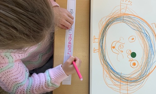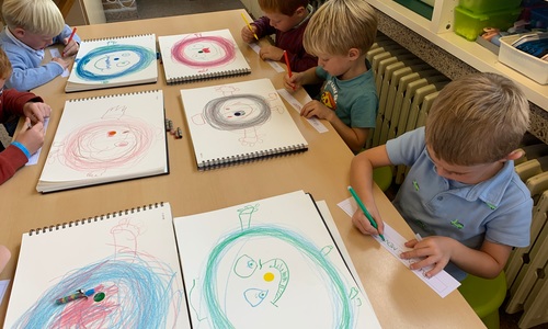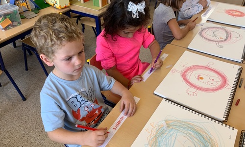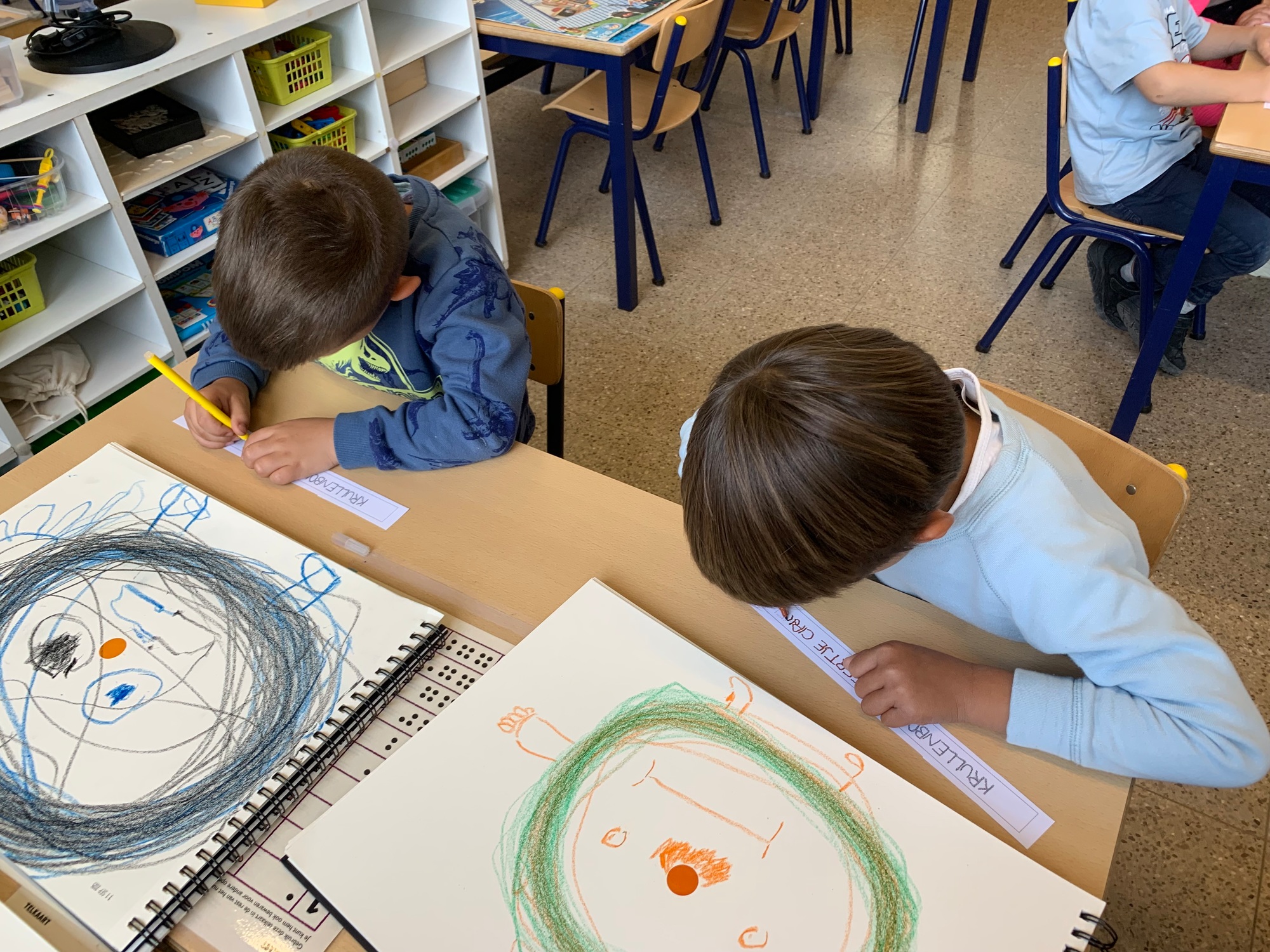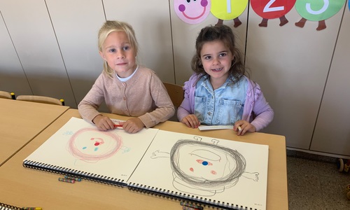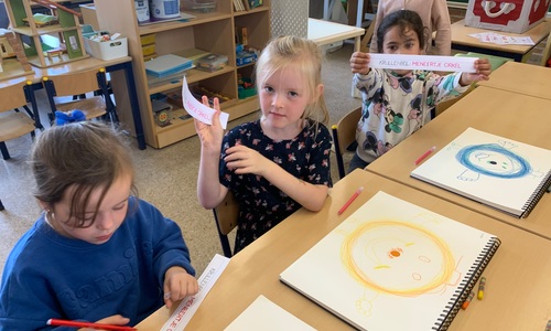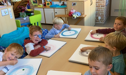 Via een filmpje maken we kennis hoe we een cirkel het best schrijven. We oefenden in de lucht, op papier, in onze krullenbollenschrijfboek...