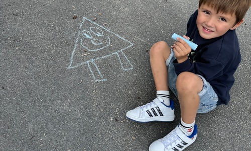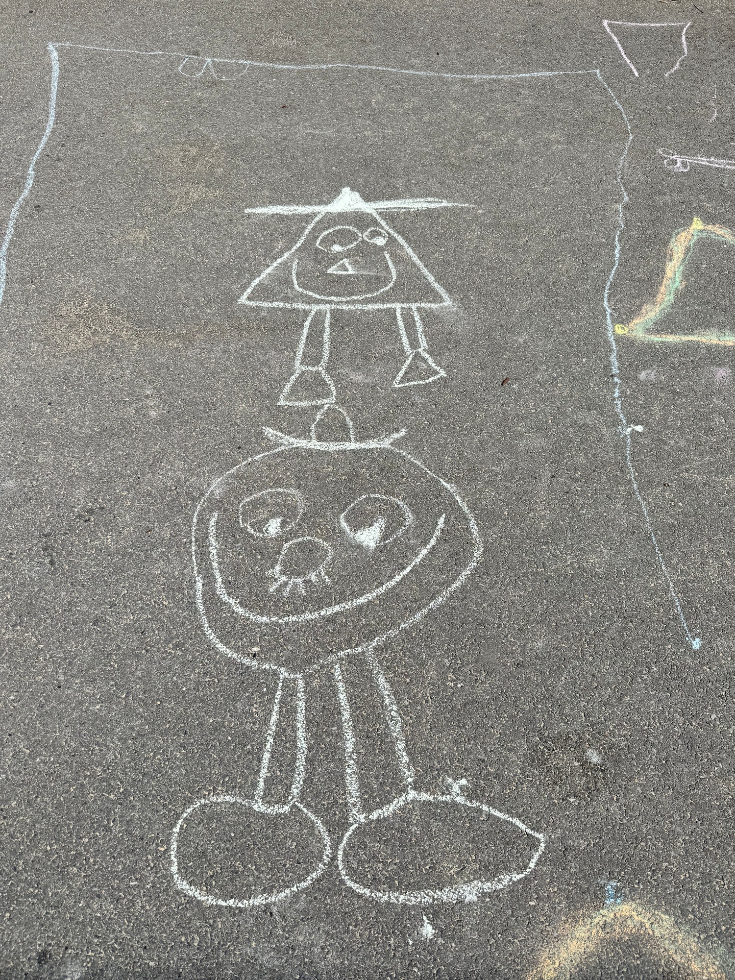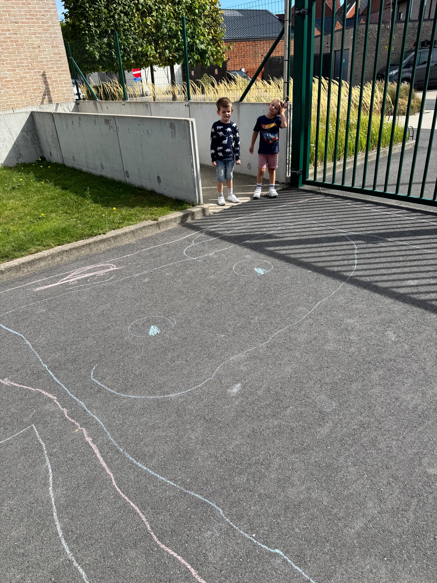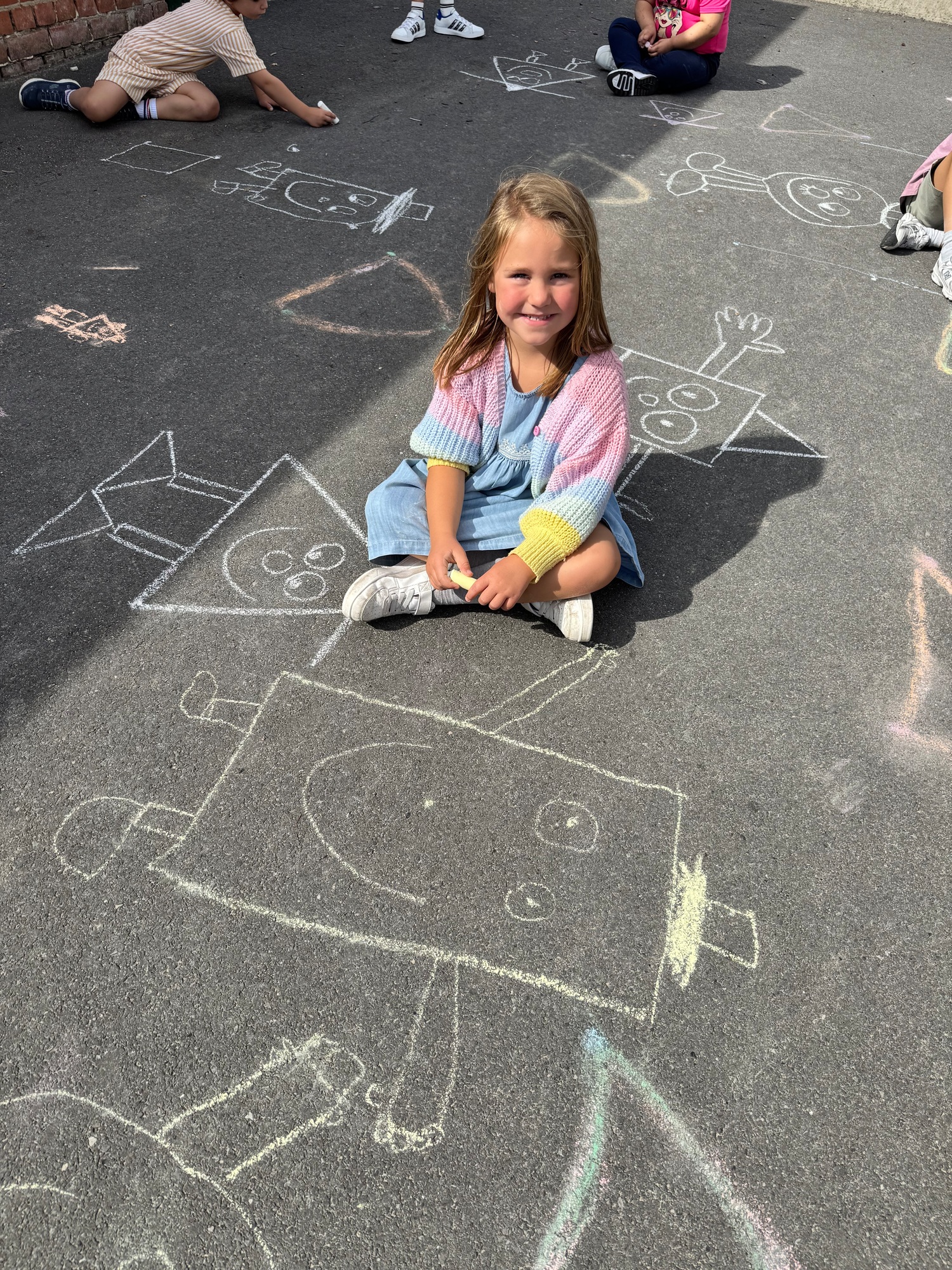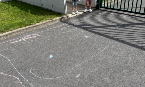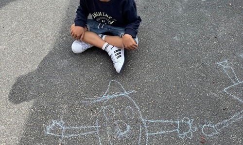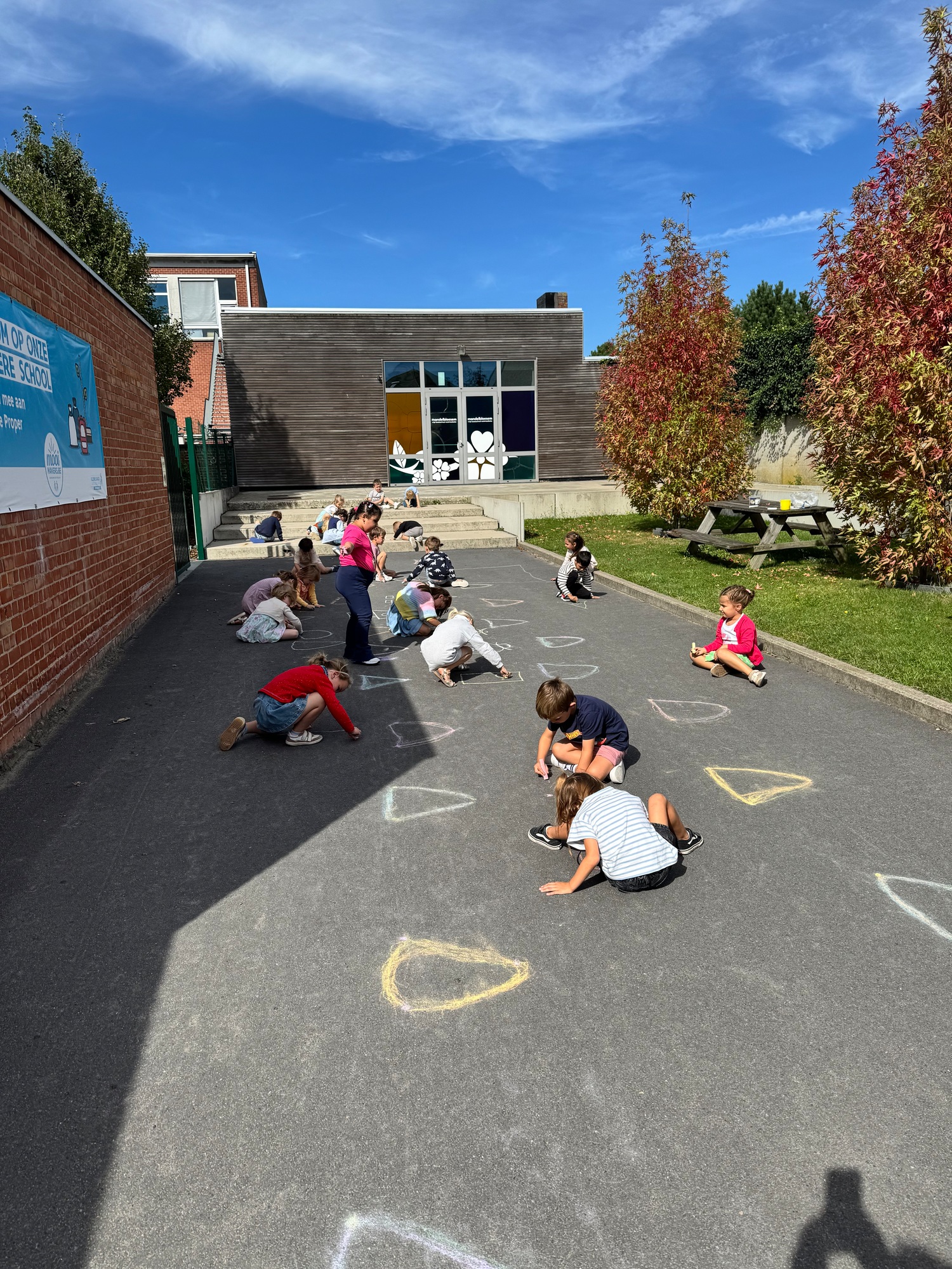 3KC Krullenbollen jullie mee? Meneertje Cirkel en Meneertje Driehoek krijten op de grond in de wachtzone.