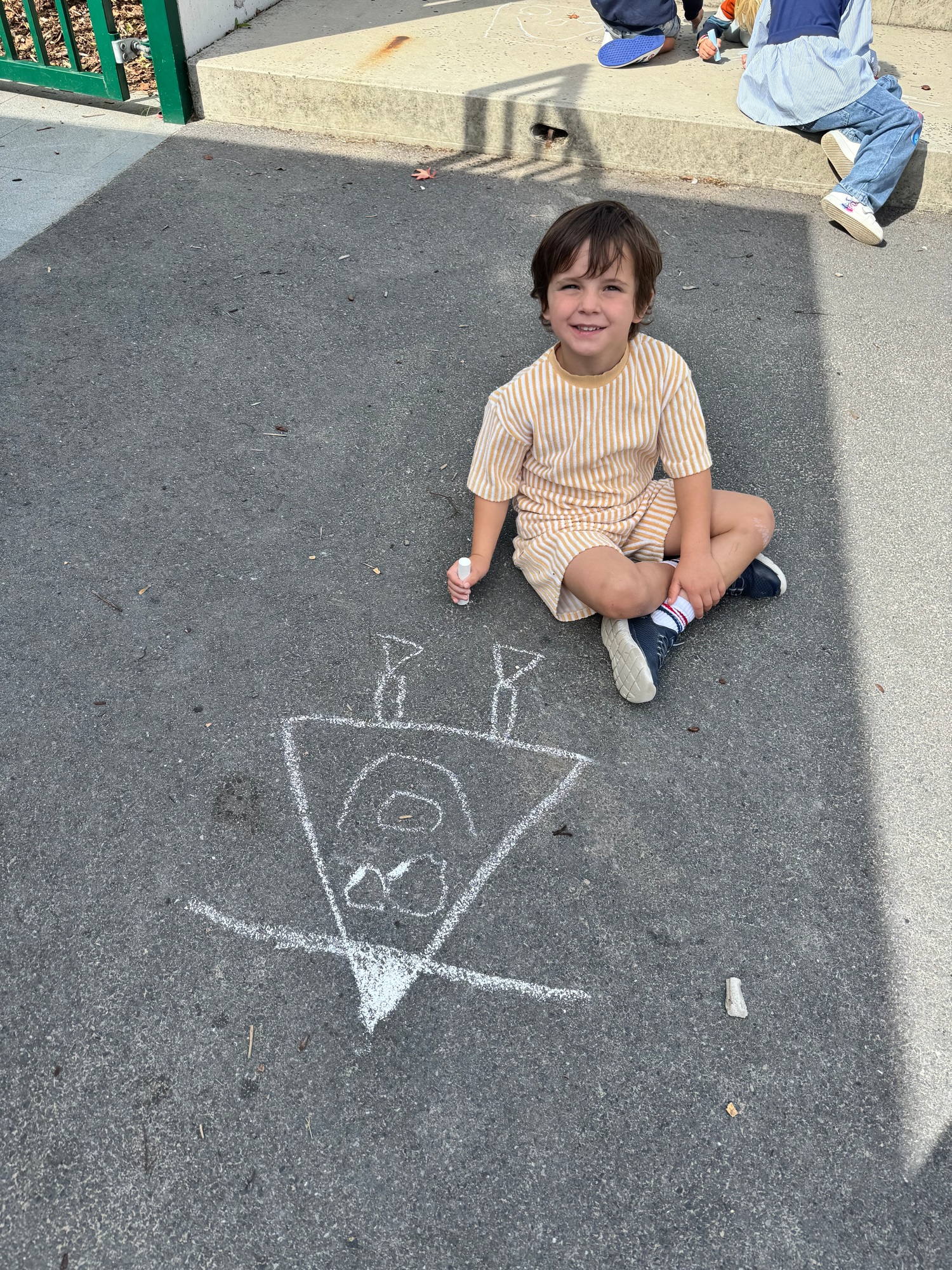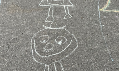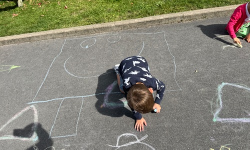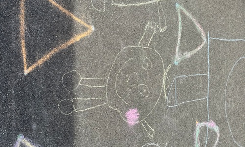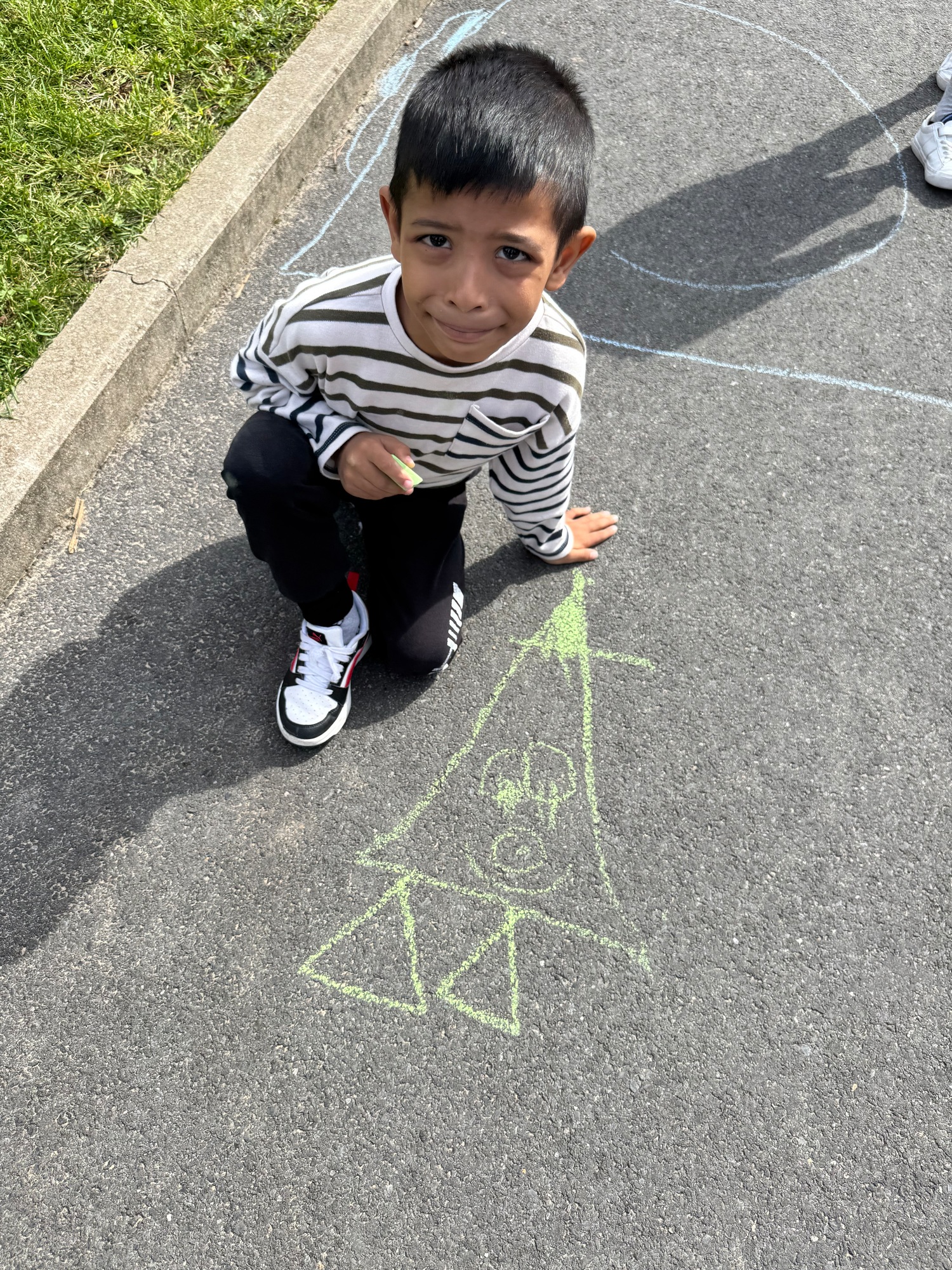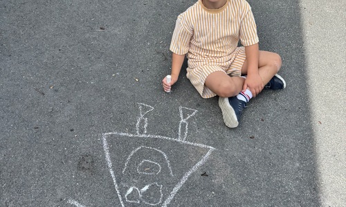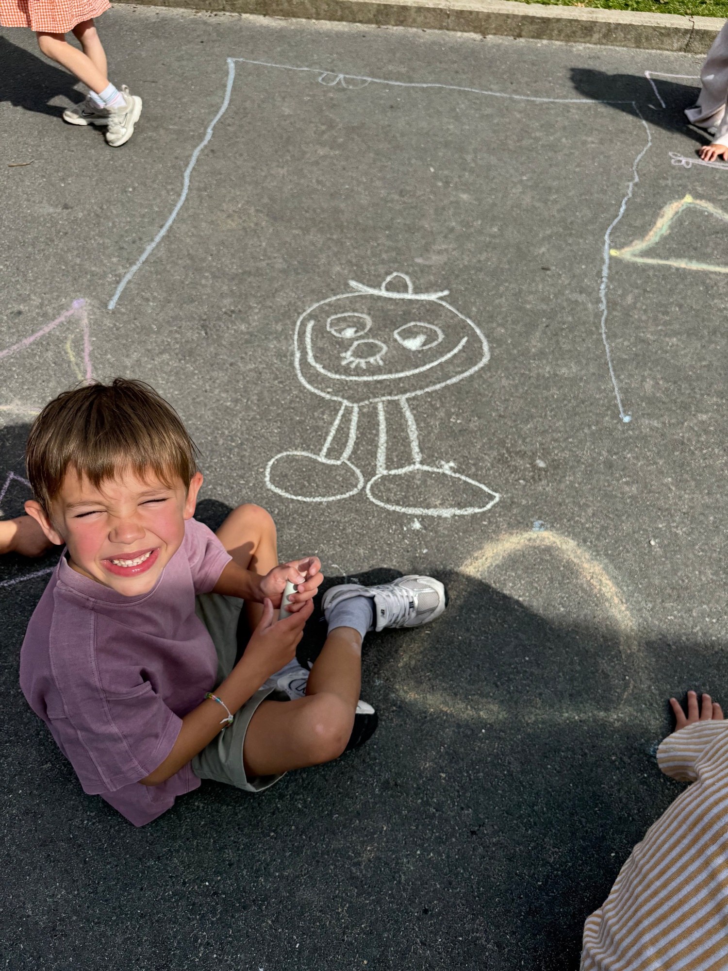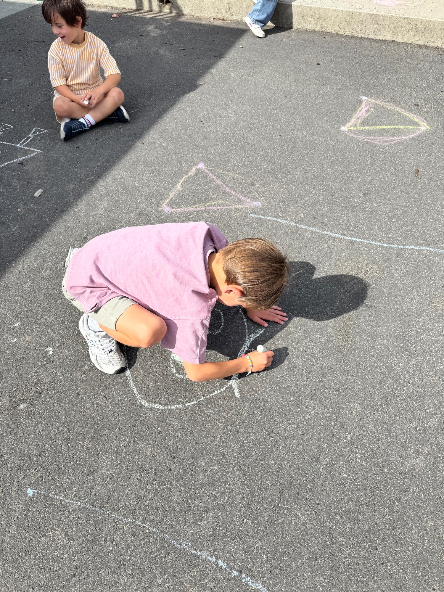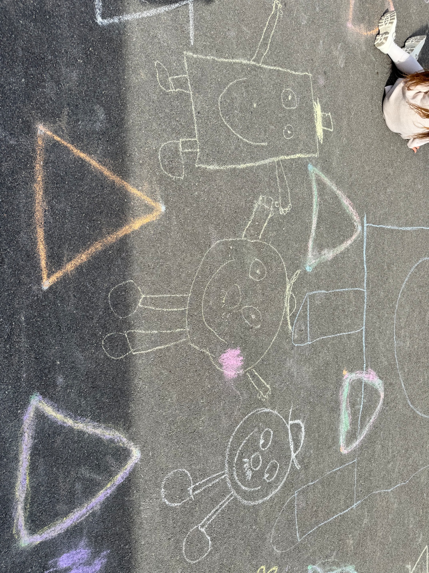 3KC Krullenbollen jullie mee? Meneertje Cirkel en Meneertje Driehoek krijten op de grond in de wachtzone.