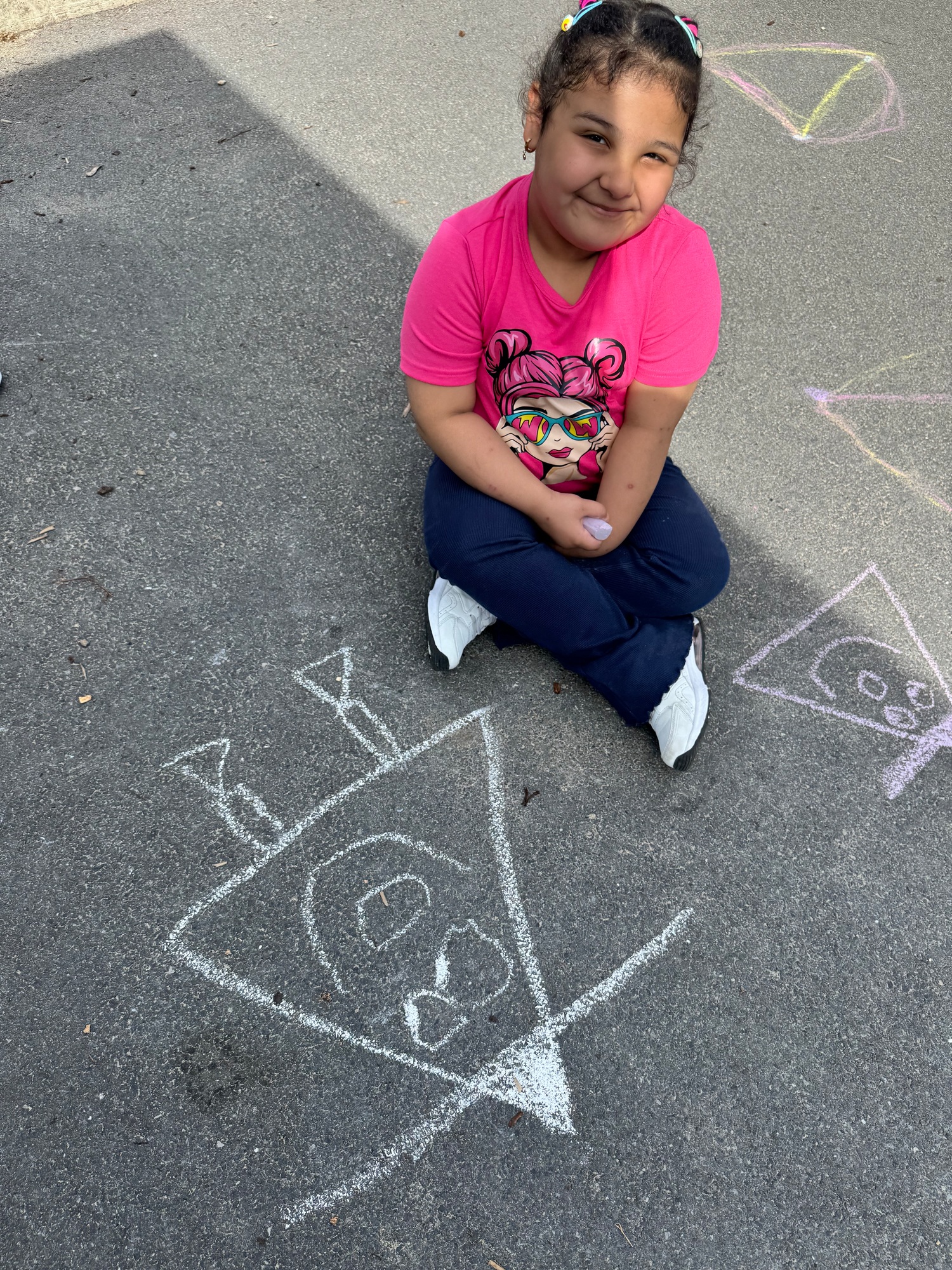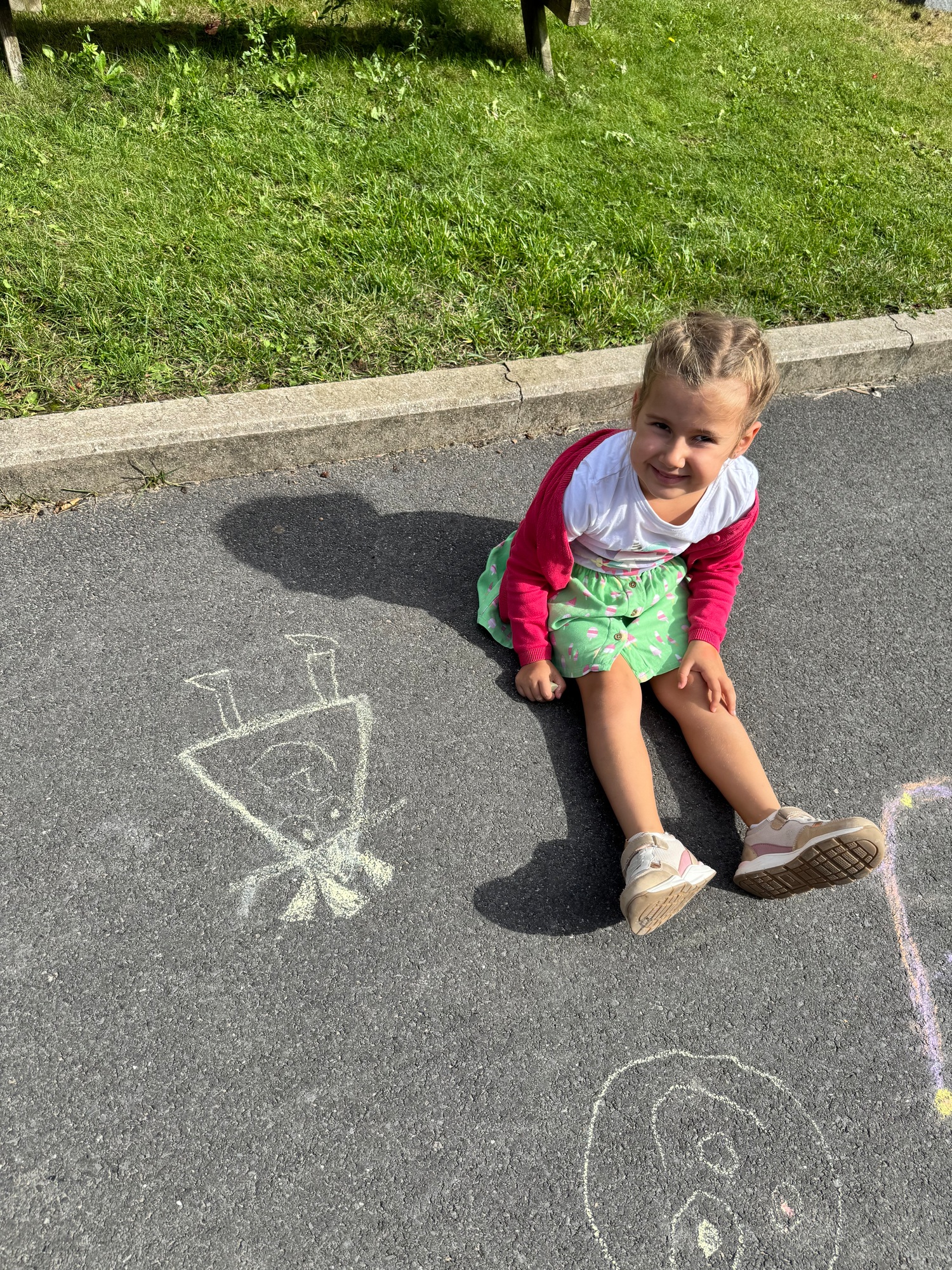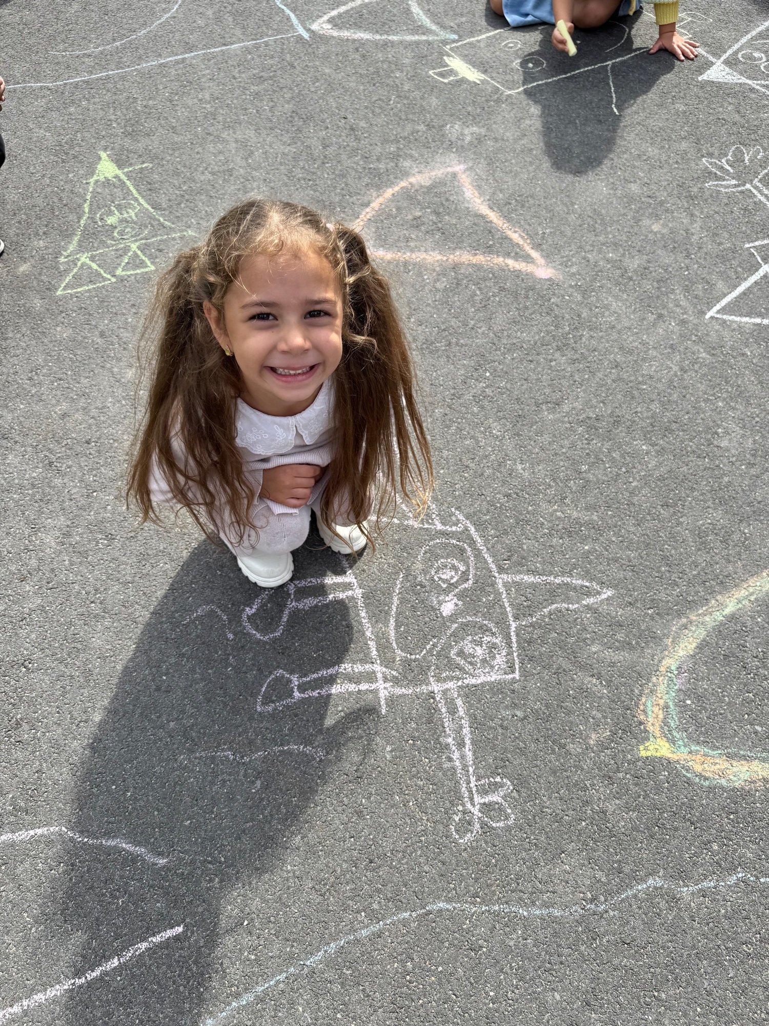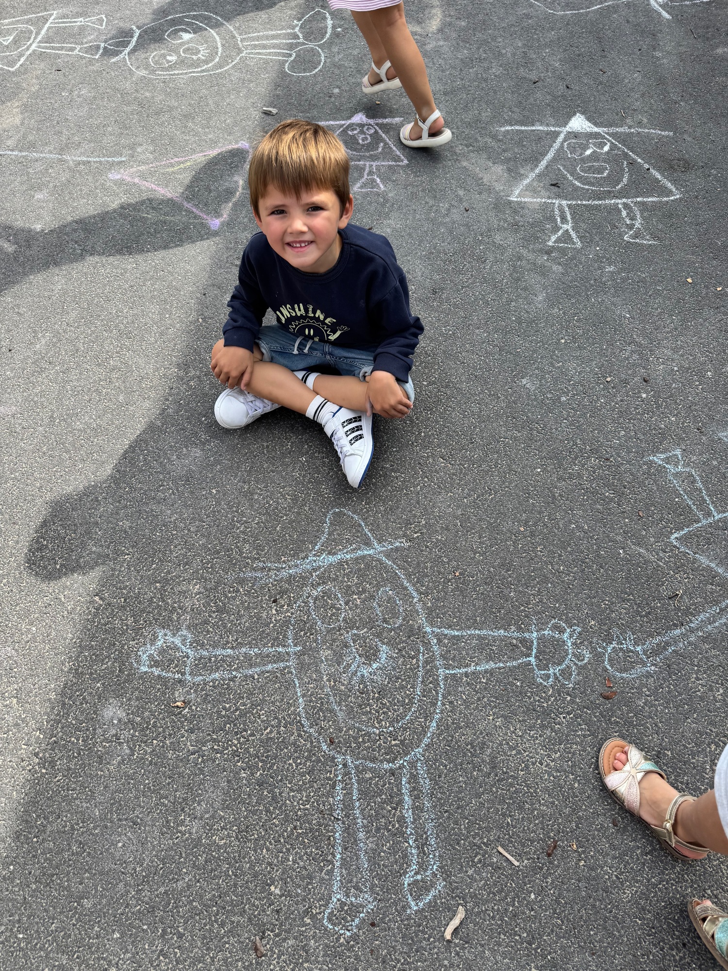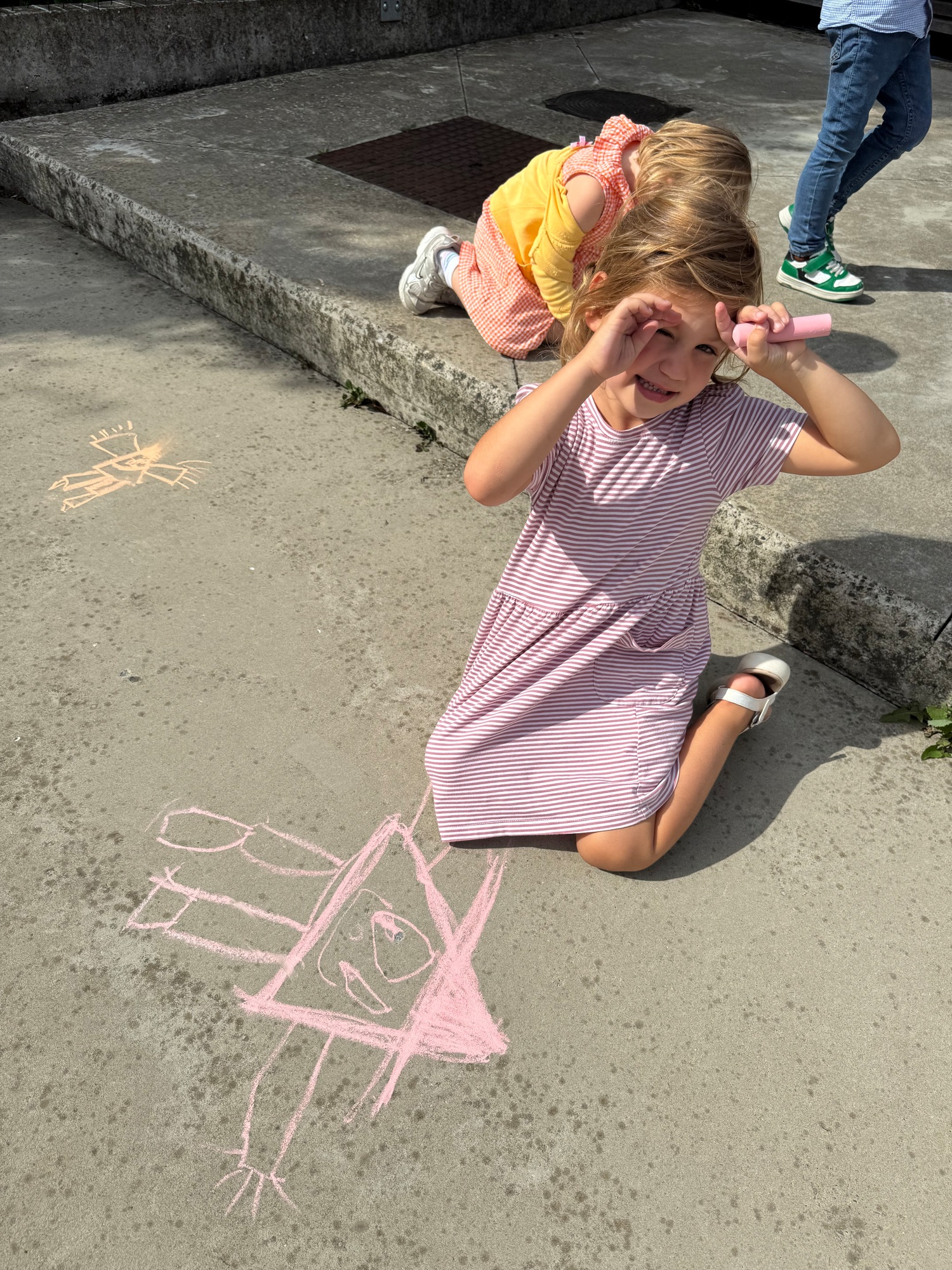 3KC Krullenbollen jullie mee? Meneertje Cirkel en Meneertje Driehoek krijten op de grond in de wachtzone.