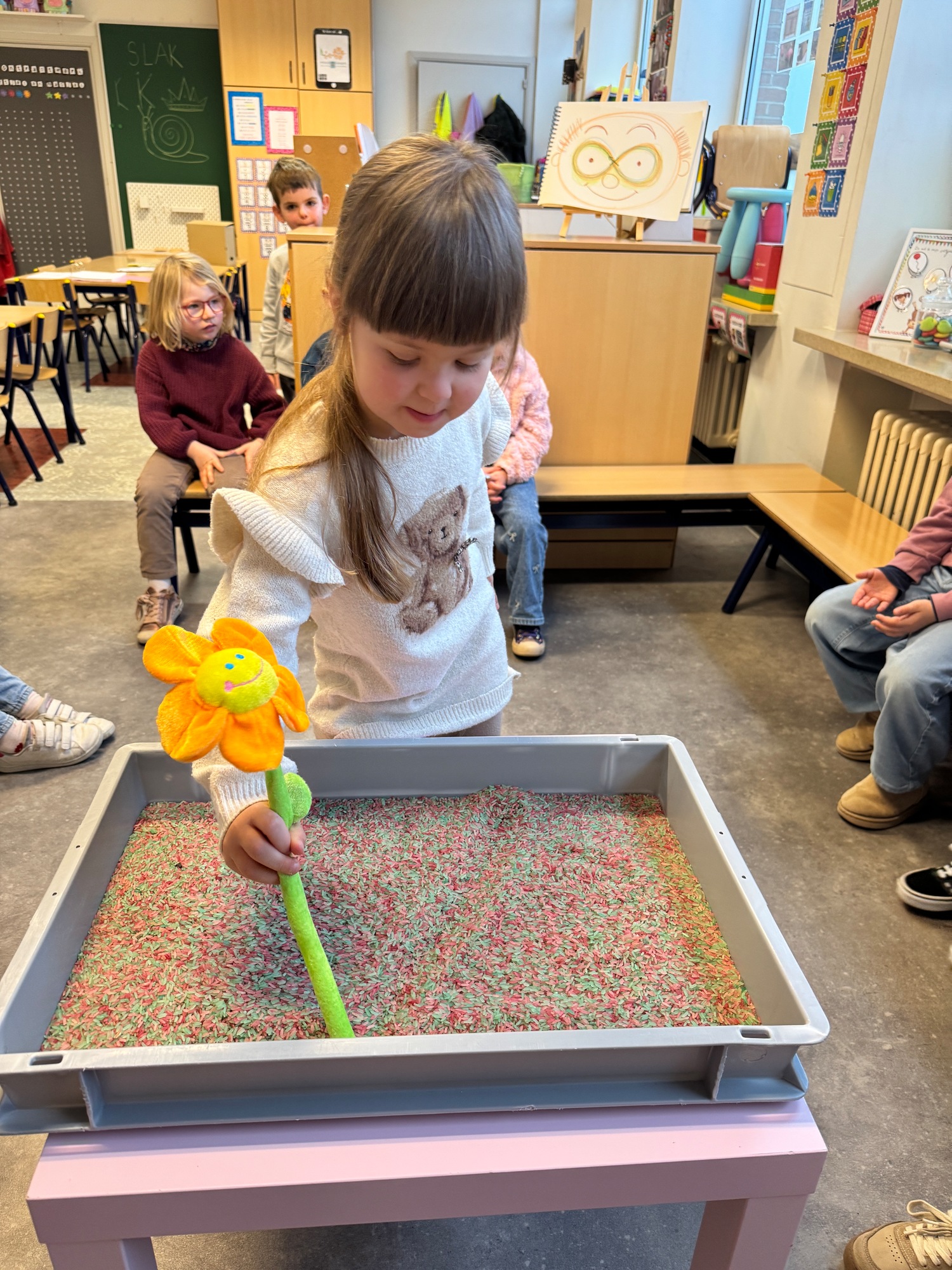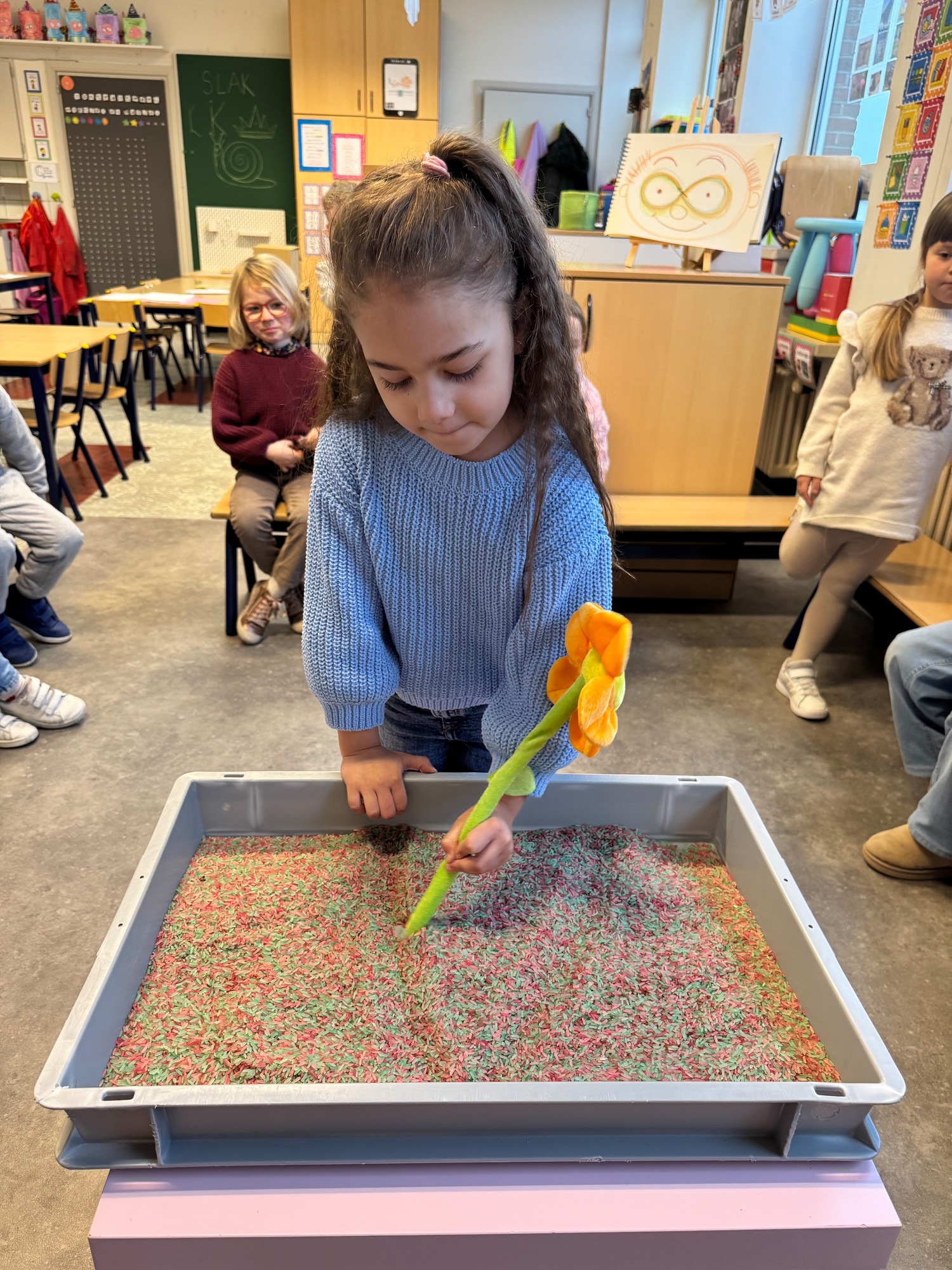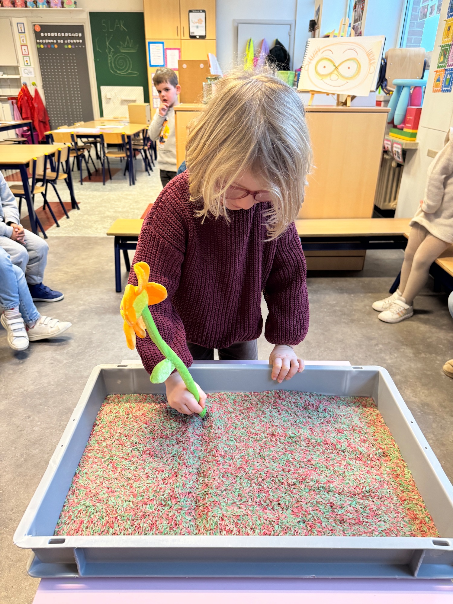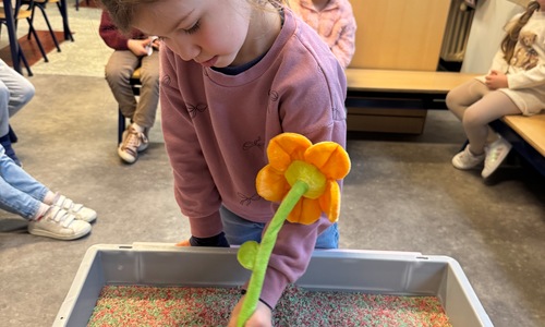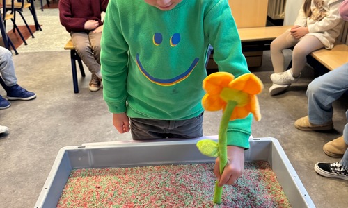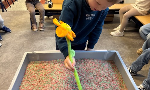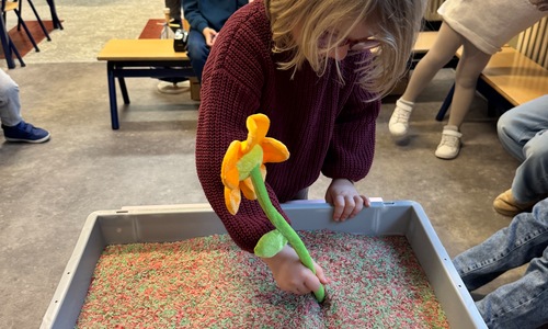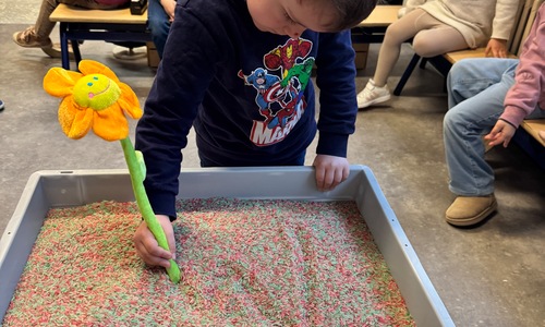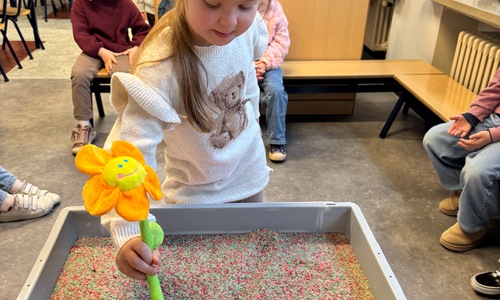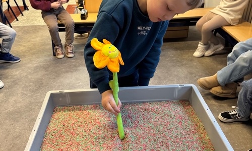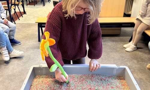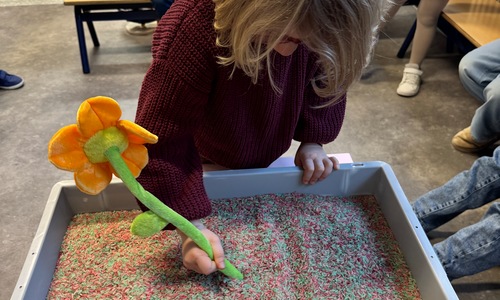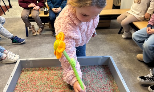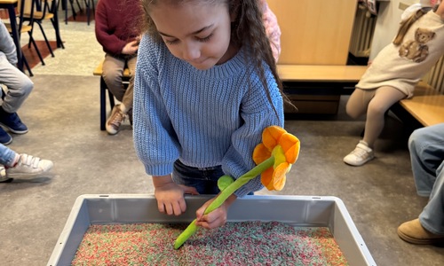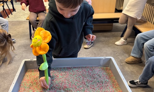 3KC Thema Letters: Ik shrijf mijn eerste naamletter in onze rijstbak.