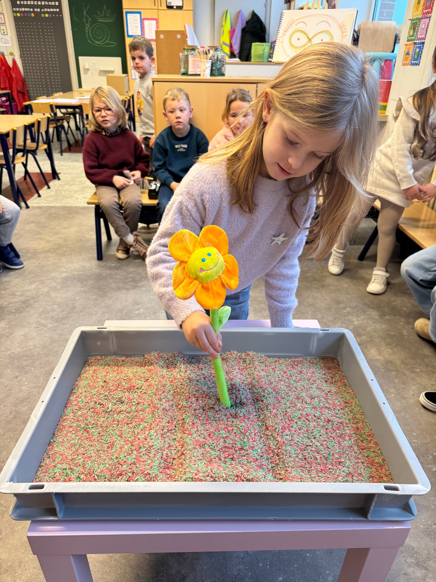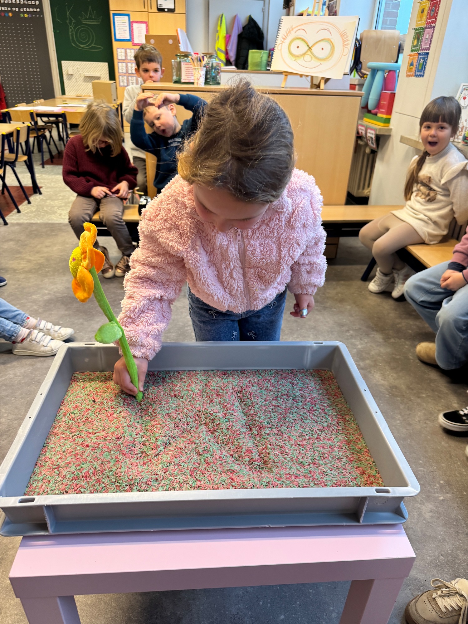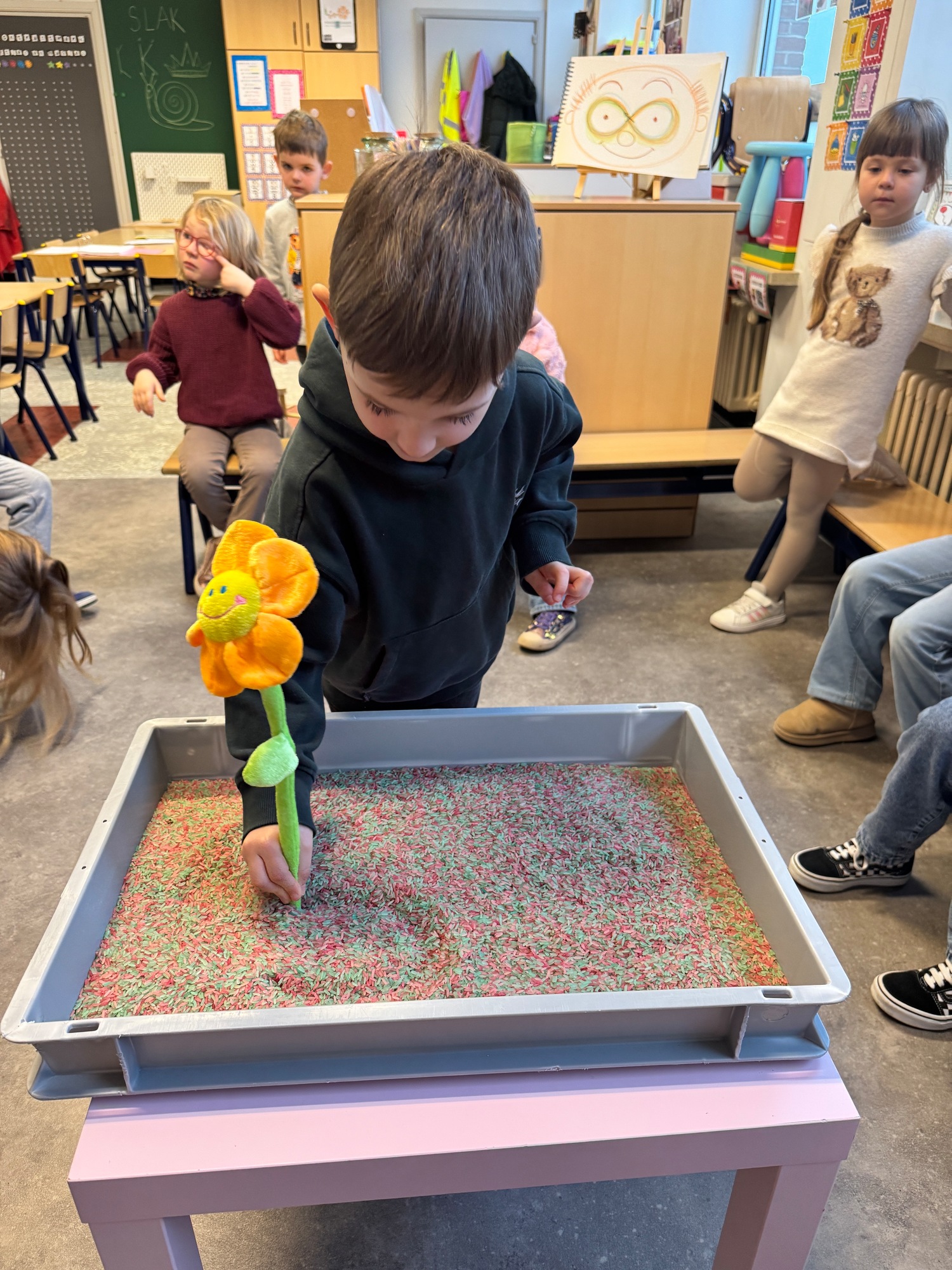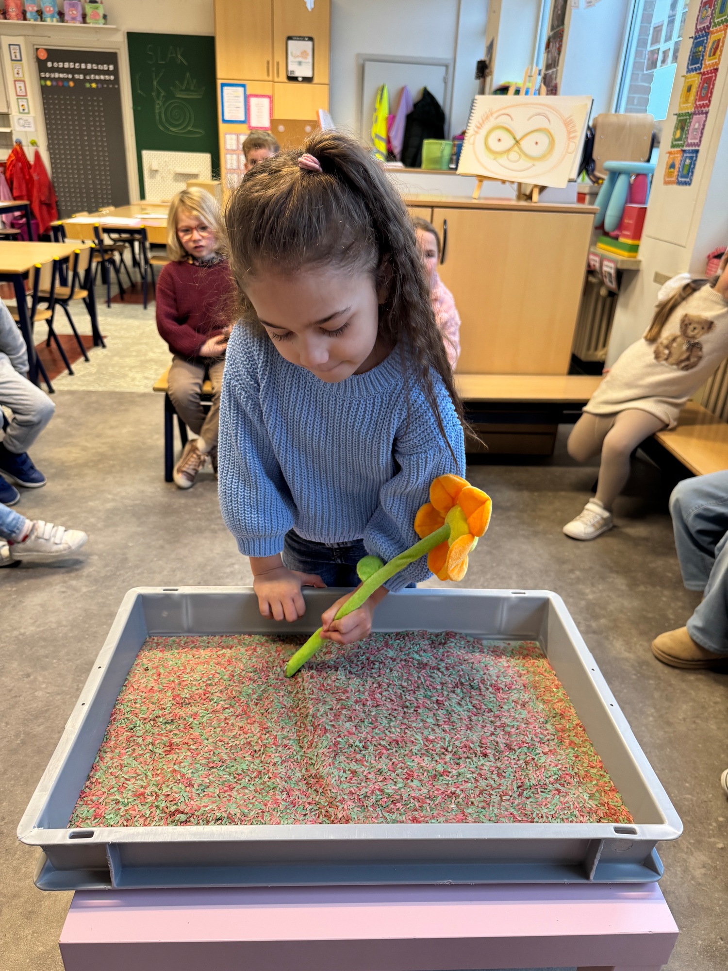 3KC Thema Letters: Ik shrijf mijn eerste naamletter in onze rijstbak.