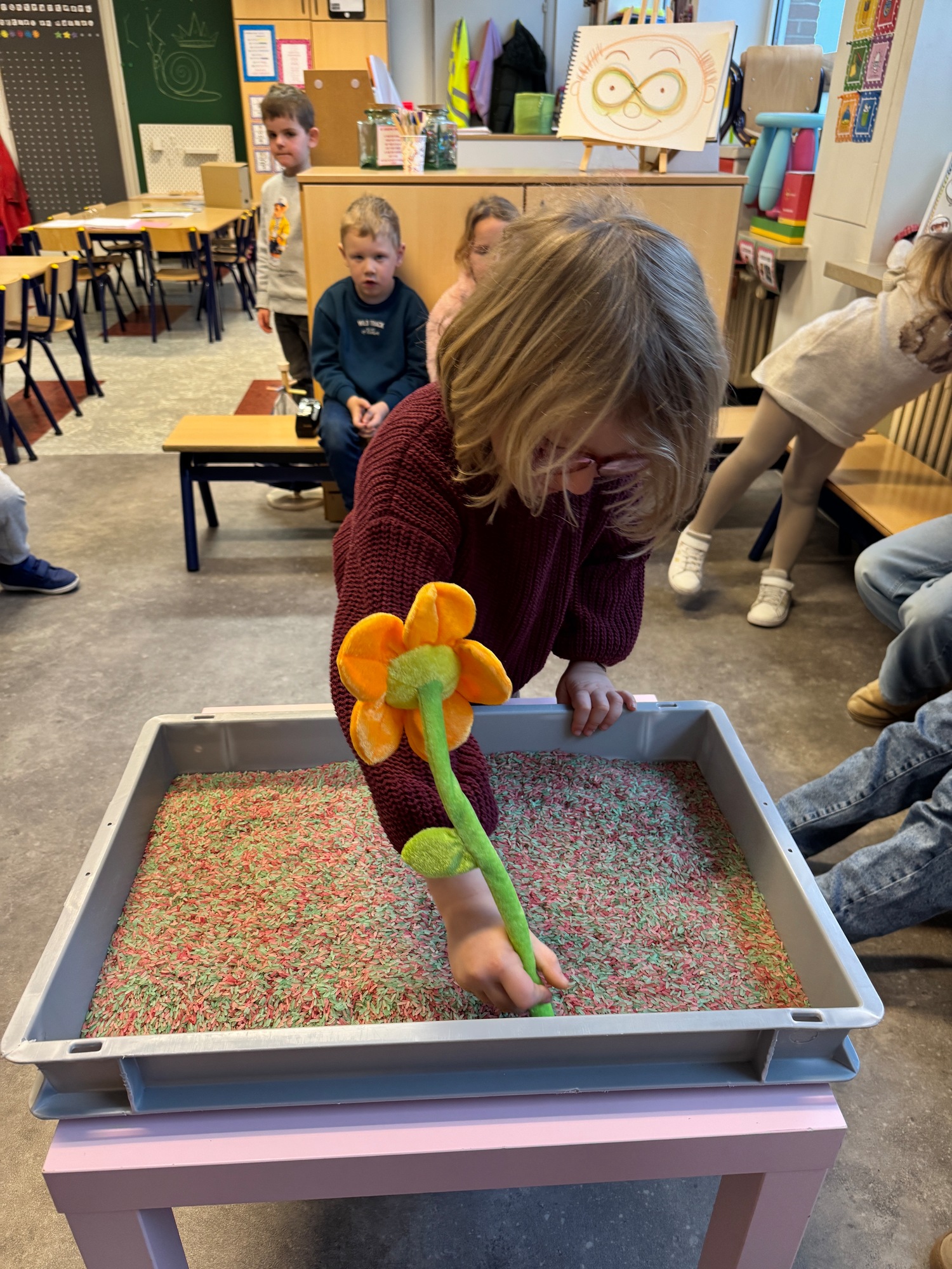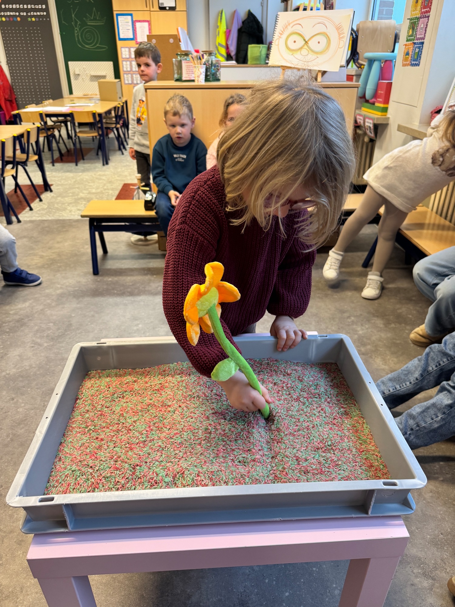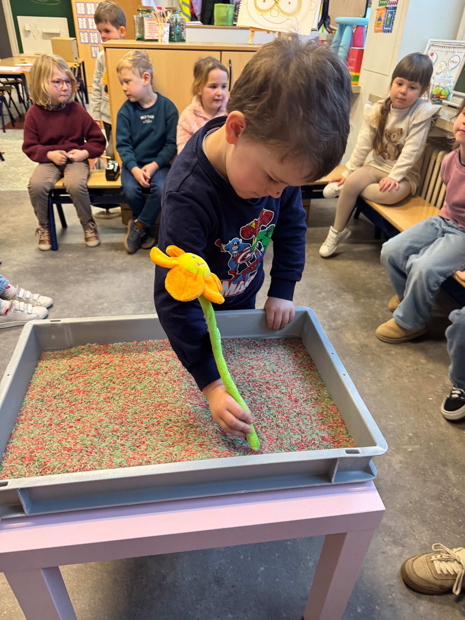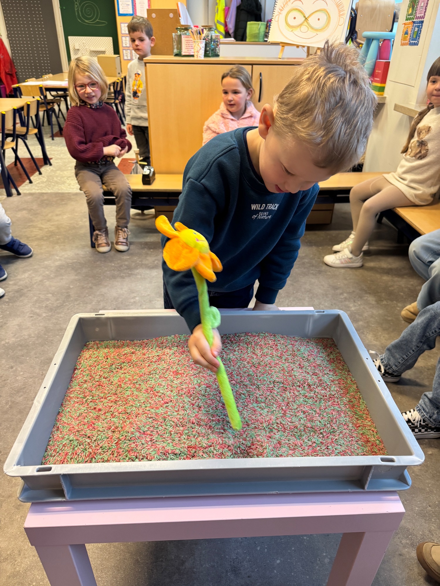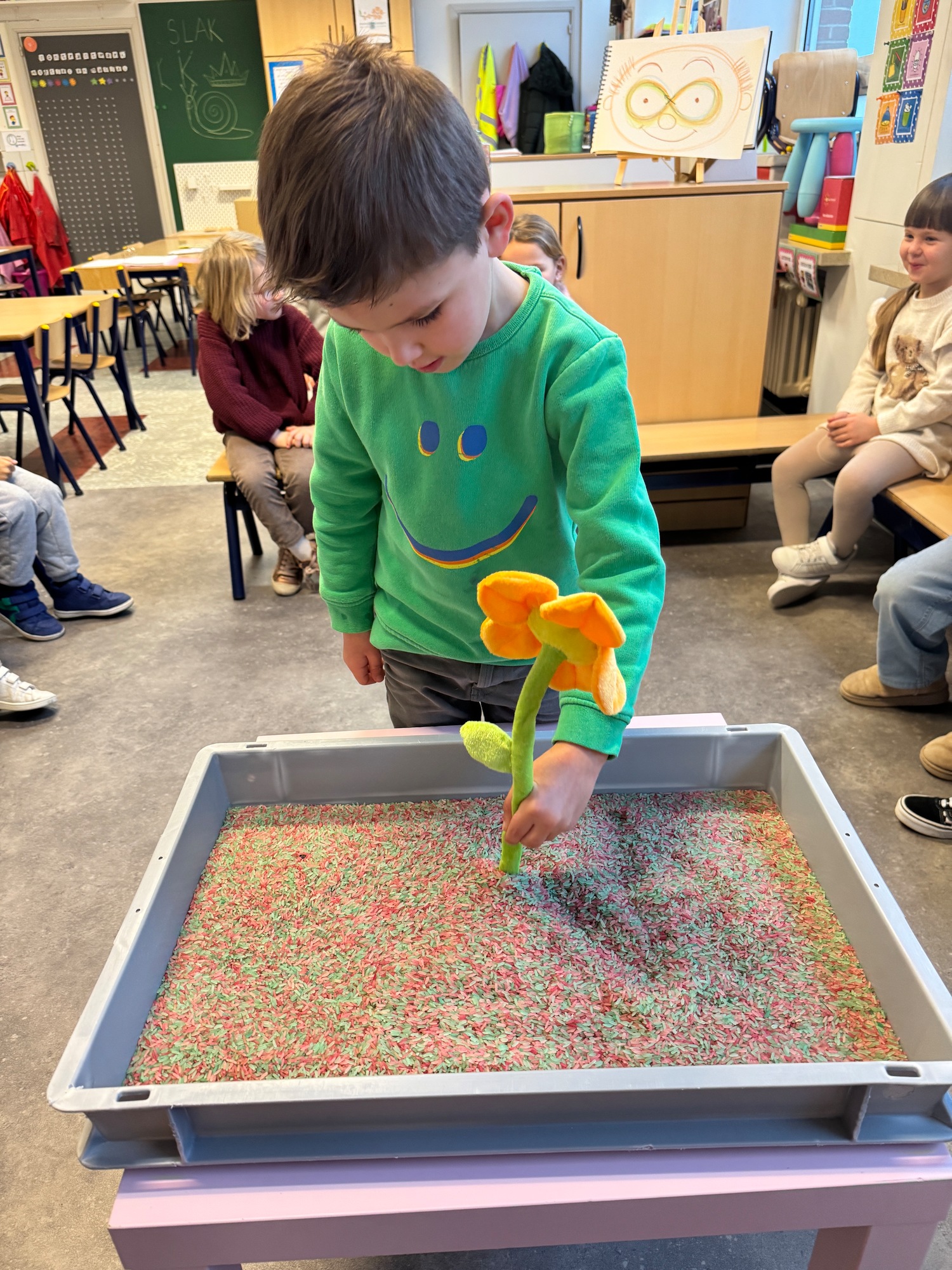 3KC Thema Letters: Ik shrijf mijn eerste naamletter in onze rijstbak.