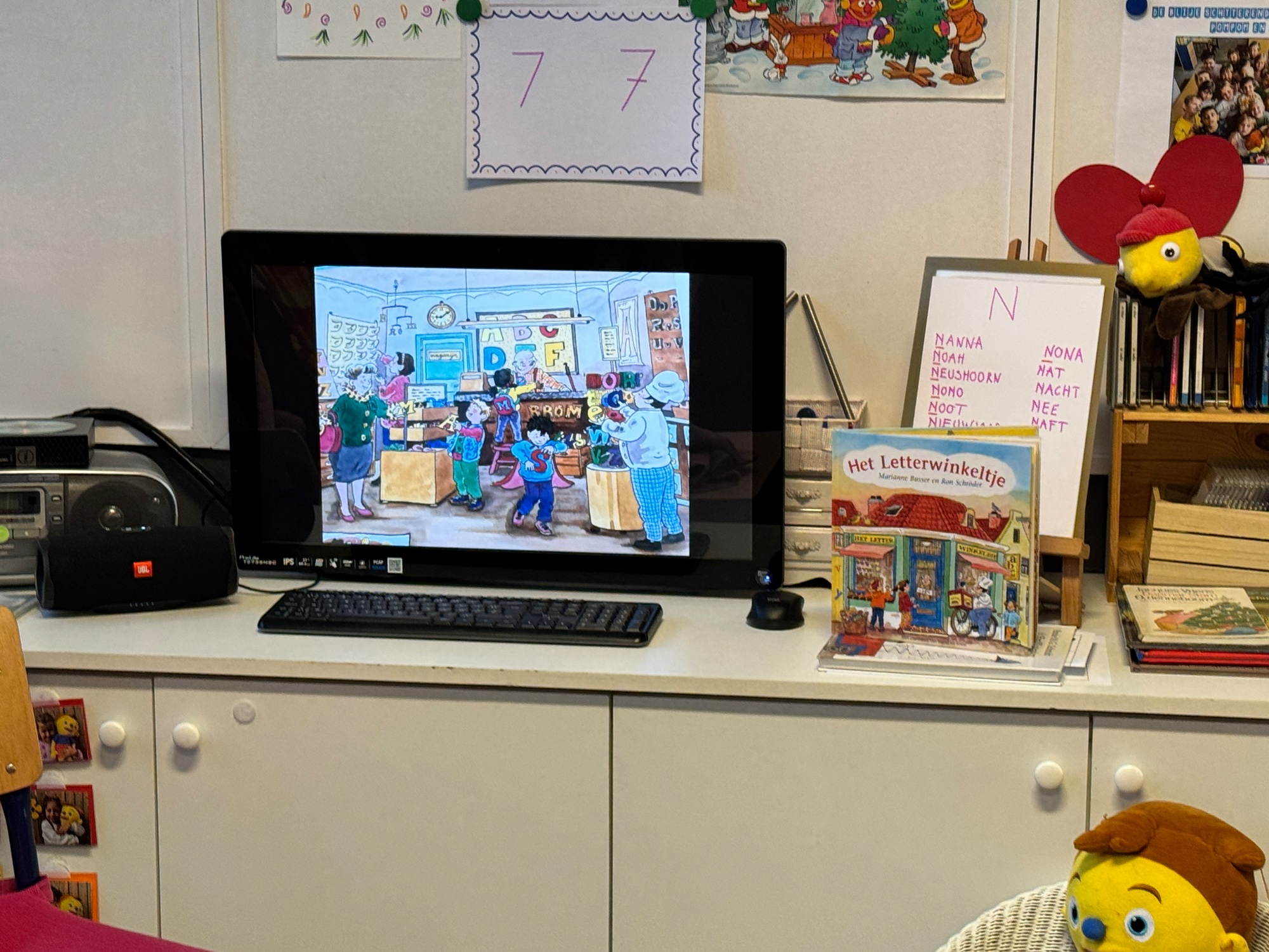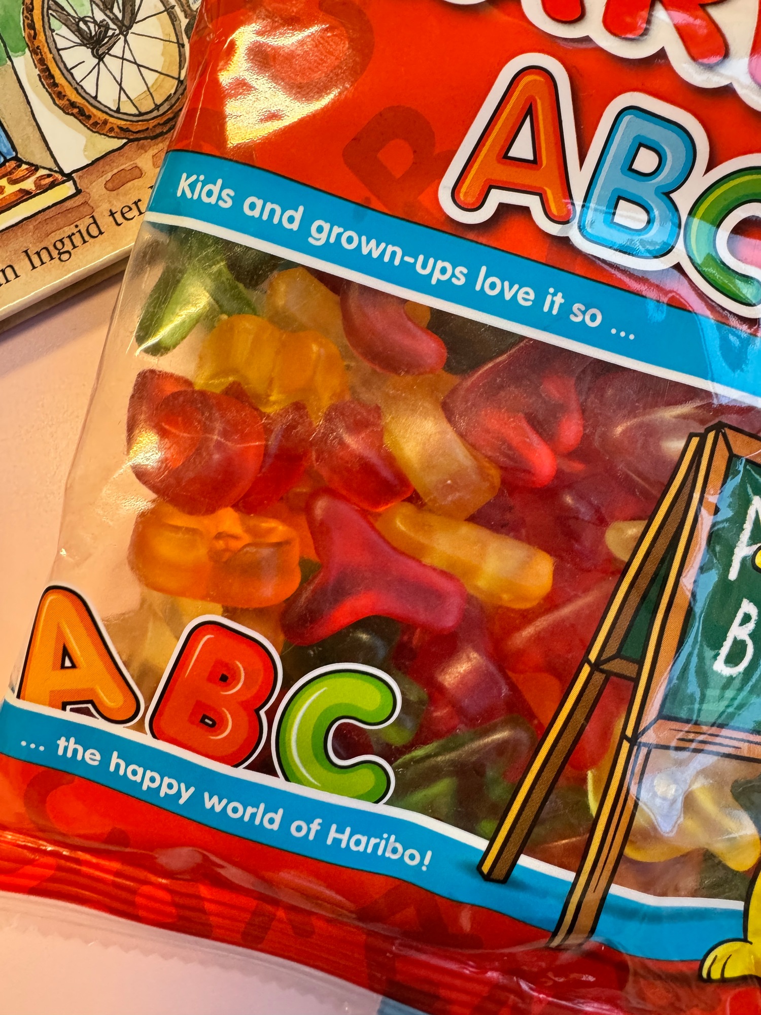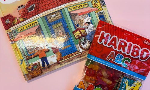 3KC Thema Letters: Opening van het thema door Pompom: Hij bracht een mooi boek en lettersnoepjes mee.