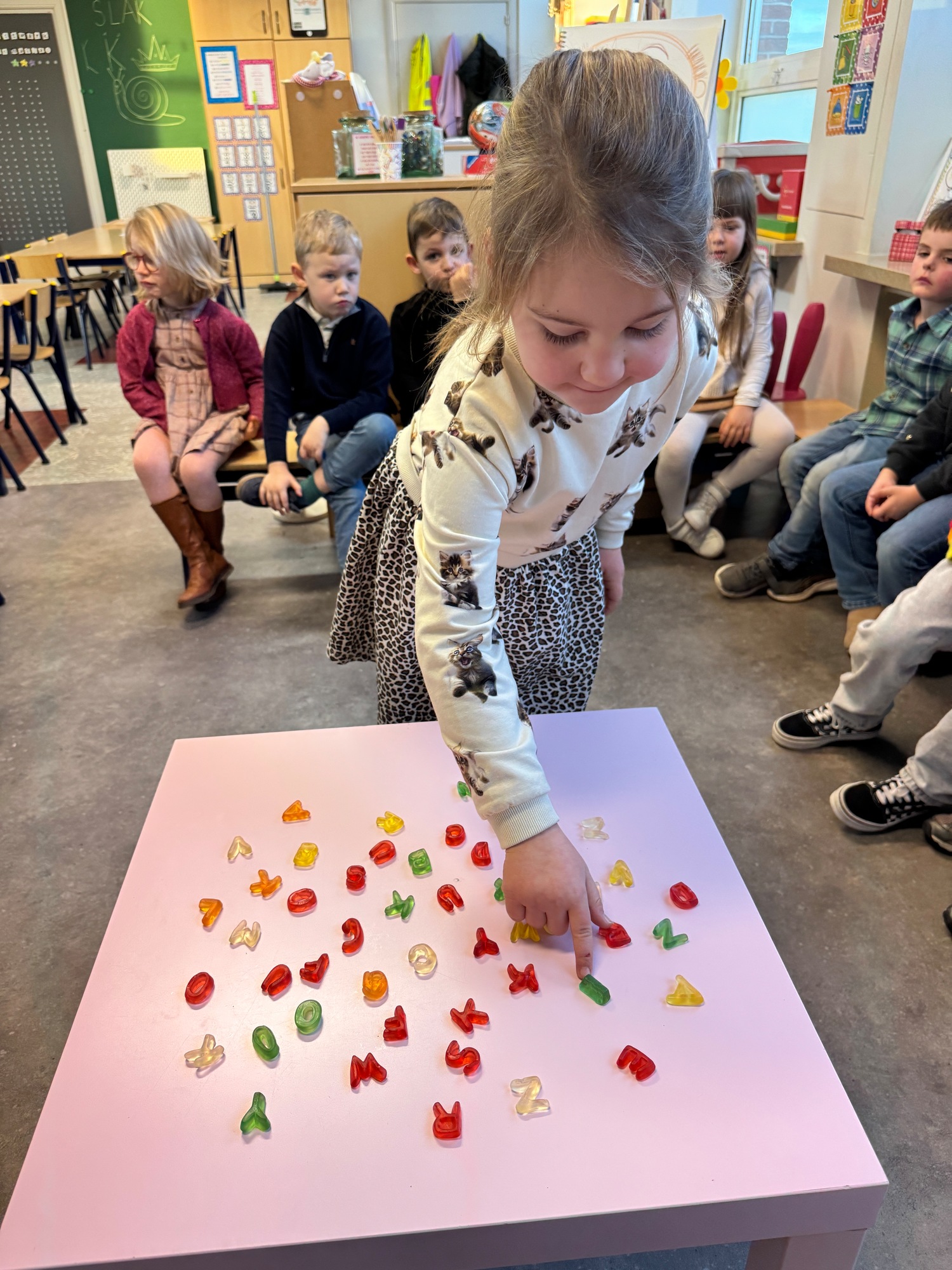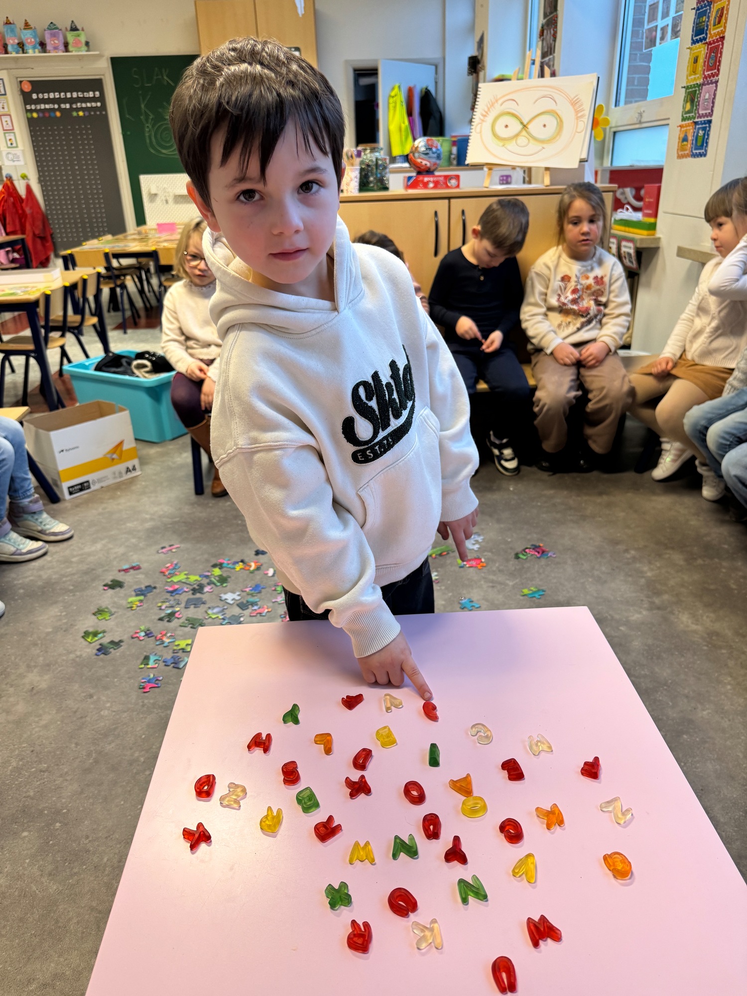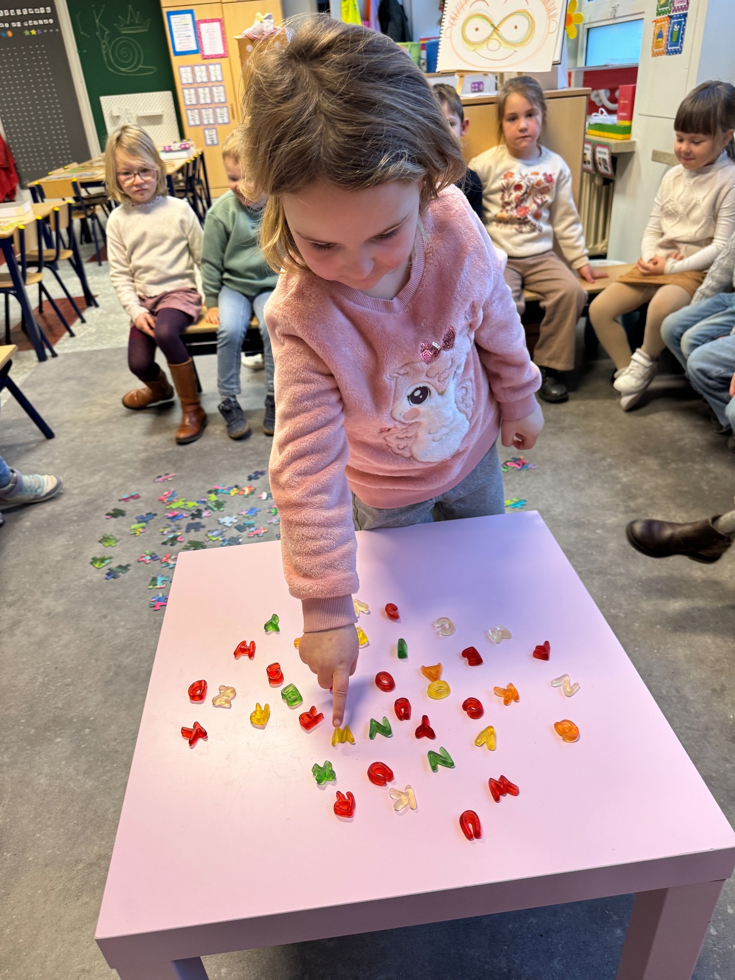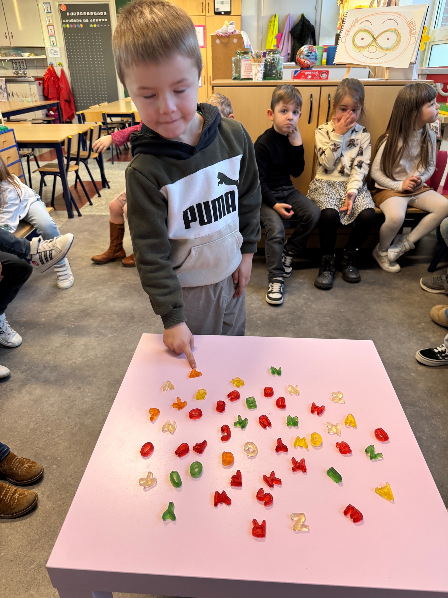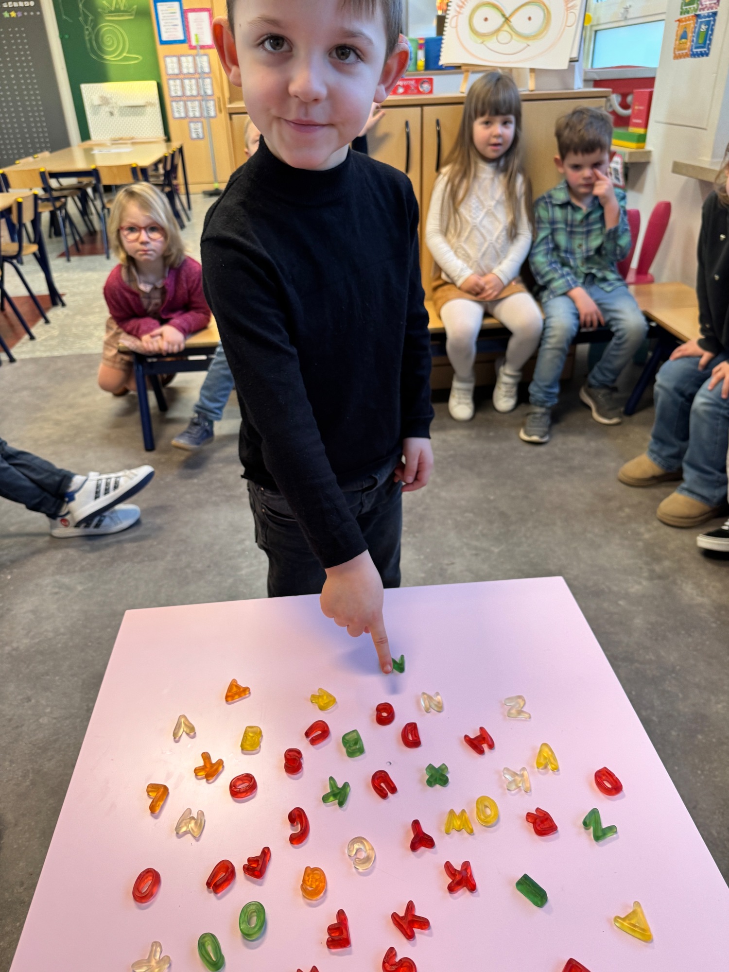 Pompom zat deze morgen niet op zijn stoeltje in onze kring. Hij zat op een andere plaats boven op een grote pak. Wat had hij meegebracht? Wat zat er onder de roze handdoek verstopt? Pompom had een nieuw boekje en een zak met snoepjes mee naar de klas. Het boekje gaat over een heel speciaal winkeltje waar je alleen maar letters kan kopen. In het zakje snoep zaten er lettersnoepjes. Wie kon zijn eerste letter van zijn/haar naam vinden tussen alle snoepjes?