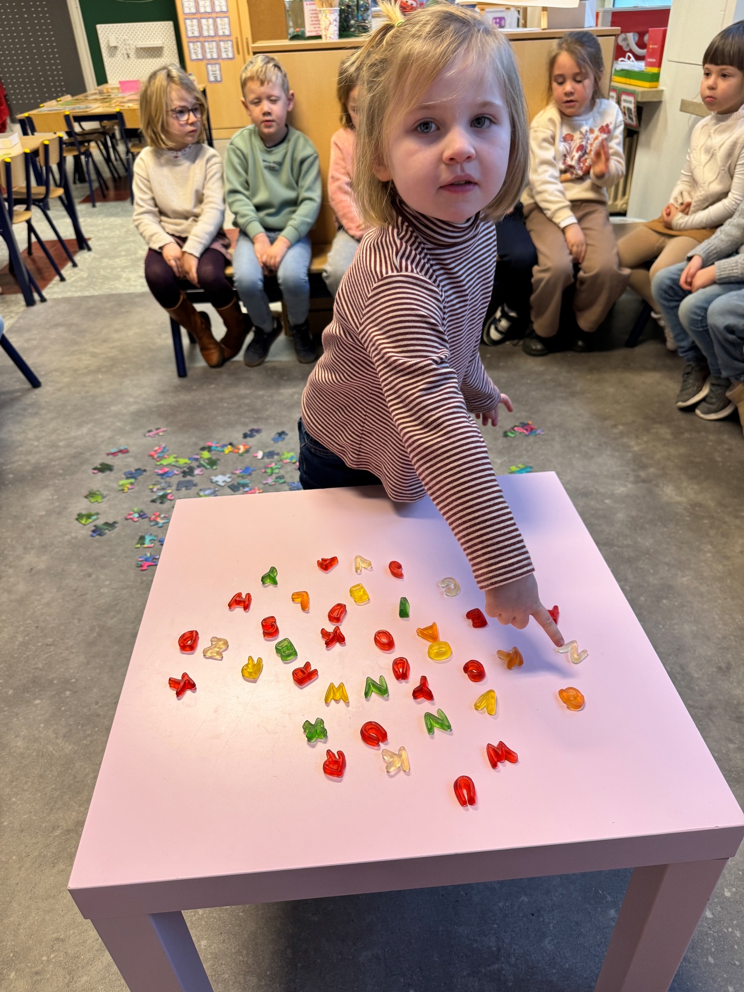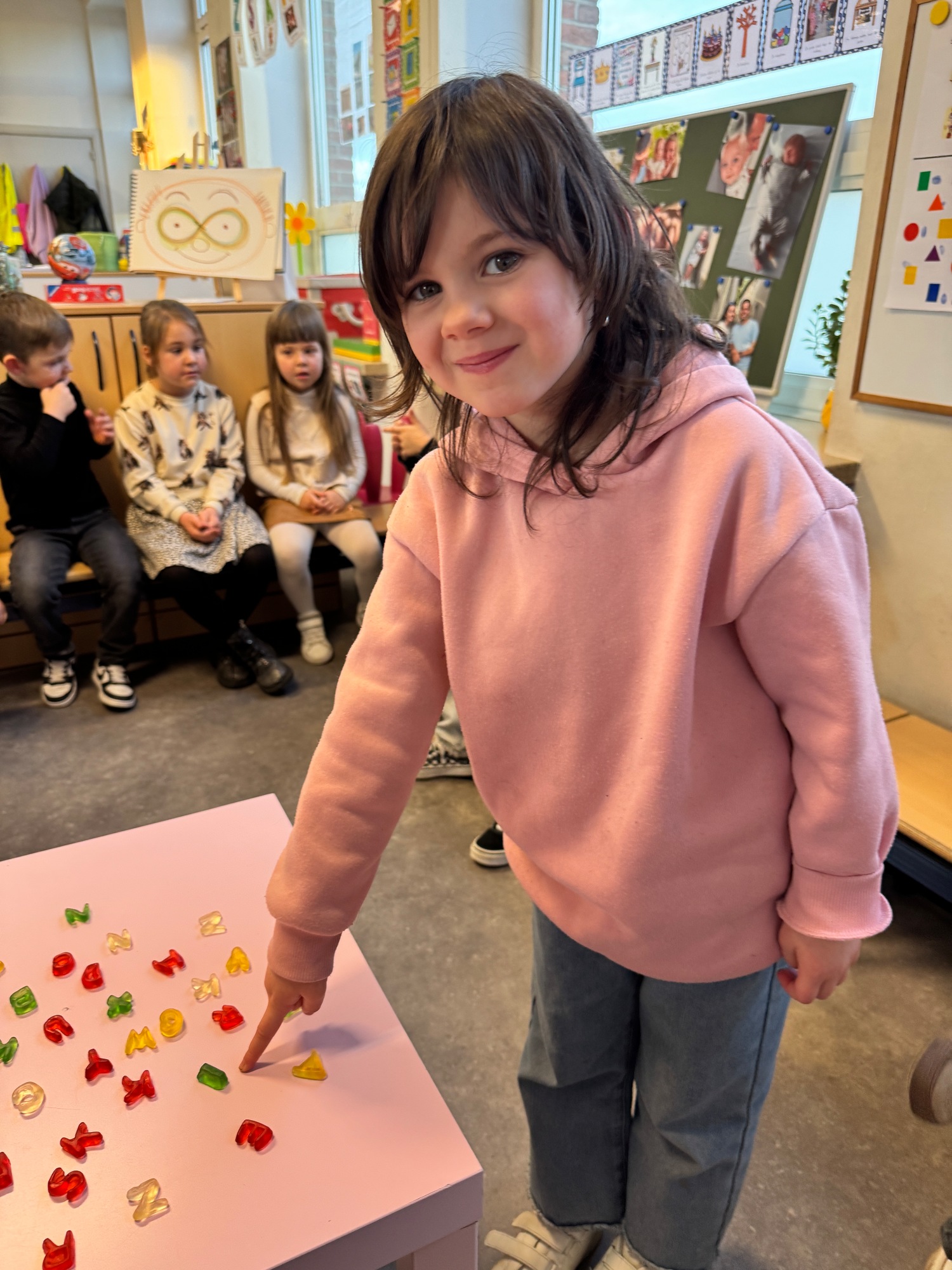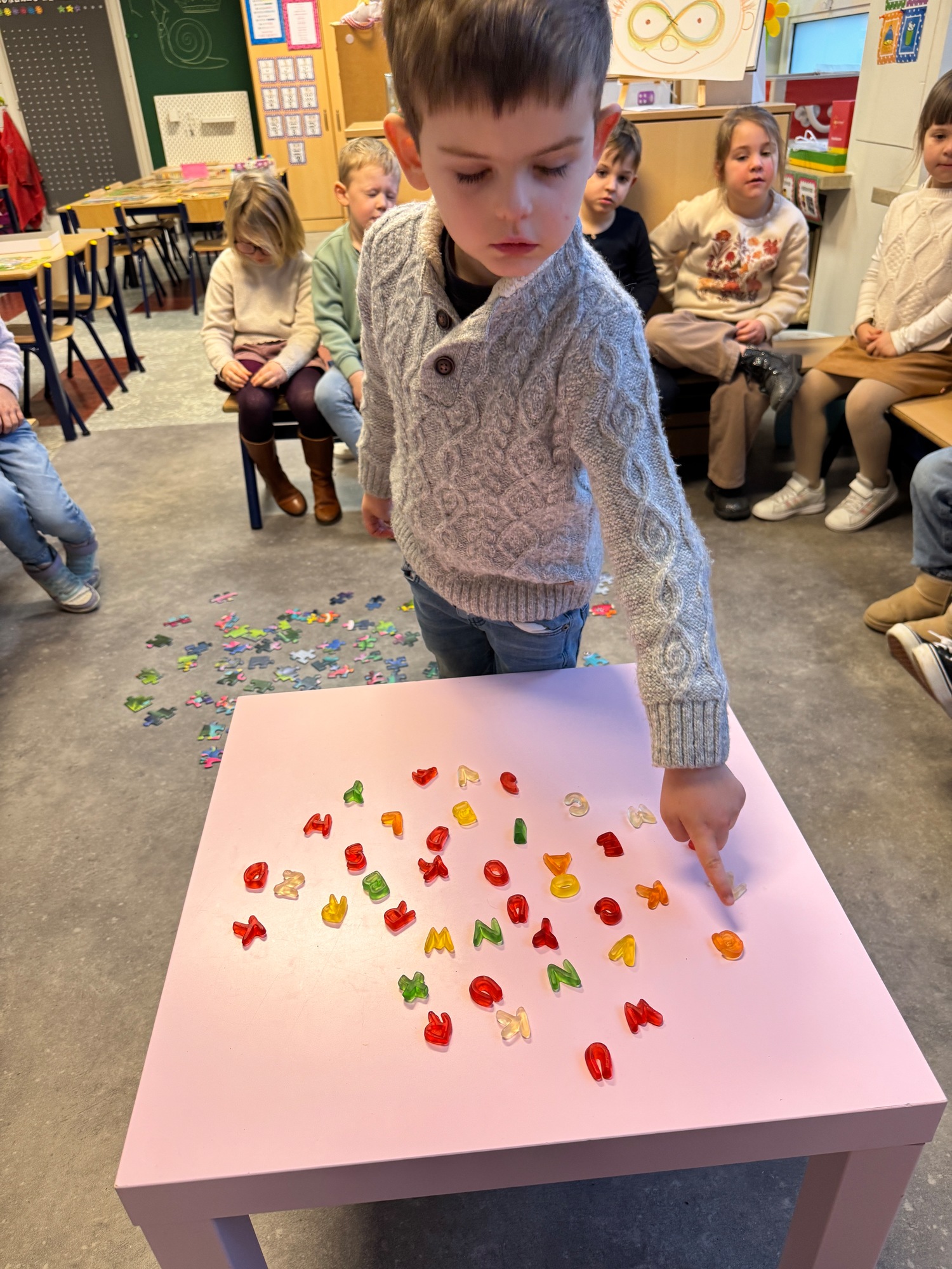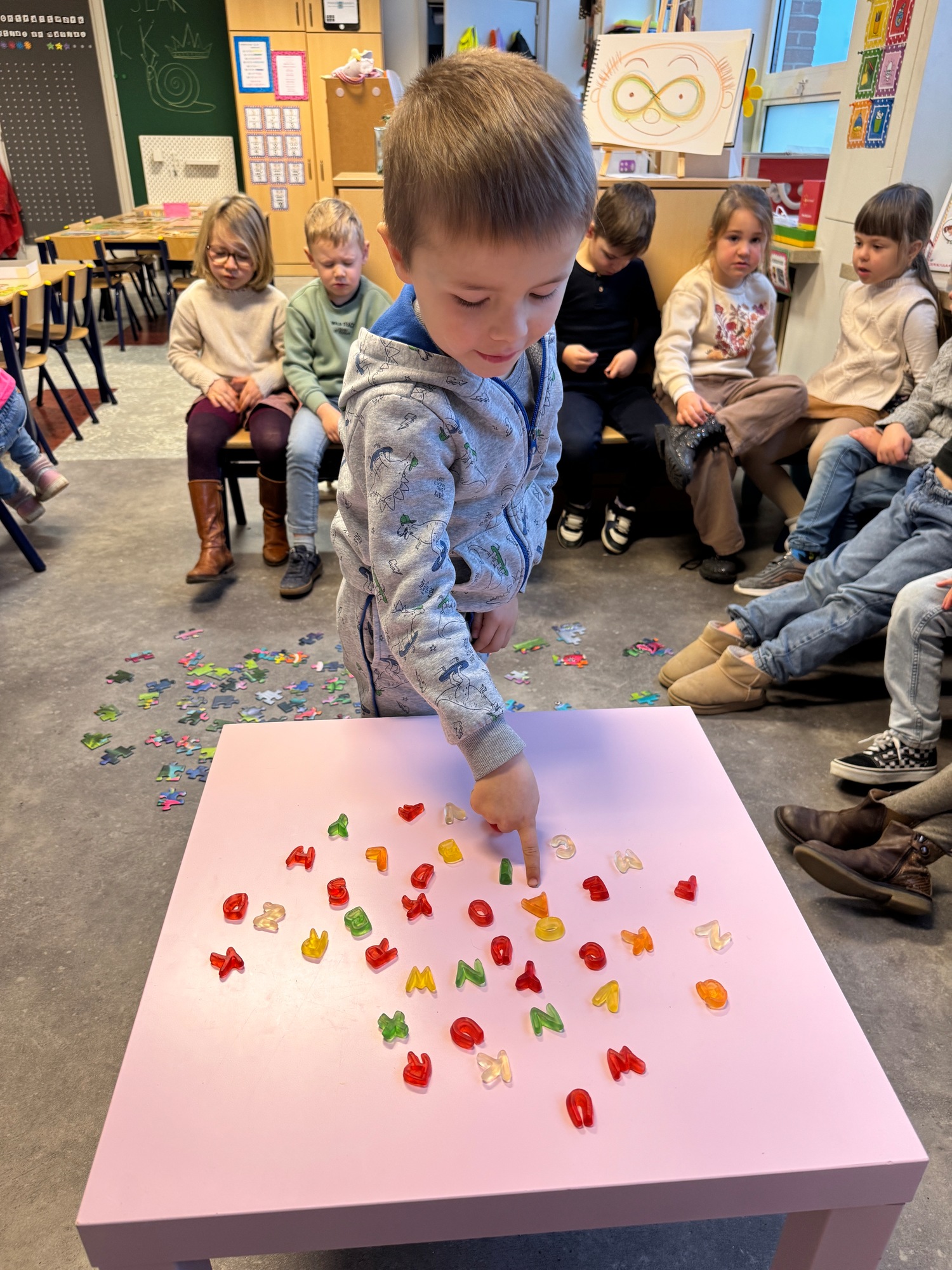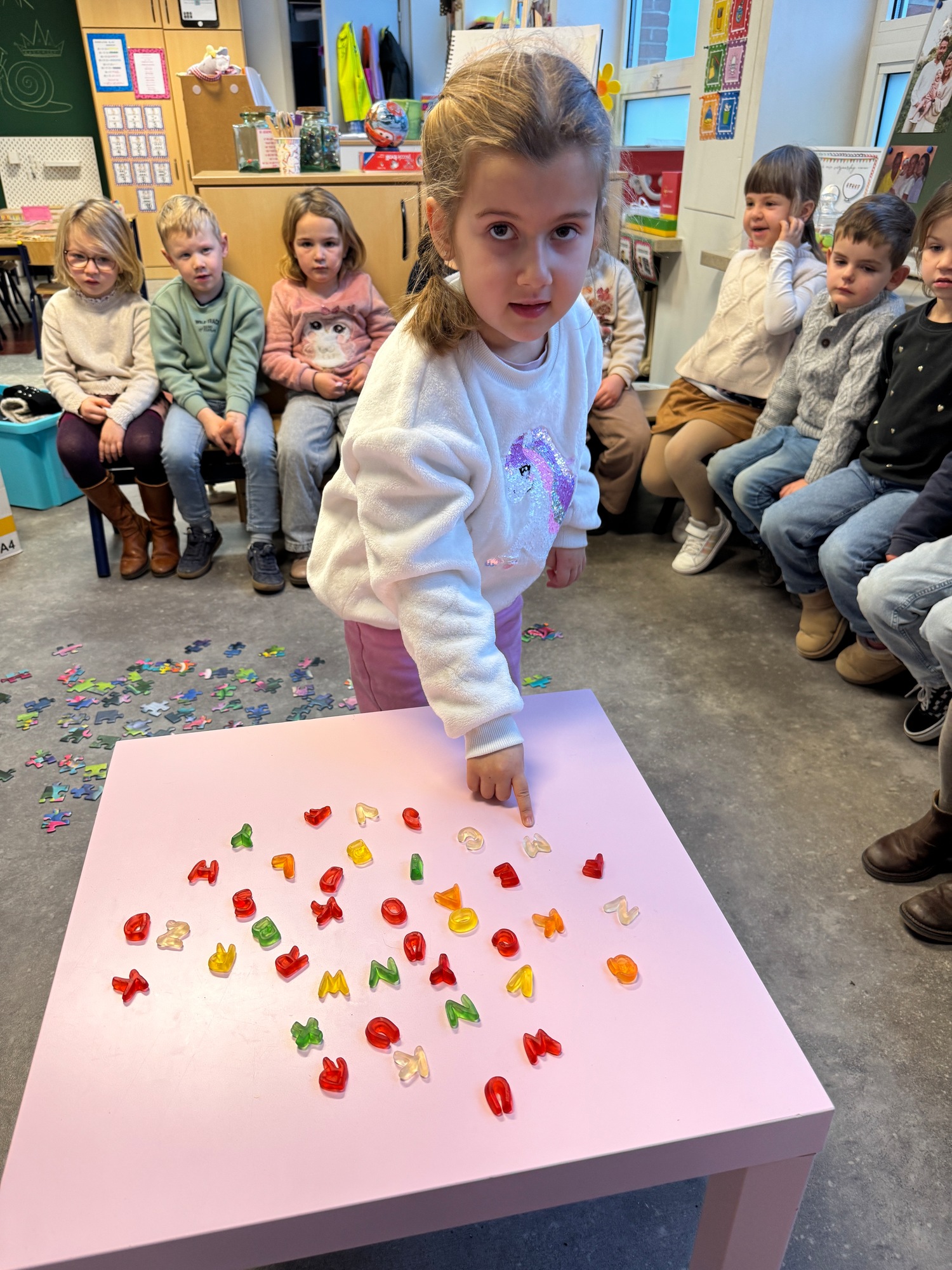 Pompom zat deze morgen niet op zijn stoeltje in onze kring. Hij zat op een andere plaats boven op een grote pak. Wat had hij meegebracht? Wat zat er onder de roze handdoek verstopt? Pompom had een nieuw boekje en een zak met snoepjes mee naar de klas. Het boekje gaat over een heel speciaal winkeltje waar je alleen maar letters kan kopen. In het zakje snoep zaten er lettersnoepjes. Wie kon zijn eerste letter van zijn/haar naam vinden tussen alle snoepjes?