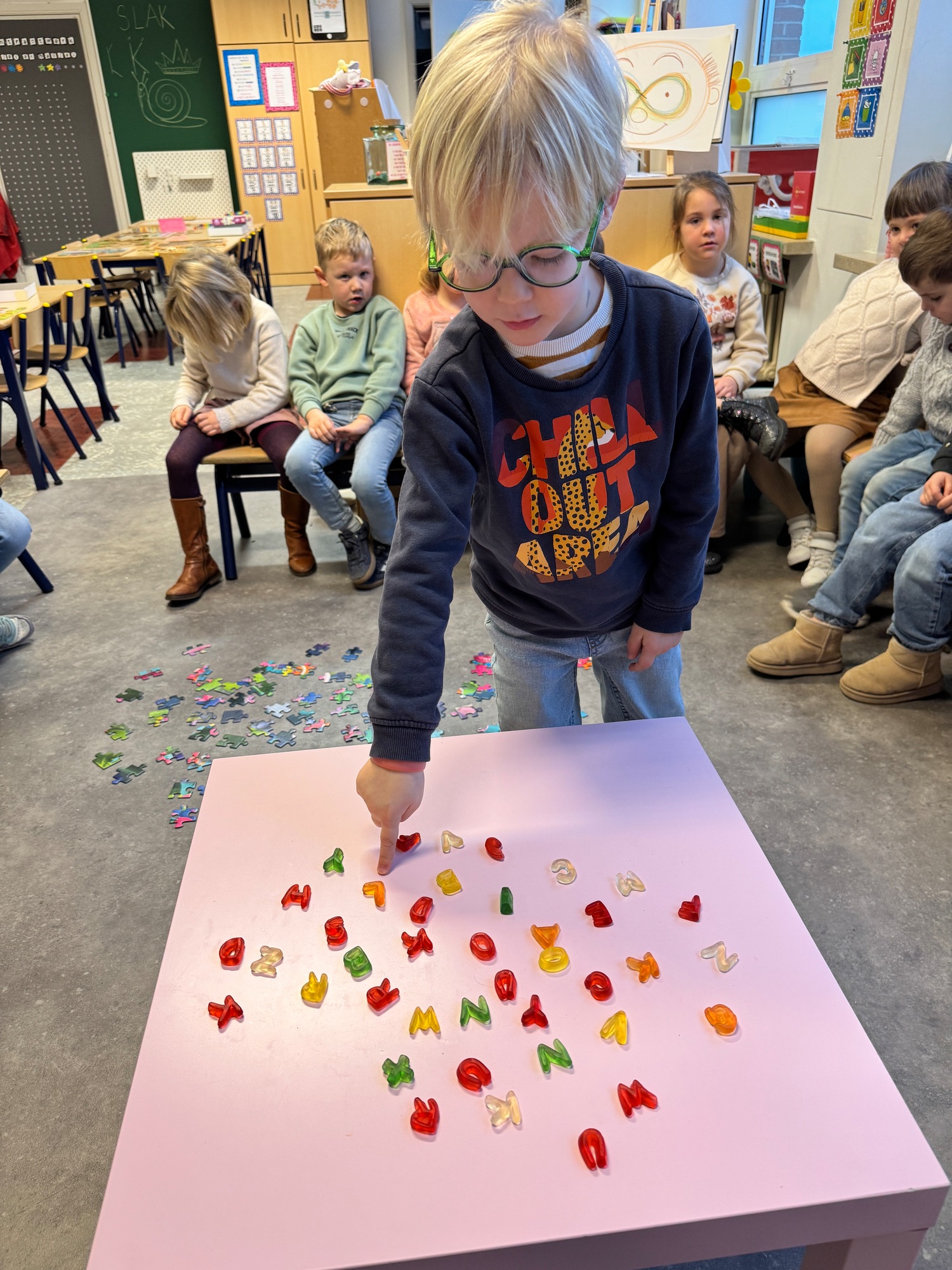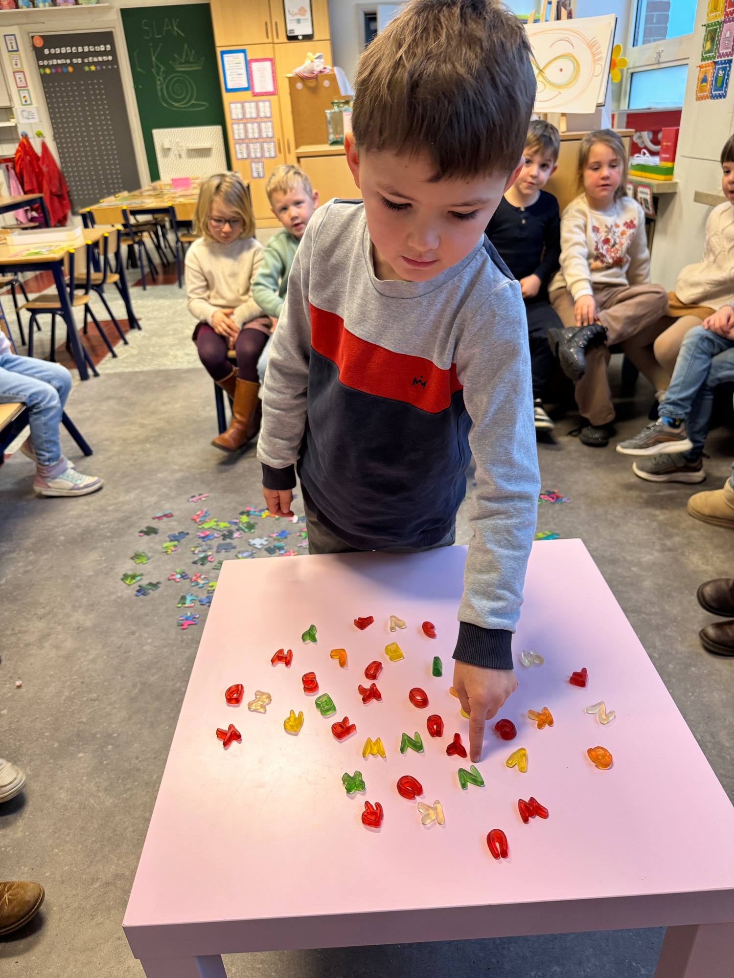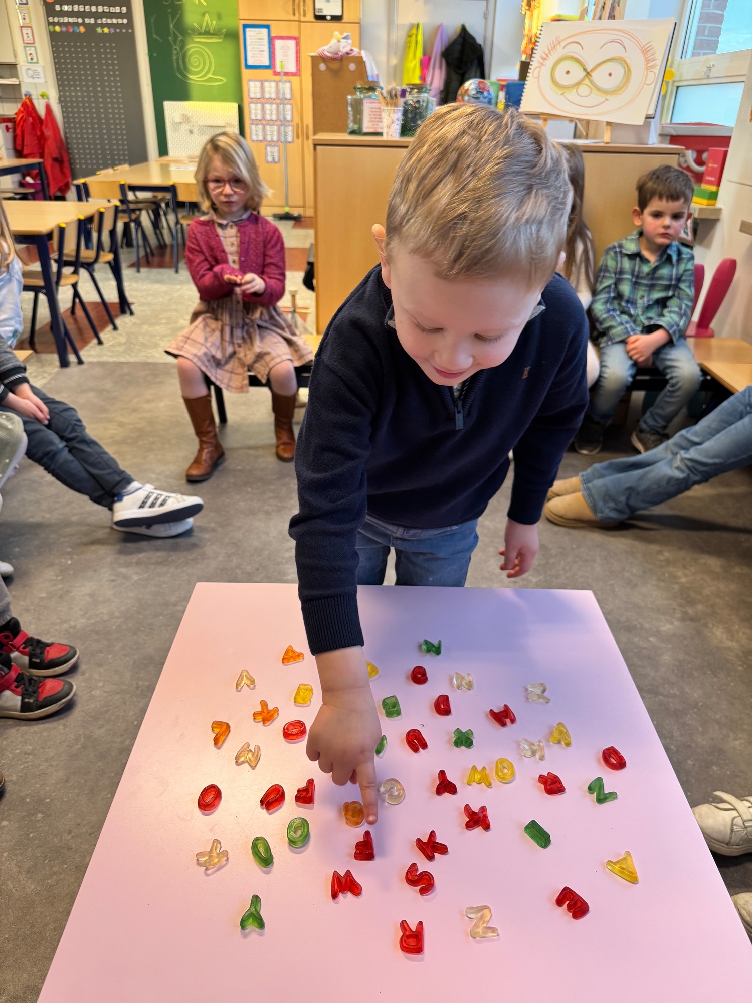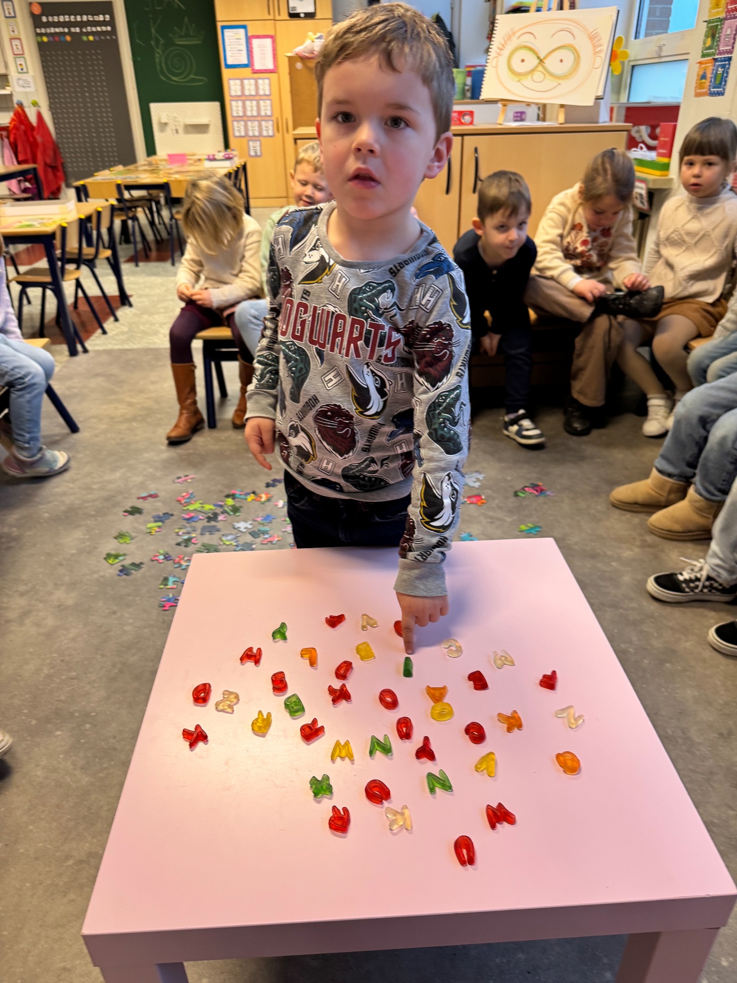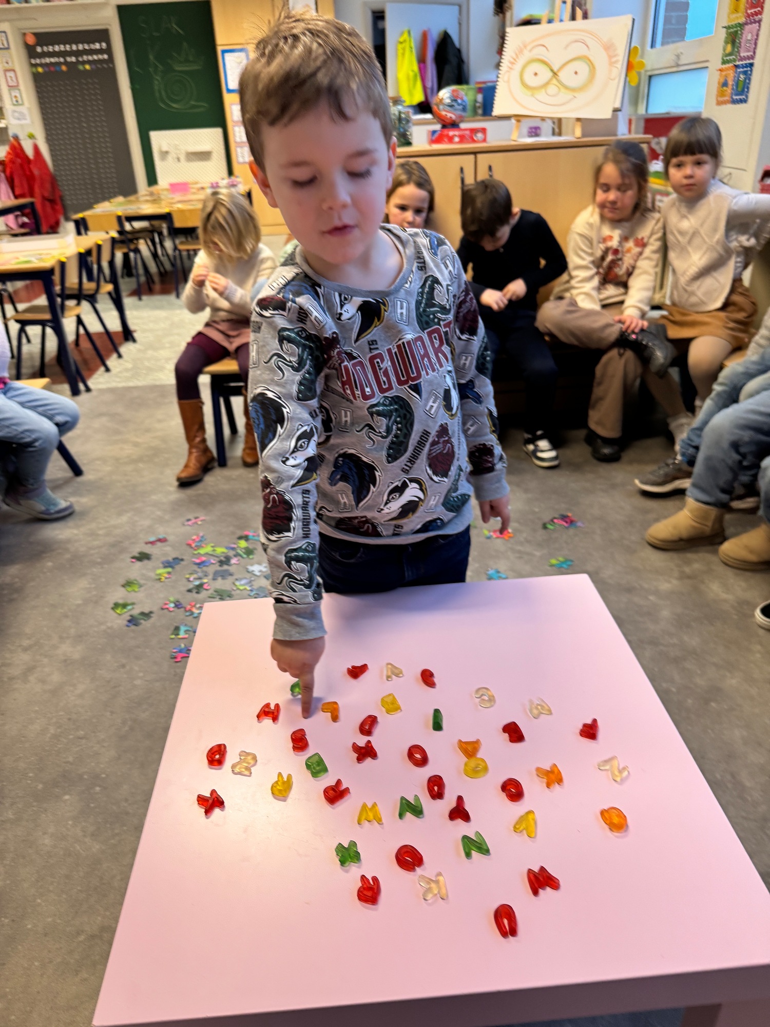 Pompom zat deze morgen niet op zijn stoeltje in onze kring. Hij zat op een andere plaats boven op een grote pak. Wat had hij meegebracht? Wat zat er onder de roze handdoek verstopt? Pompom had een nieuw boekje en een zak met snoepjes mee naar de klas. Het boekje gaat over een heel speciaal winkeltje waar je alleen maar letters kan kopen. In het zakje snoep zaten er lettersnoepjes. Wie kon zijn eerste letter van zijn/haar naam vinden tussen alle snoepjes?