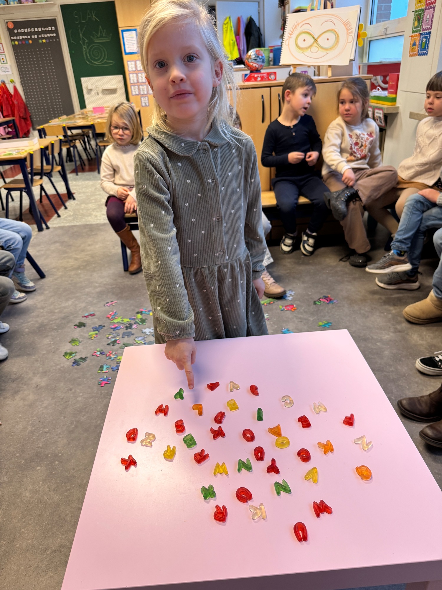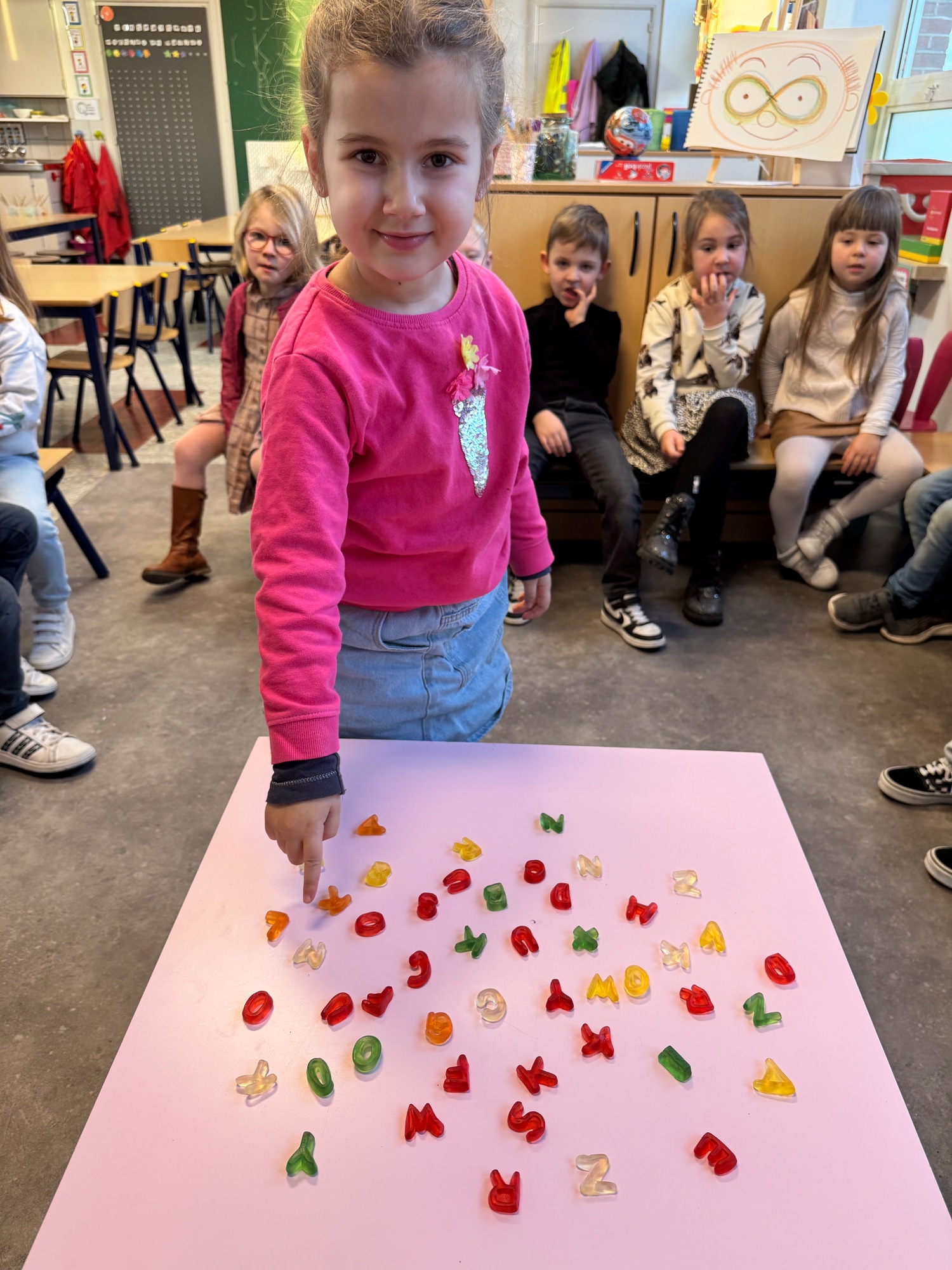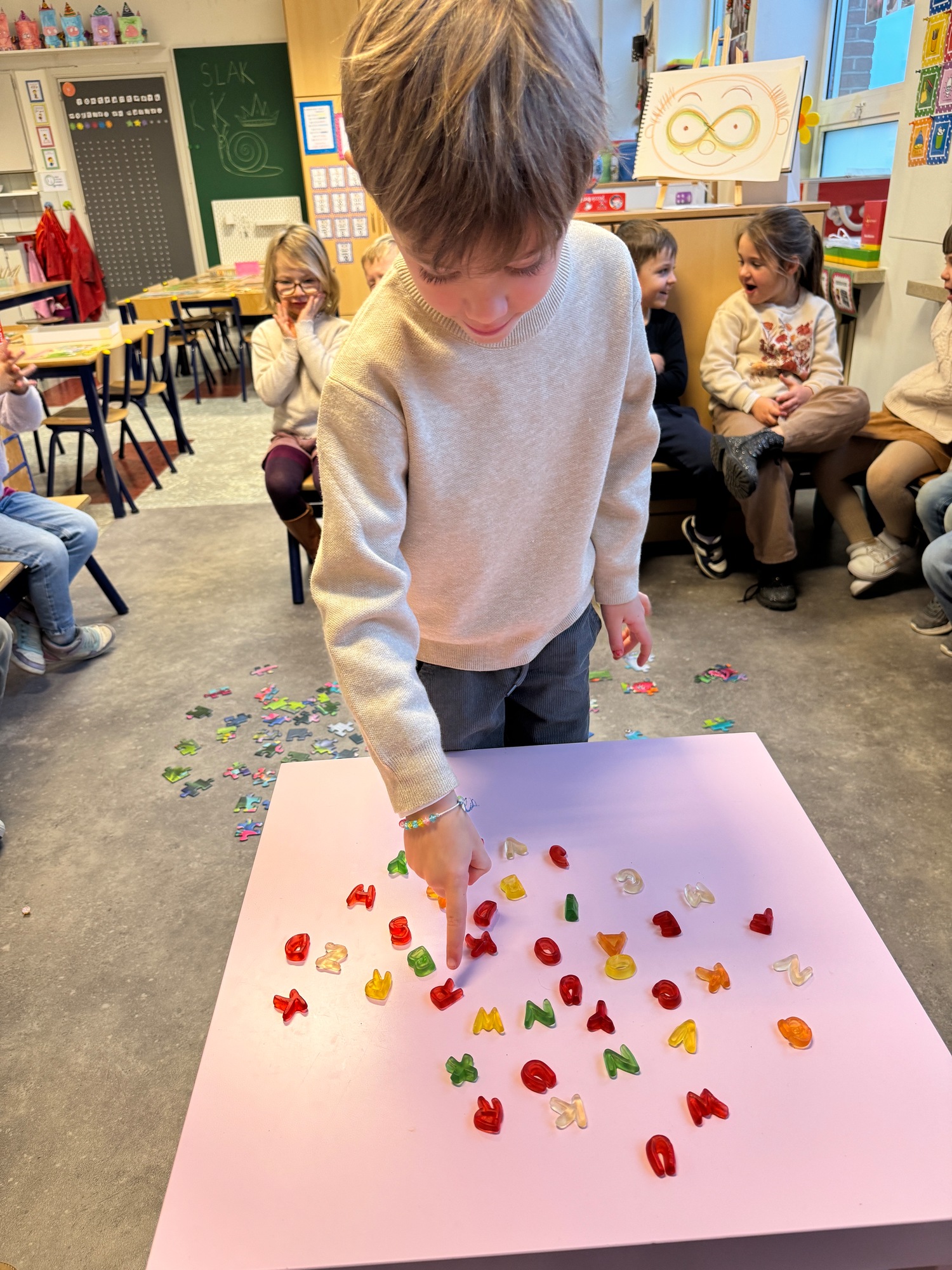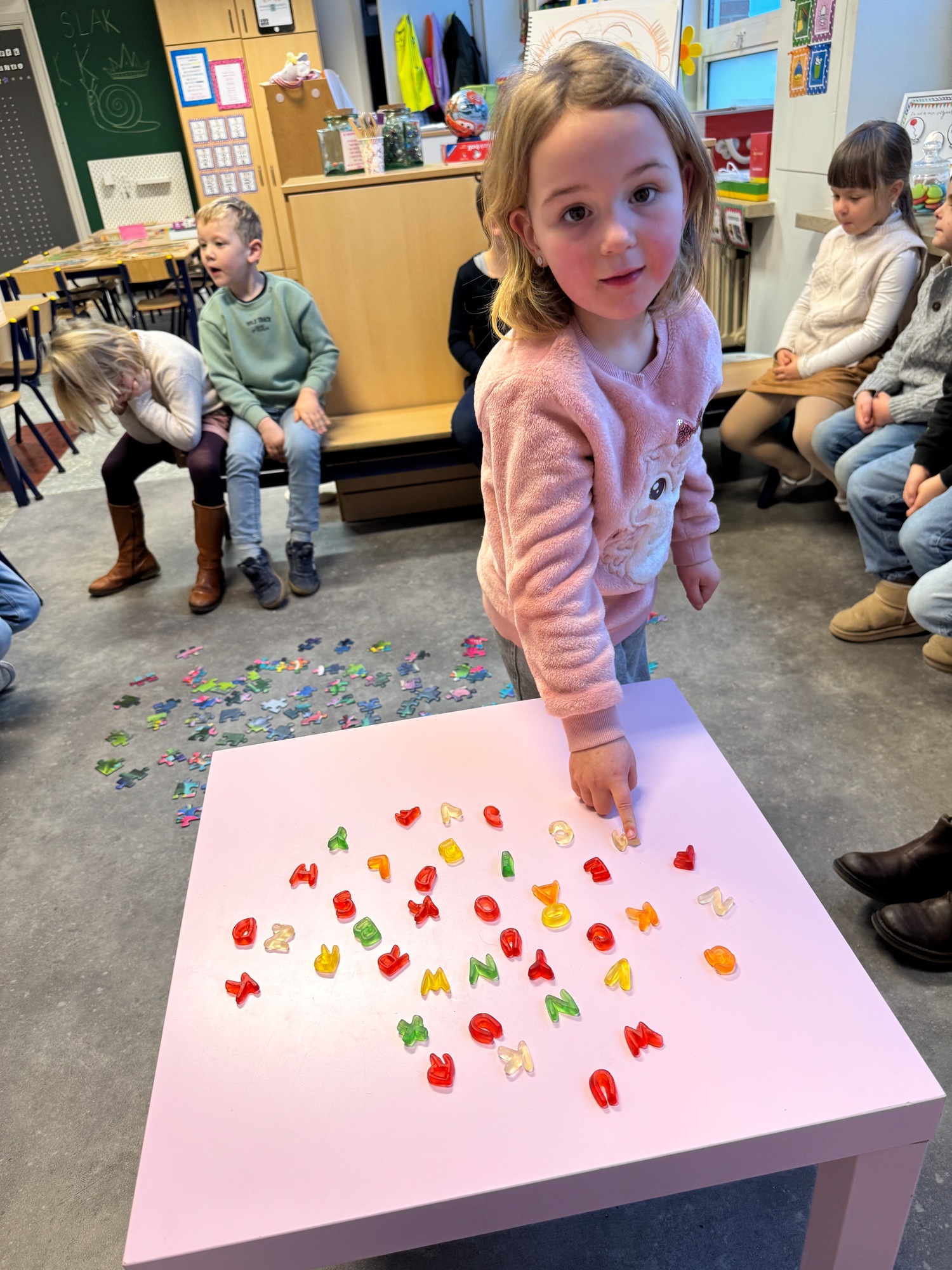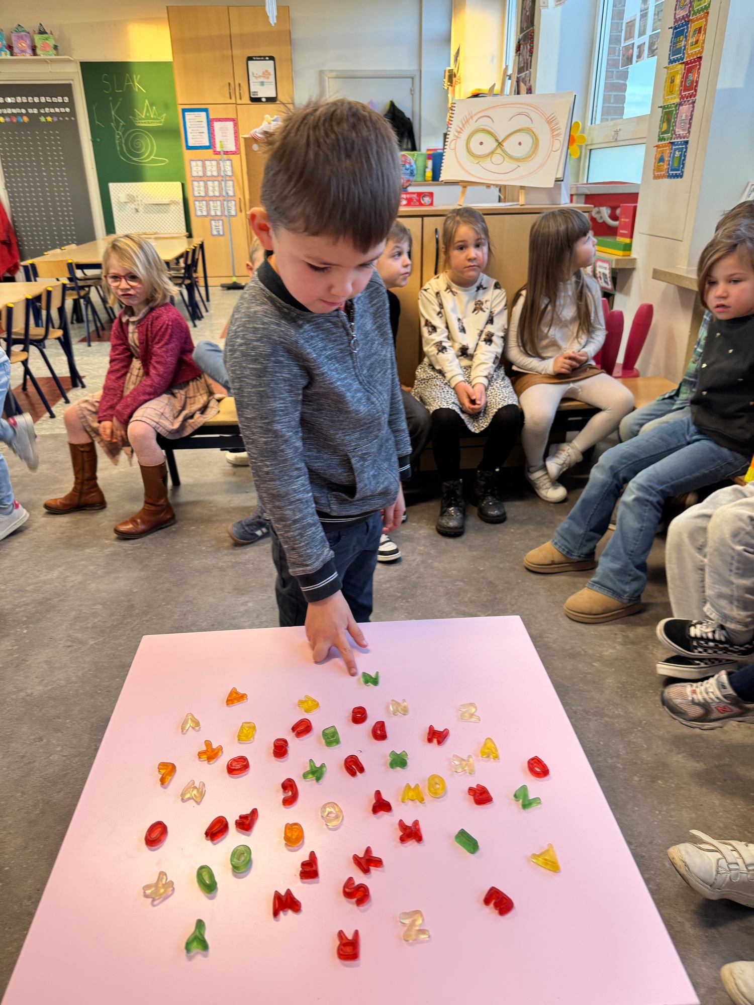 Pompom zat deze morgen niet op zijn stoeltje in onze kring. Hij zat op een andere plaats boven op een grote pak. Wat had hij meegebracht? Wat zat er onder de roze handdoek verstopt? Pompom had een nieuw boekje en een zak met snoepjes mee naar de klas. Het boekje gaat over een heel speciaal winkeltje waar je alleen maar letters kan kopen. In het zakje snoep zaten er lettersnoepjes. Wie kon zijn eerste letter van zijn/haar naam vinden tussen alle snoepjes?