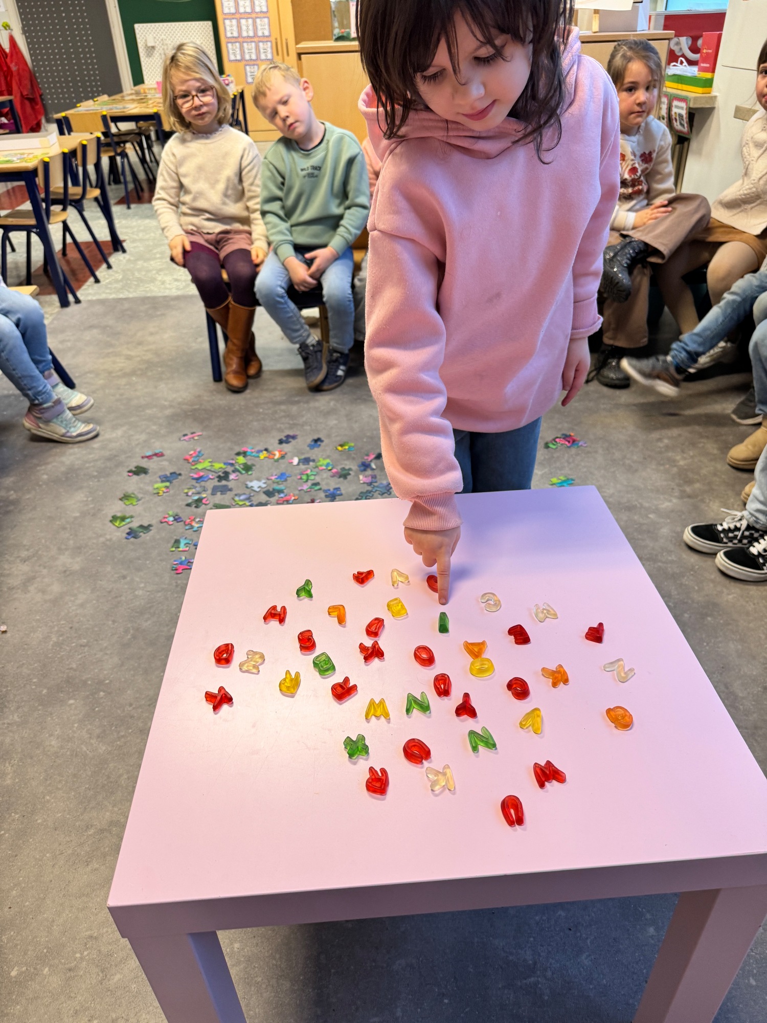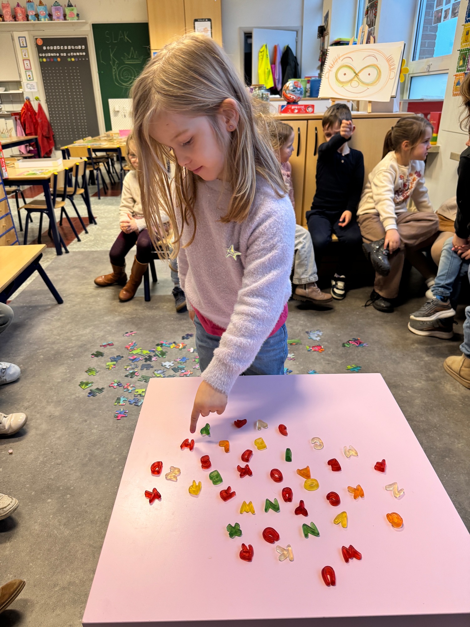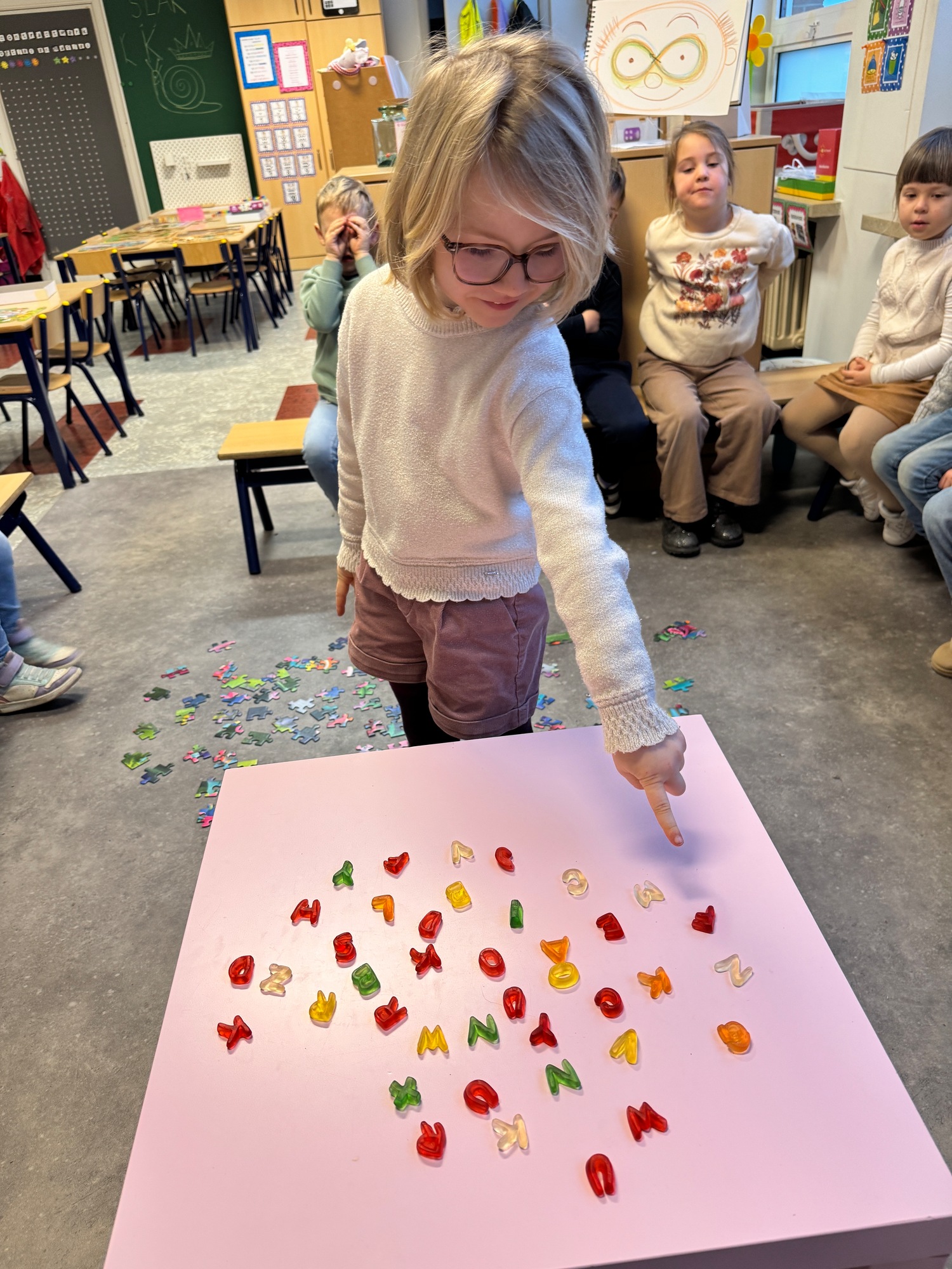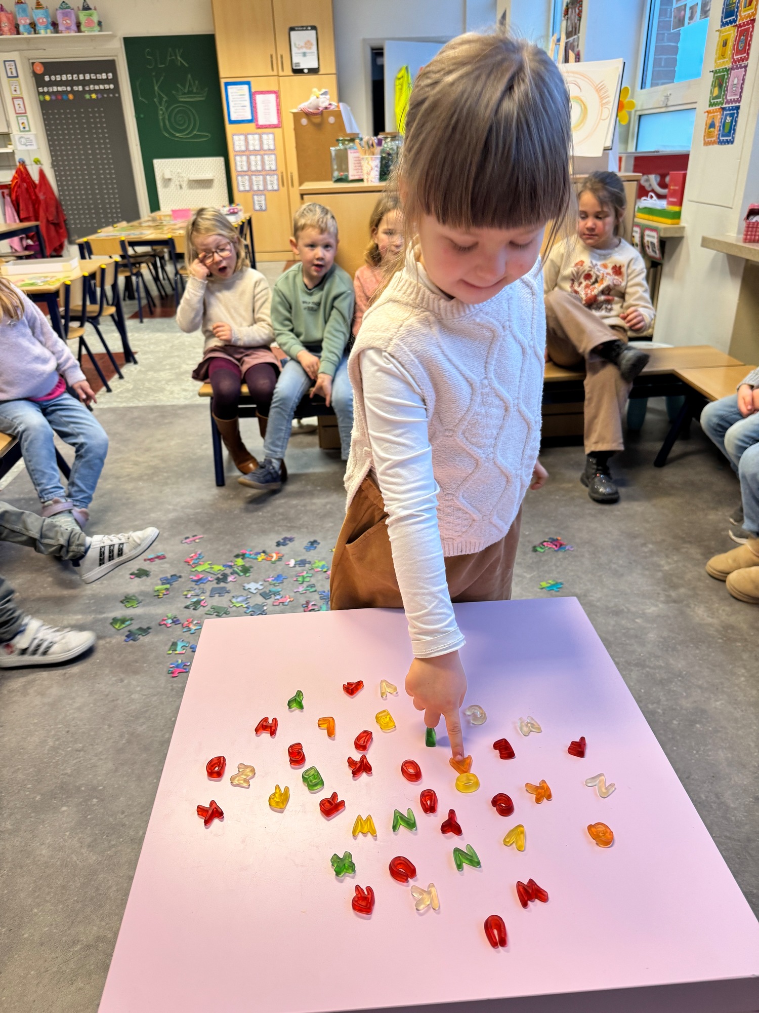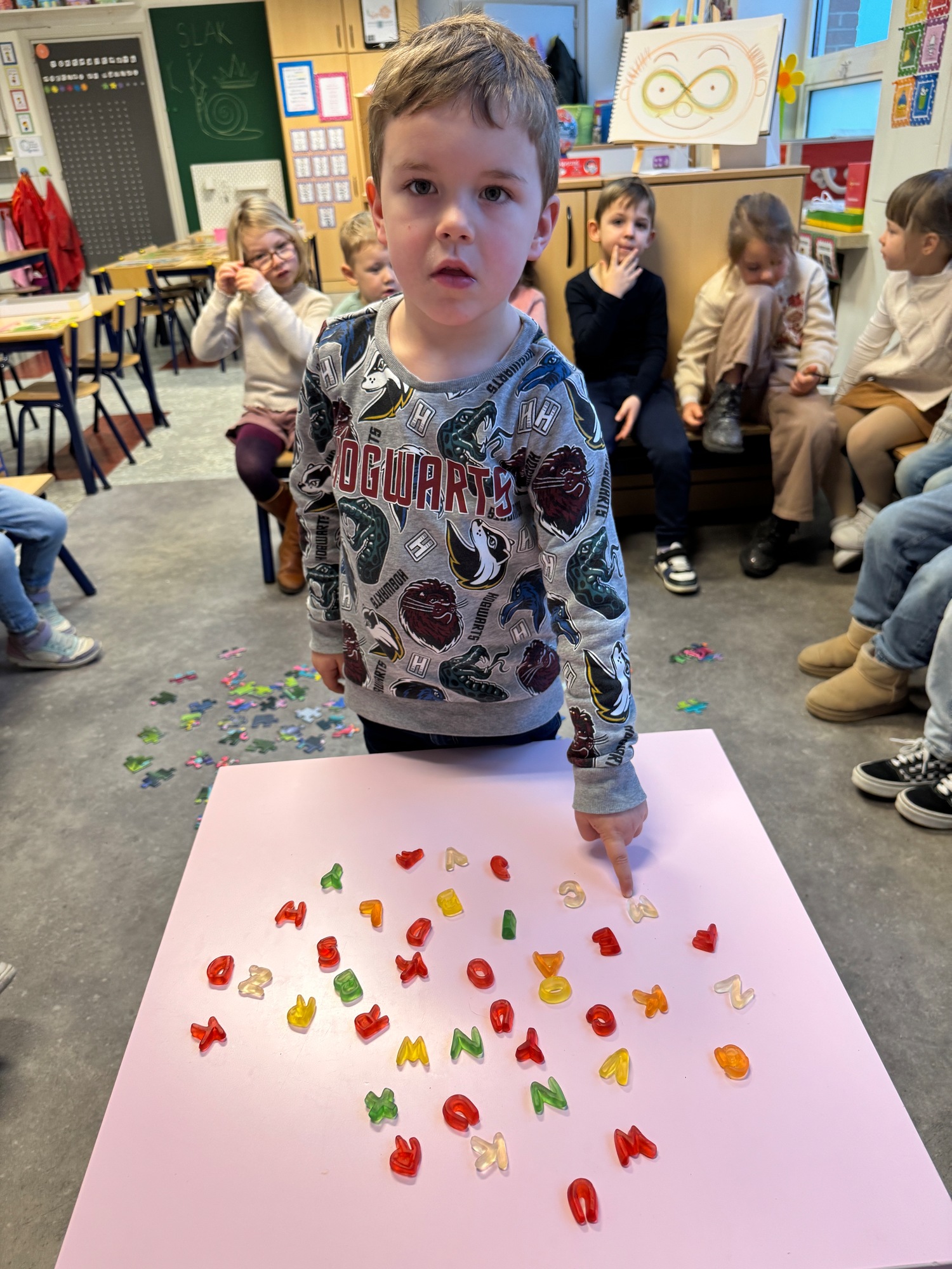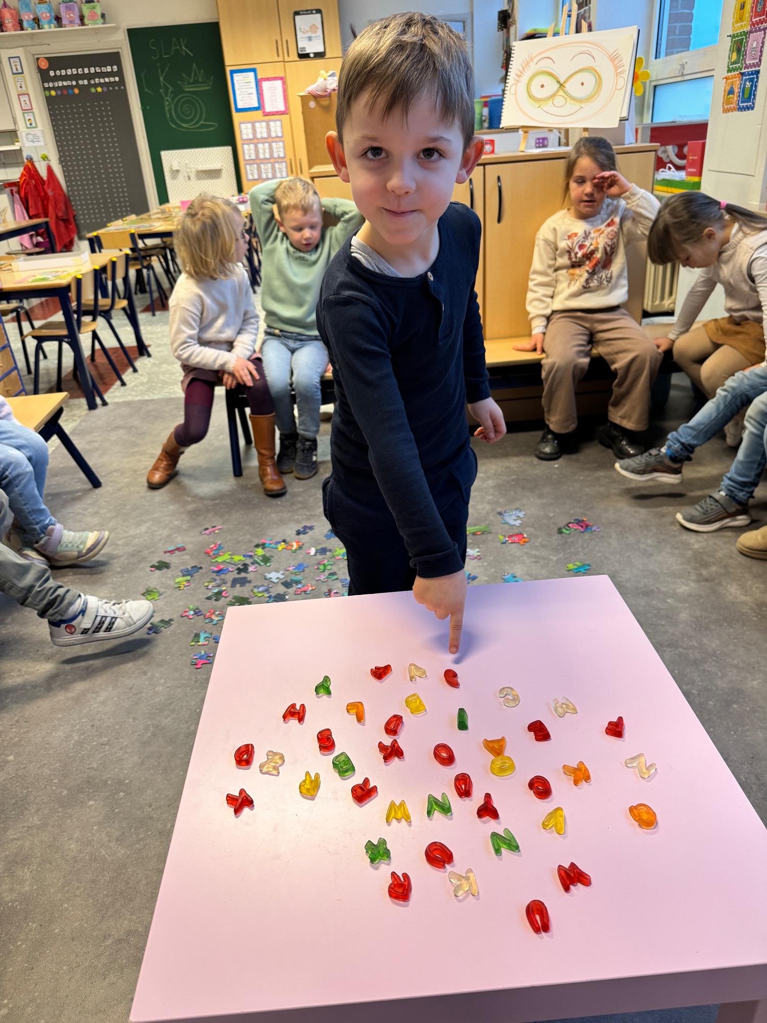 Pompom zat deze morgen niet op zijn stoeltje in onze kring. Hij zat op een andere plaats boven op een grote pak. Wat had hij meegebracht? Wat zat er onder de roze handdoek verstopt? Pompom had een nieuw boekje en een zak met snoepjes mee naar de klas. Het boekje gaat over een heel speciaal winkeltje waar je alleen maar letters kan kopen. In het zakje snoep zaten er lettersnoepjes. Wie kon zijn eerste letter van zijn/haar naam vinden tussen alle snoepjes?