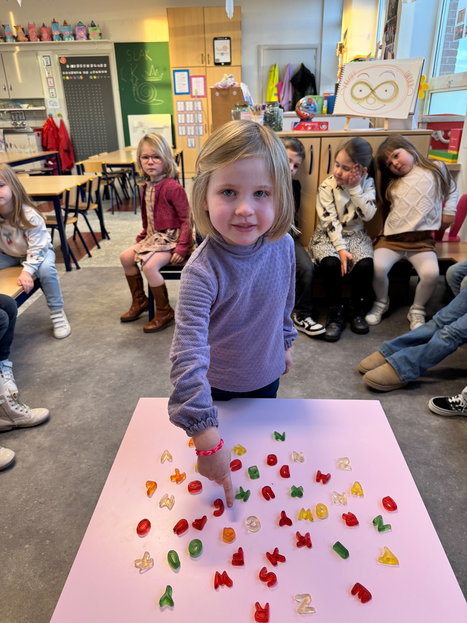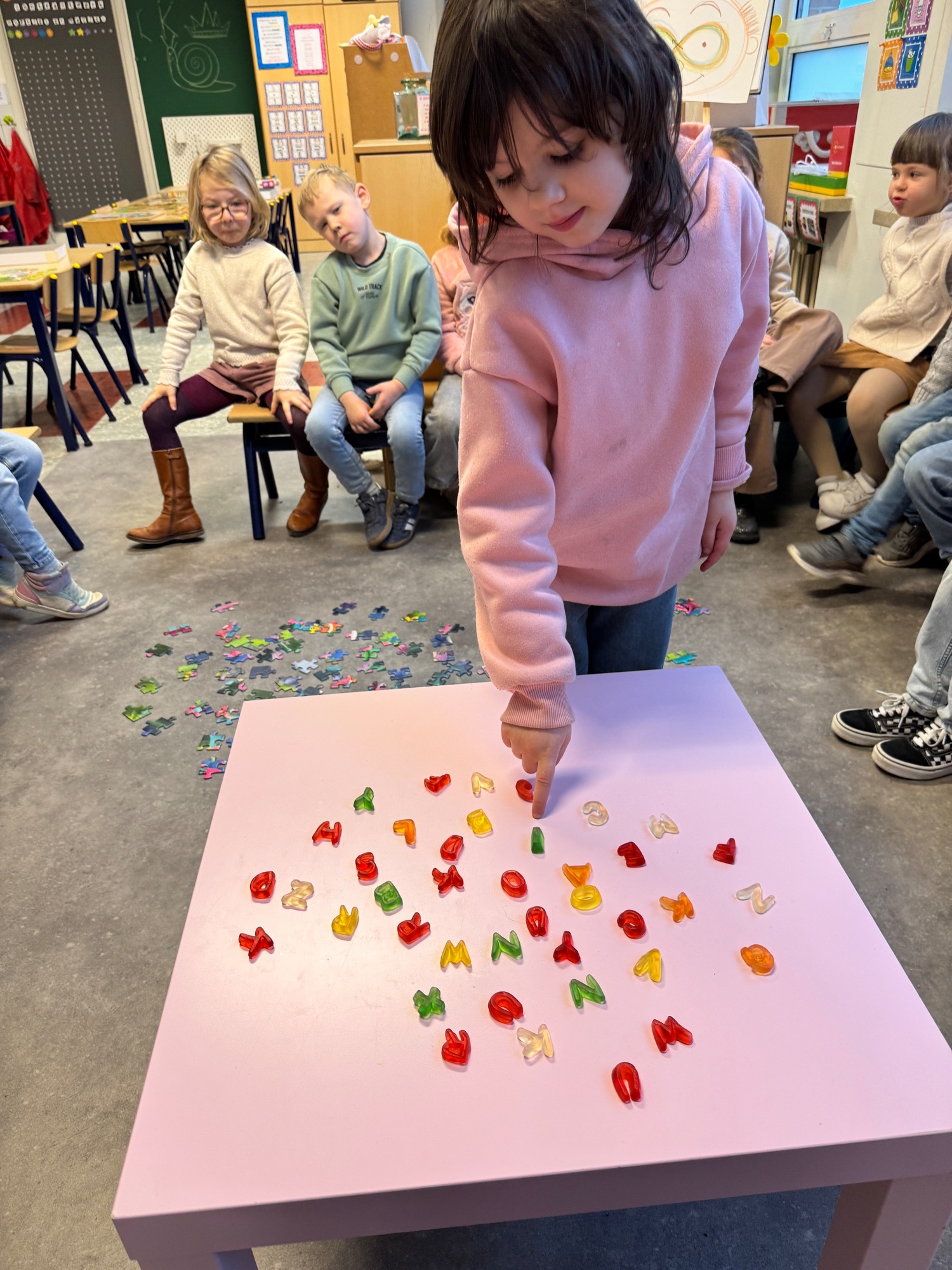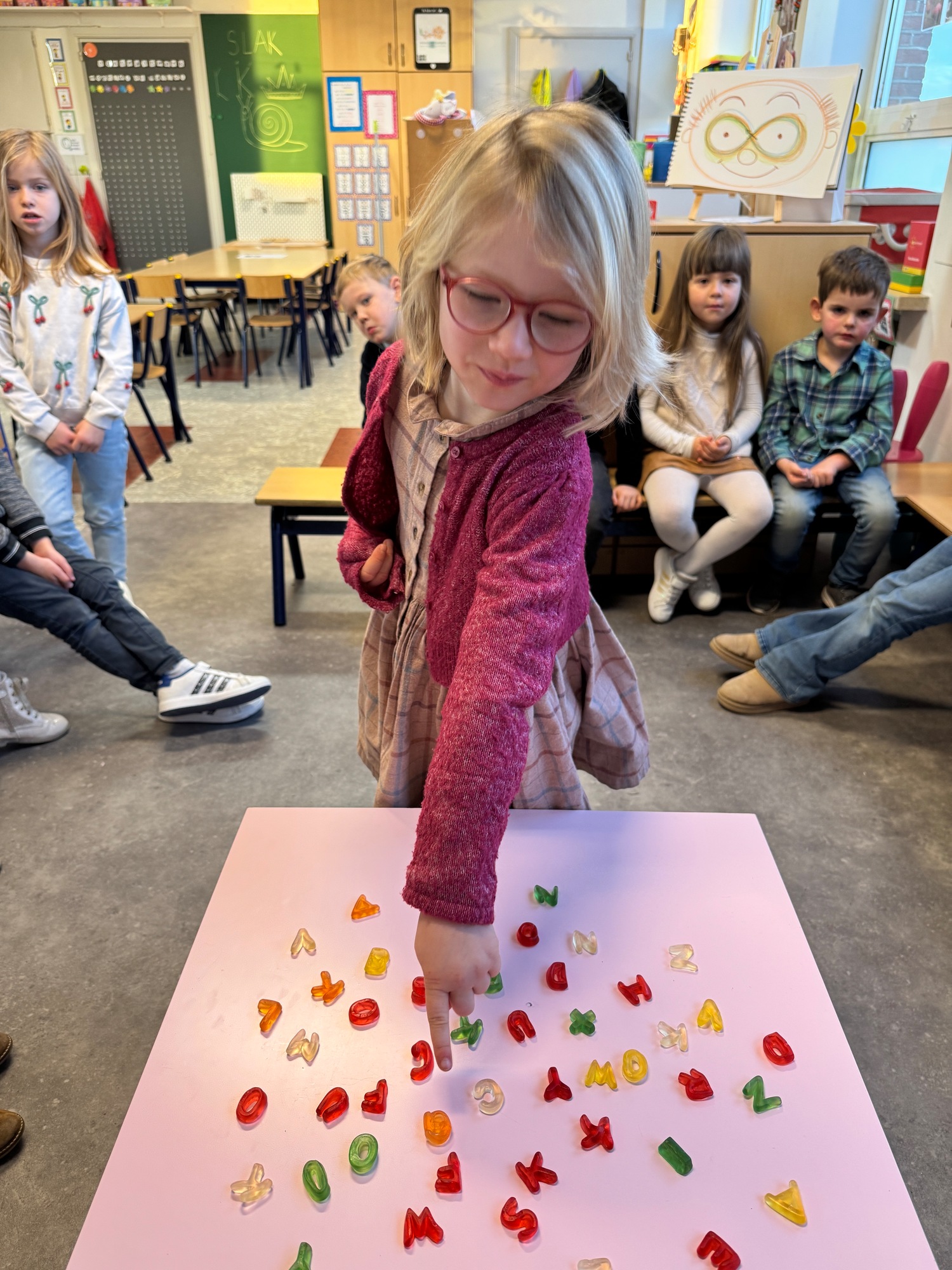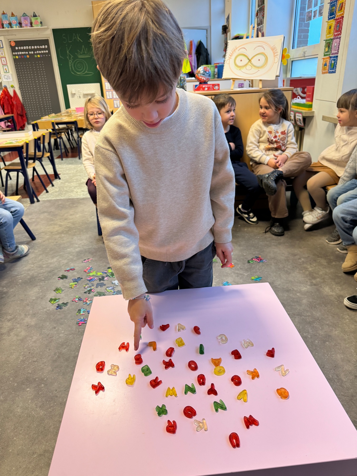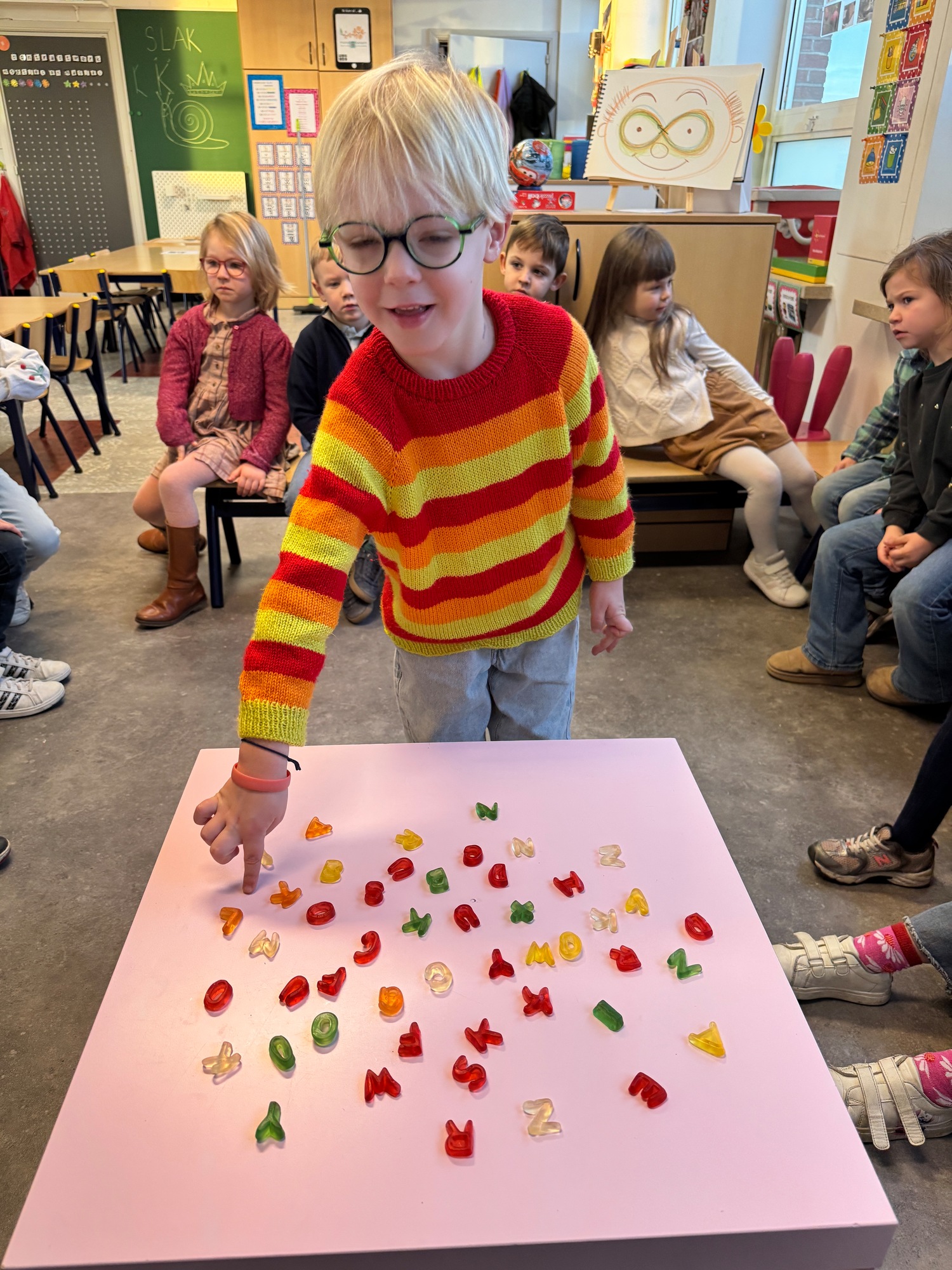 Pompom zat deze morgen niet op zijn stoeltje in onze kring. Hij zat op een andere plaats boven op een grote pak. Wat had hij meegebracht? Wat zat er onder de roze handdoek verstopt? Pompom had een nieuw boekje en een zak met snoepjes mee naar de klas. Het boekje gaat over een heel speciaal winkeltje waar je alleen maar letters kan kopen. In het zakje snoep zaten er lettersnoepjes. Wie kon zijn eerste letter van zijn/haar naam vinden tussen alle snoepjes?