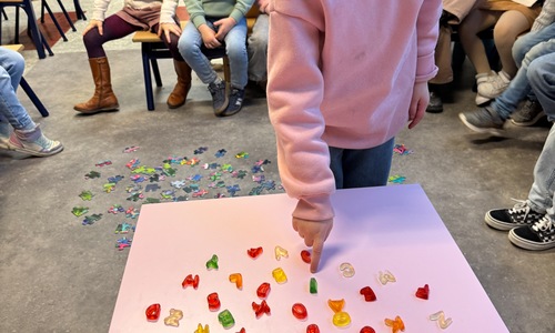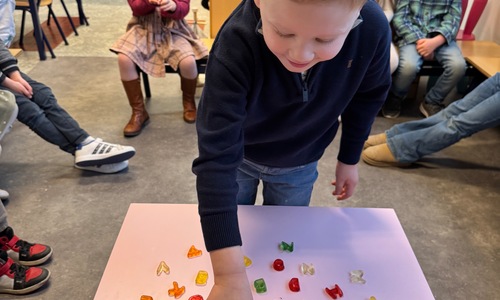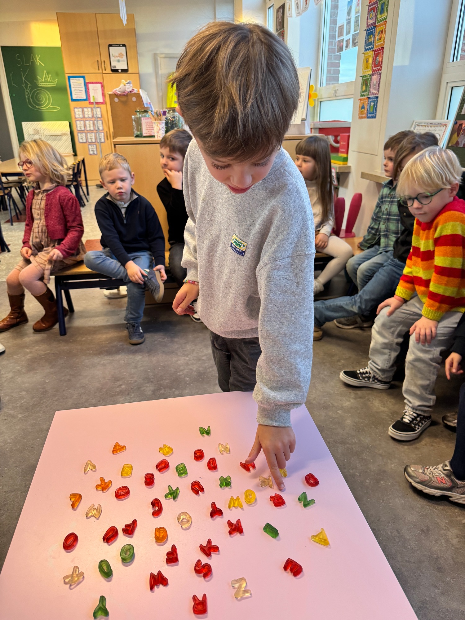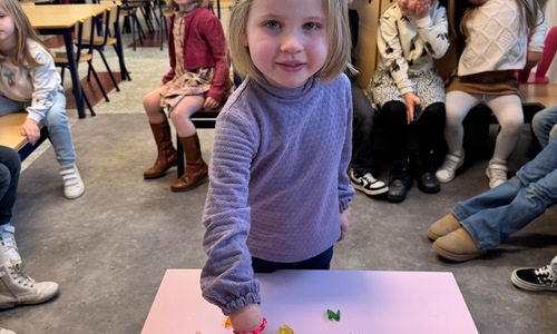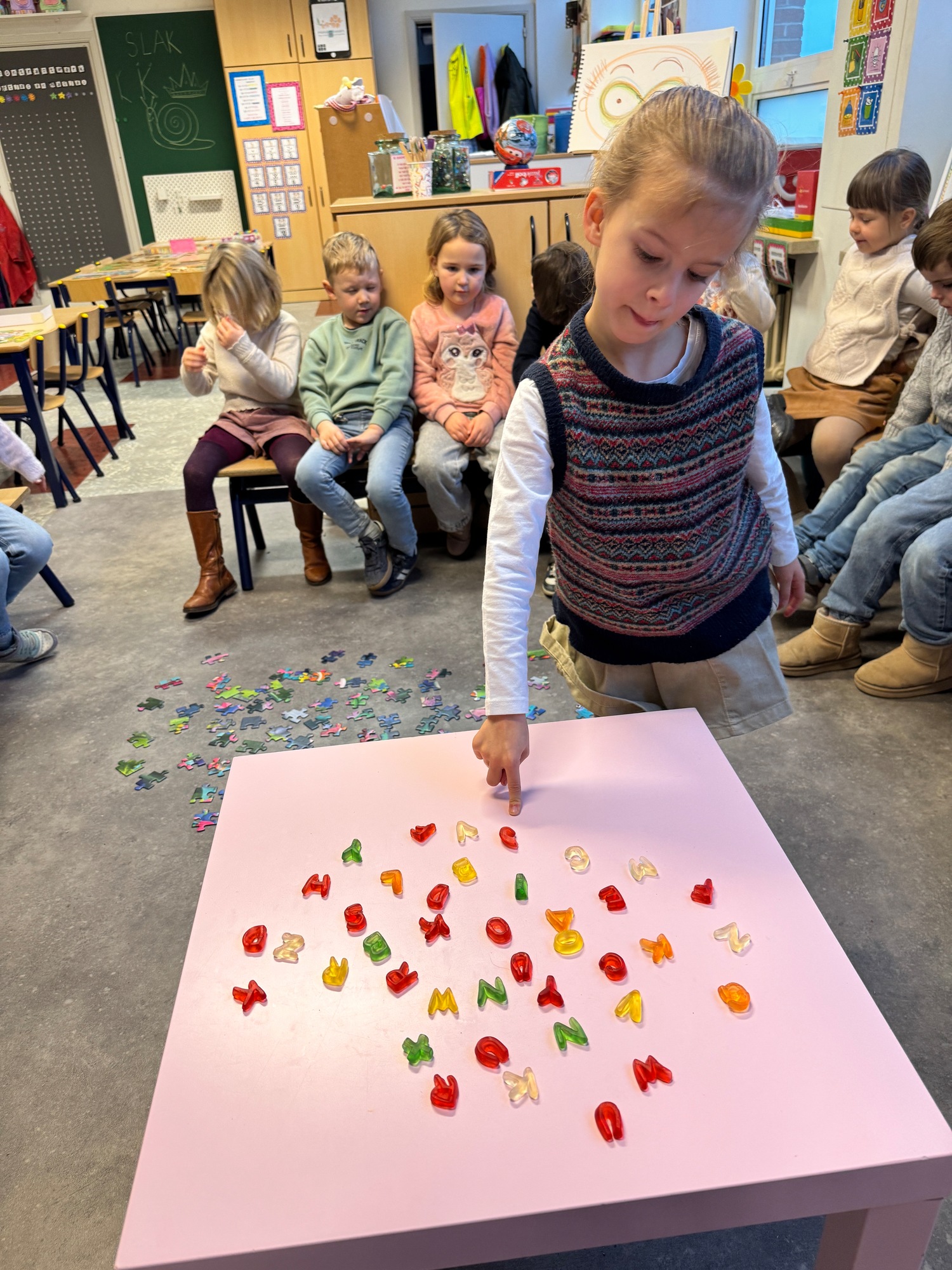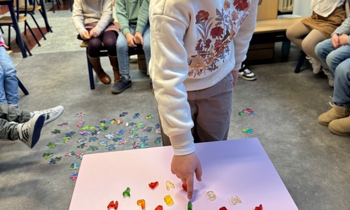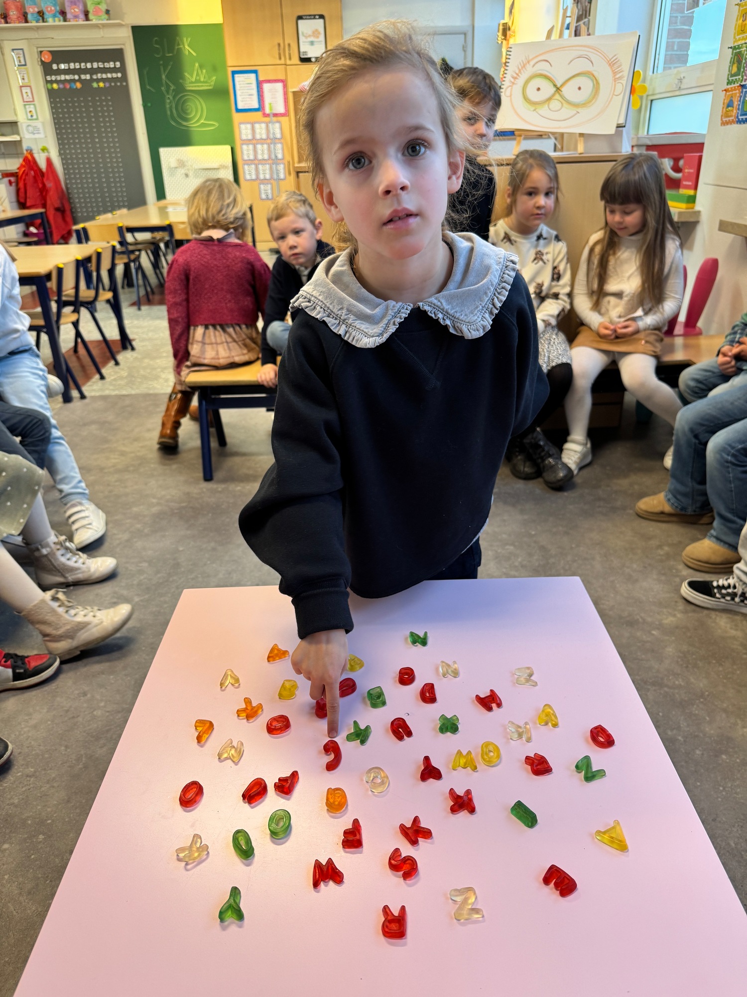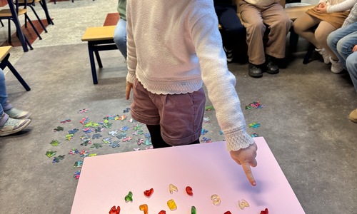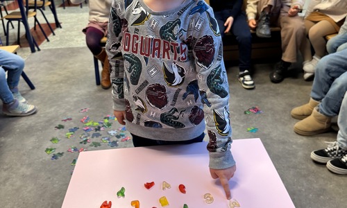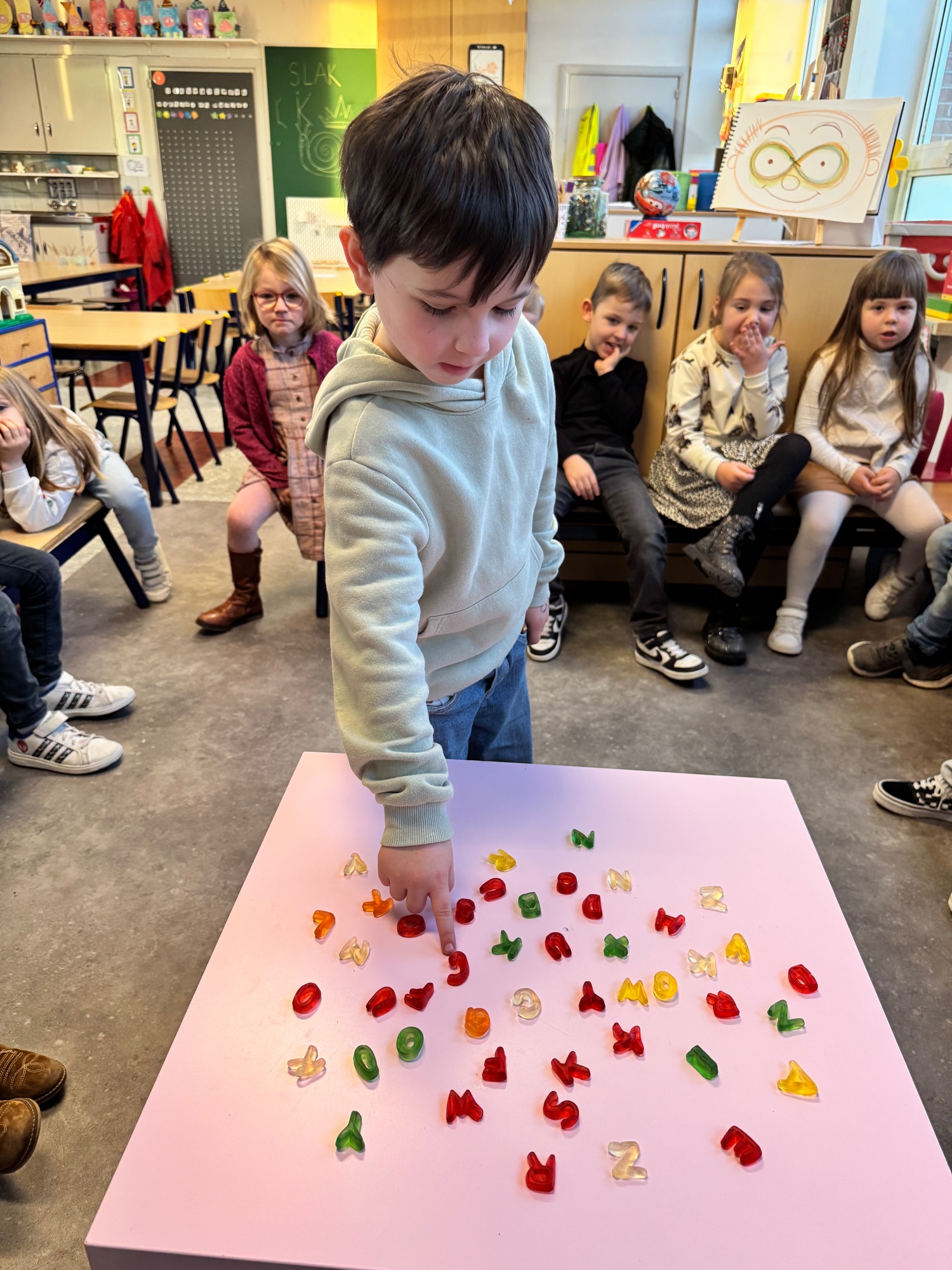 Pompom zat deze morgen niet op zijn stoeltje in onze kring. Hij zat op een andere plaats boven op een grote pak. Wat had hij meegebracht? Wat zat er onder de roze handdoek verstopt? Pompom had een nieuw boekje en een zak met snoepjes mee naar de klas. Het boekje gaat over een heel speciaal winkeltje waar je alleen maar letters kan kopen. In het zakje snoep zaten er lettersnoepjes. Wie kon zijn eerste letter van zijn/haar naam vinden tussen alle snoepjes?
