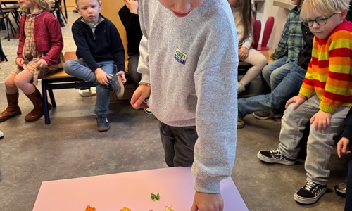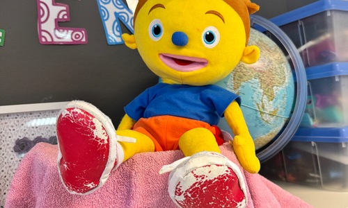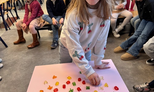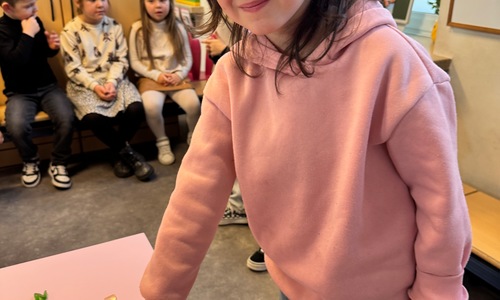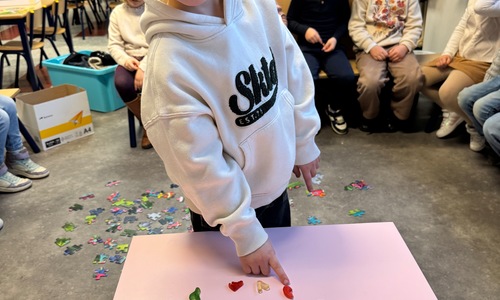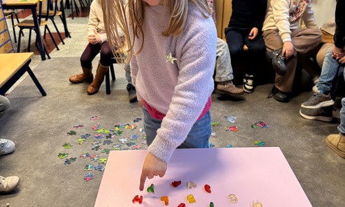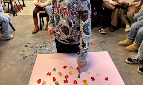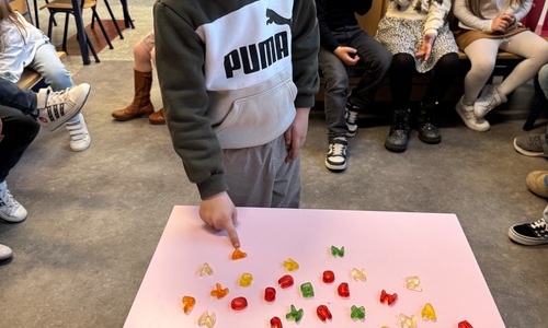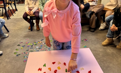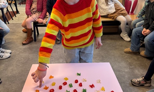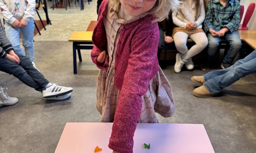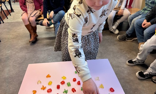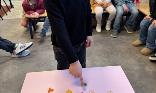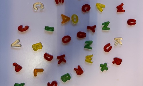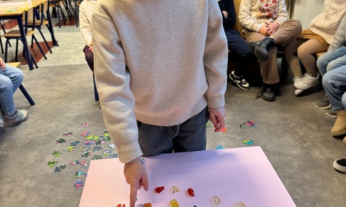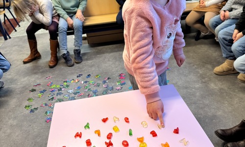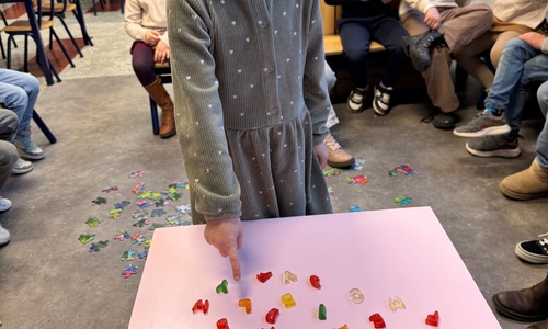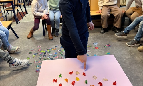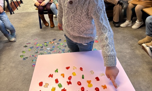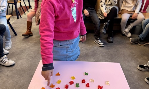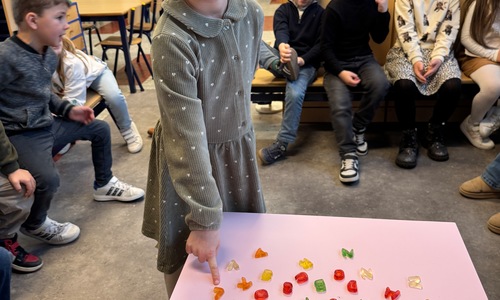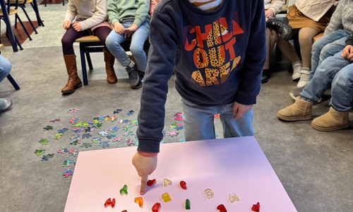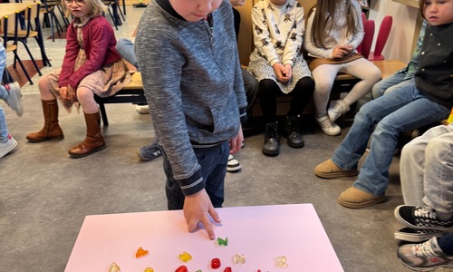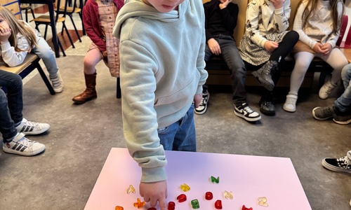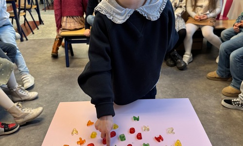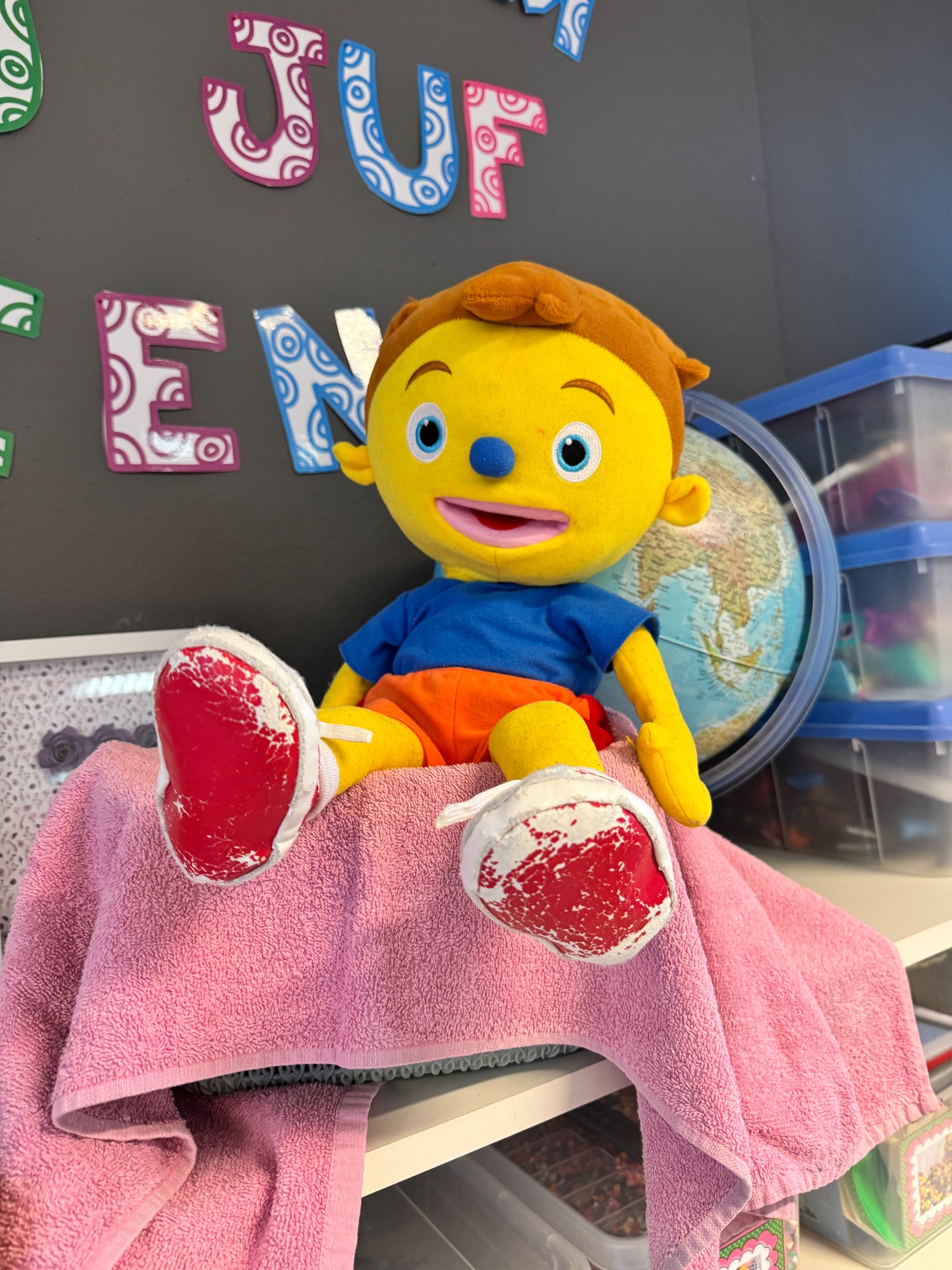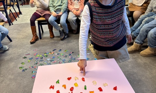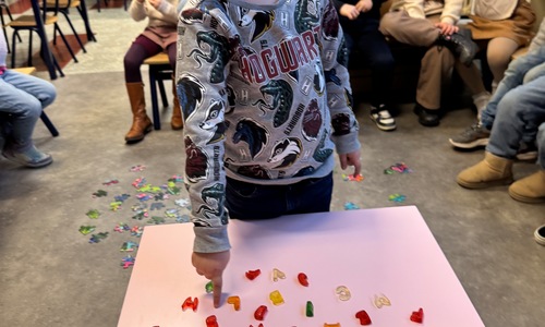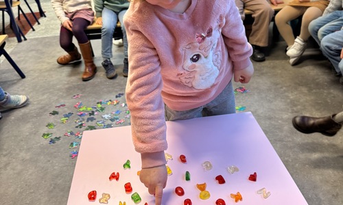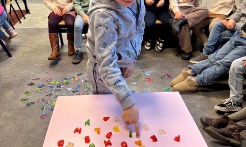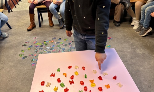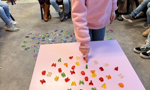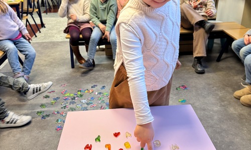 Pompom zat deze morgen niet op zijn stoeltje in onze kring. Hij zat op een andere plaats boven op een grote pak. Wat had hij meegebracht? Wat zat er onder de roze handdoek verstopt? Pompom had een nieuw boekje en een zak met snoepjes mee naar de klas. Het boekje gaat over een heel speciaal winkeltje waar je alleen maar letters kan kopen. In het zakje snoep zaten er lettersnoepjes. Wie kon zijn eerste letter van zijn/haar naam vinden tussen alle snoepjes?