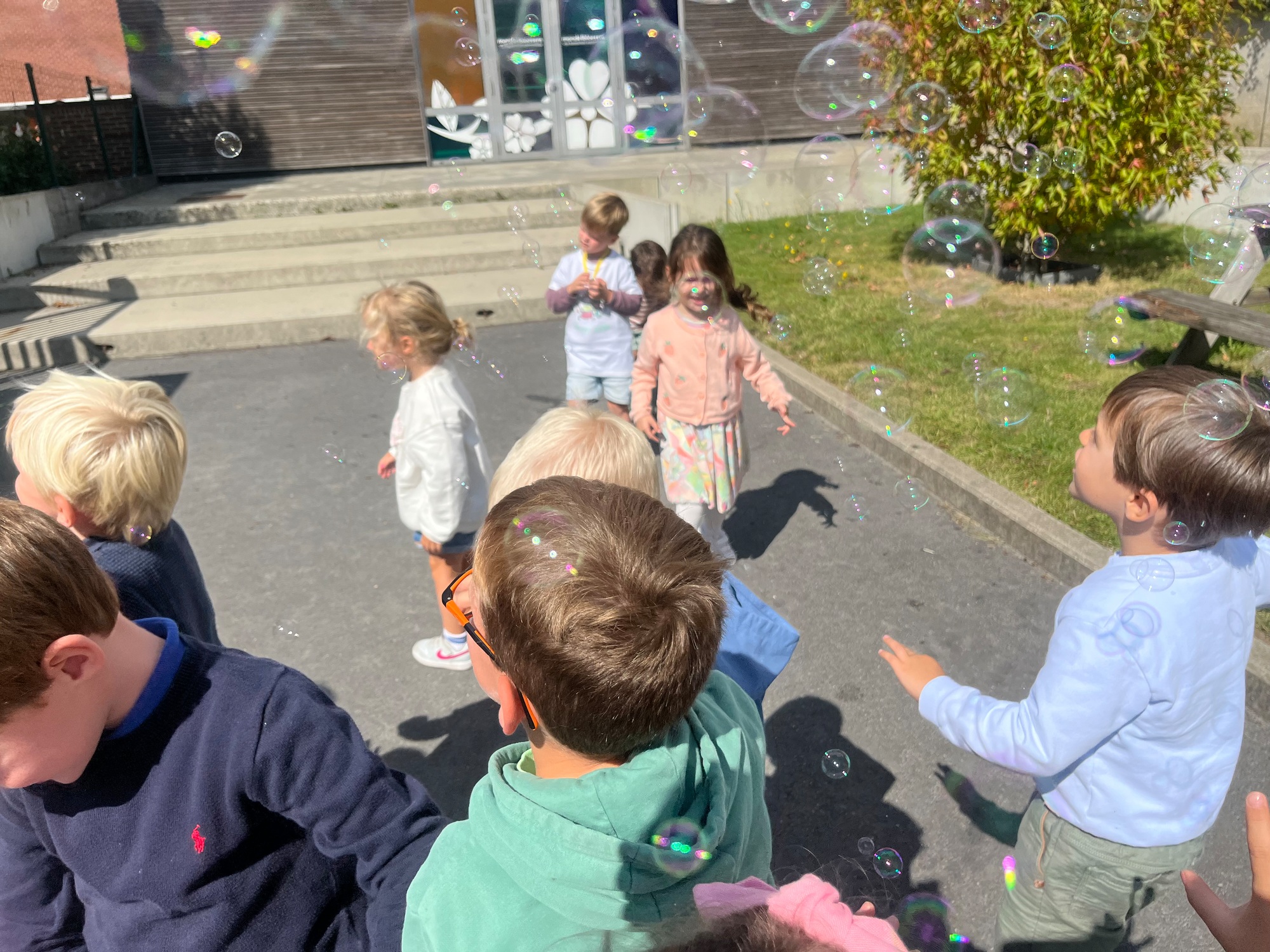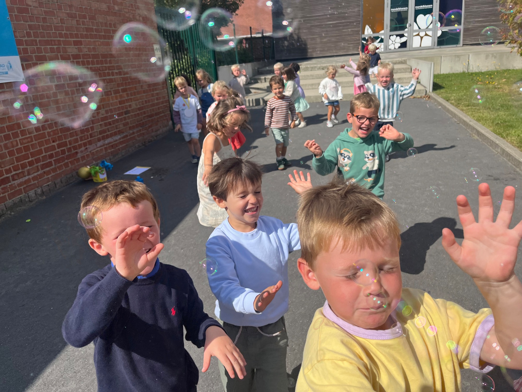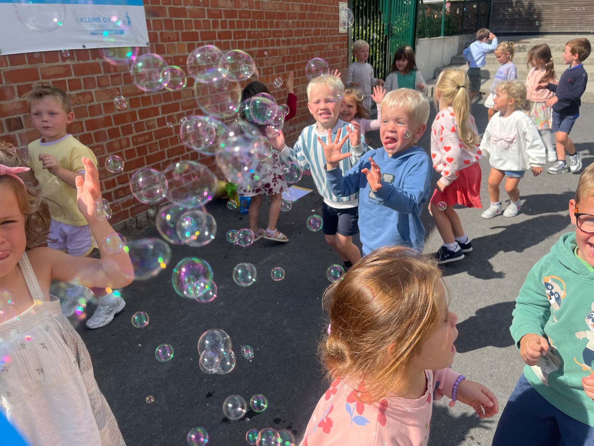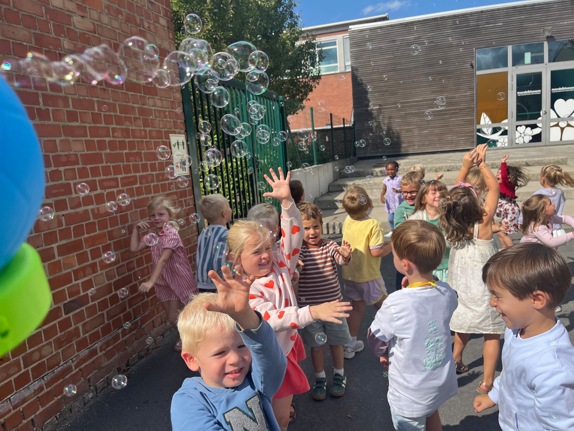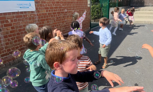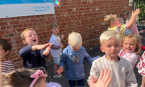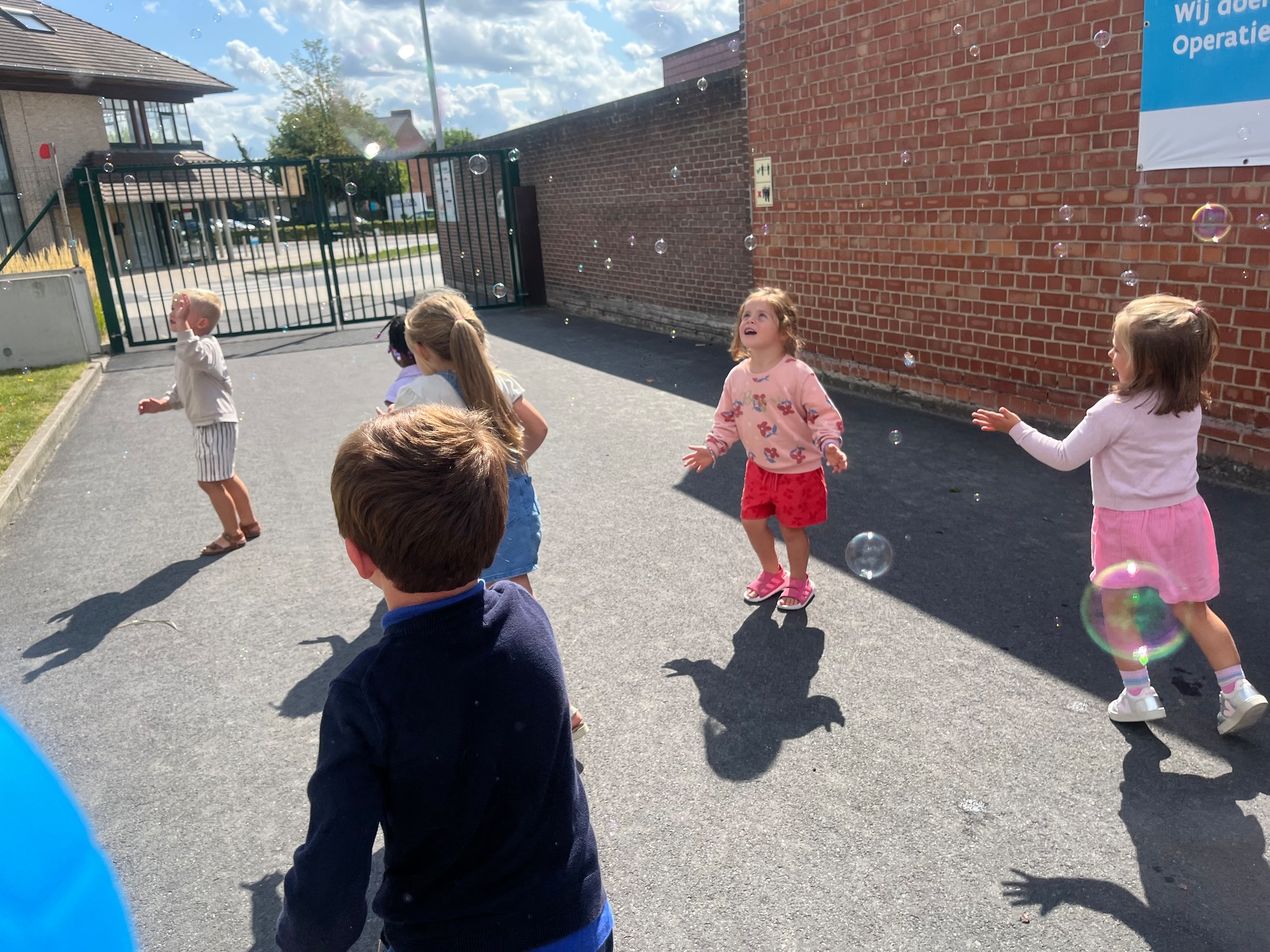 Leeuw brult heel luid en vangt de bellen, aap springt op en neer, olifant vangt de bellen met zijn slurf en krokodil vangt ze met zijn grote bek.