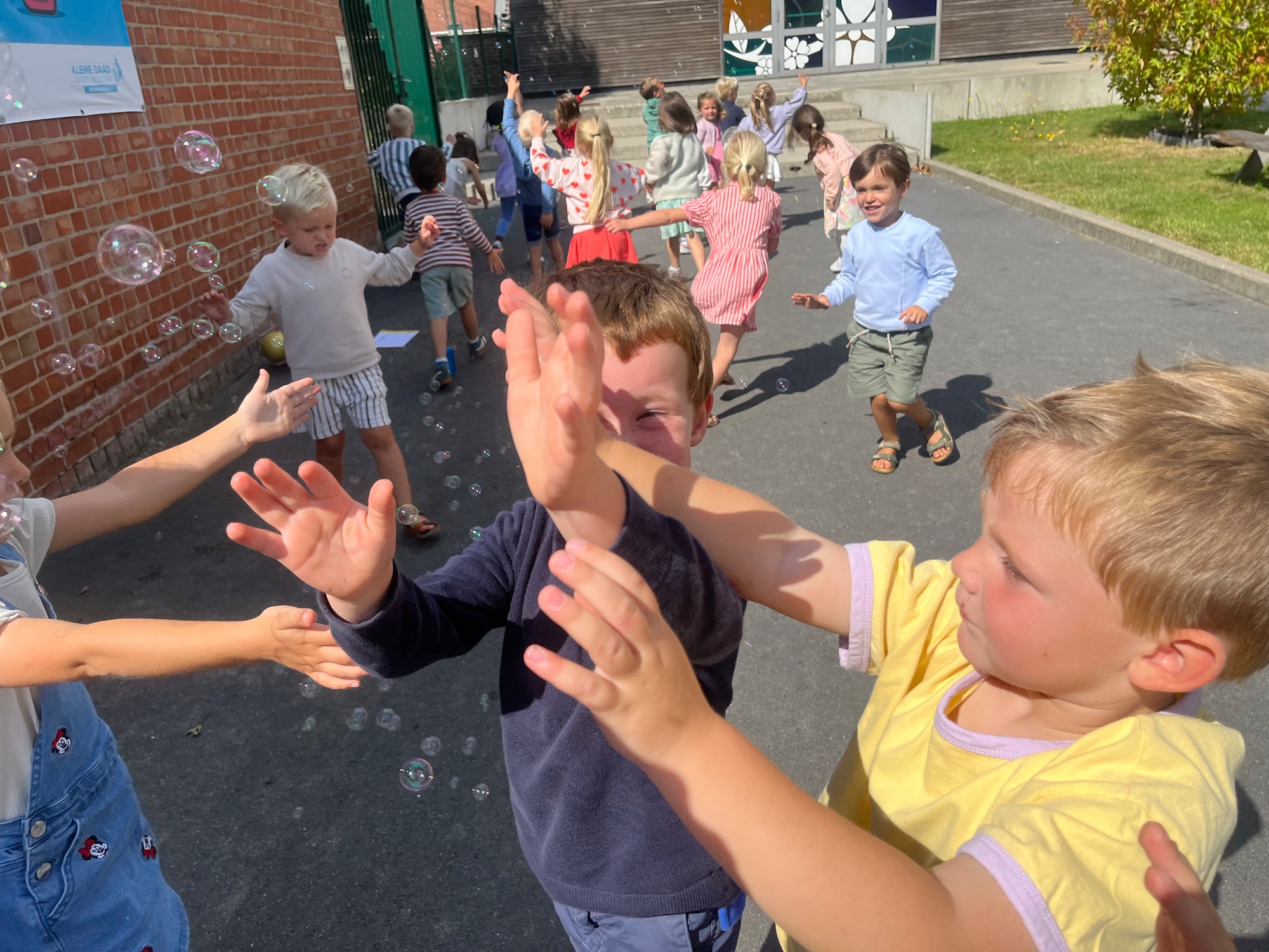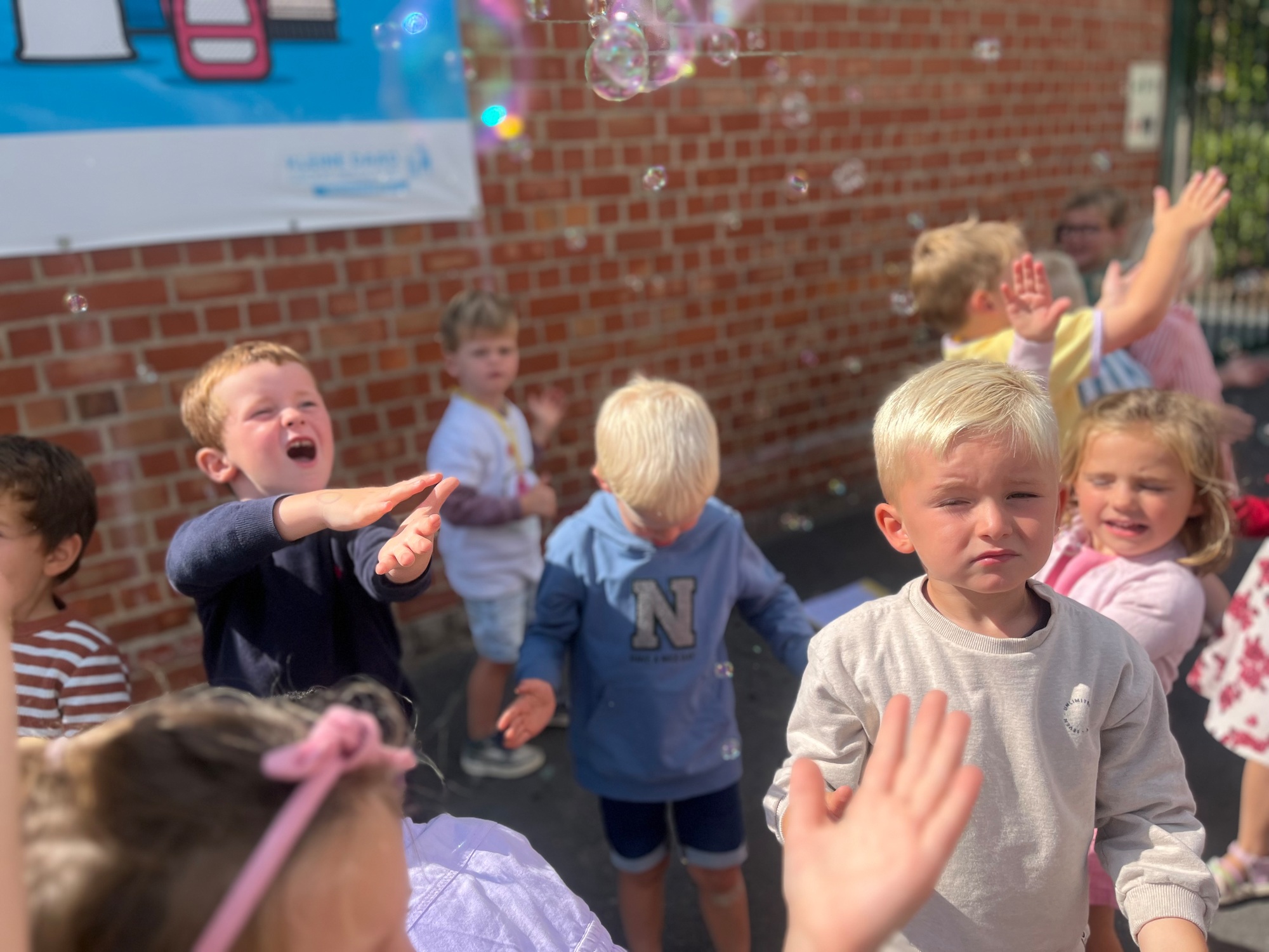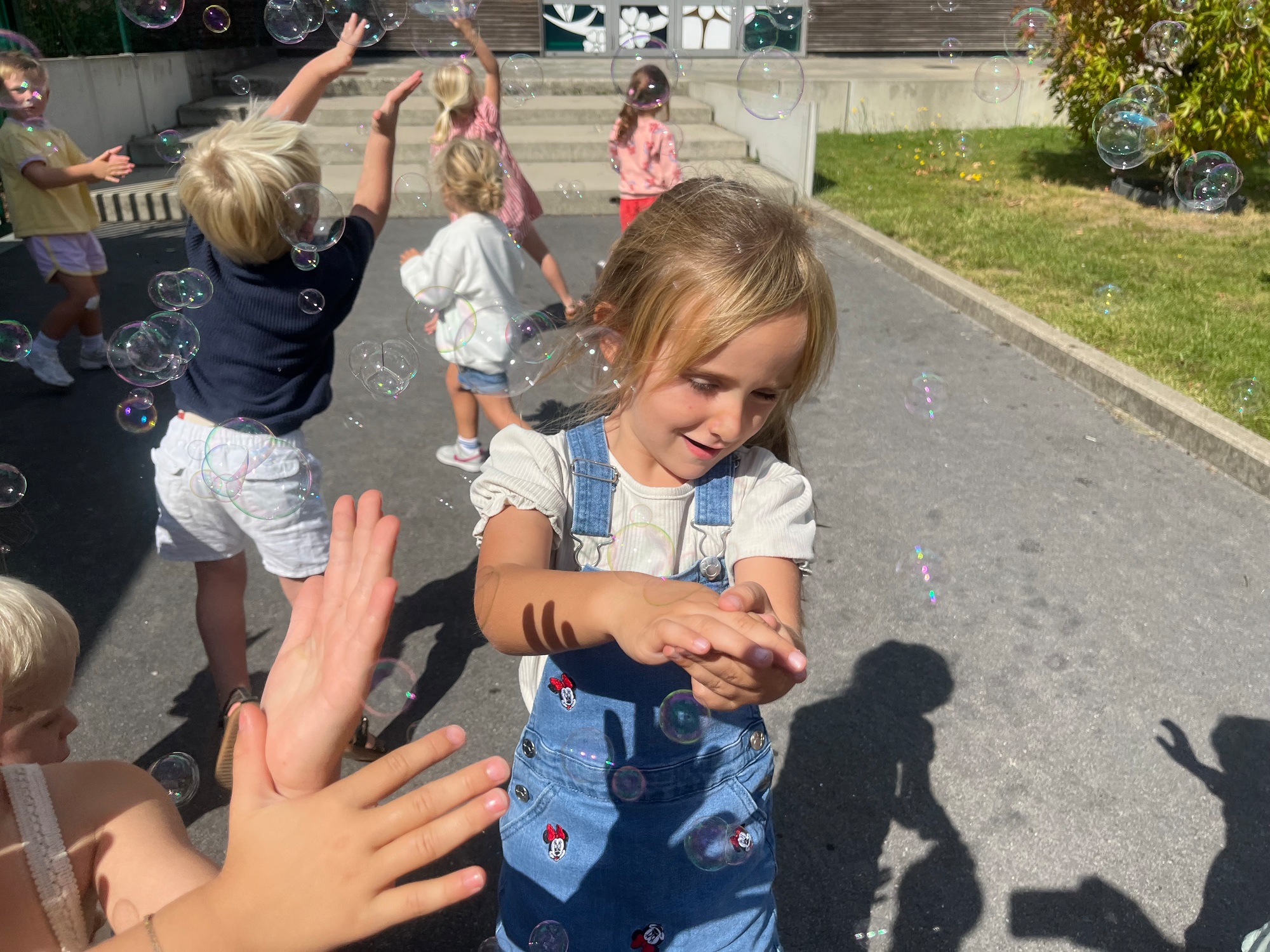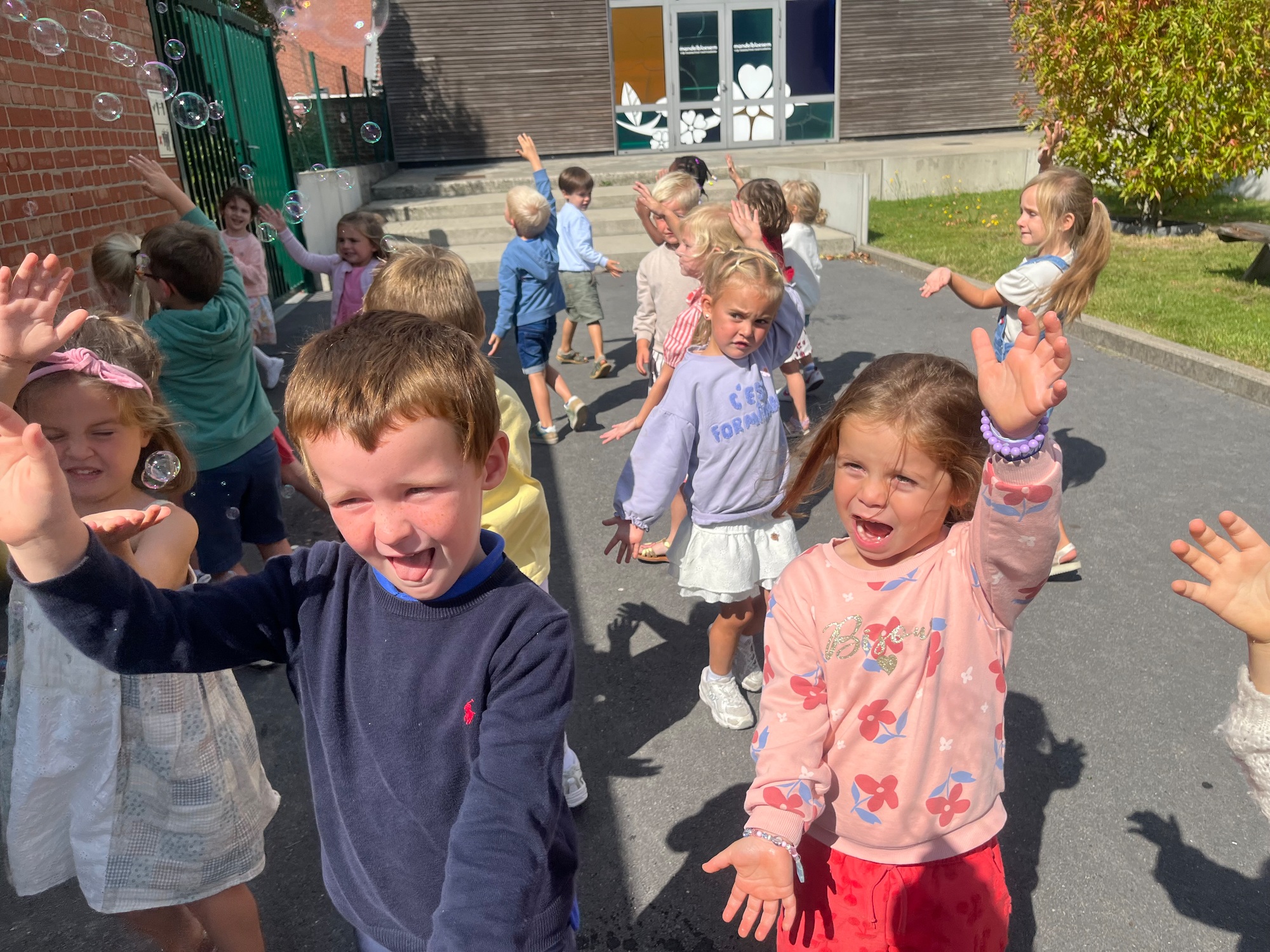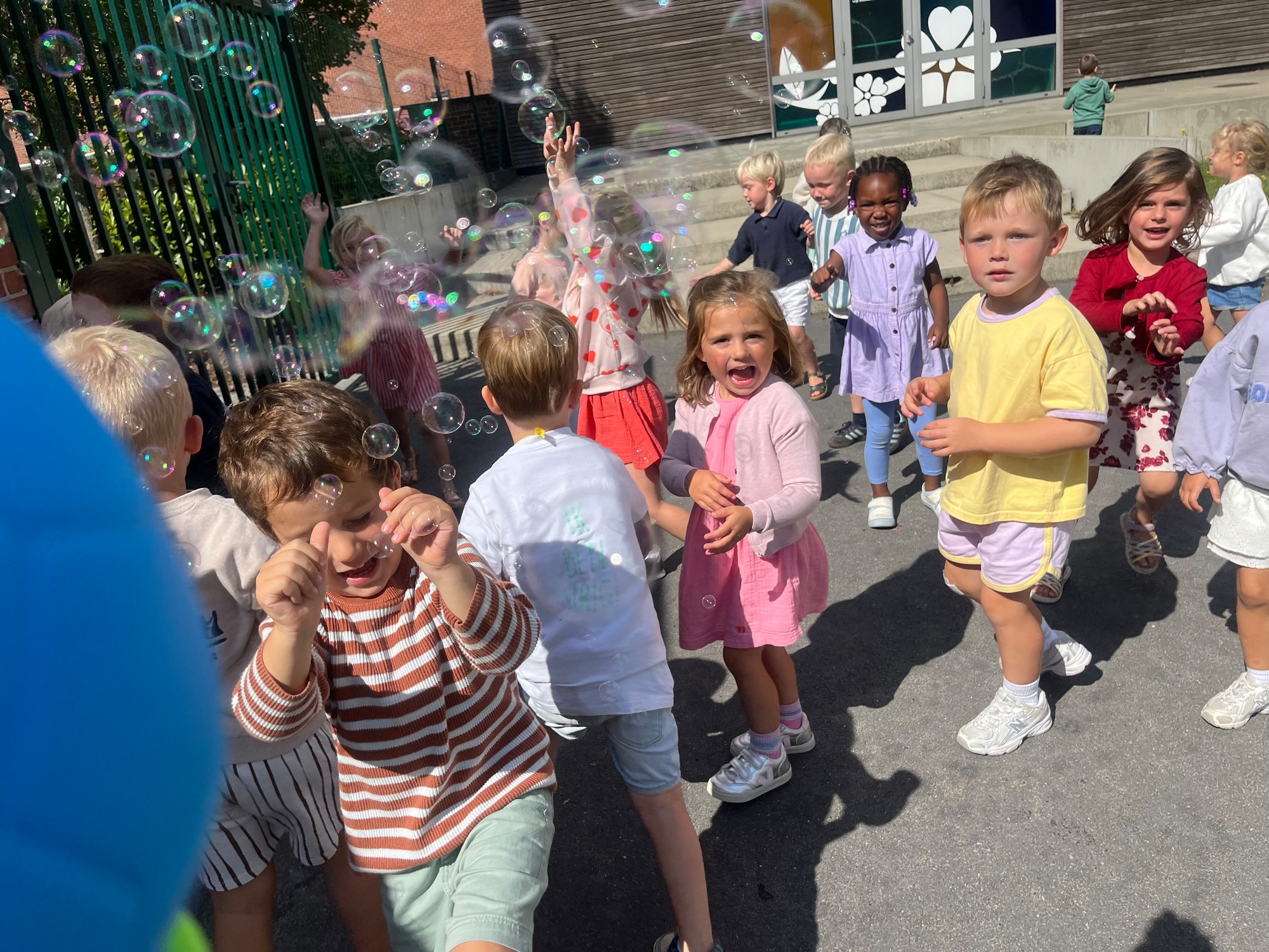 Leeuw brult heel luid en vangt de bellen, aap springt op en neer, olifant vangt de bellen met zijn slurf en krokodil vangt ze met zijn grote bek.