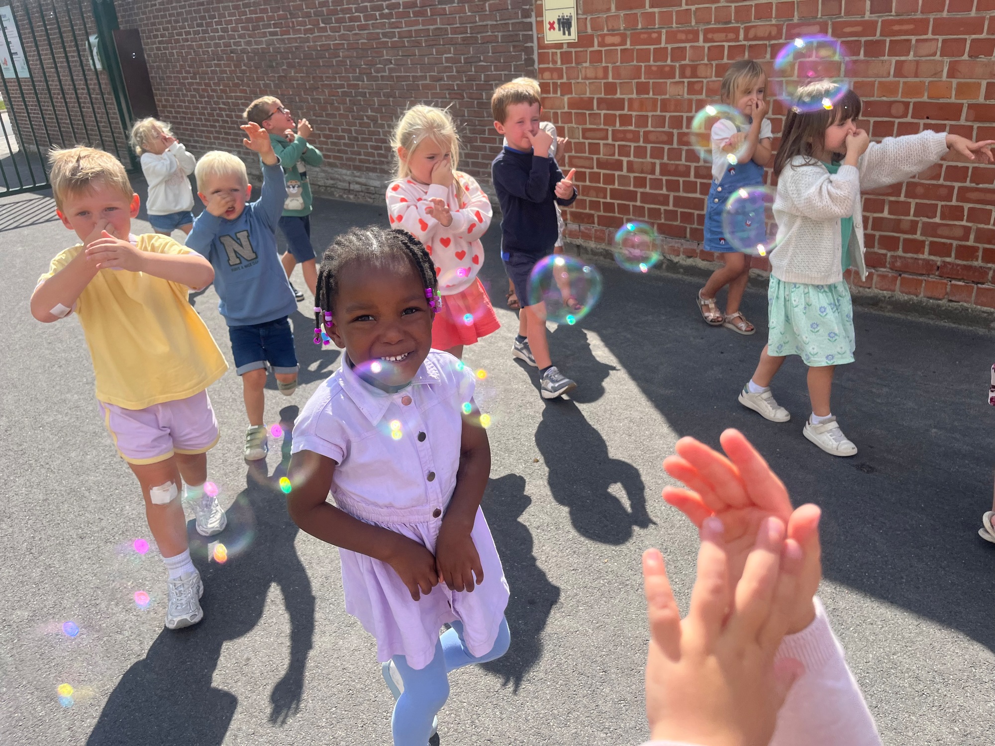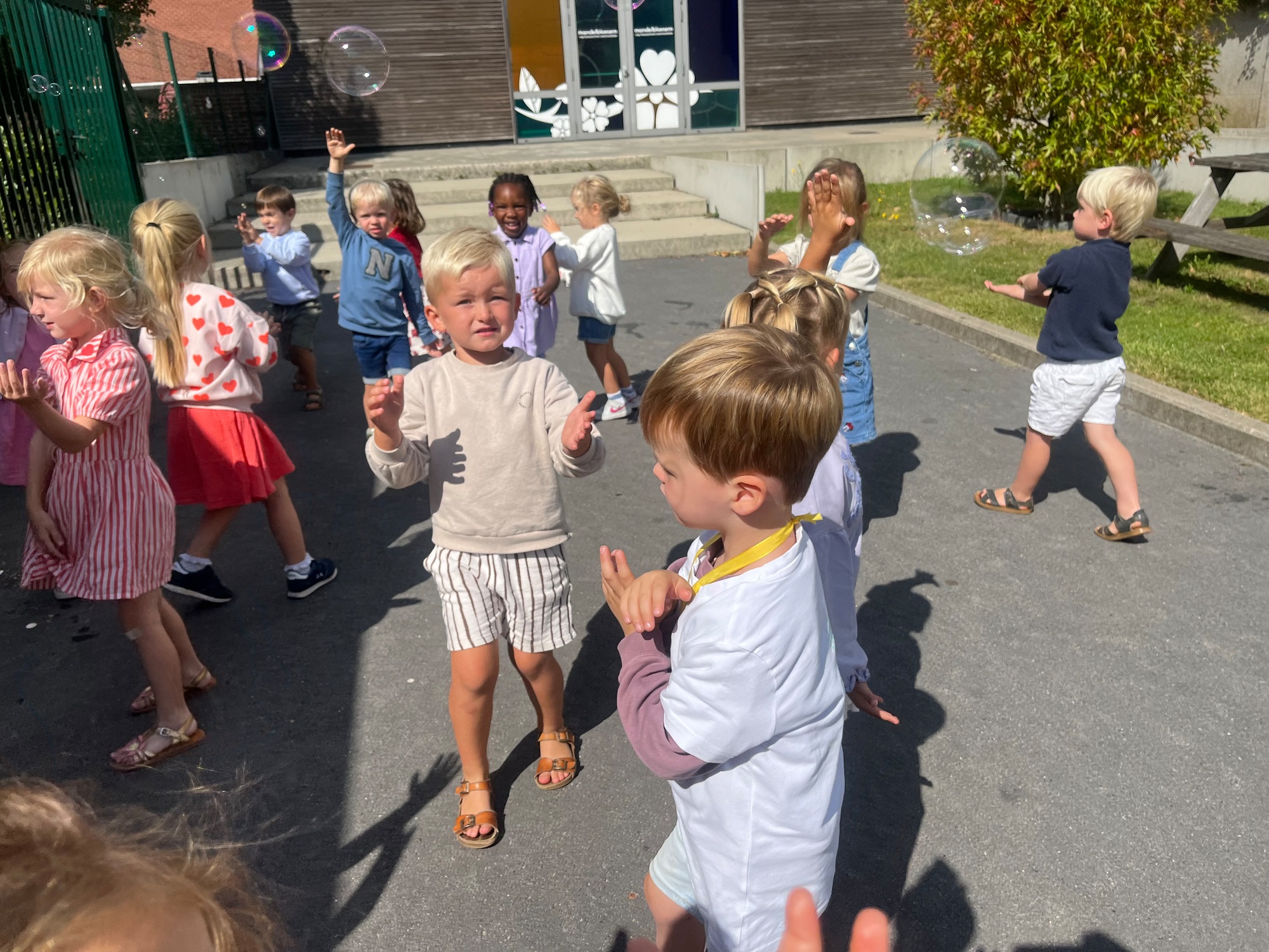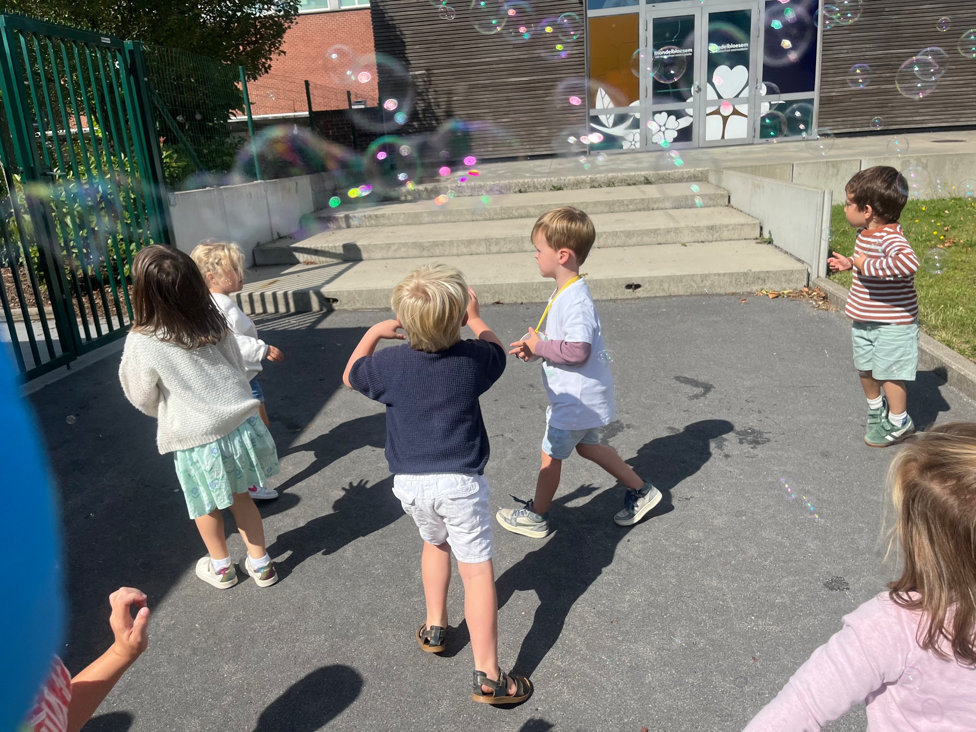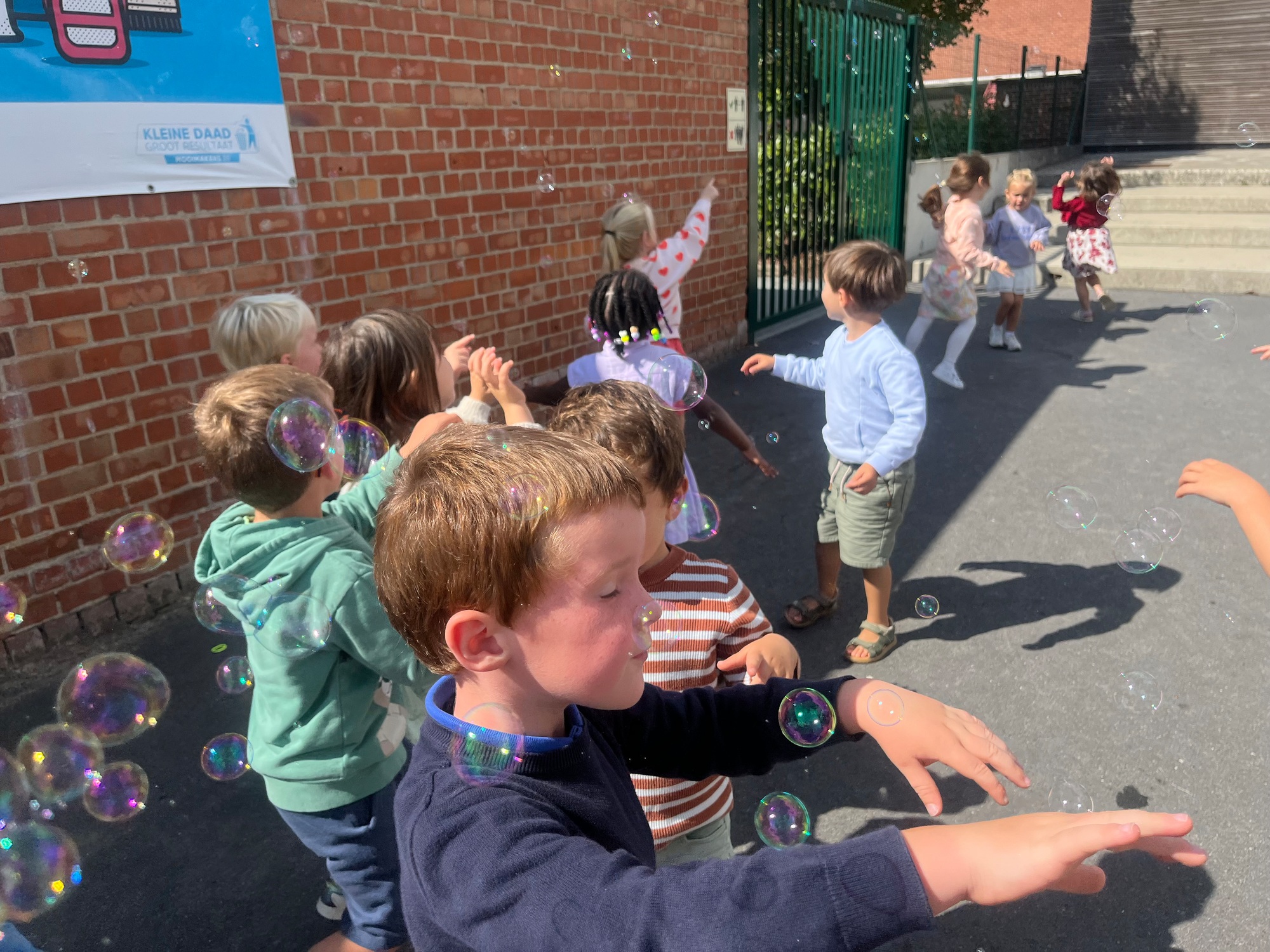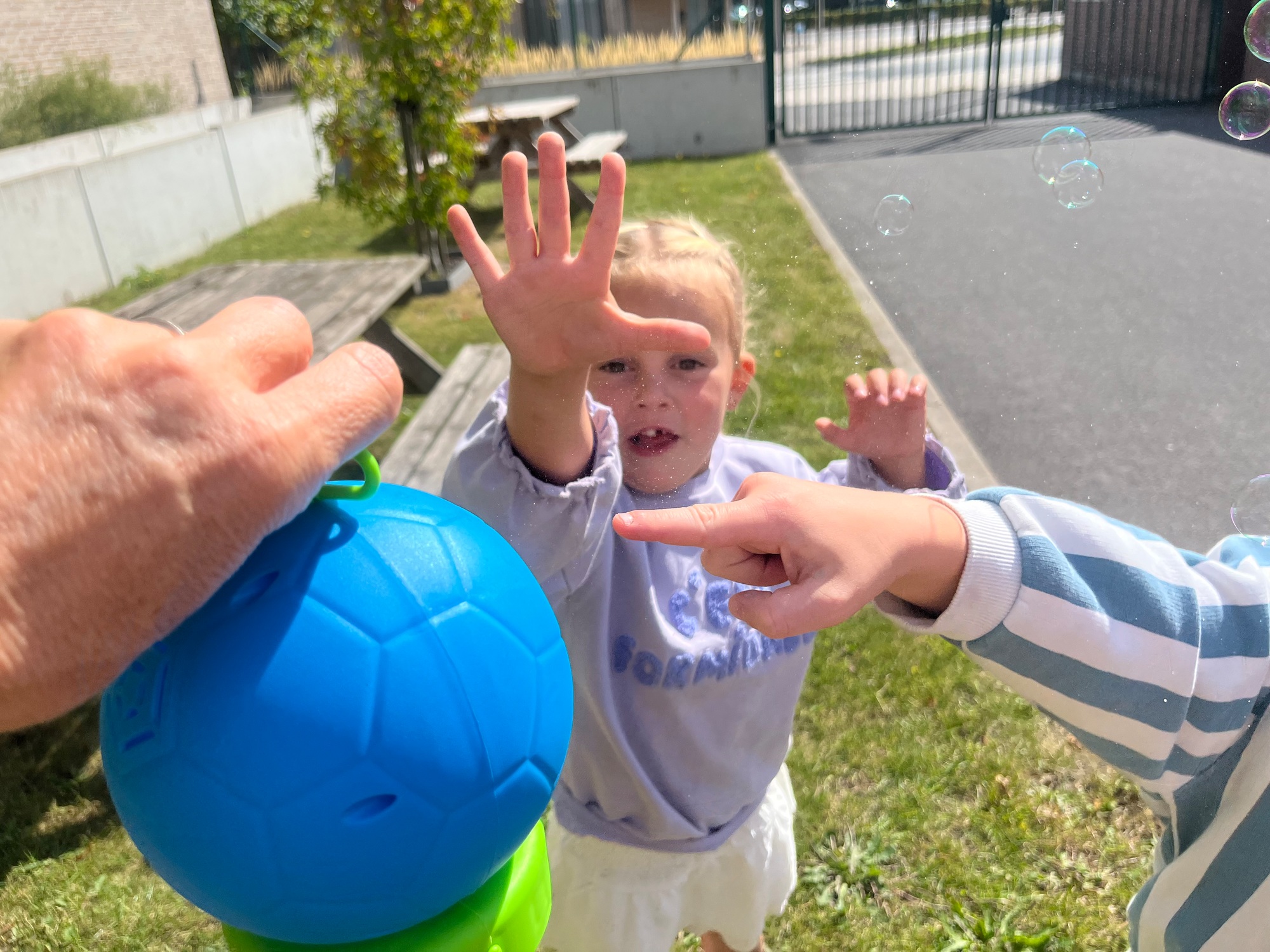 Leeuw brult heel luid en vangt de bellen, aap springt op en neer, olifant vangt de bellen met zijn slurf en krokodil vangt ze met zijn grote bek.