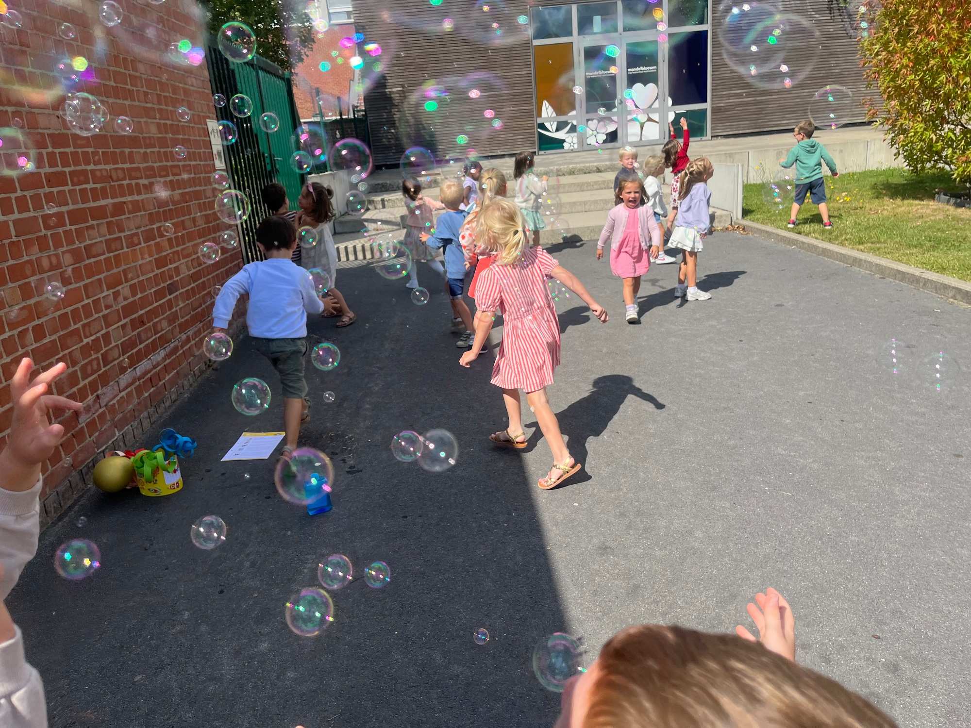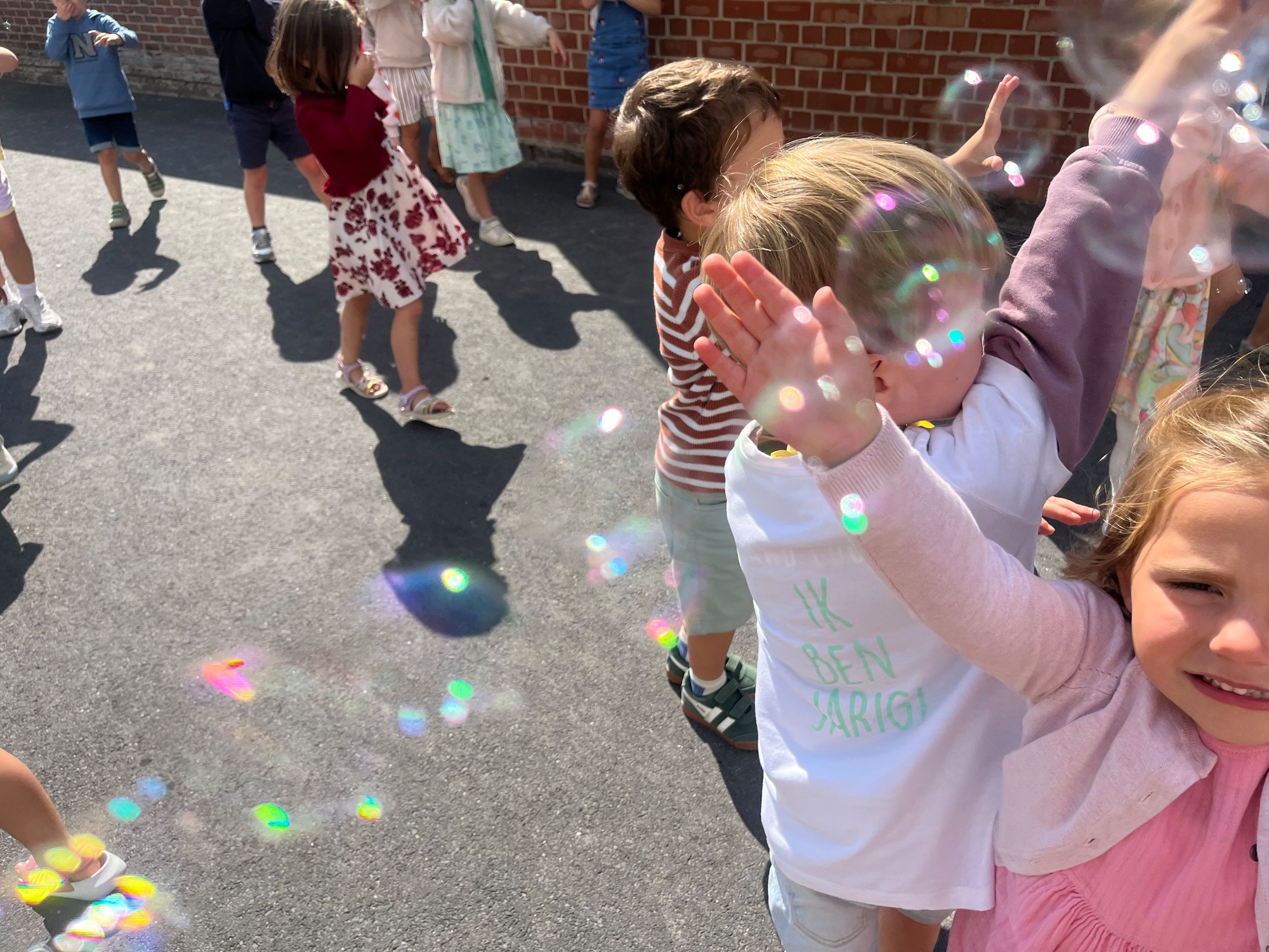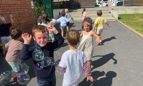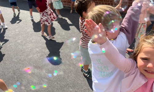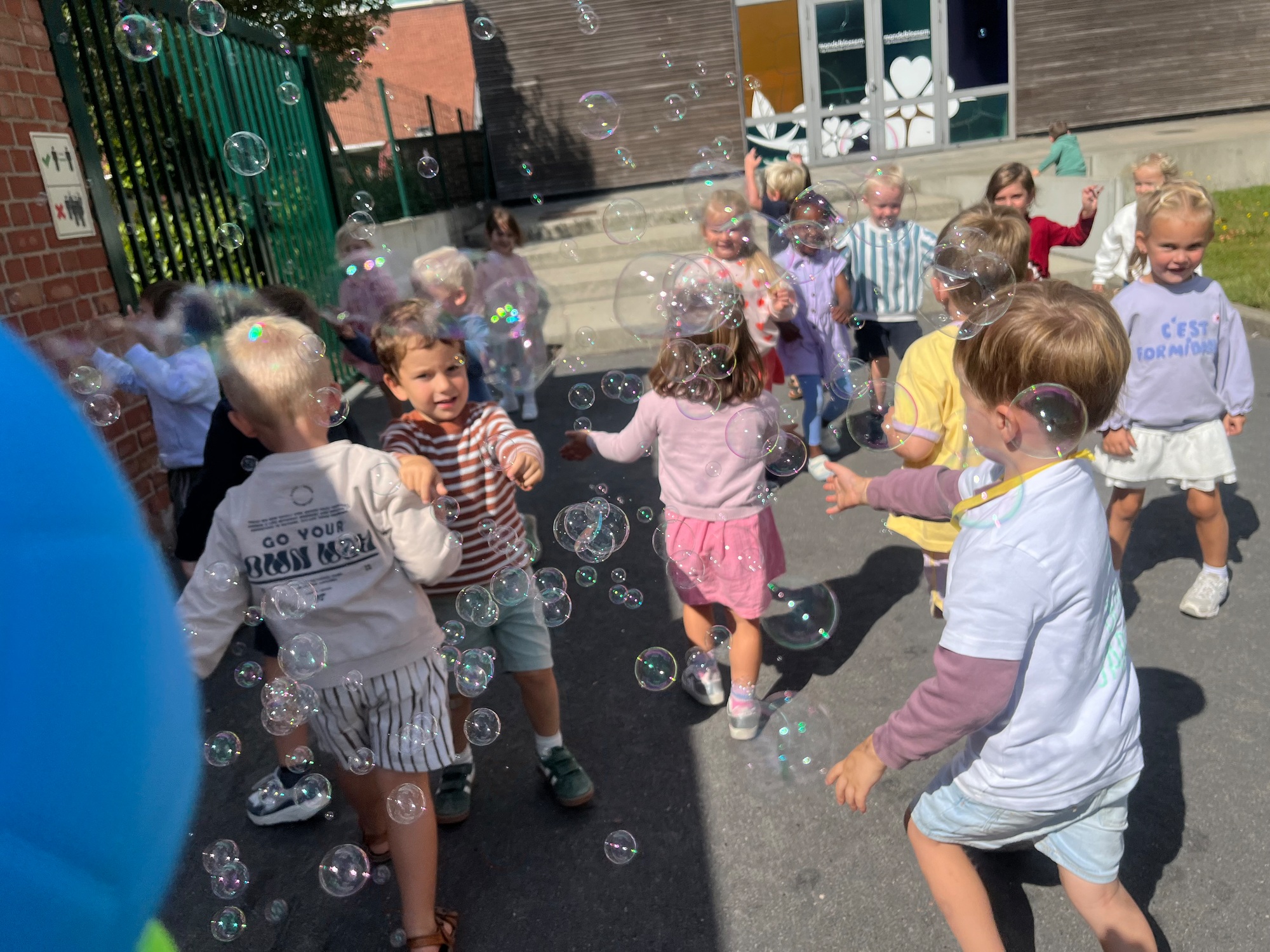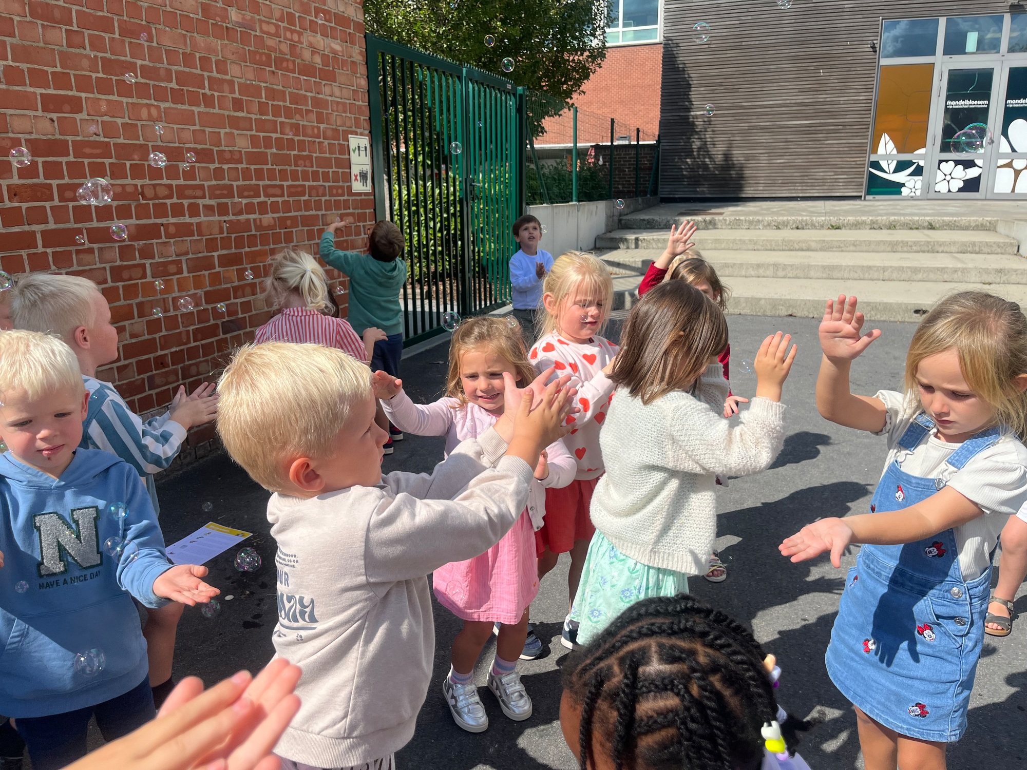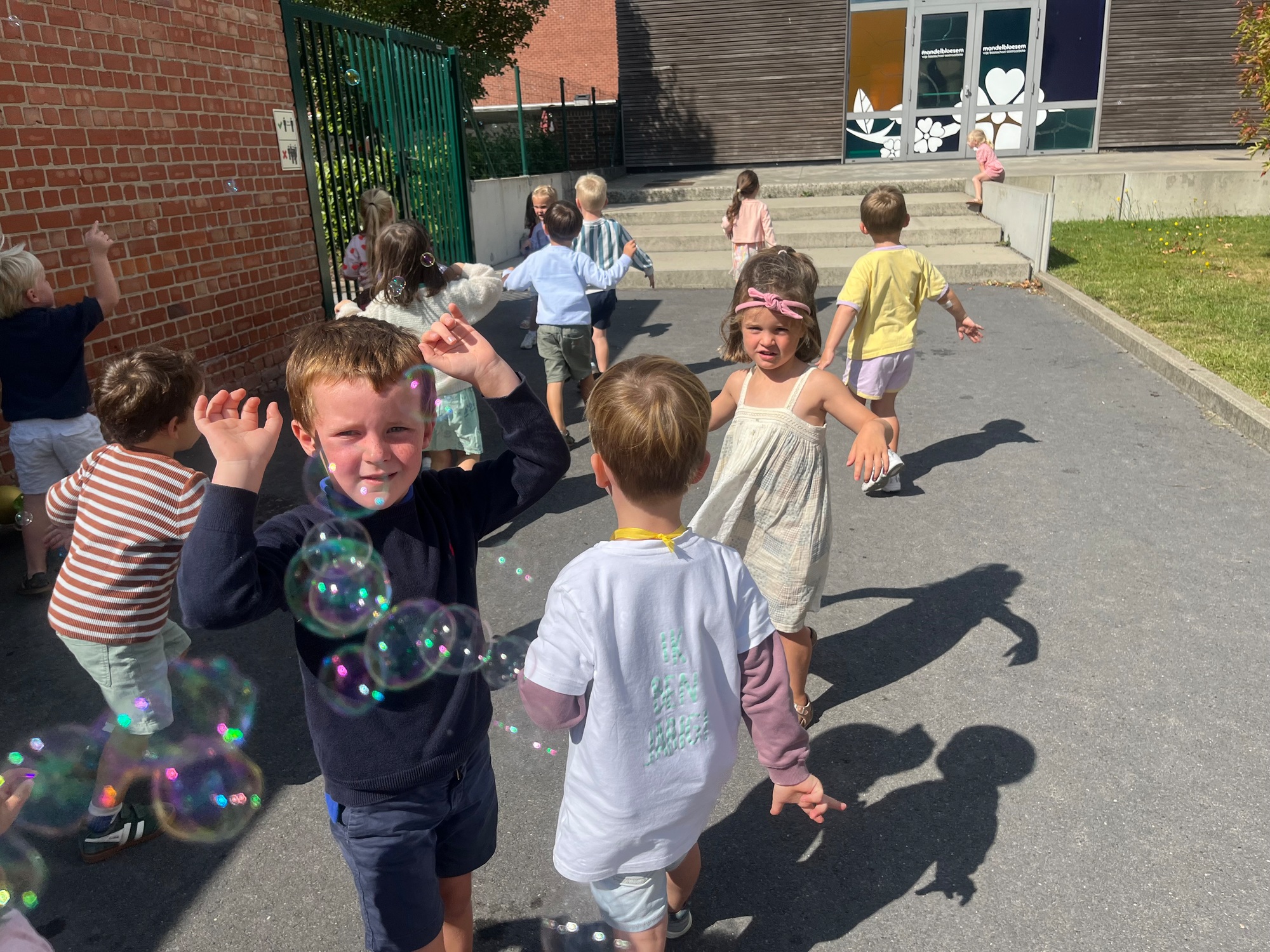 Leeuw brult heel luid en vangt de bellen, aap springt op en neer, olifant vangt de bellen met zijn slurf en krokodil vangt ze met zijn grote bek.