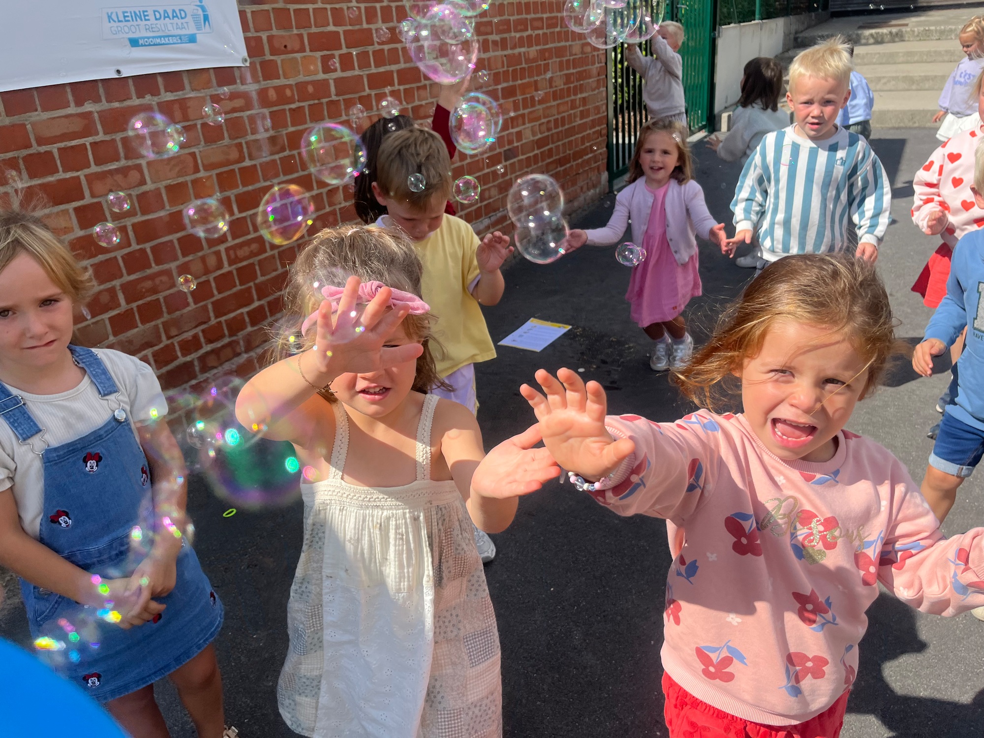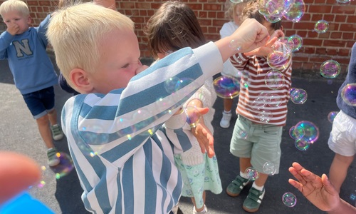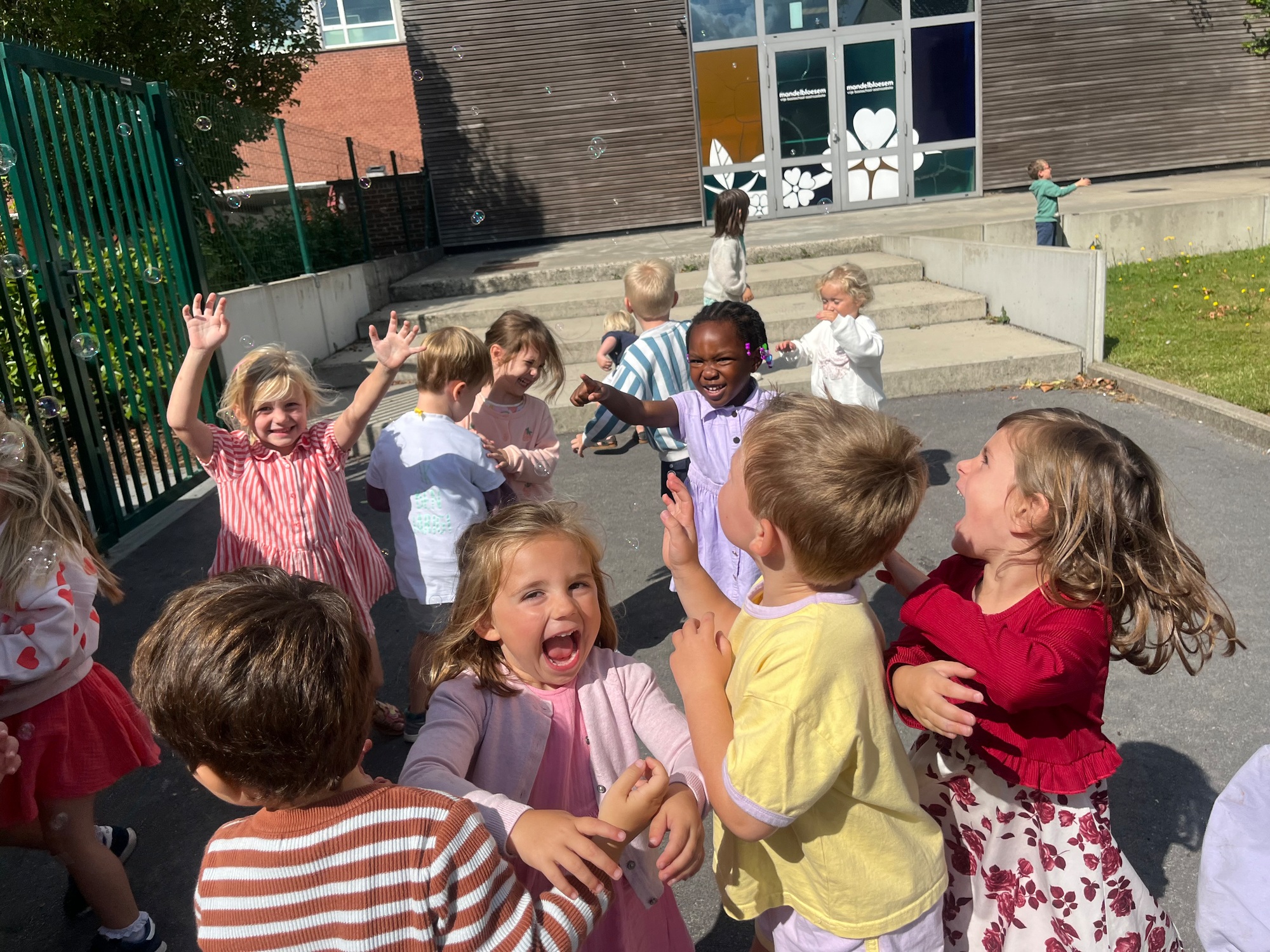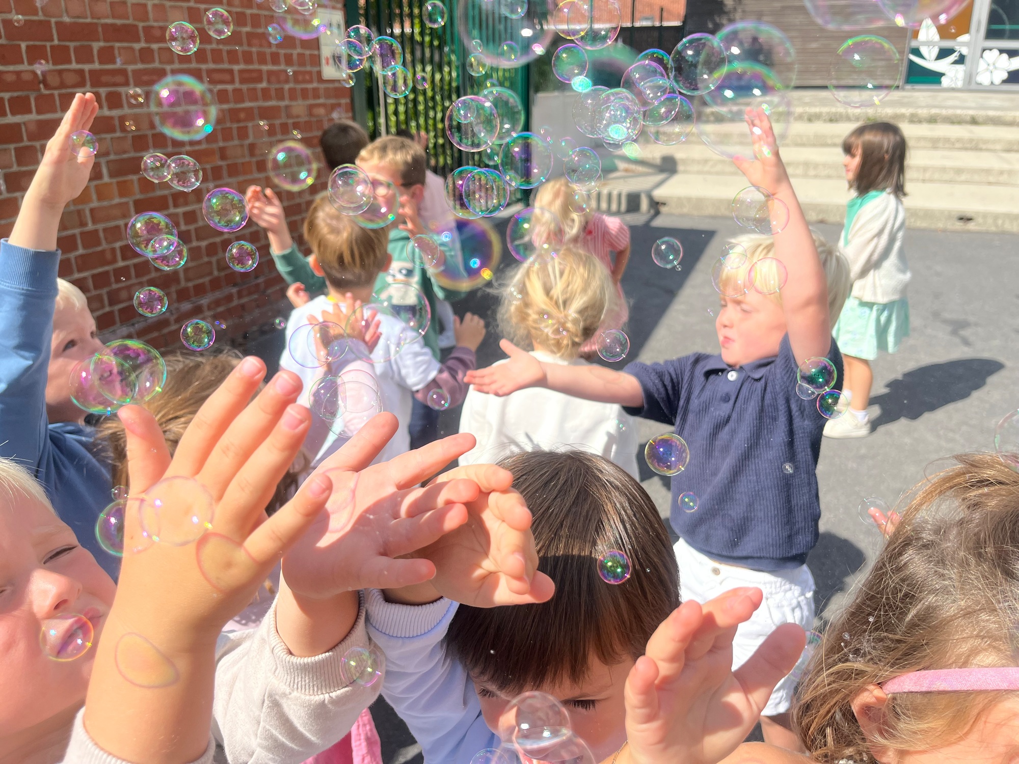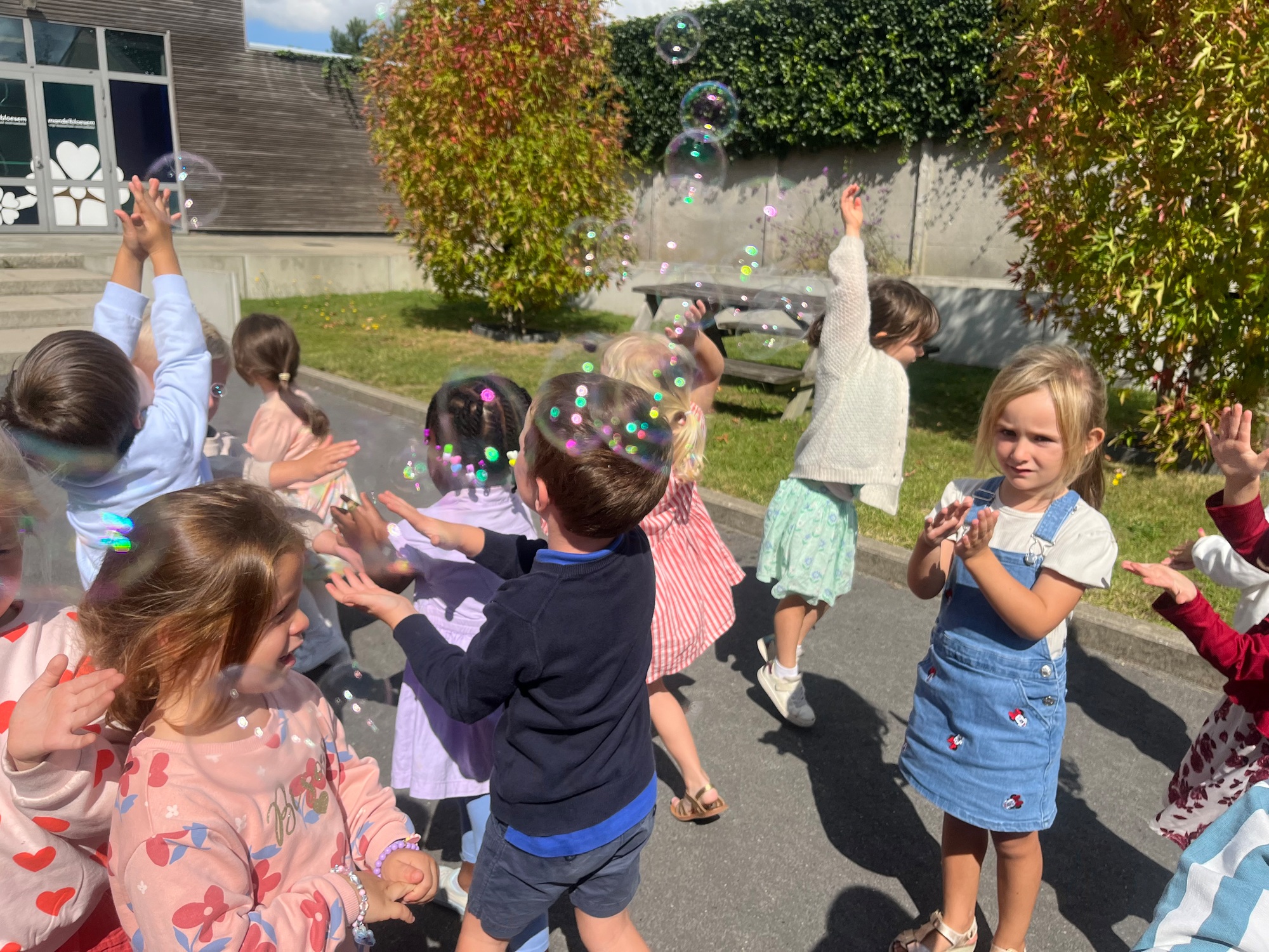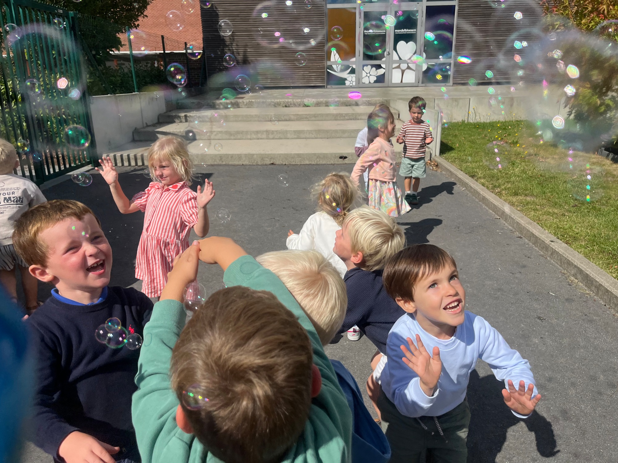 Leeuw brult heel luid en vangt de bellen, aap springt op en neer, olifant vangt de bellen met zijn slurf en krokodil vangt ze met zijn grote bek.