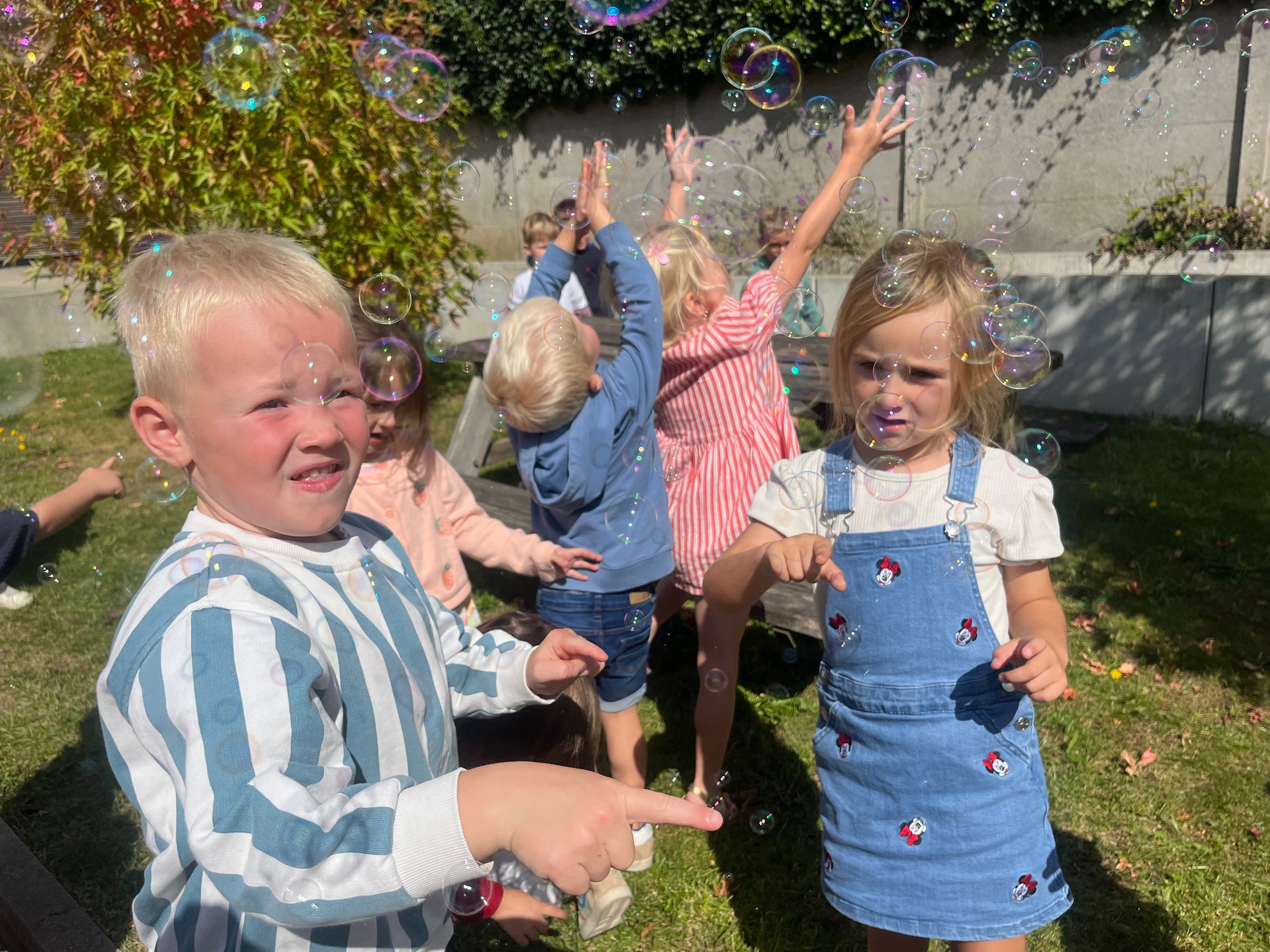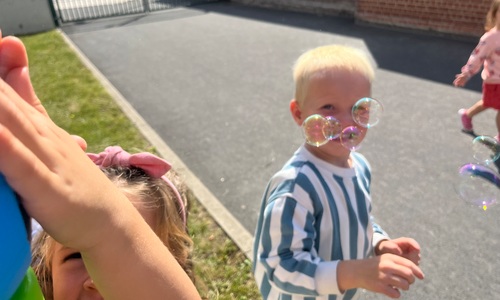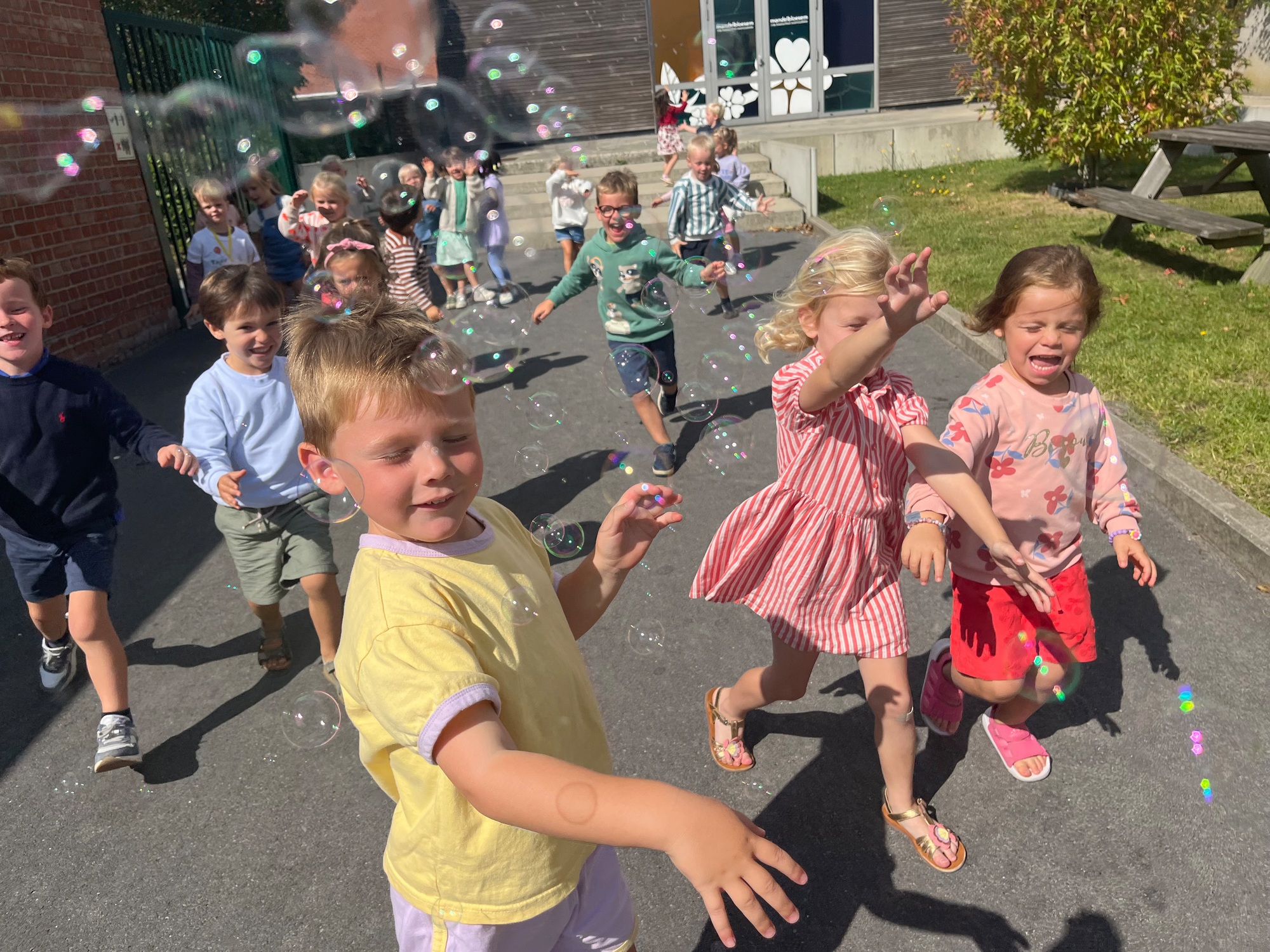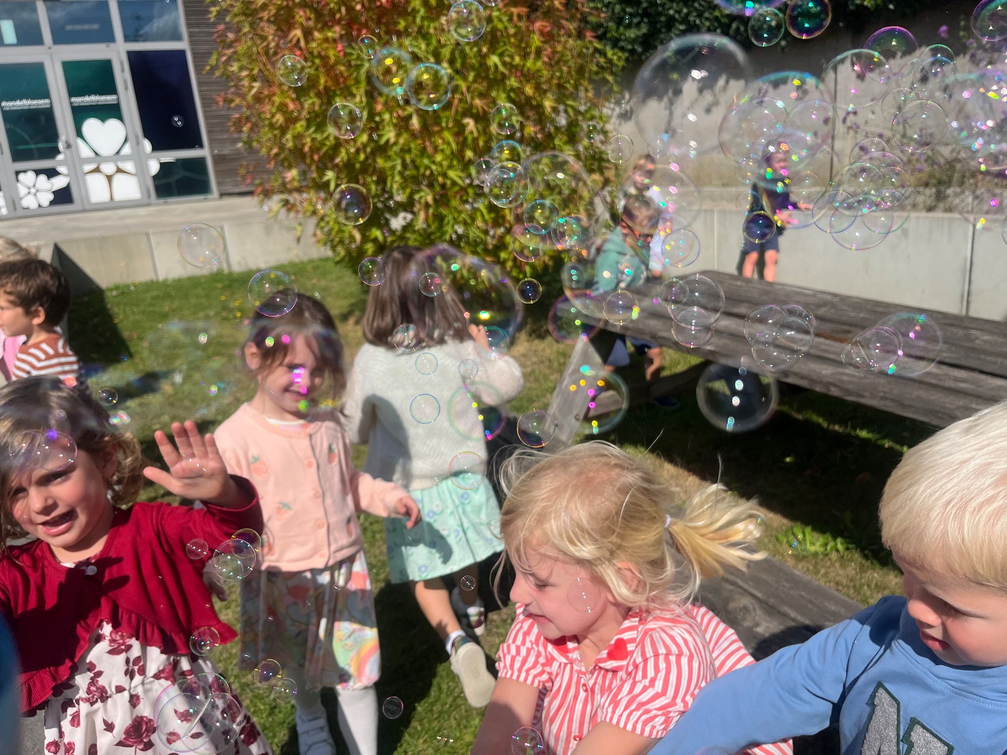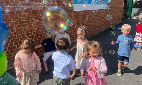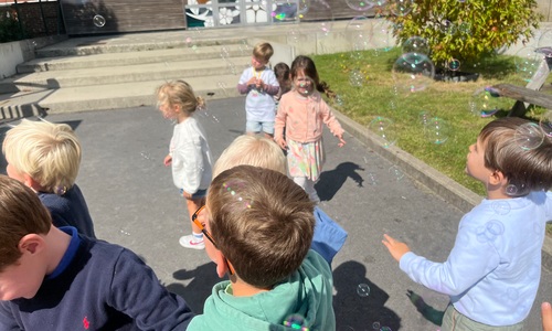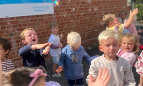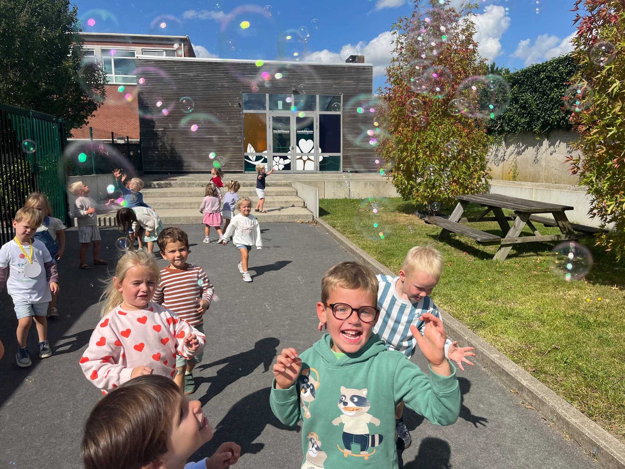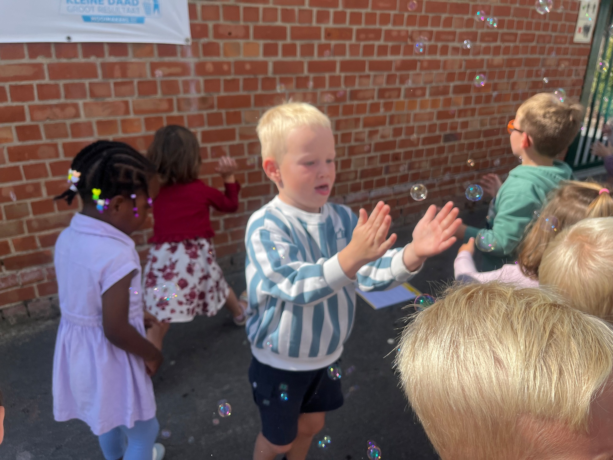 Leeuw brult heel luid en vangt de bellen, aap springt op en neer, olifant vangt de bellen met zijn slurf en krokodil vangt ze met zijn grote bek.