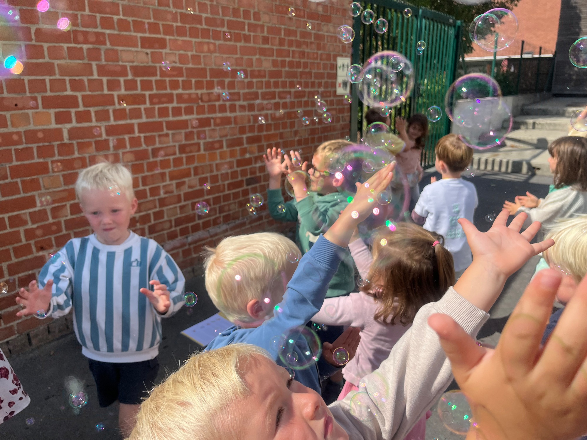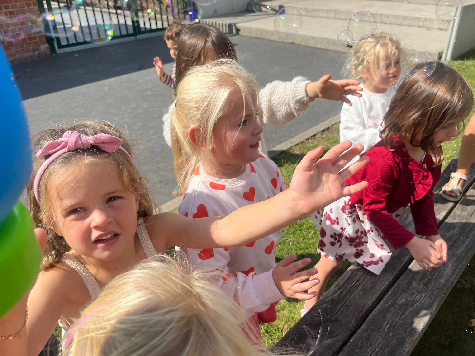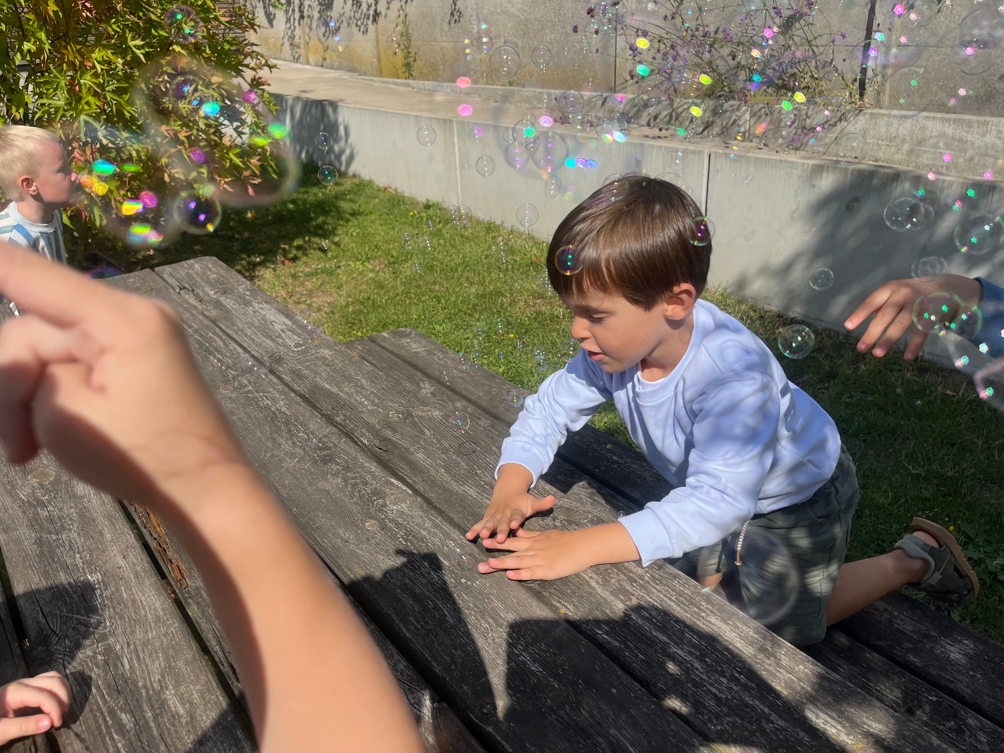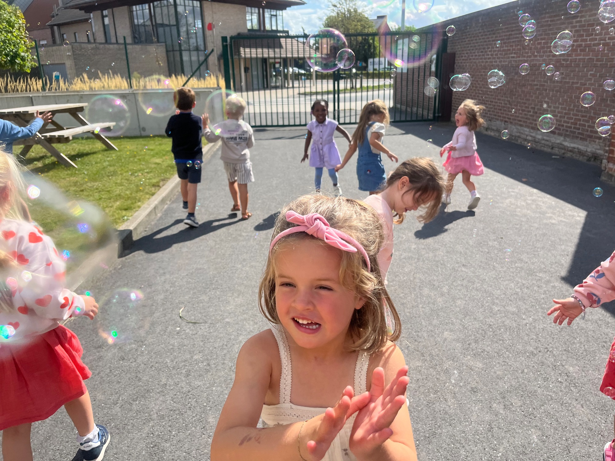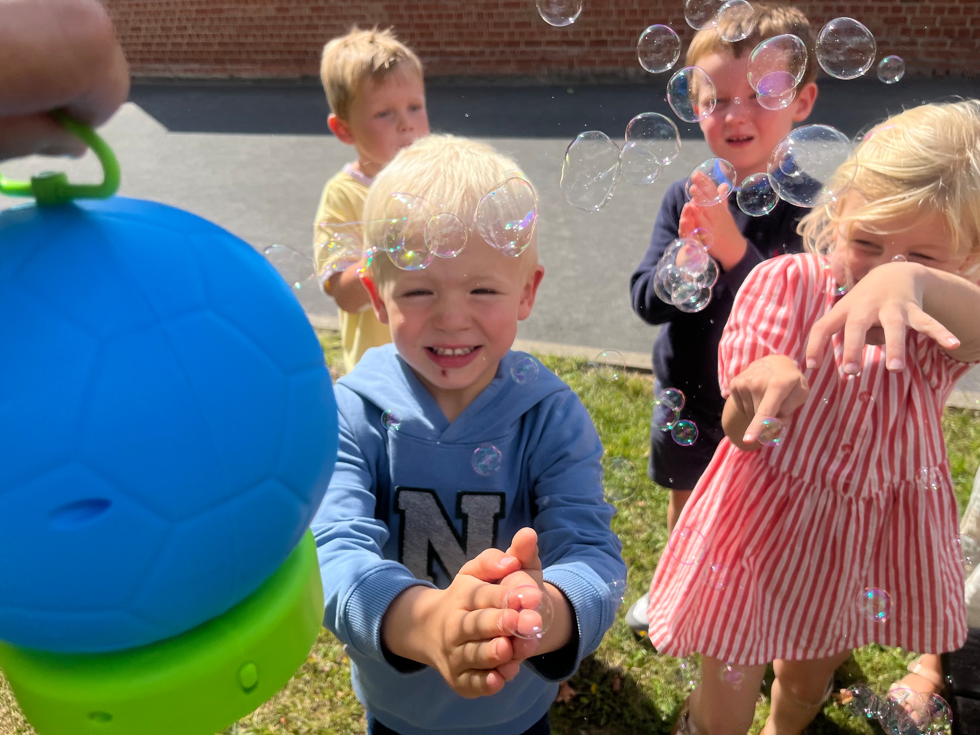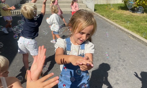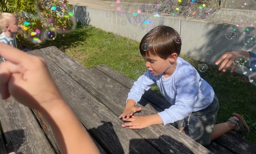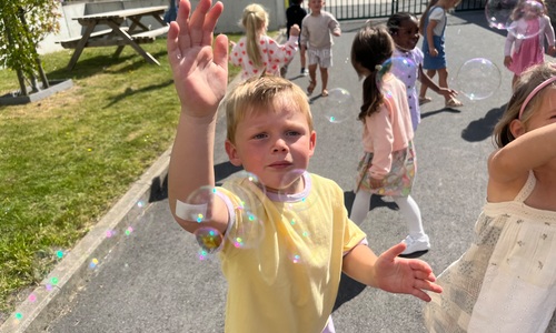 Leeuw brult heel luid en vangt de bellen, aap springt op en neer, olifant vangt de bellen met zijn slurf en krokodil vangt ze met zijn grote bek.