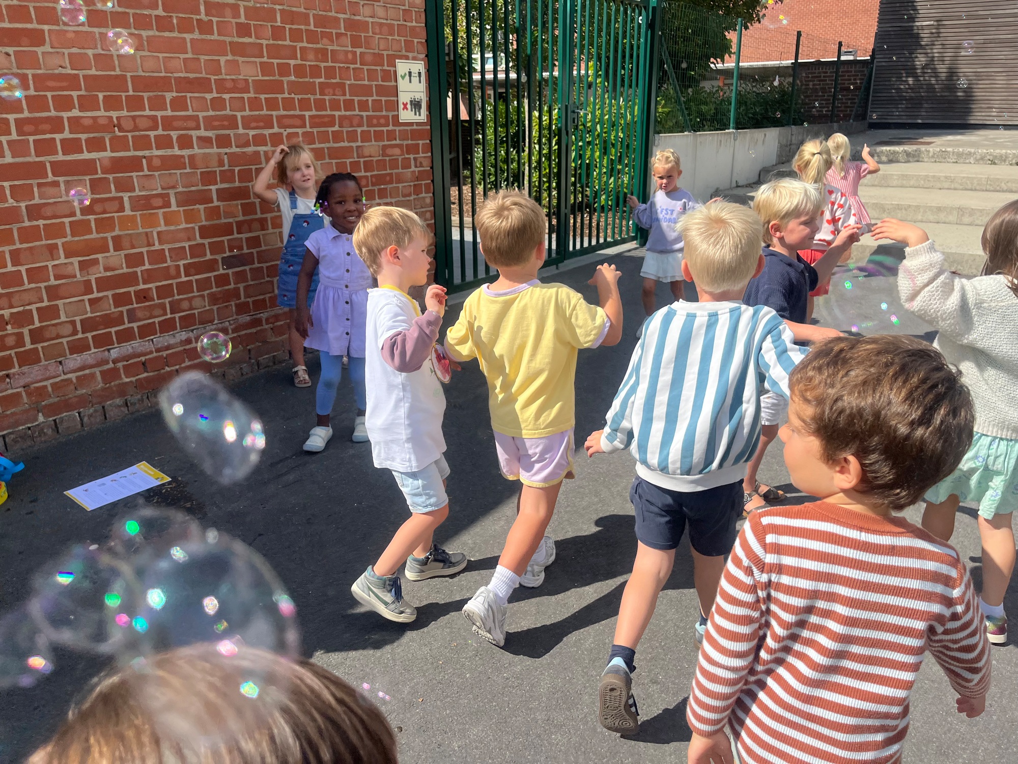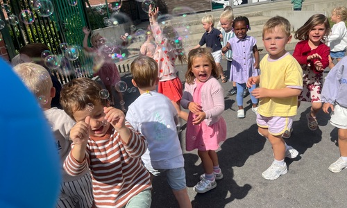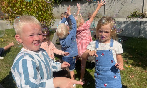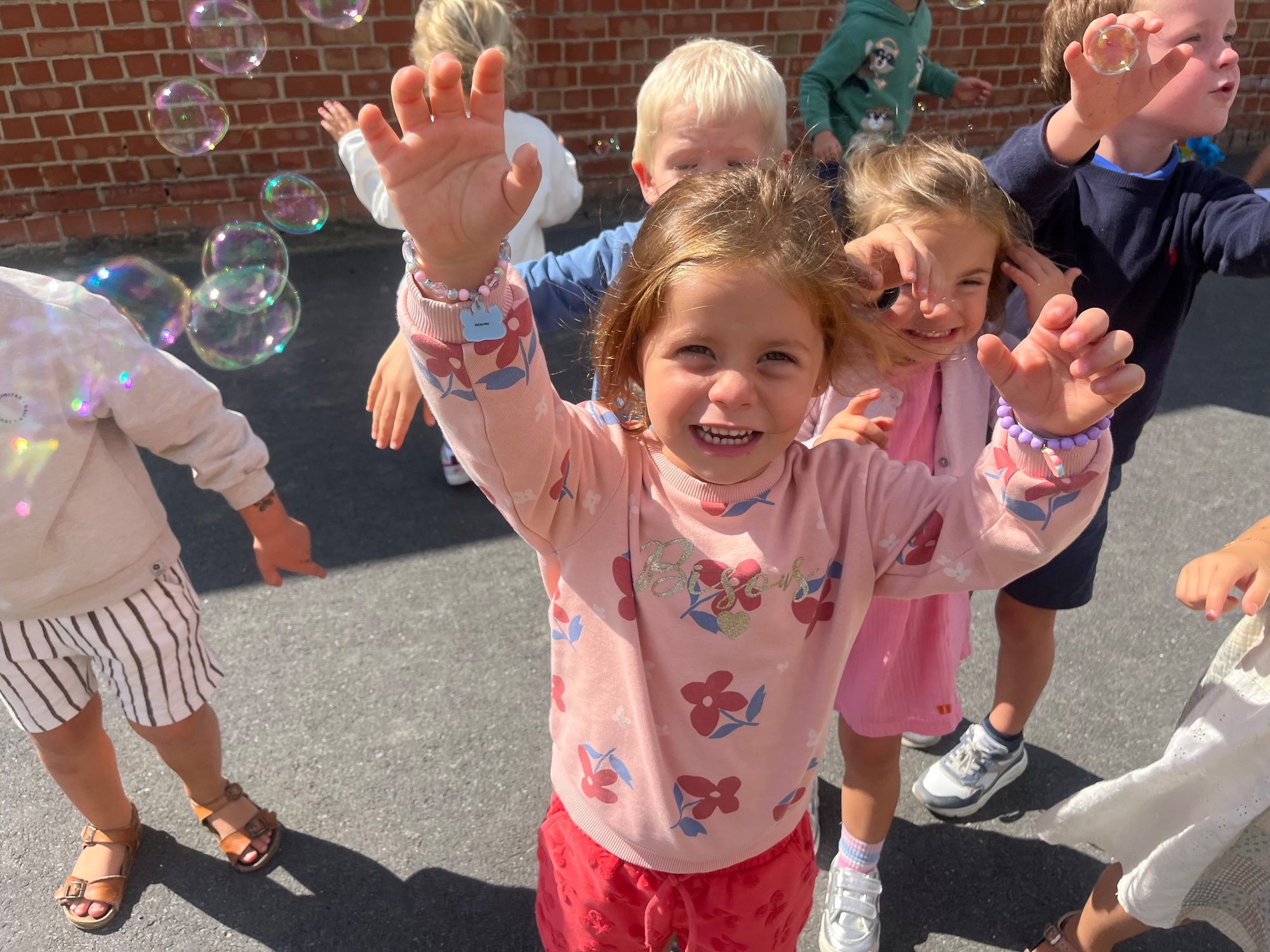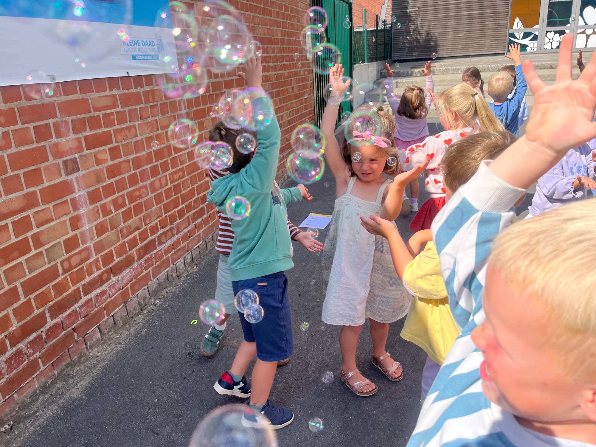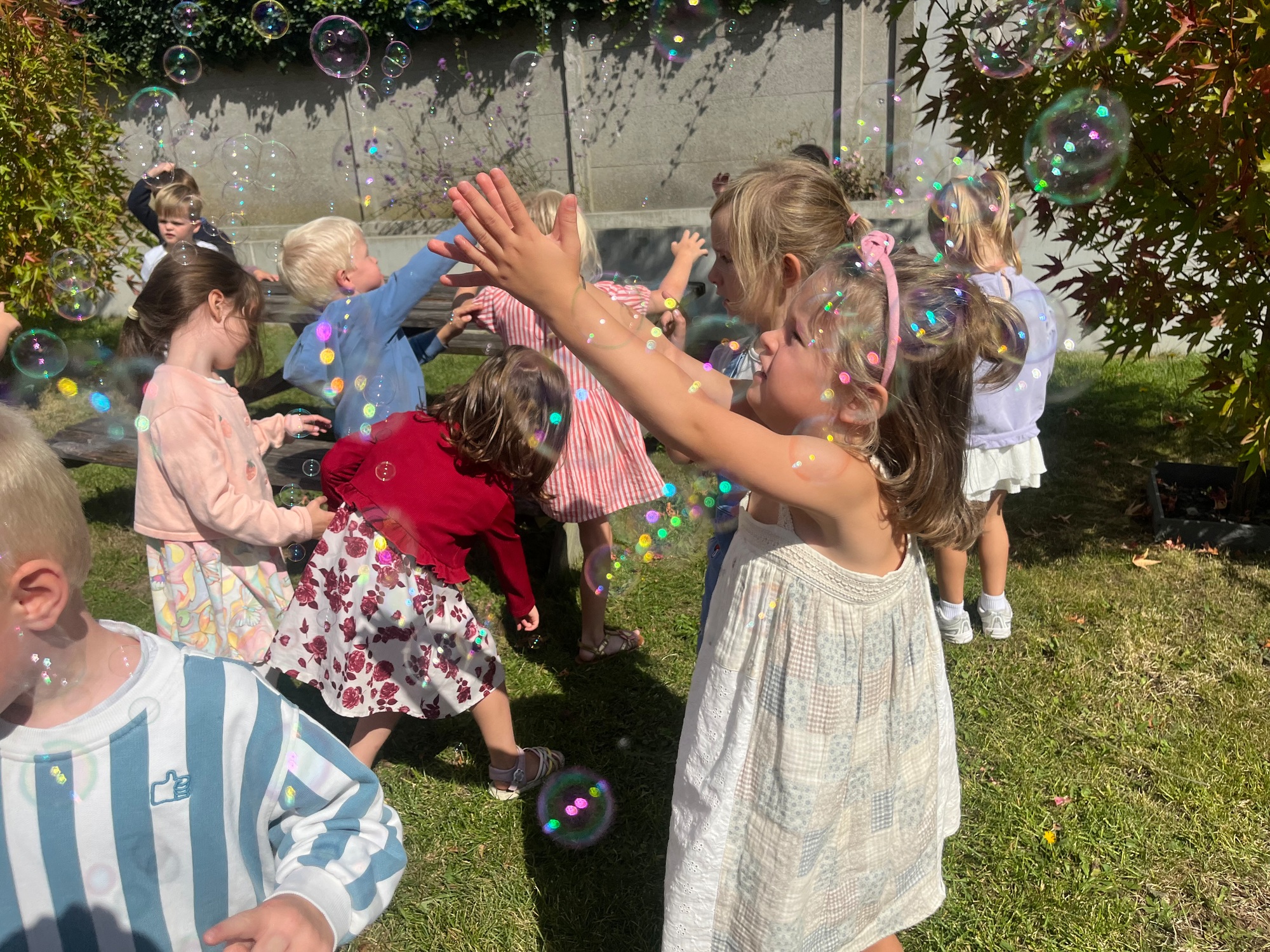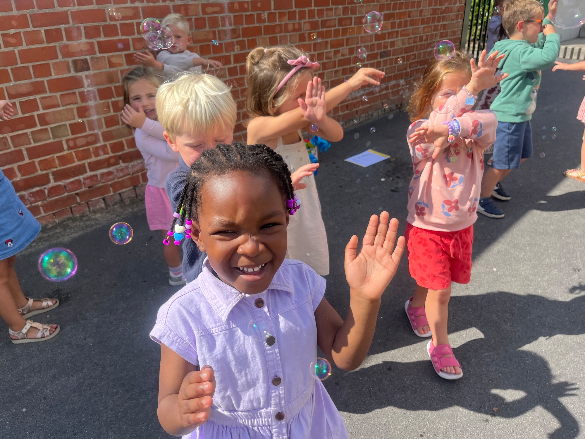 Leeuw brult heel luid en vangt de bellen, aap springt op en neer, olifant vangt de bellen met zijn slurf en krokodil vangt ze met zijn grote bek.