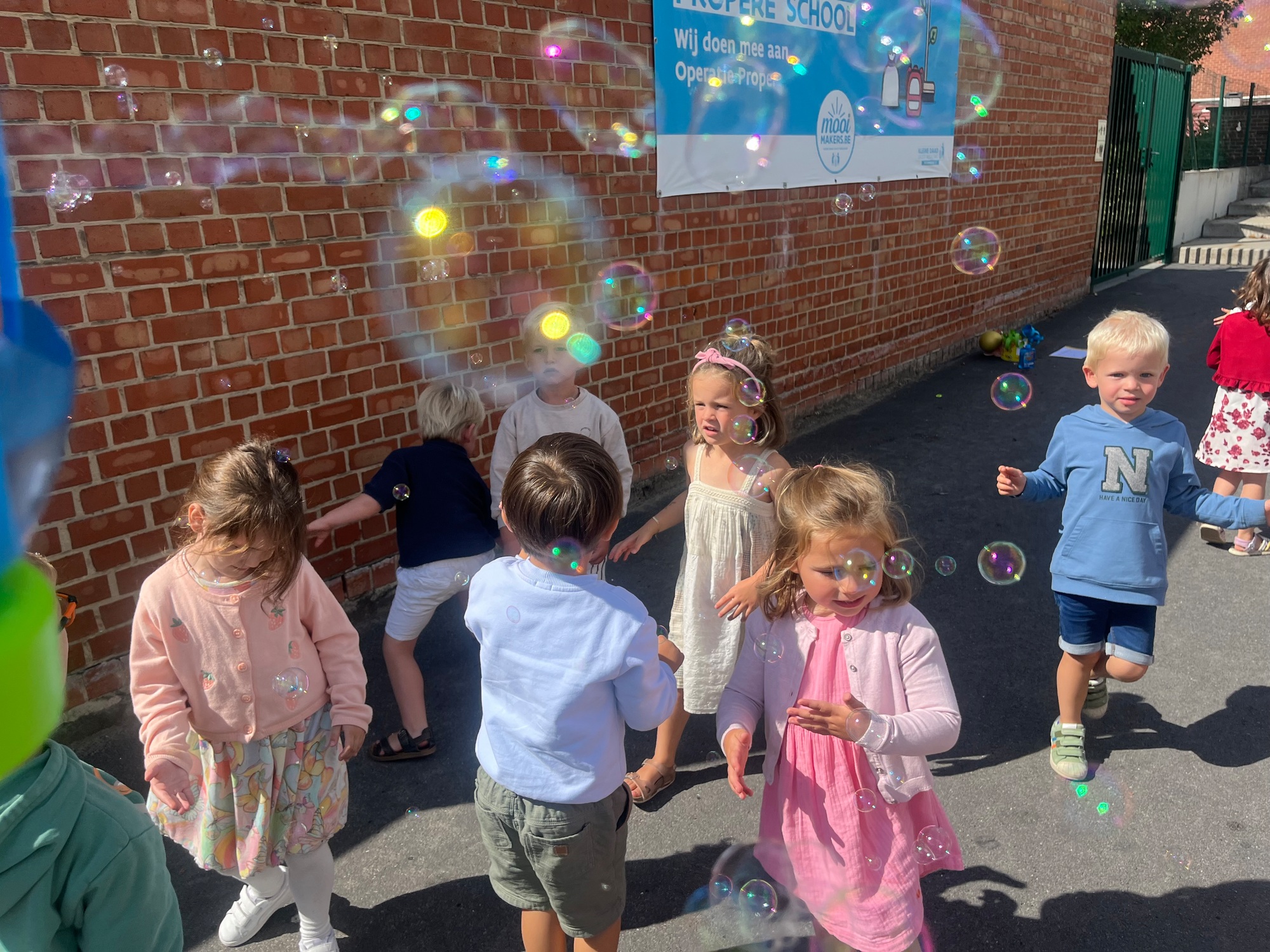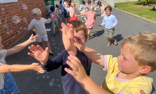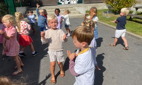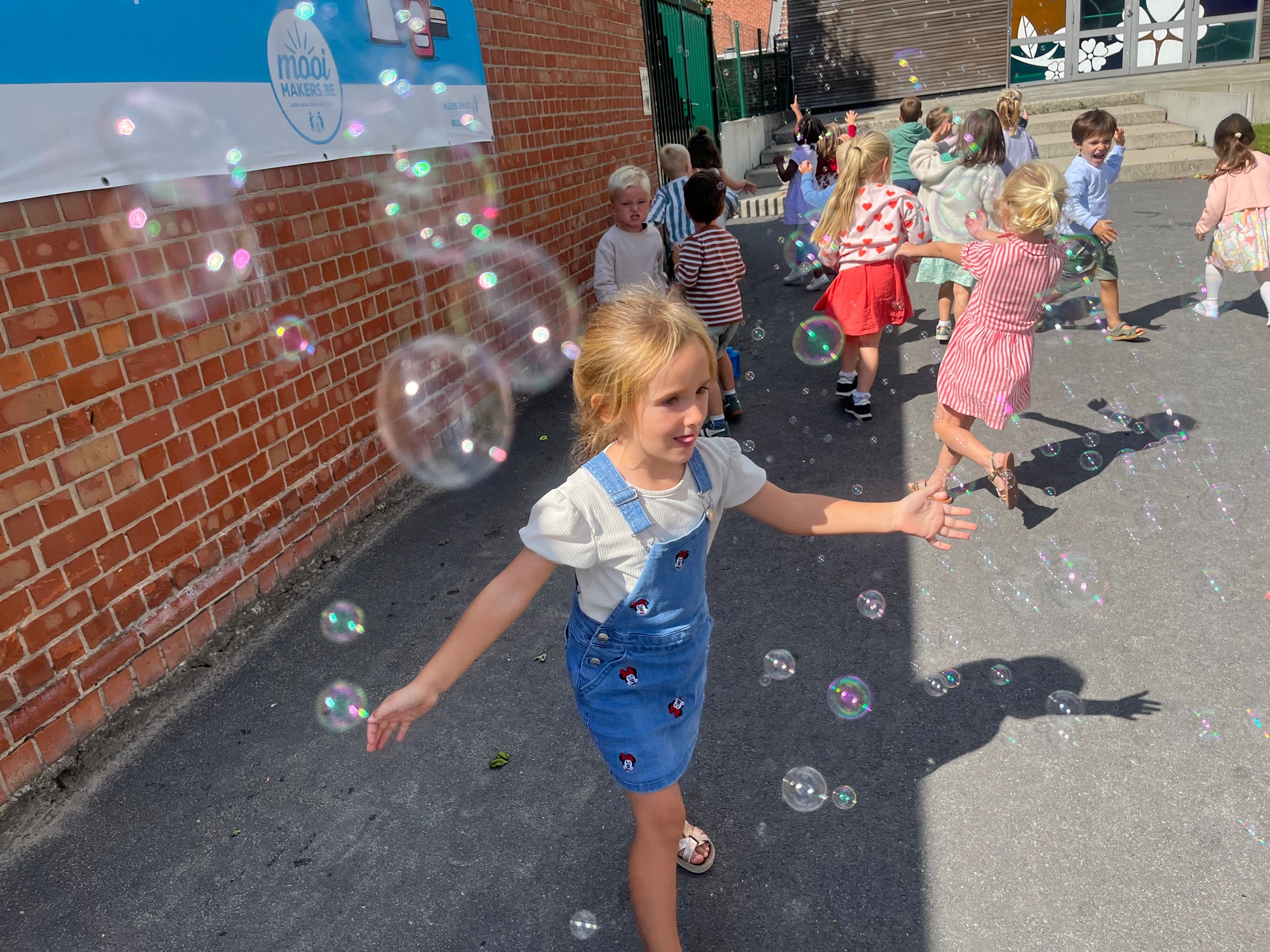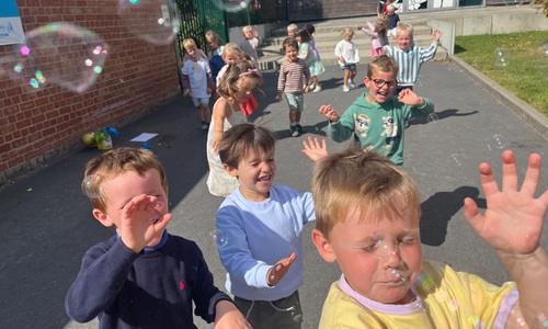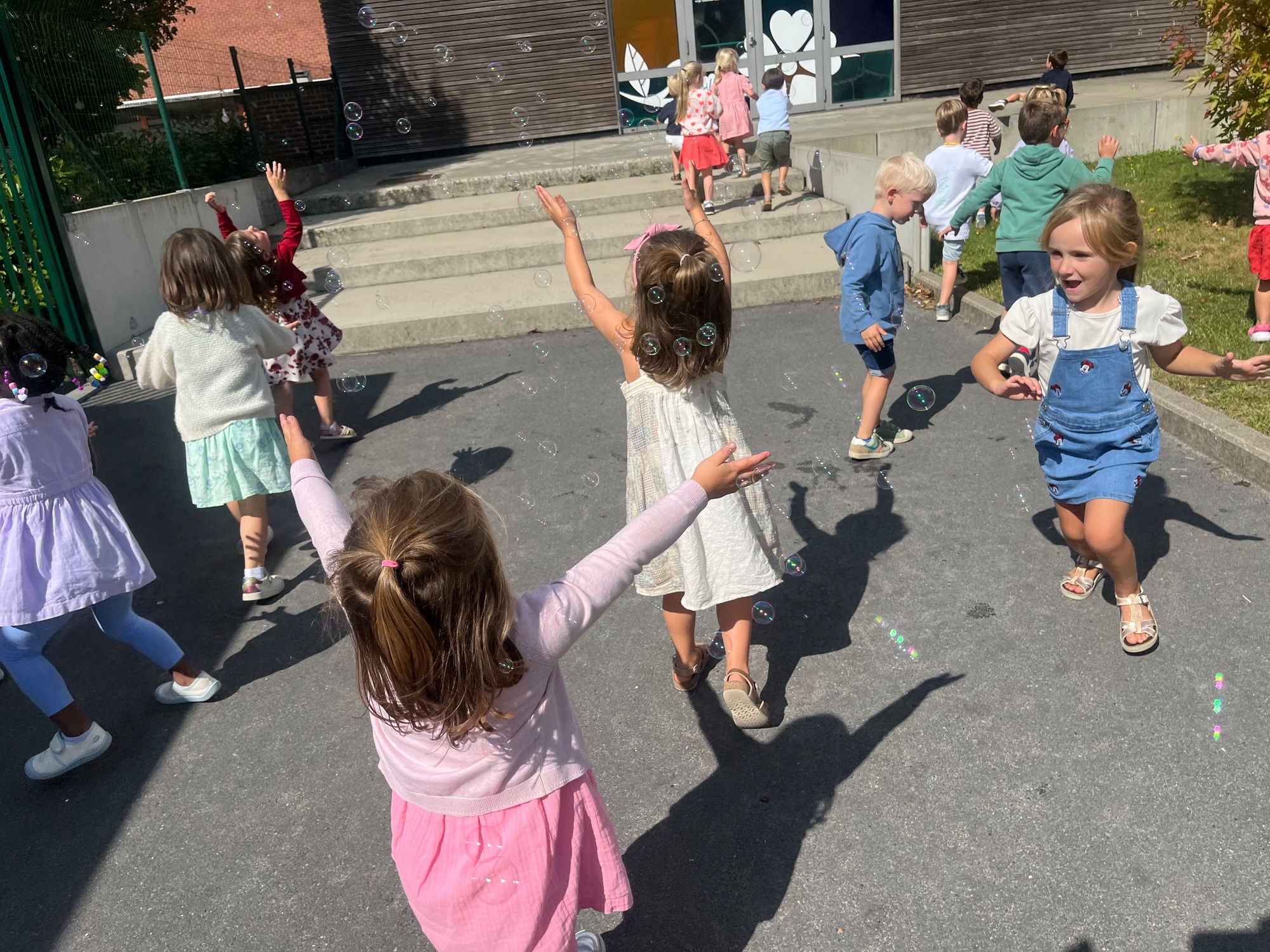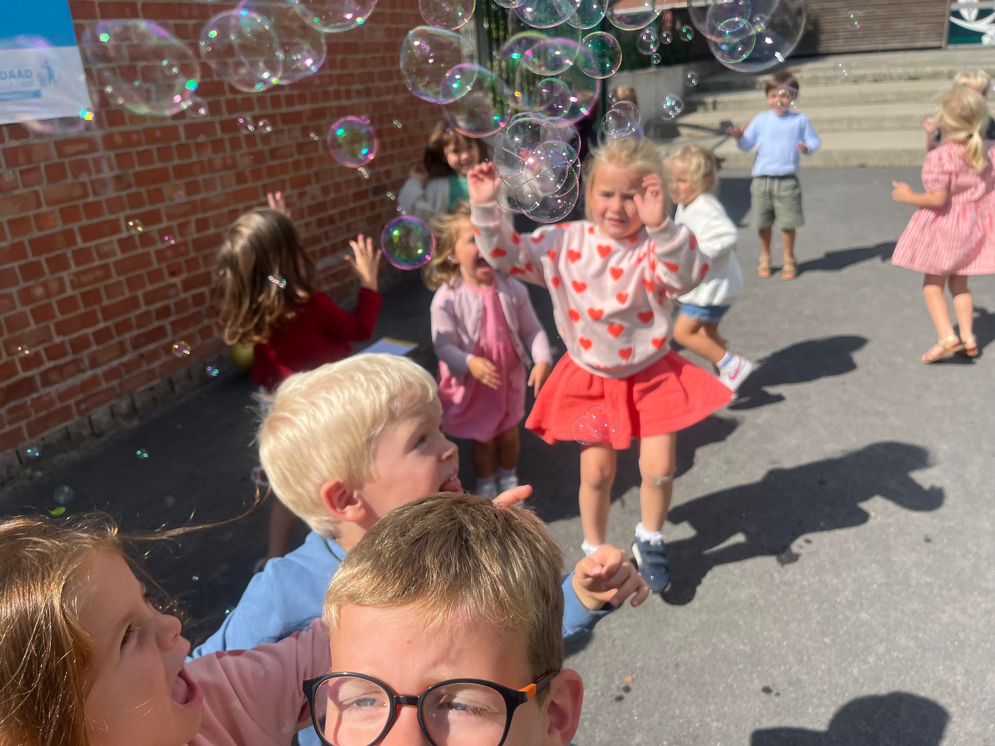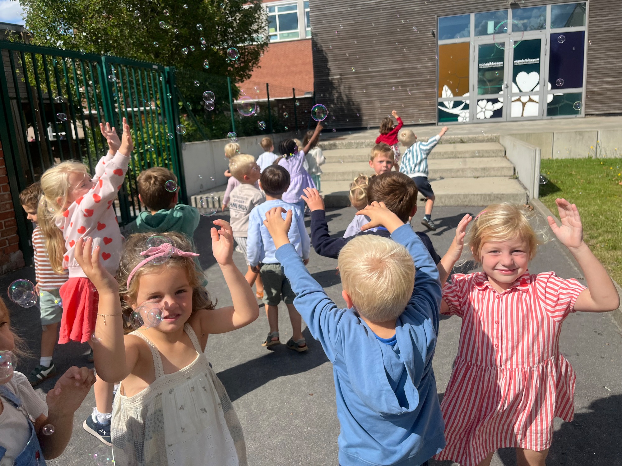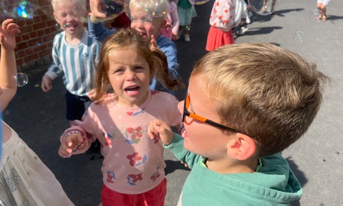 Leeuw brult heel luid en vangt de bellen, aap springt op en neer, olifant vangt de bellen met zijn slurf en krokodil vangt ze met zijn grote bek.