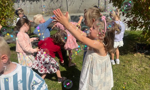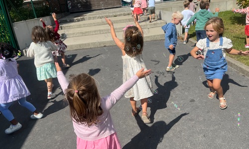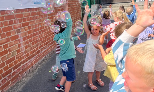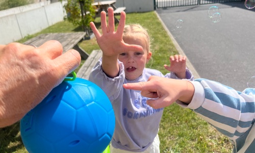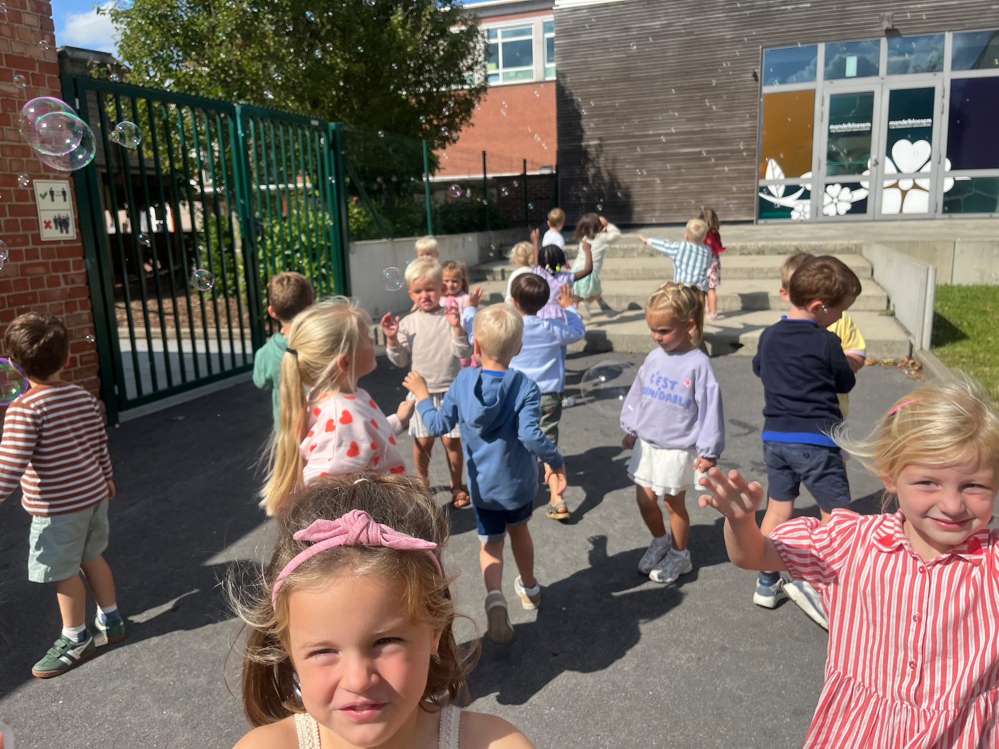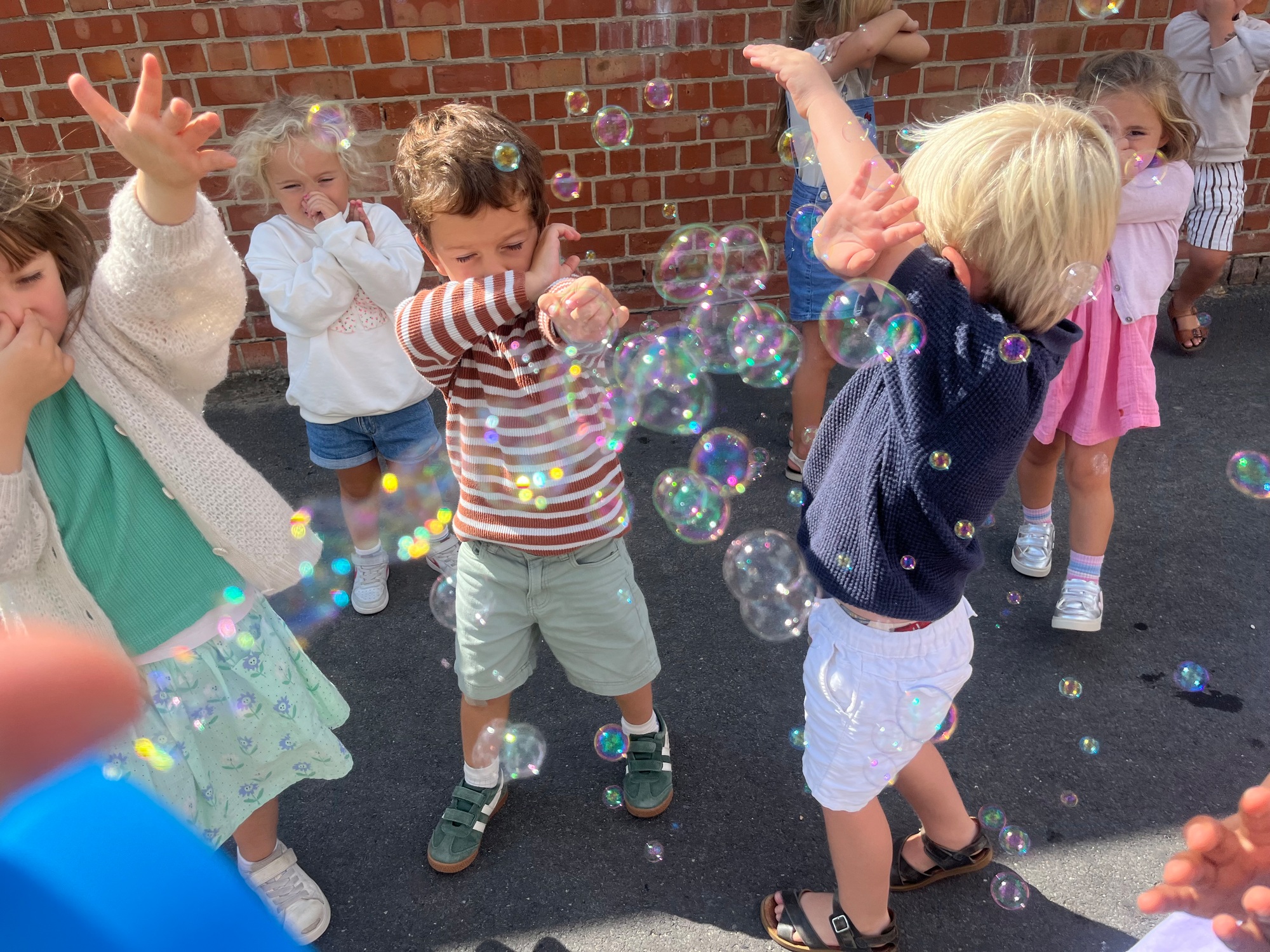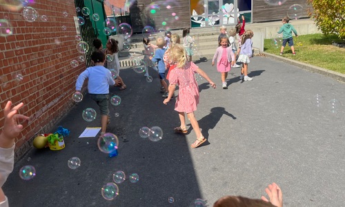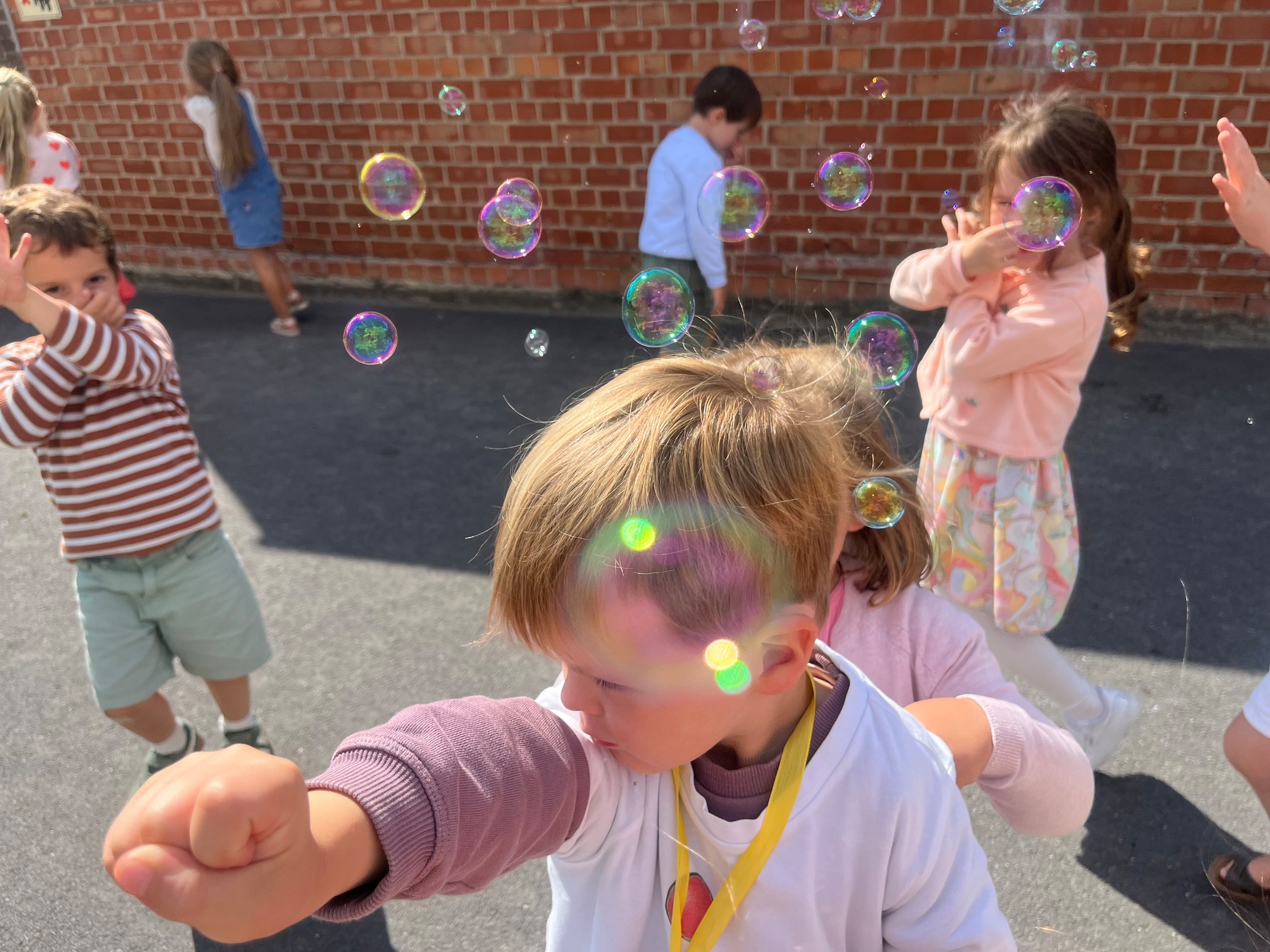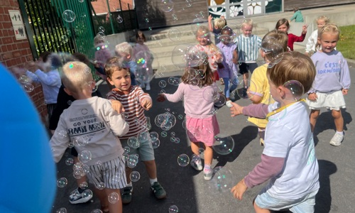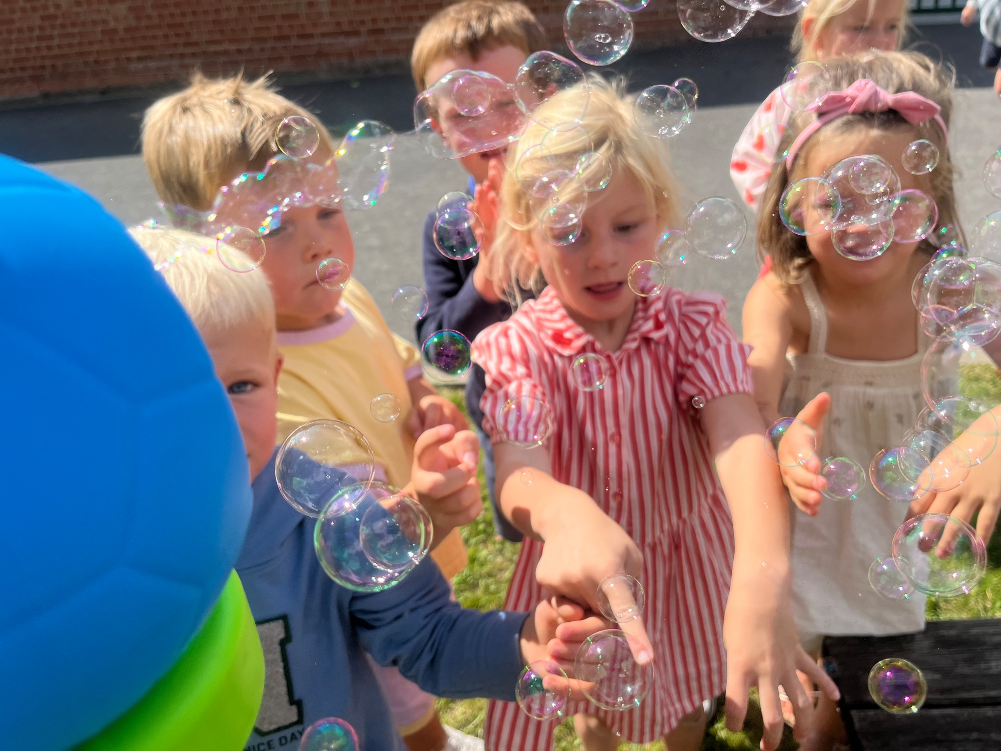 Leeuw brult heel luid en vangt de bellen, aap springt op en neer, olifant vangt de bellen met zijn slurf en krokodil vangt ze met zijn grote bek.